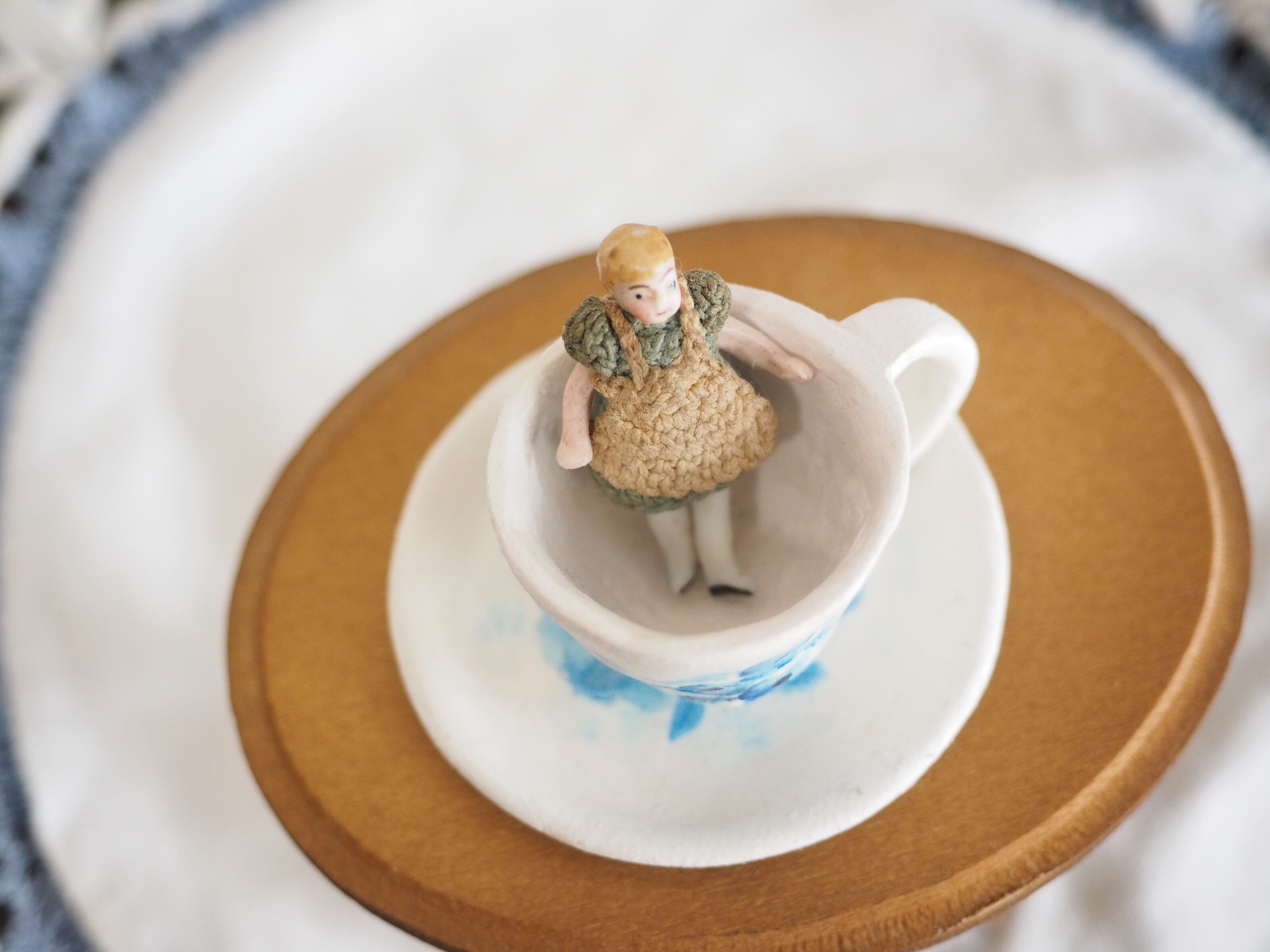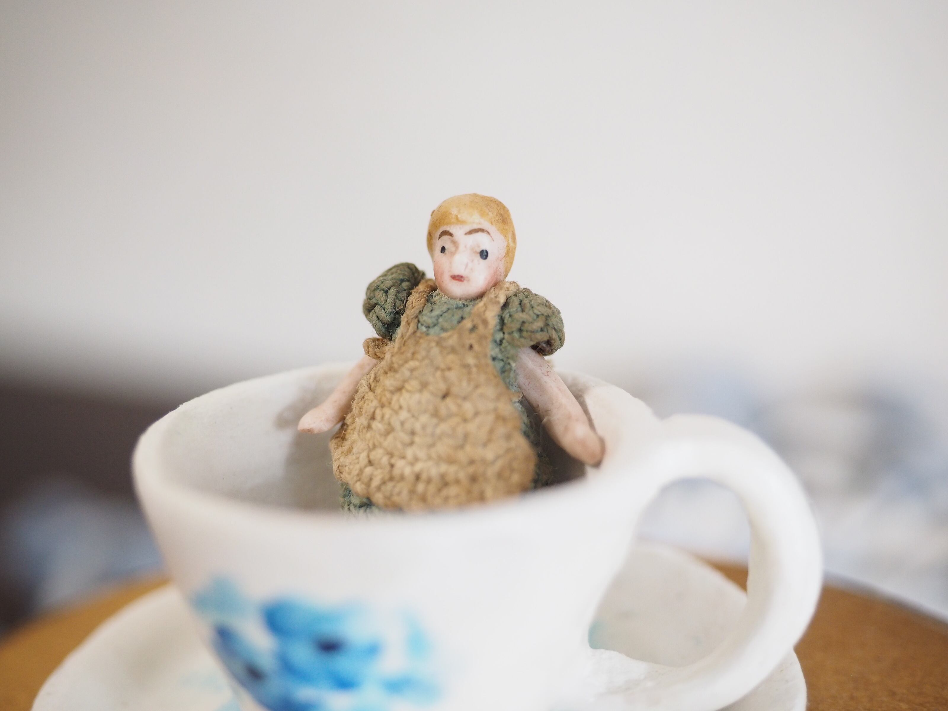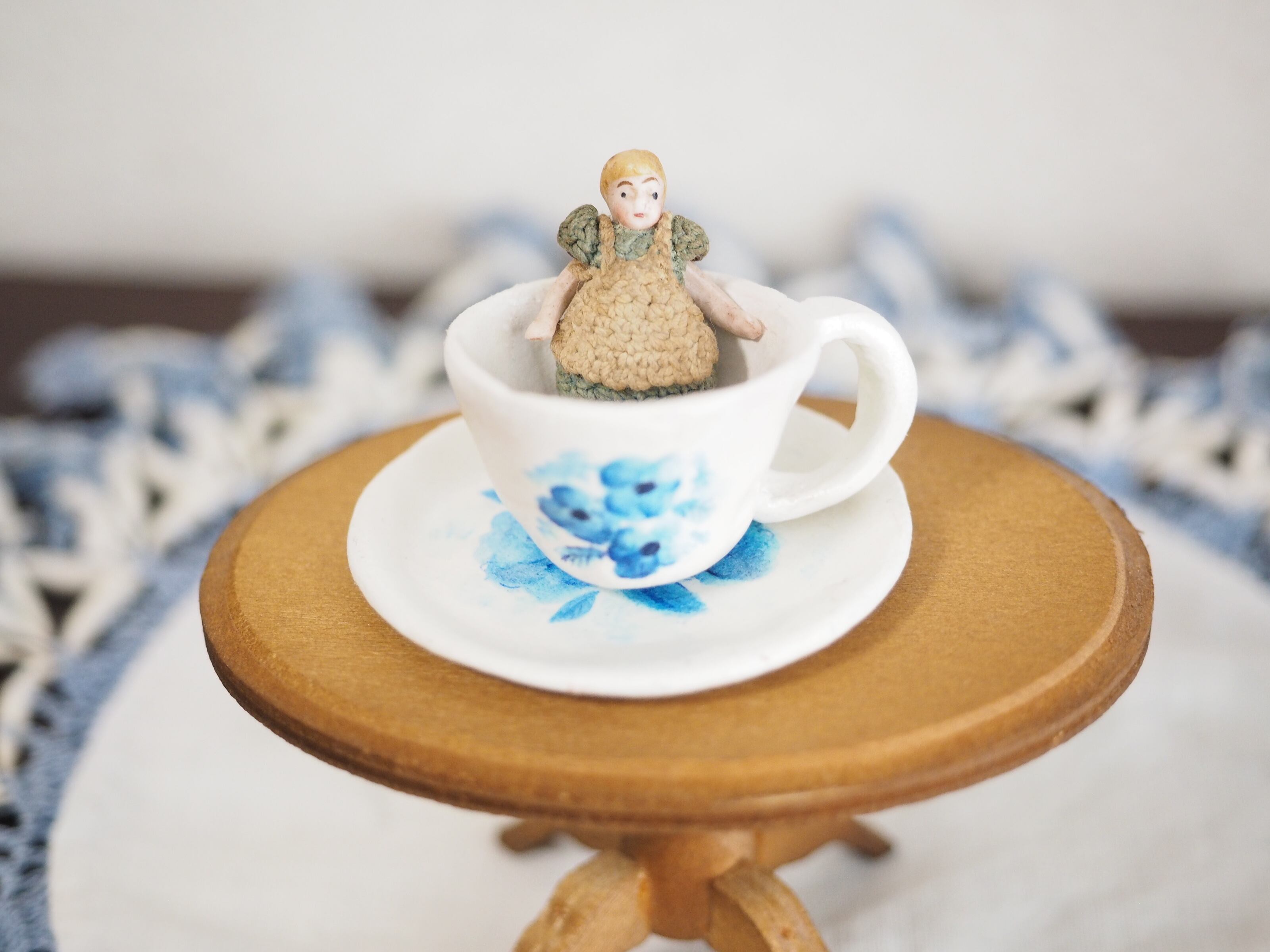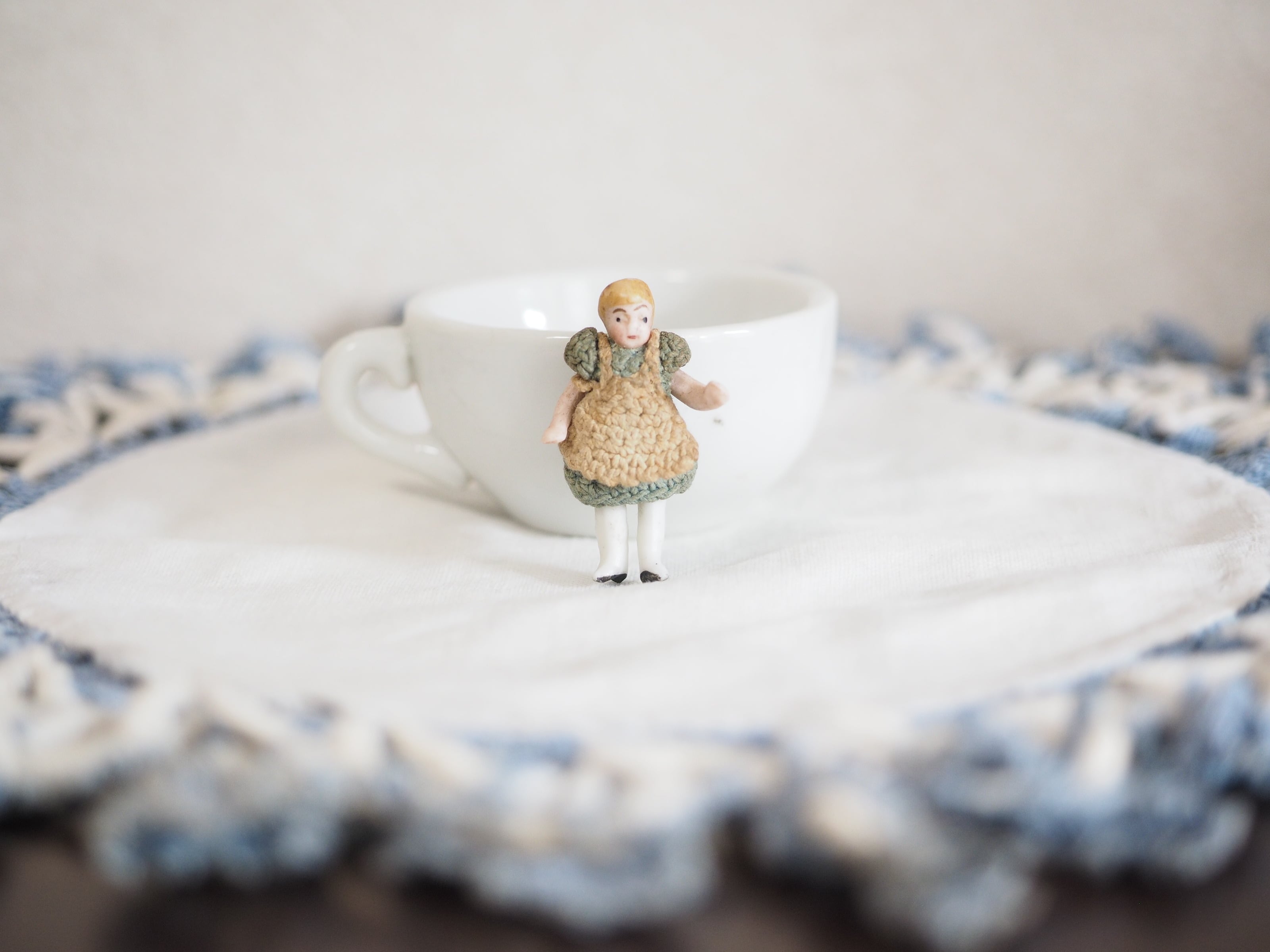 ミニチュアカップにかわいく収まってしまうサイズの、親指姫のようなビスクドール。