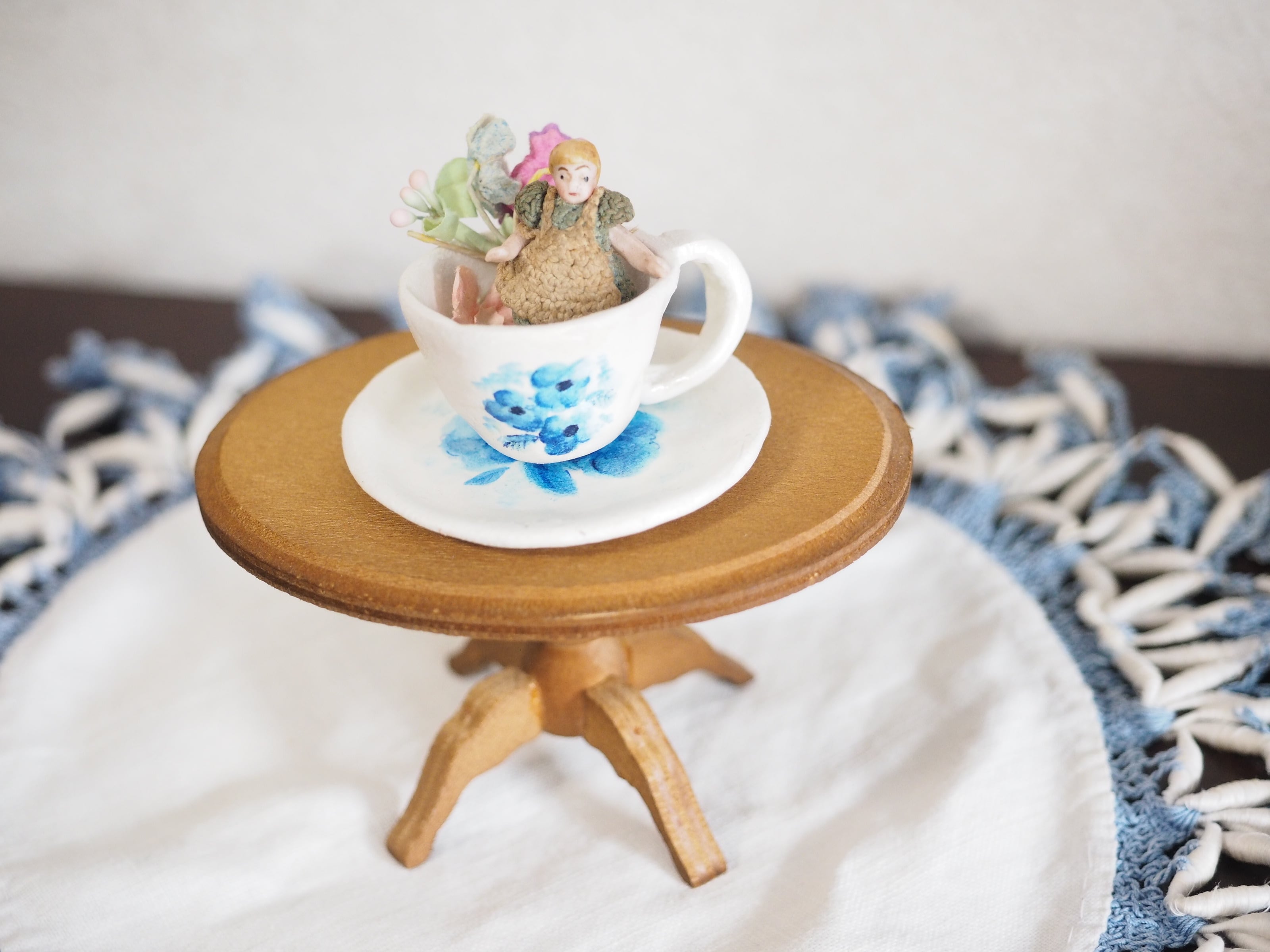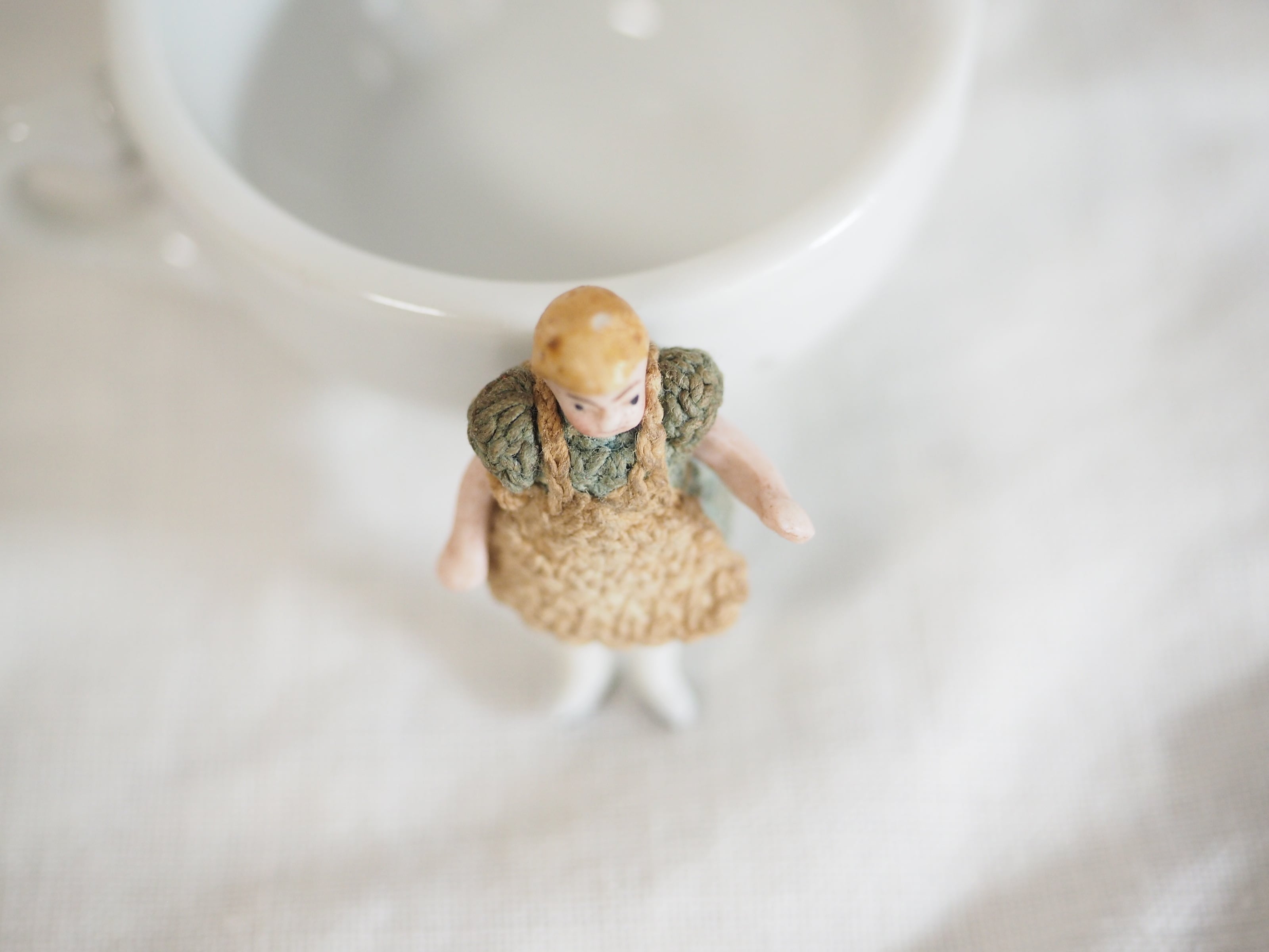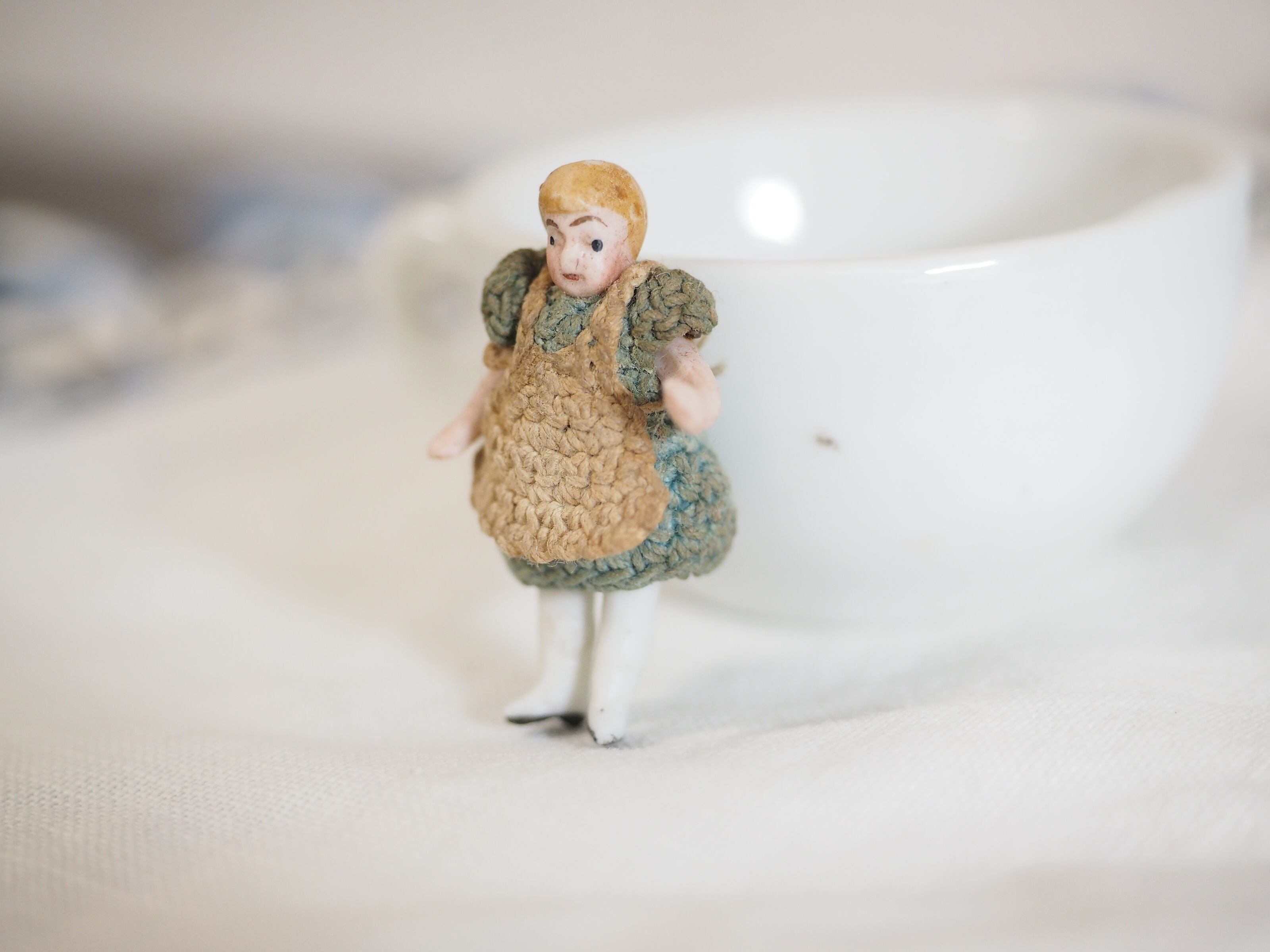 ミニチュアカップにかわいく収まってしまうサイズの、親指姫のようなビスクドール。