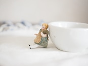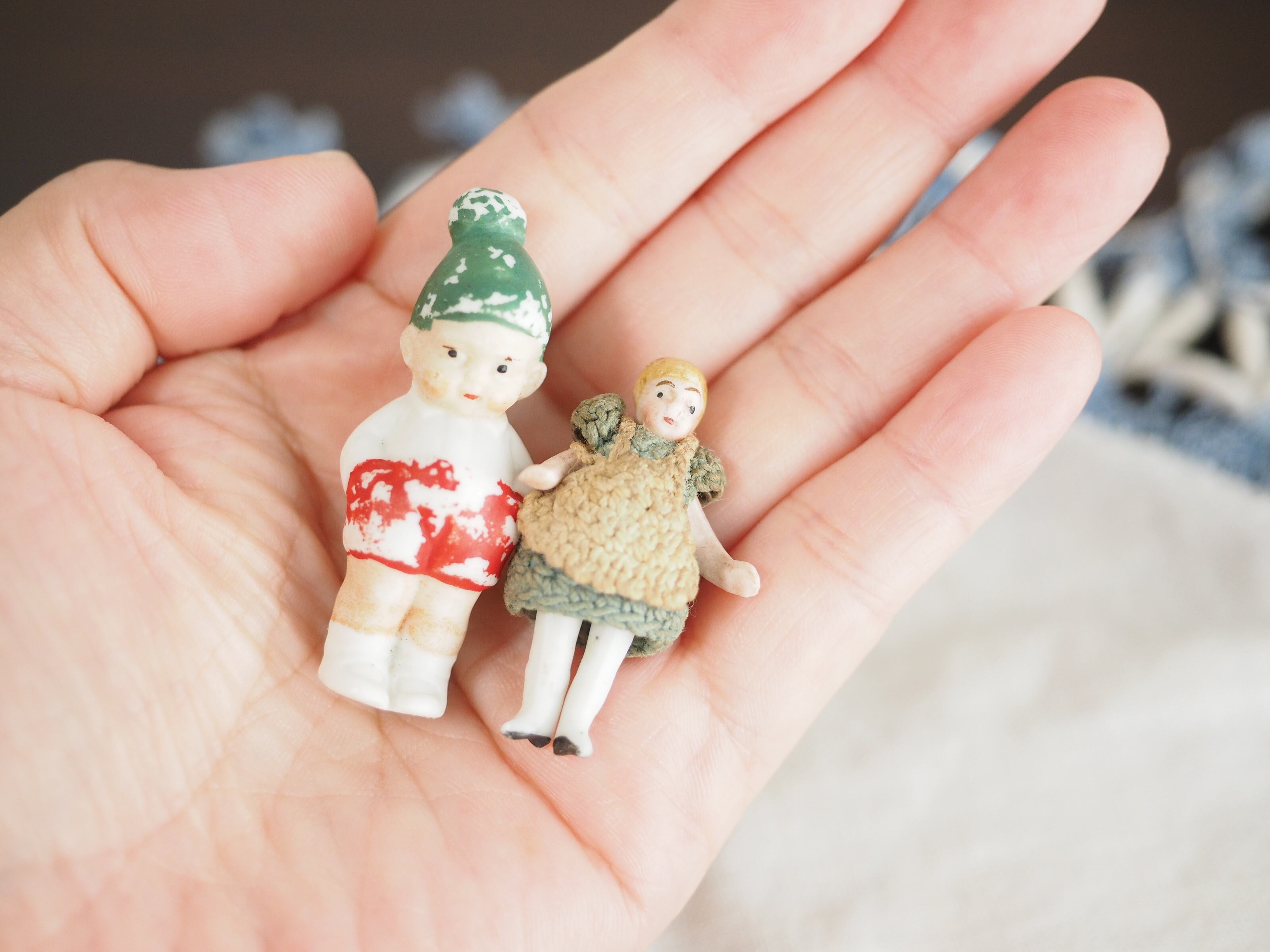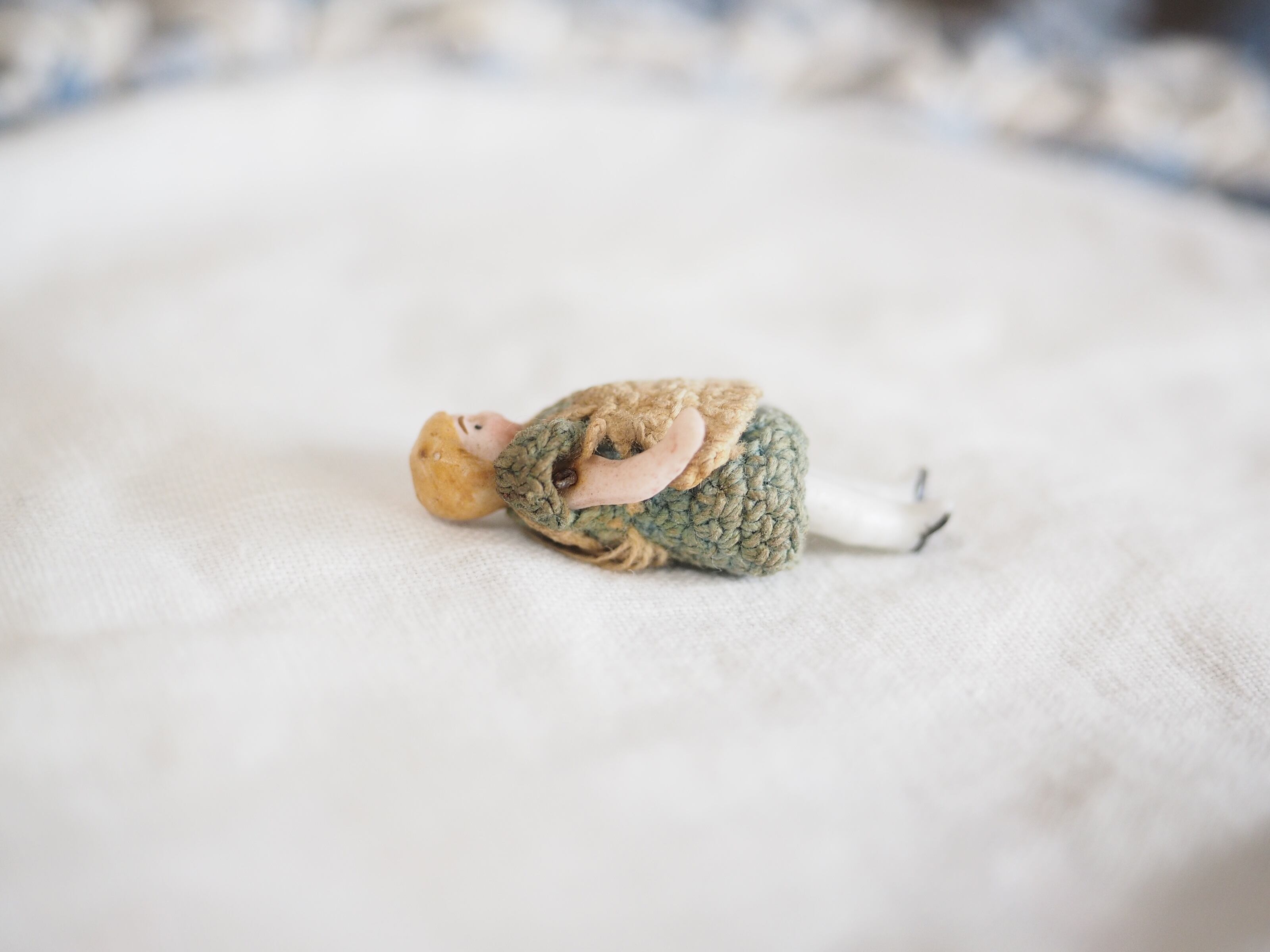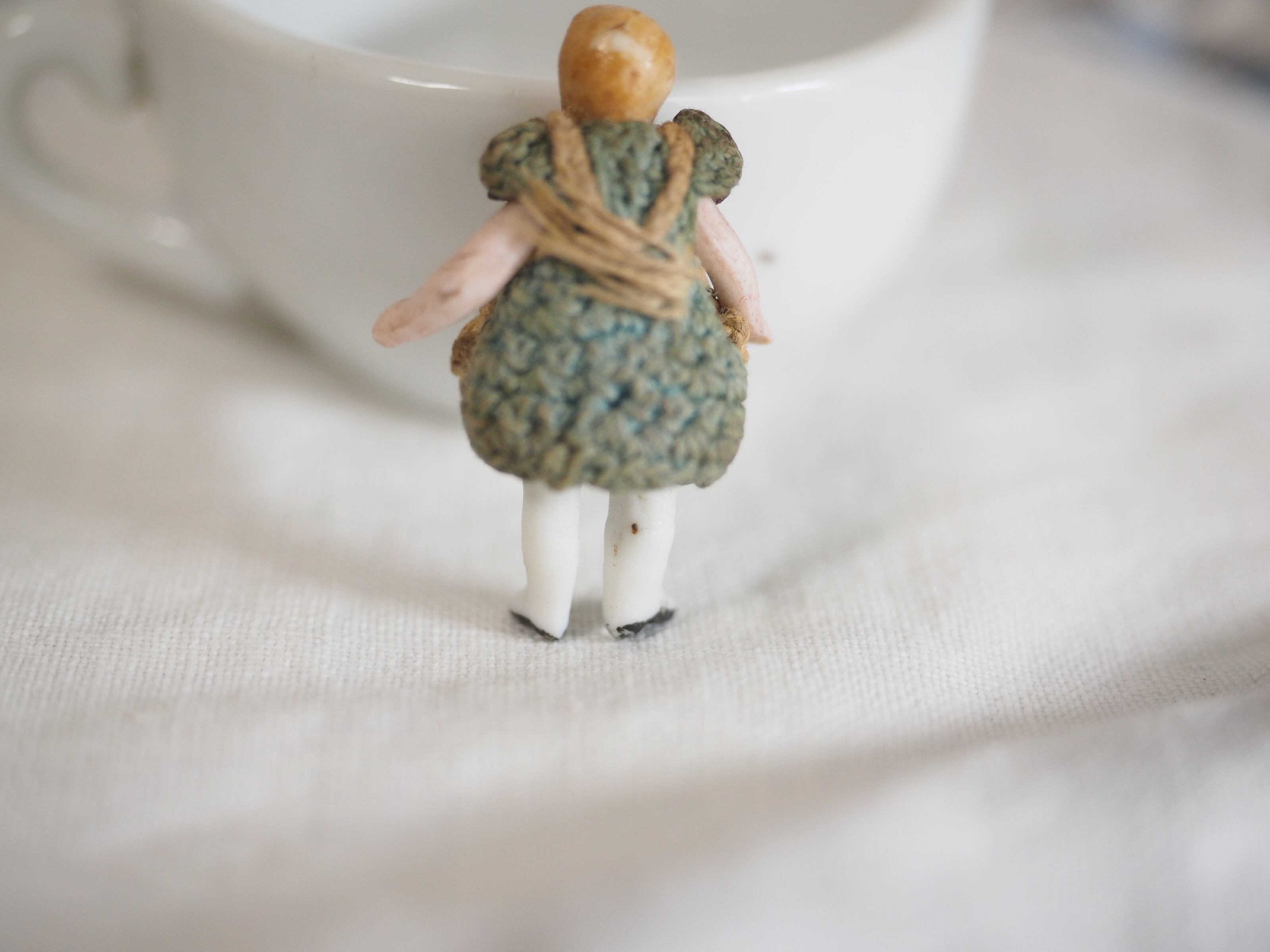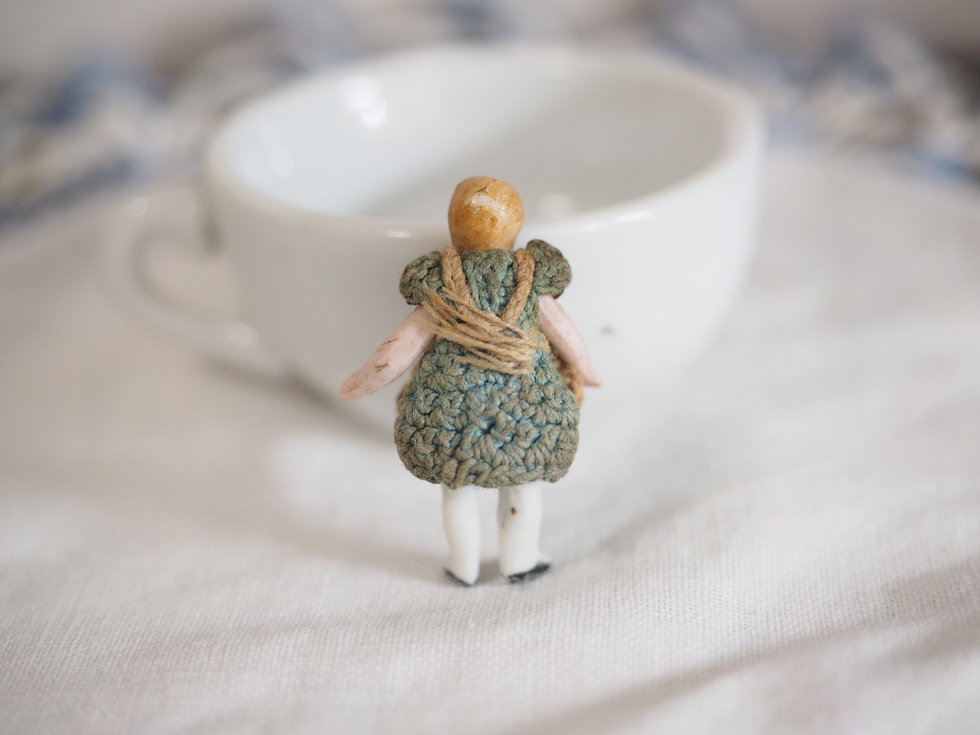 ミニチュアカップにかわいく収まってしまうサイズの、親指姫のようなビスクドール。