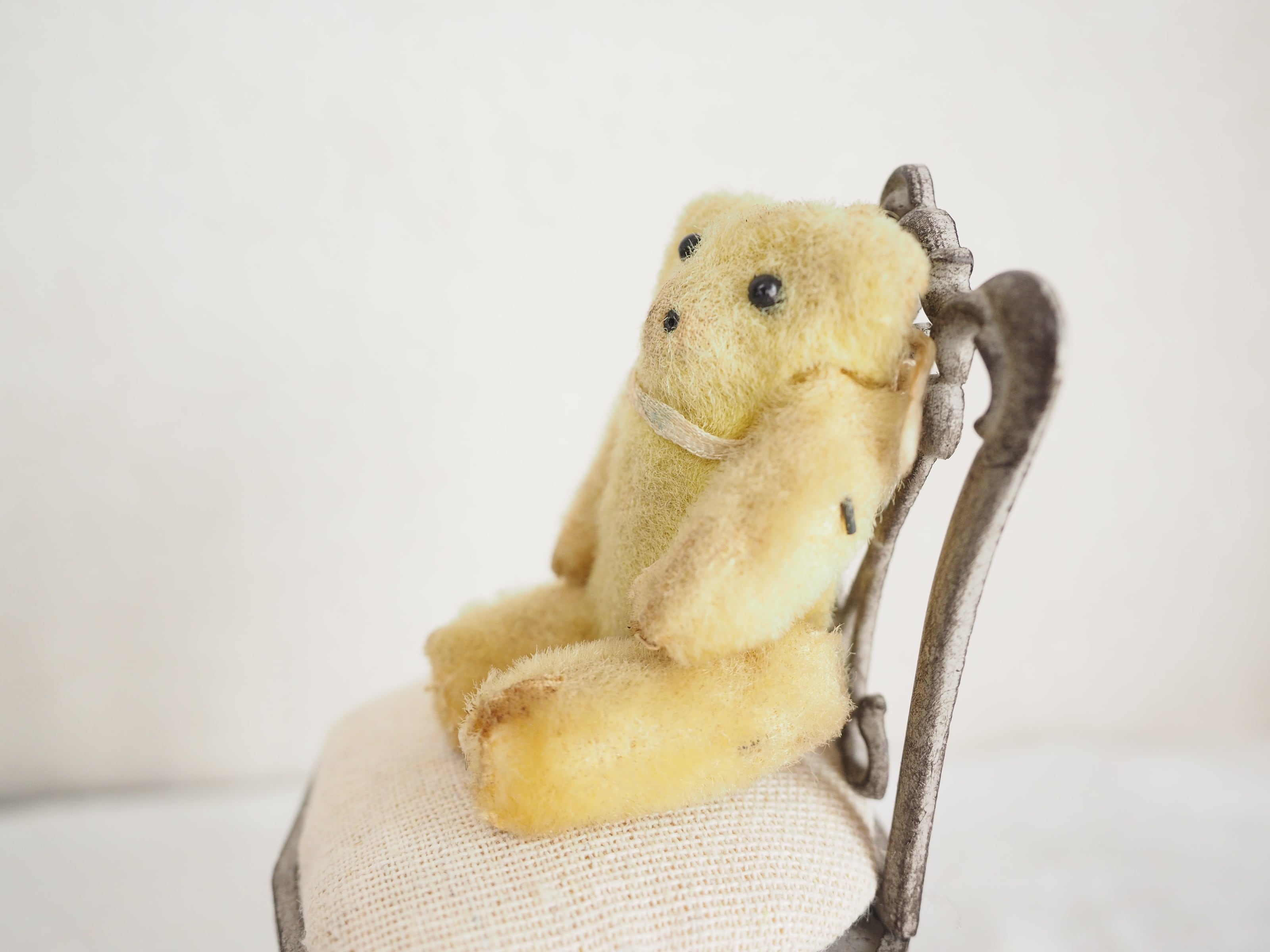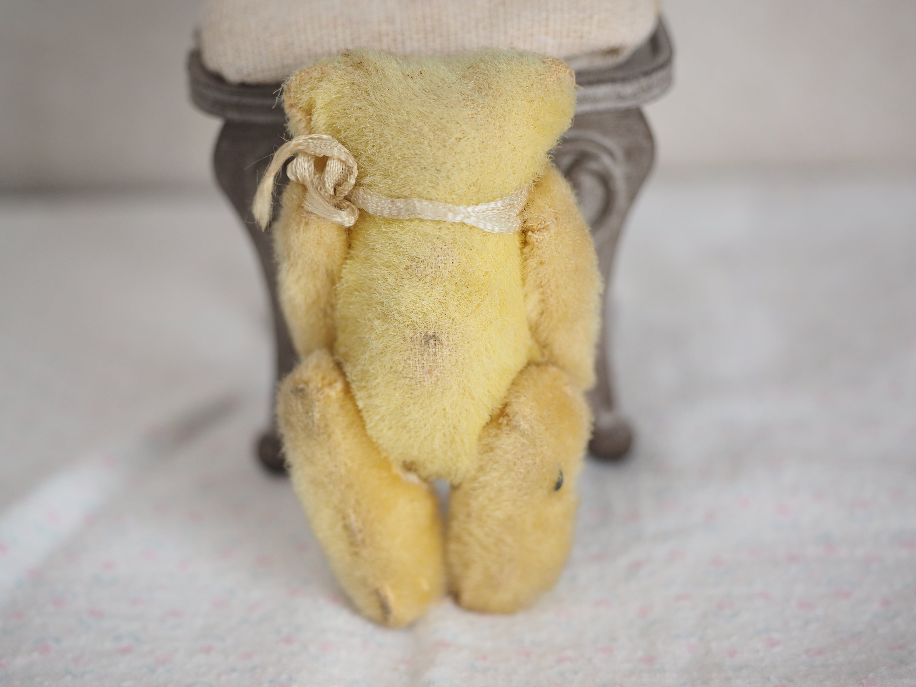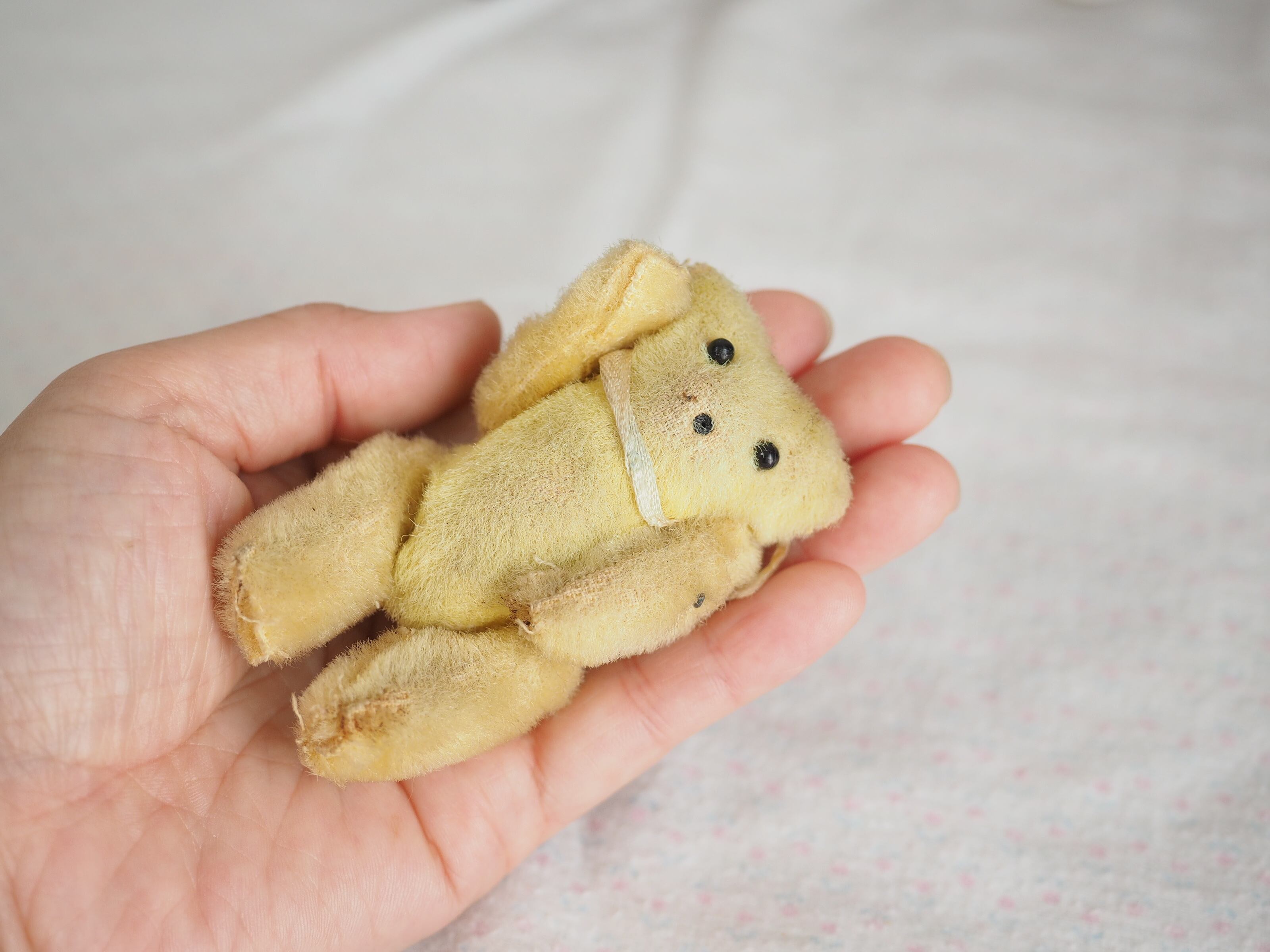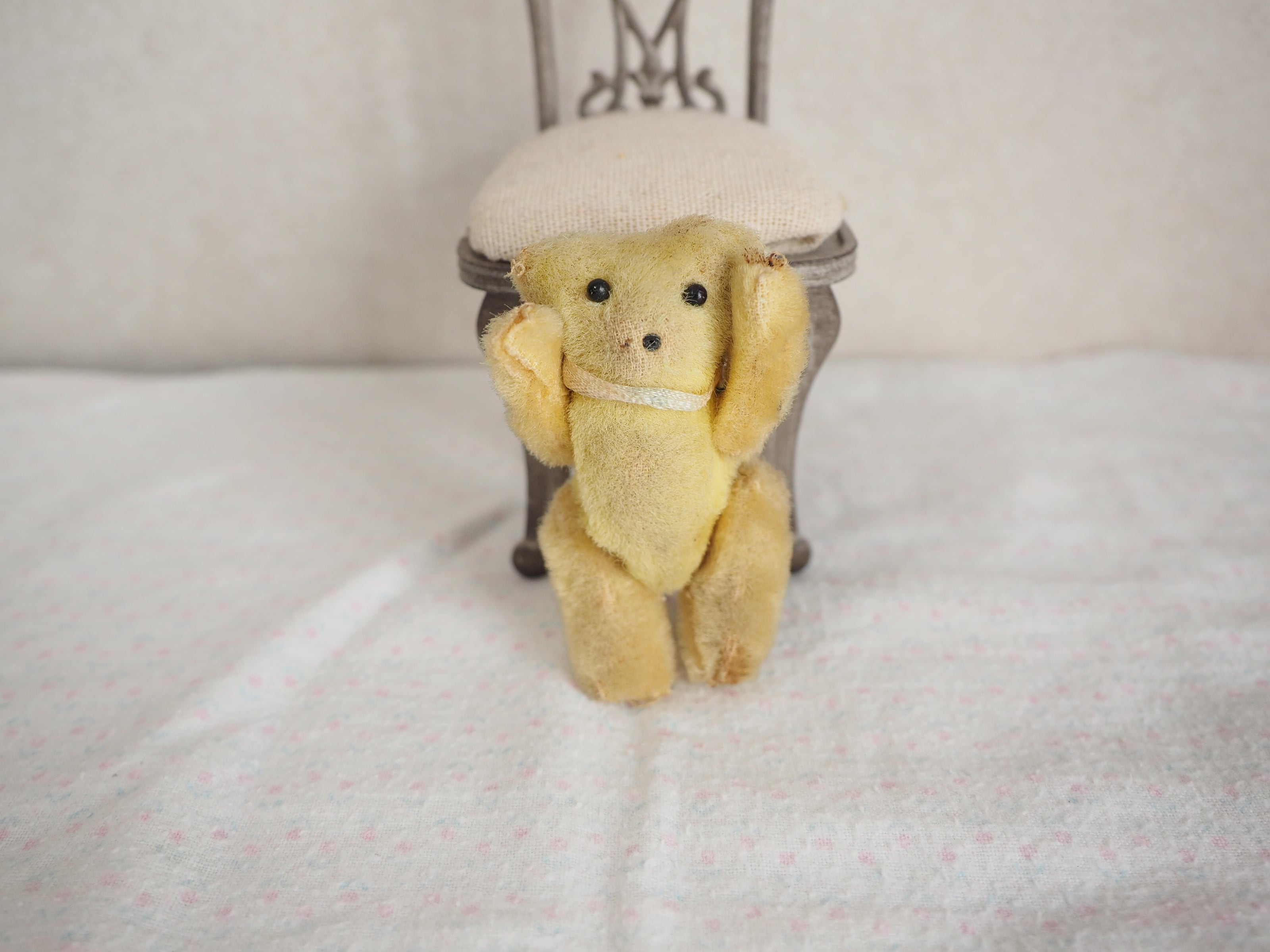 肩が上がったような様子も愛おしい、古びた小さなテディベア。