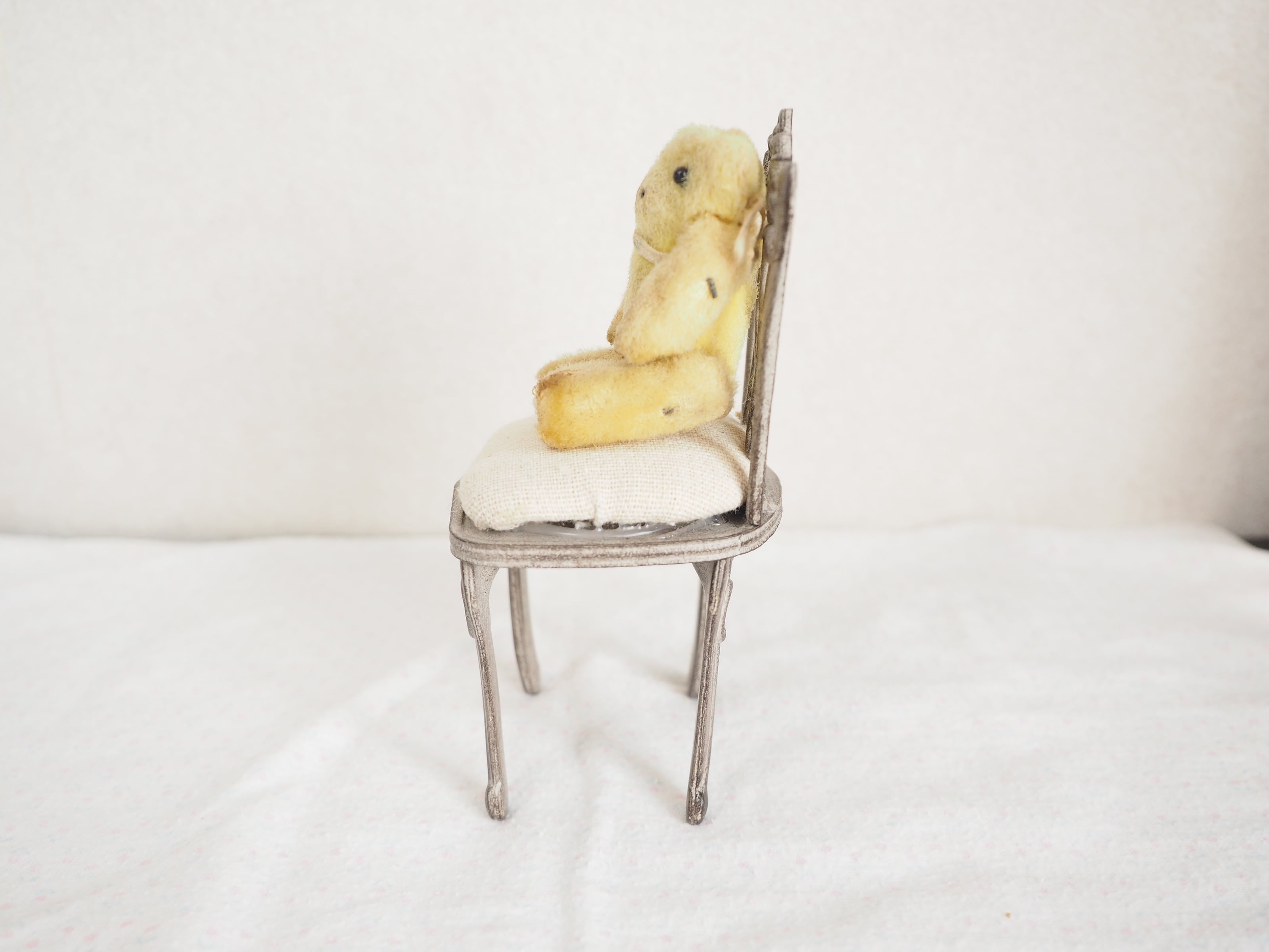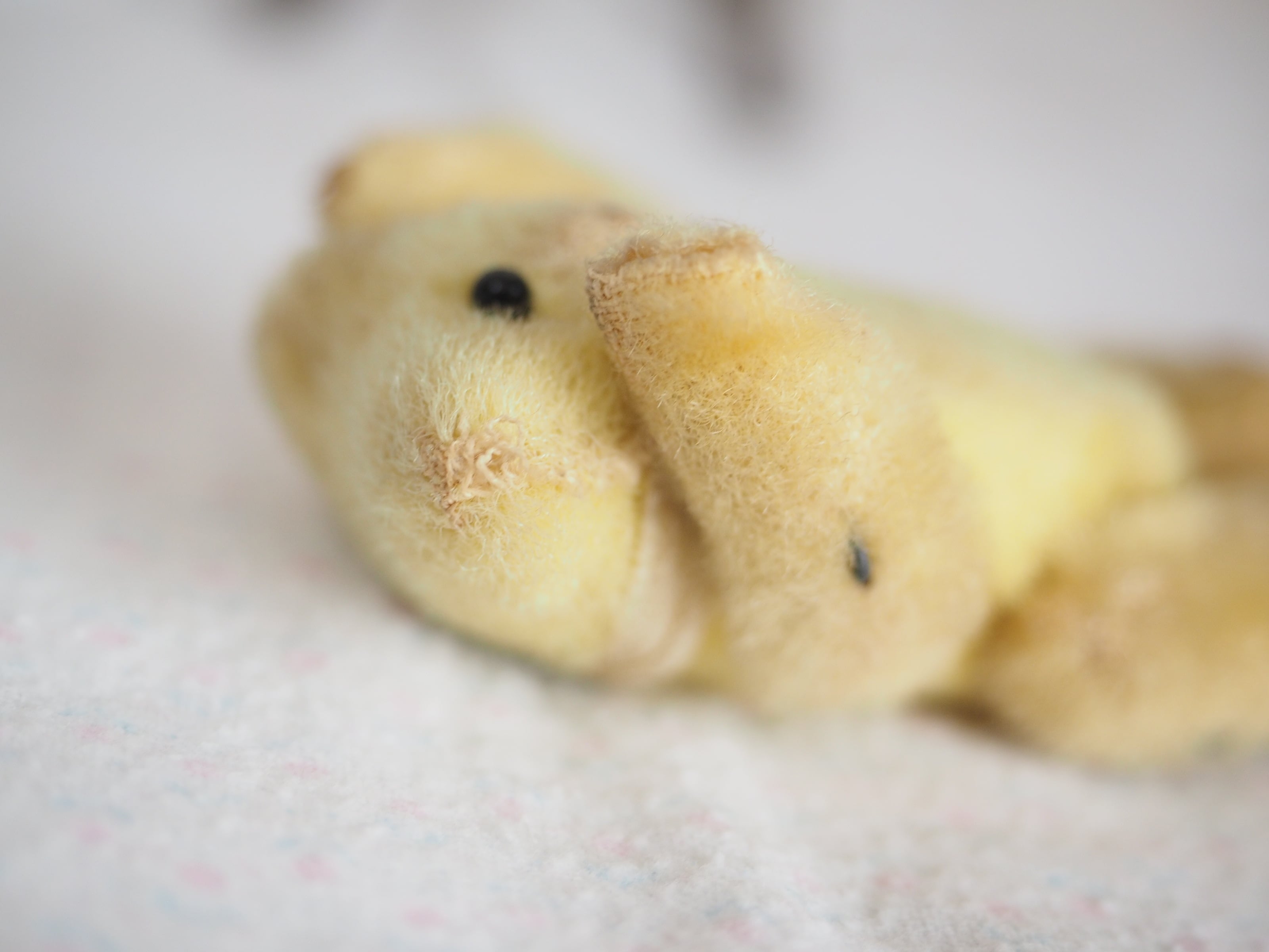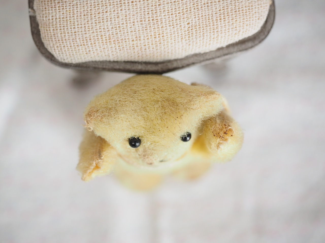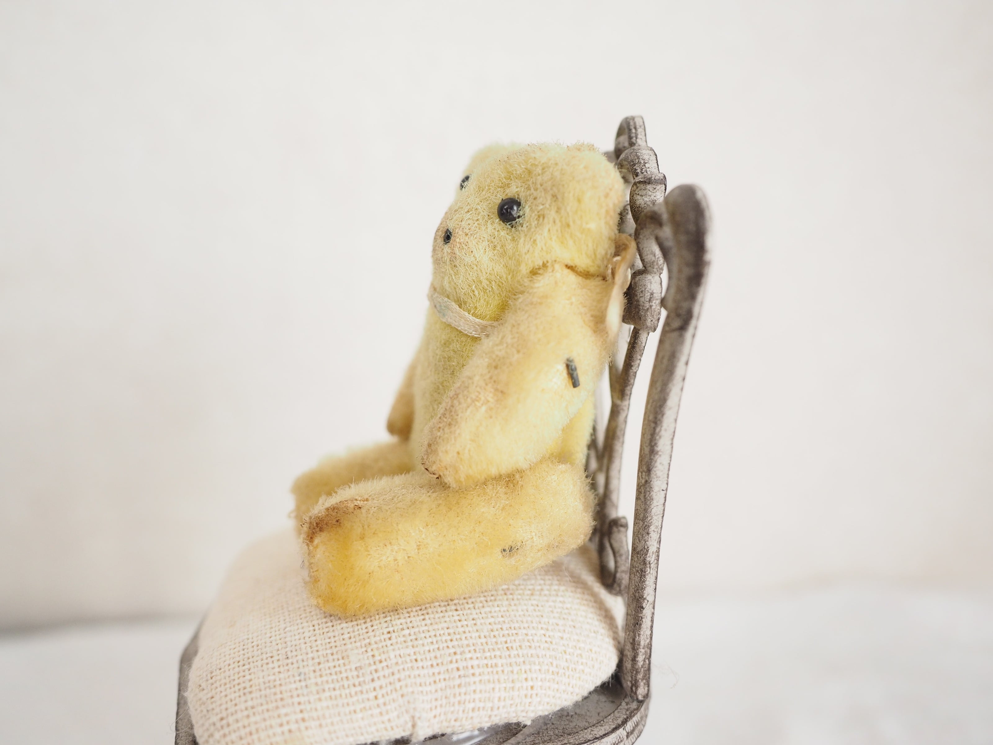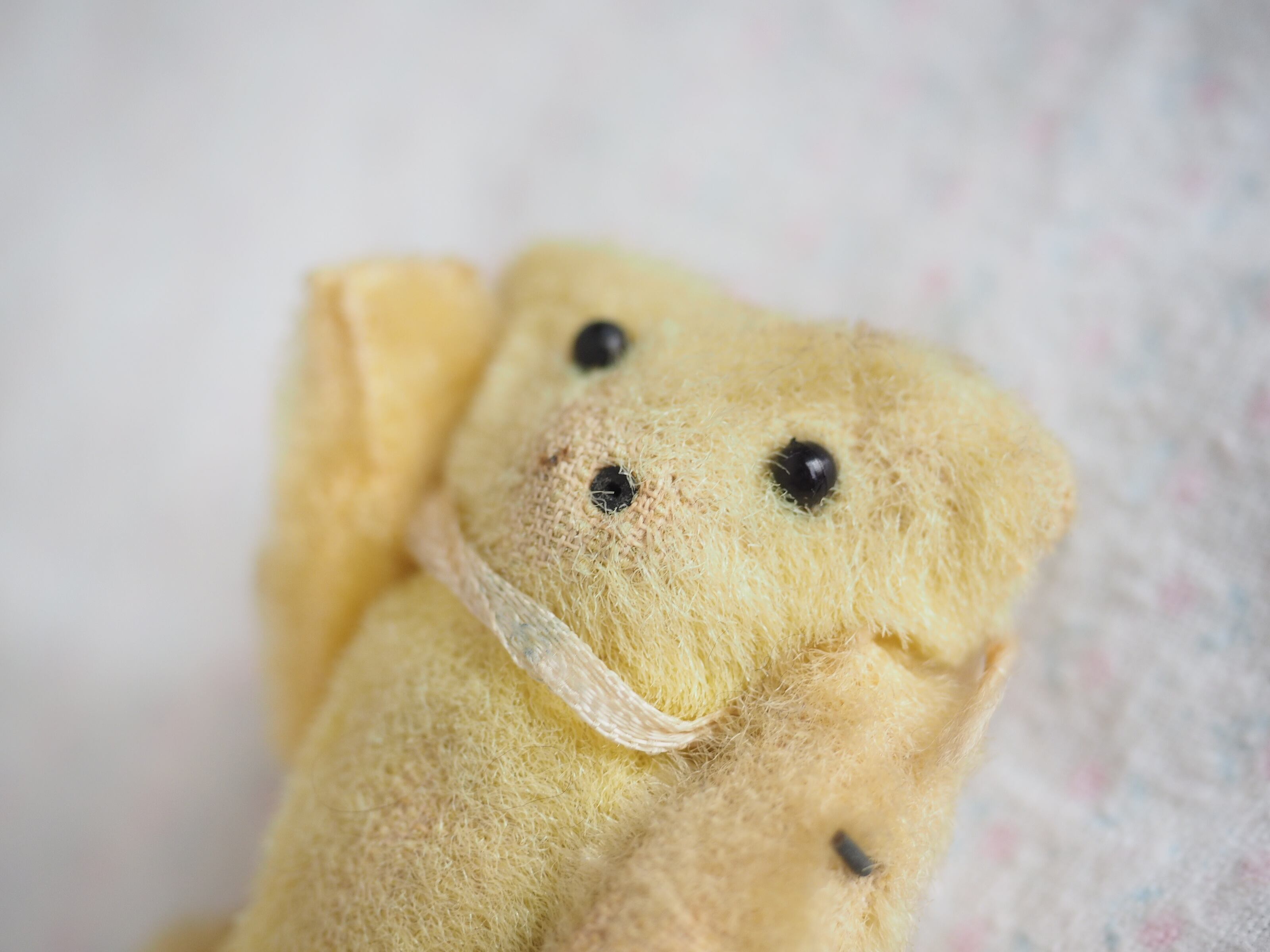 肩が上がったような様子も愛おしい、古びた小さなテディベア。
