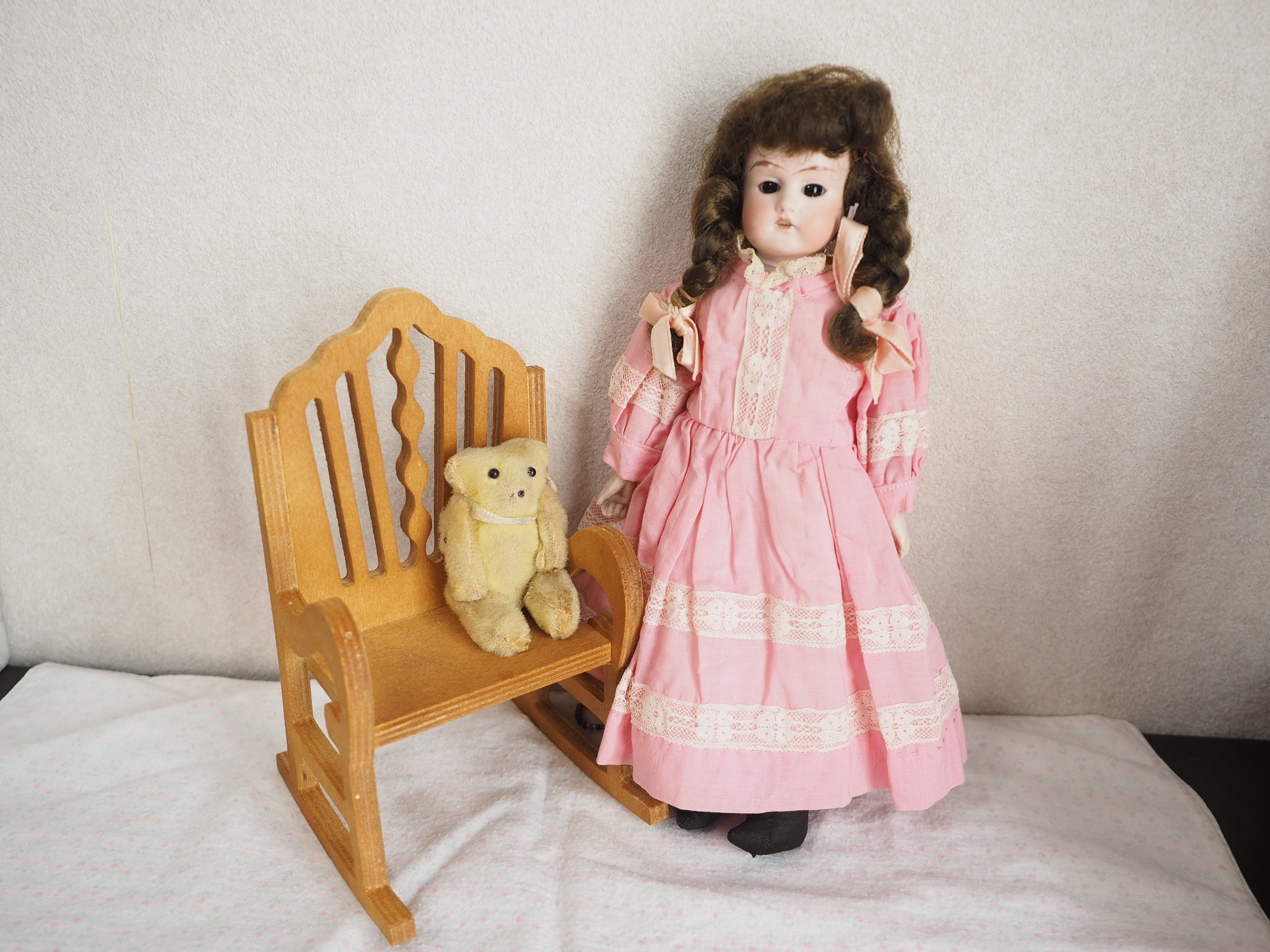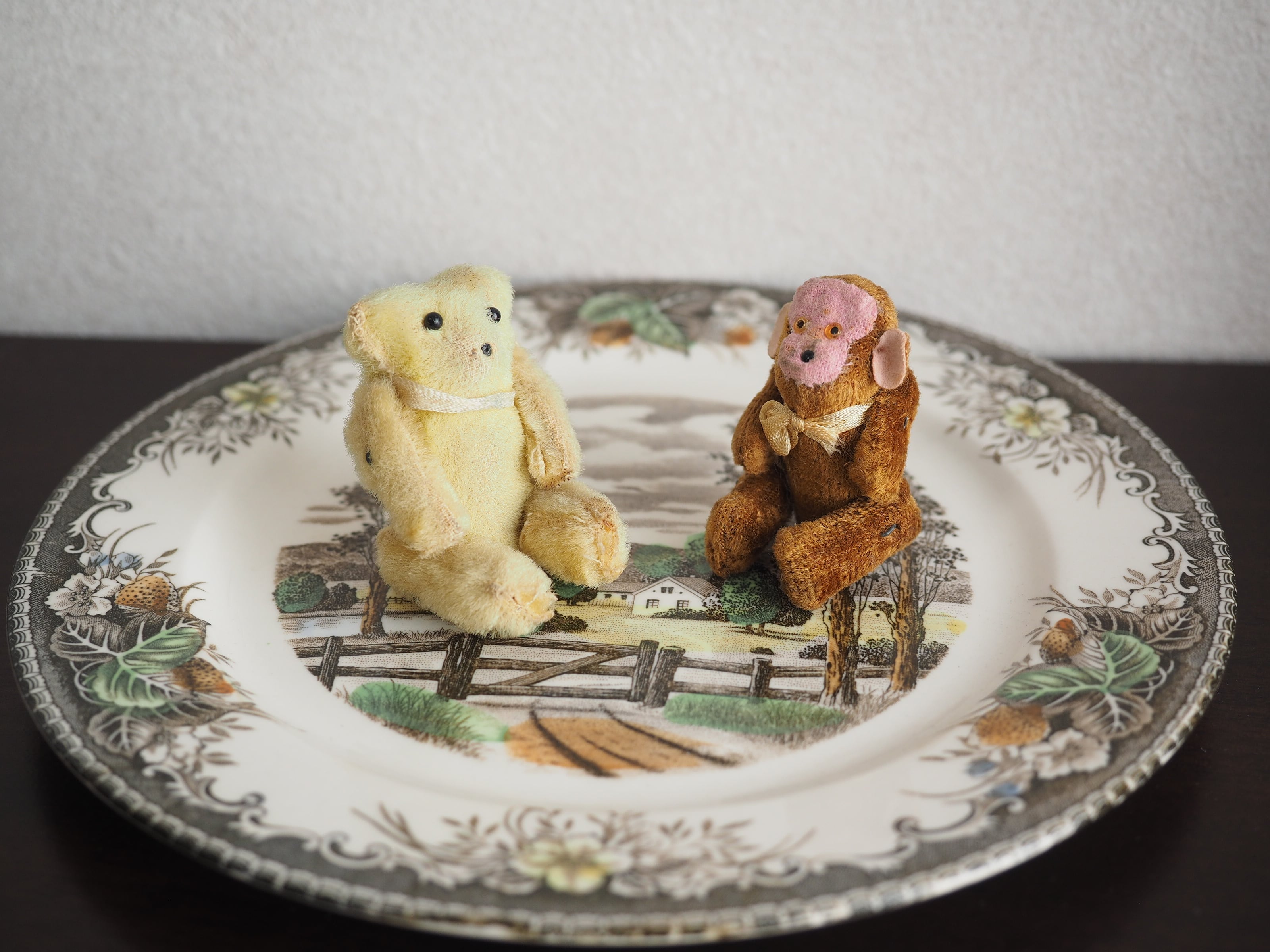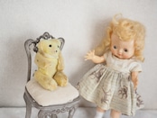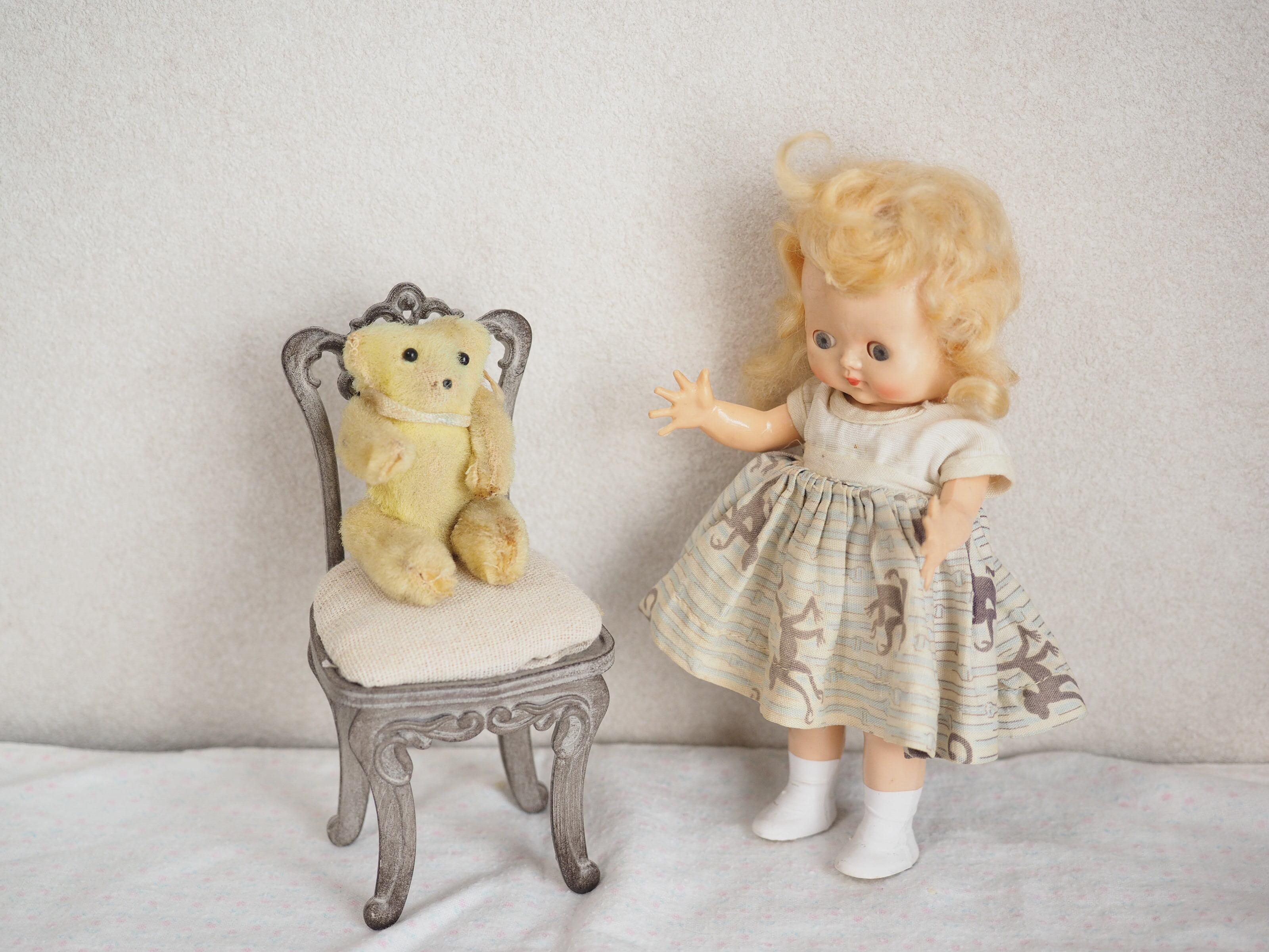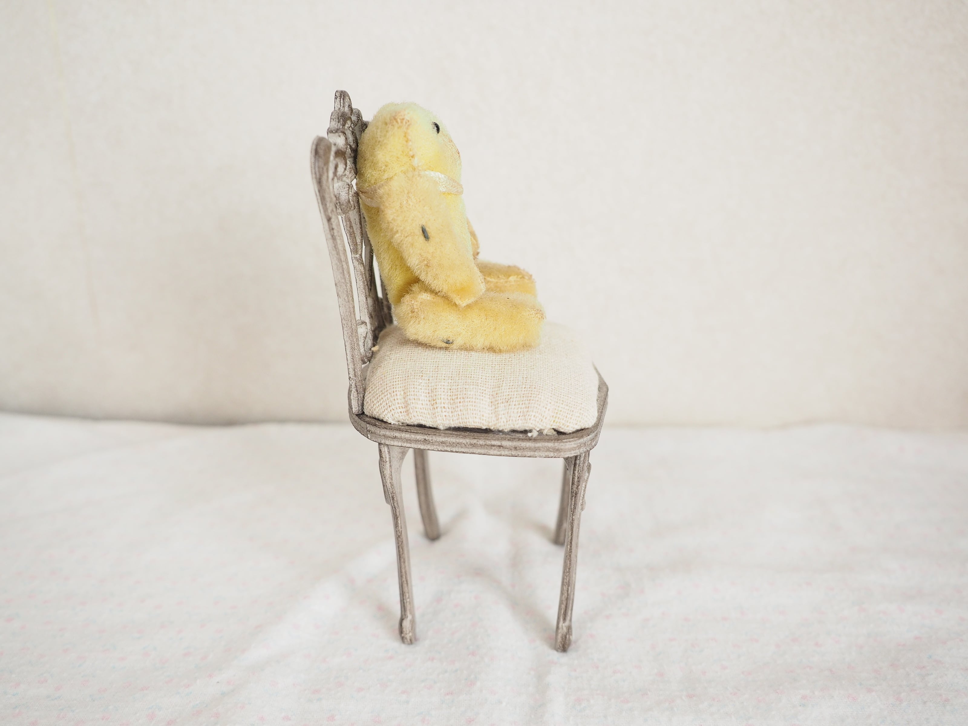 肩が上がったような様子も愛おしい、古びた小さなテディベア。