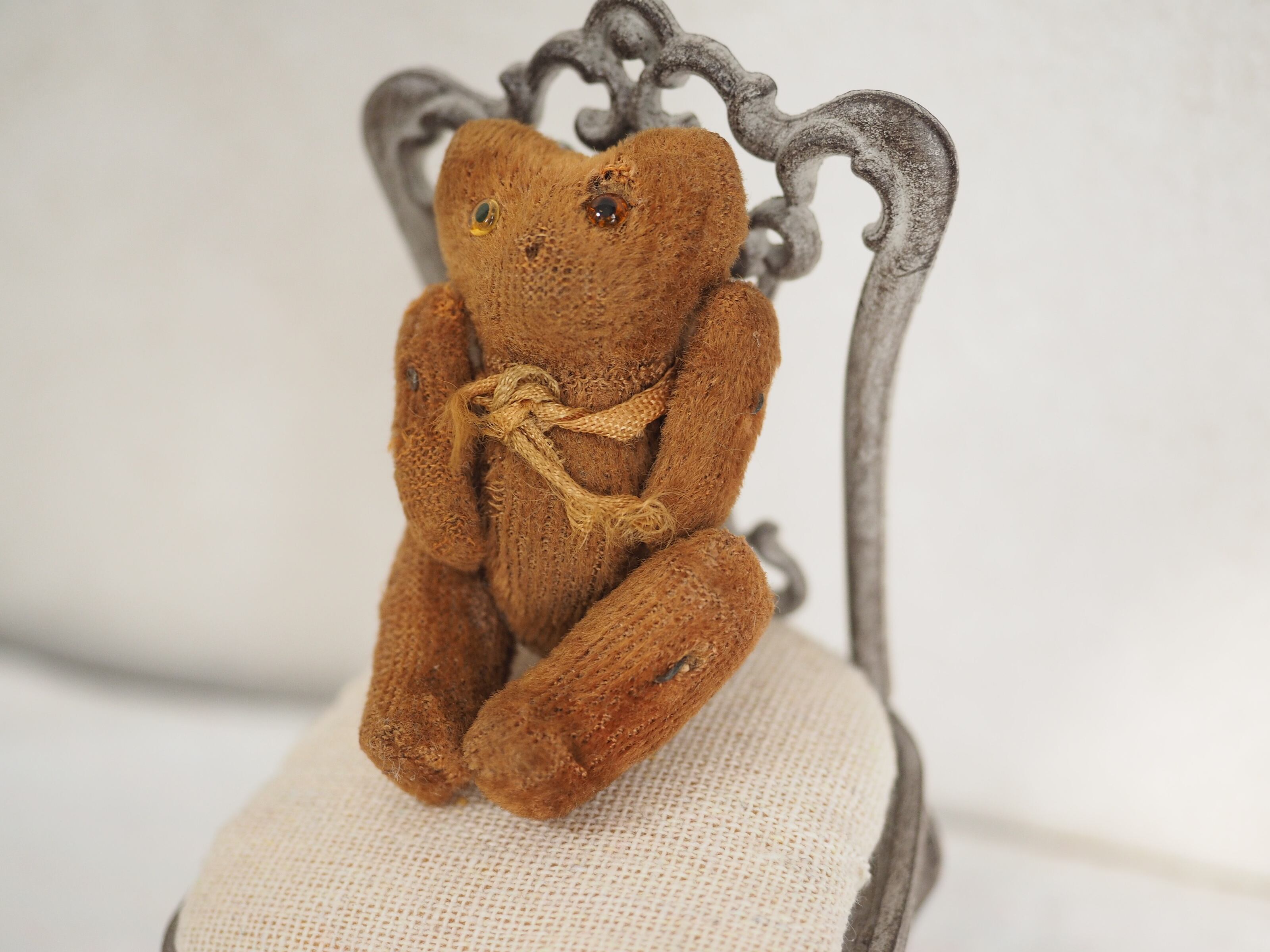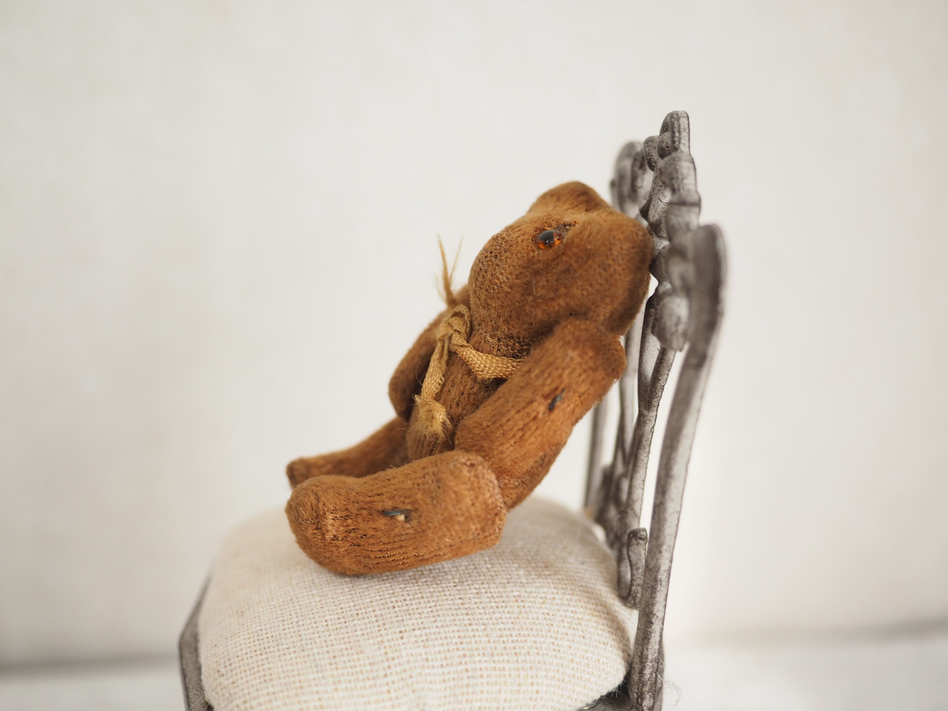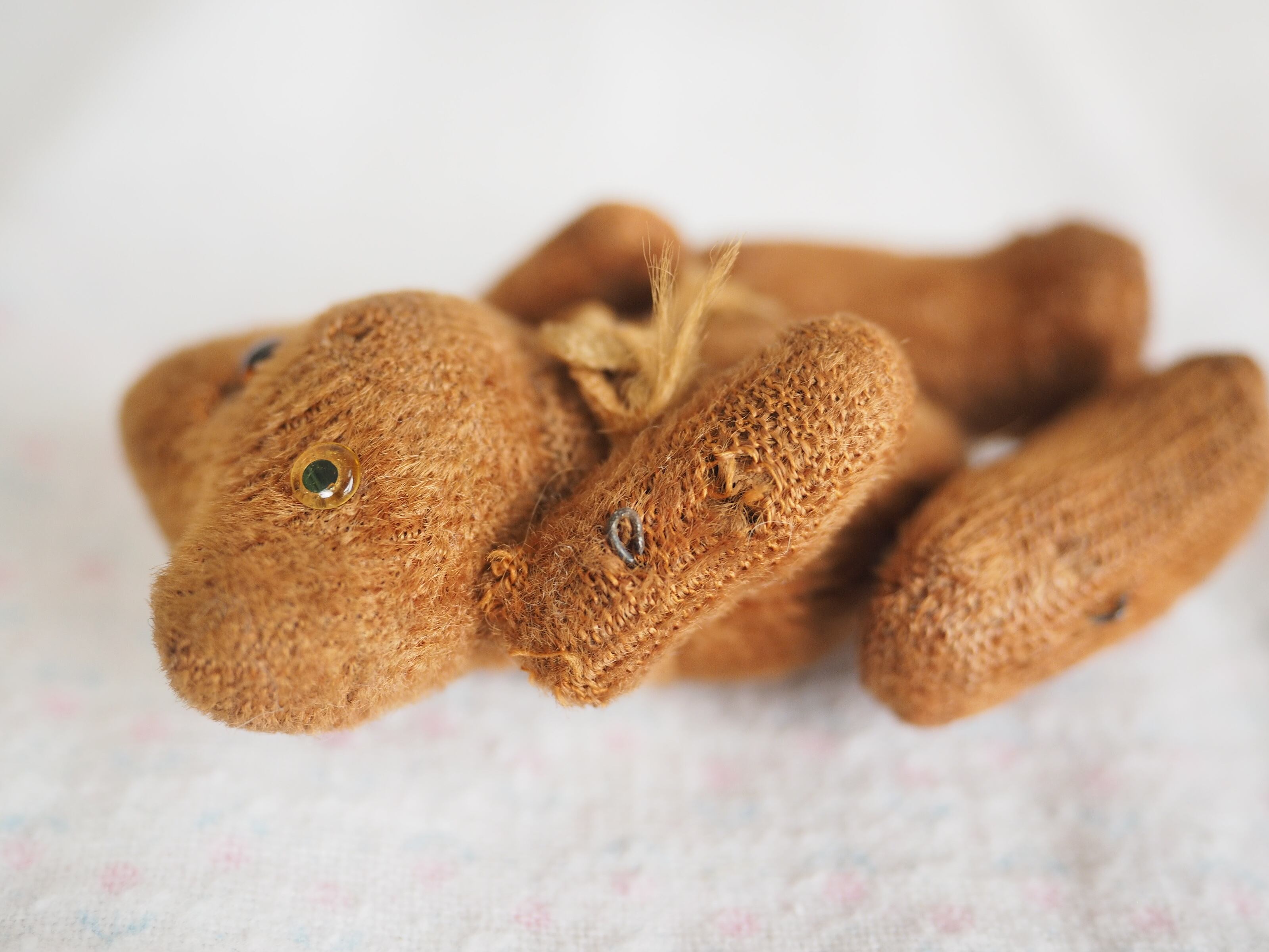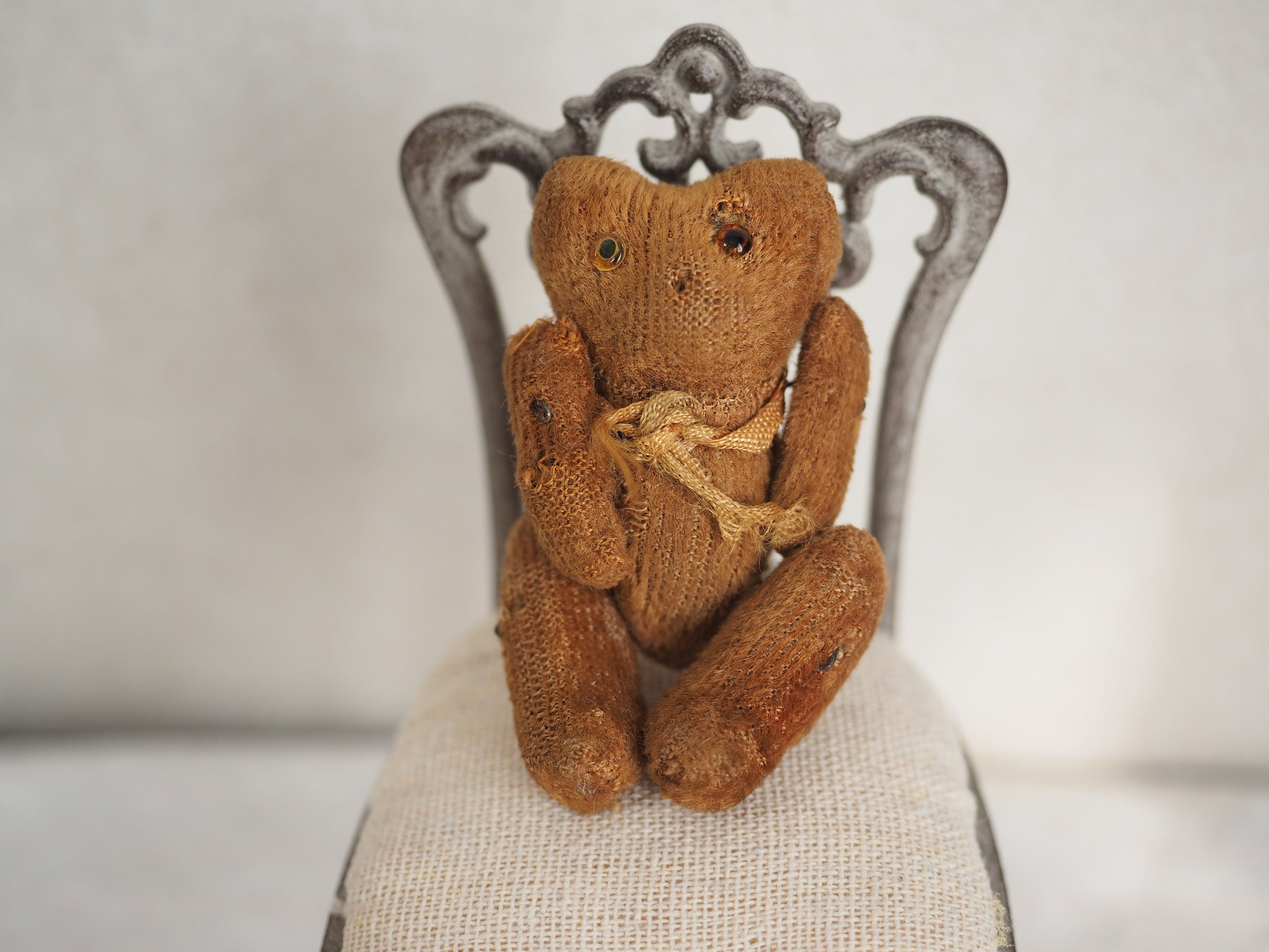 肩が上がったような様子も愛おしい、古びた小さなテディベア。
