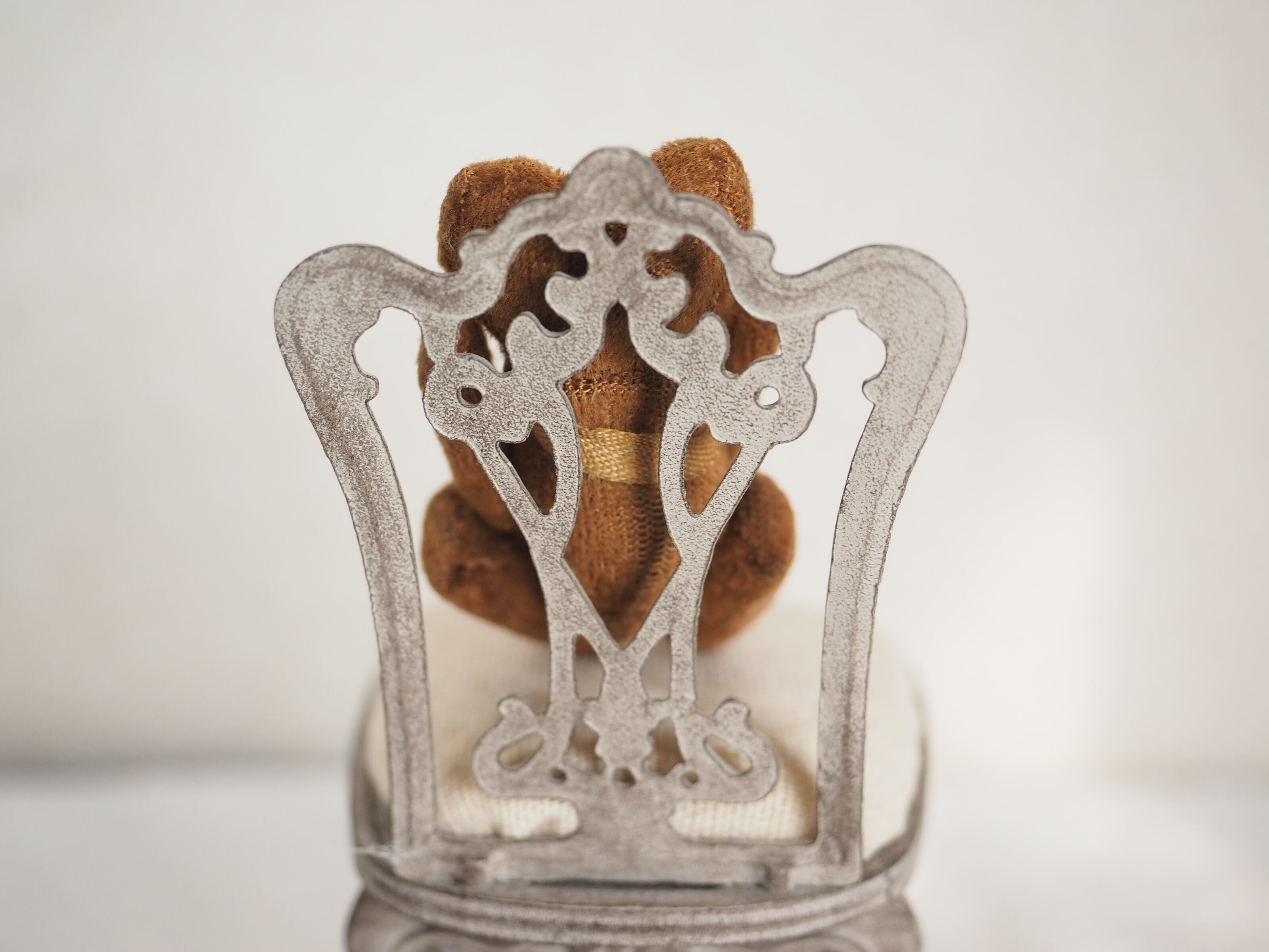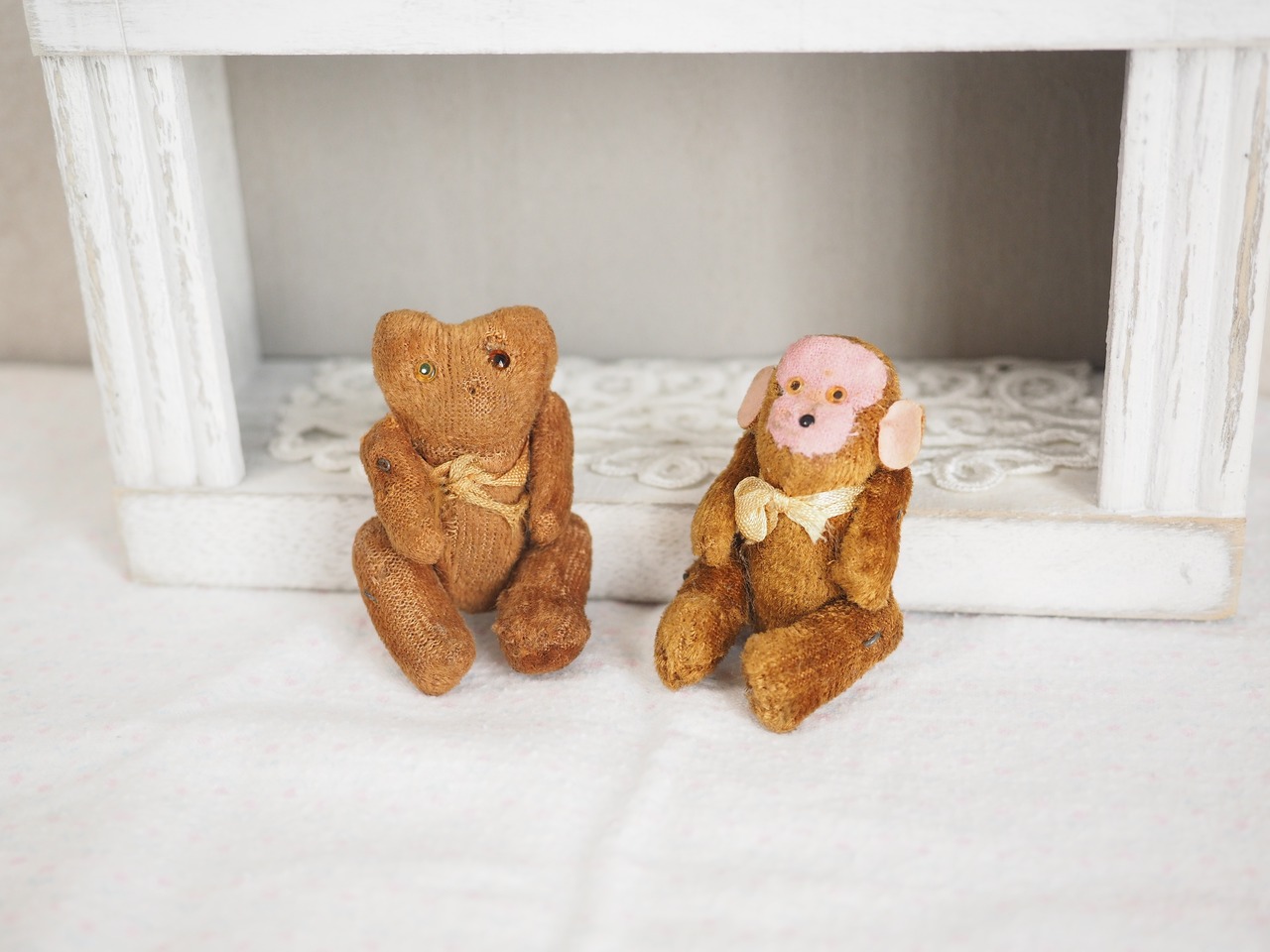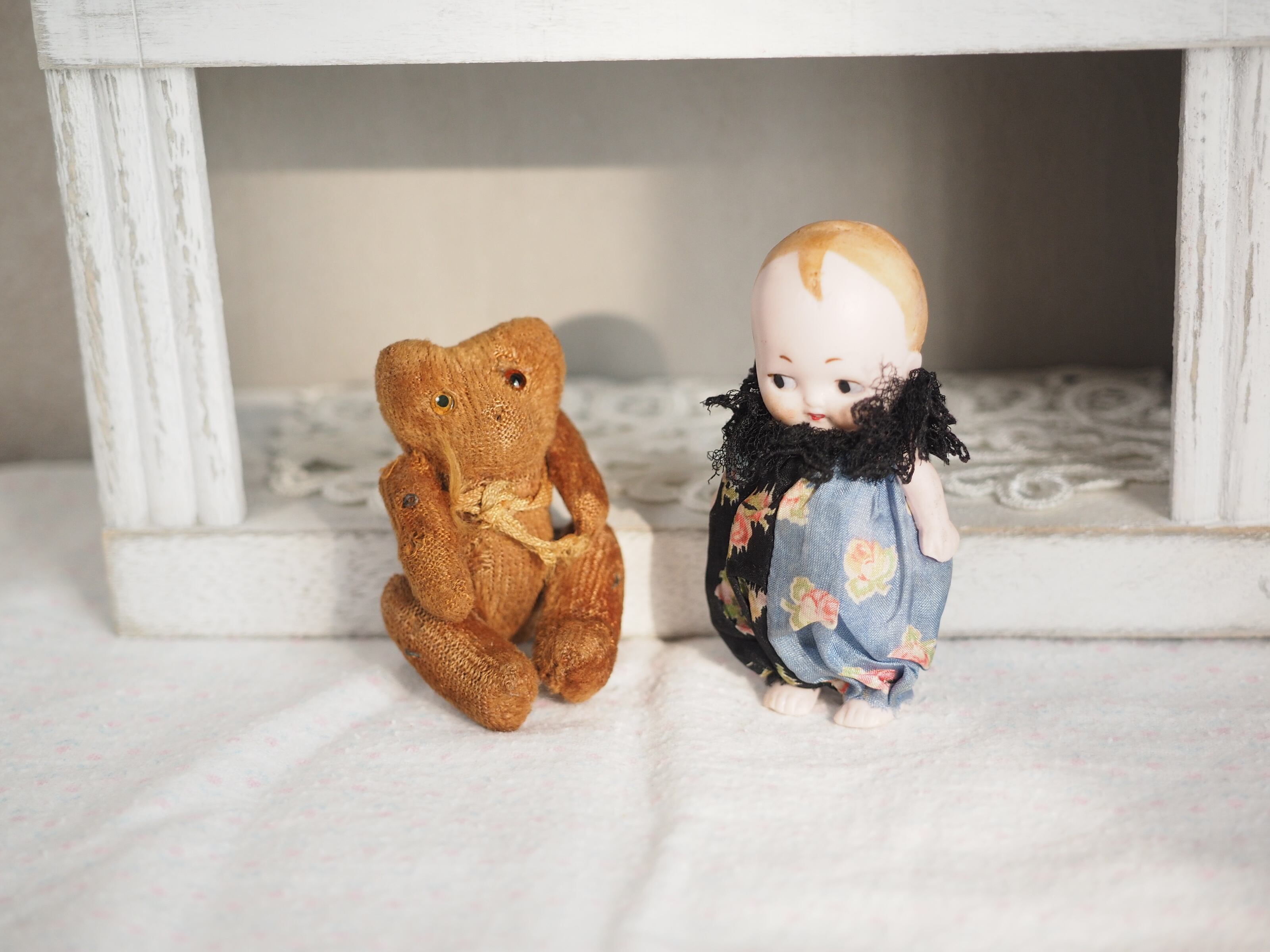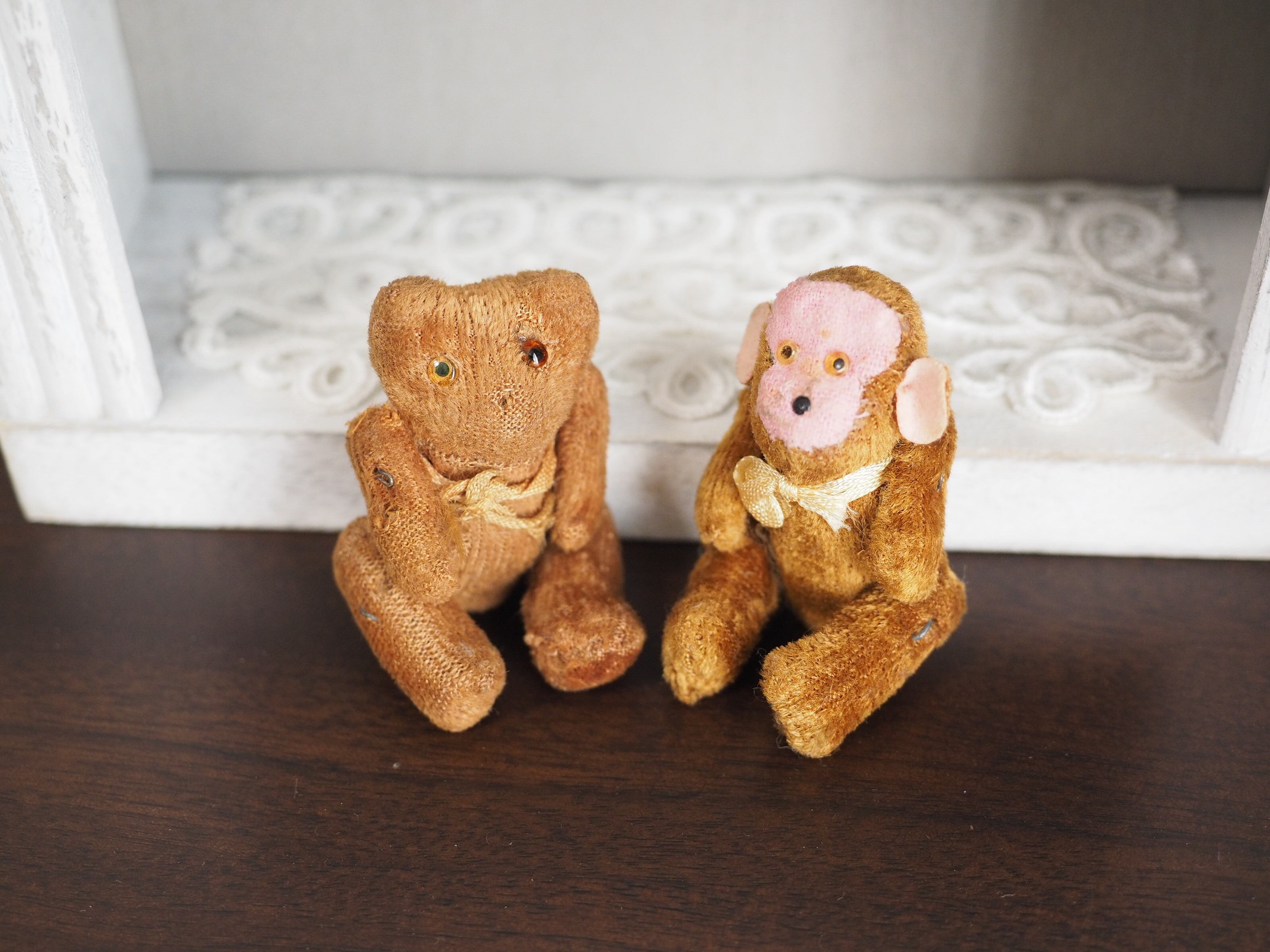 肩が上がったような様子も愛おしい、古びた小さなテディベア。