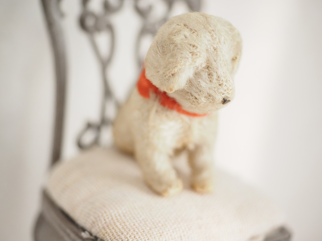 お座りした手の様子も愛おしい、古びた小さなぬいぐるみ。