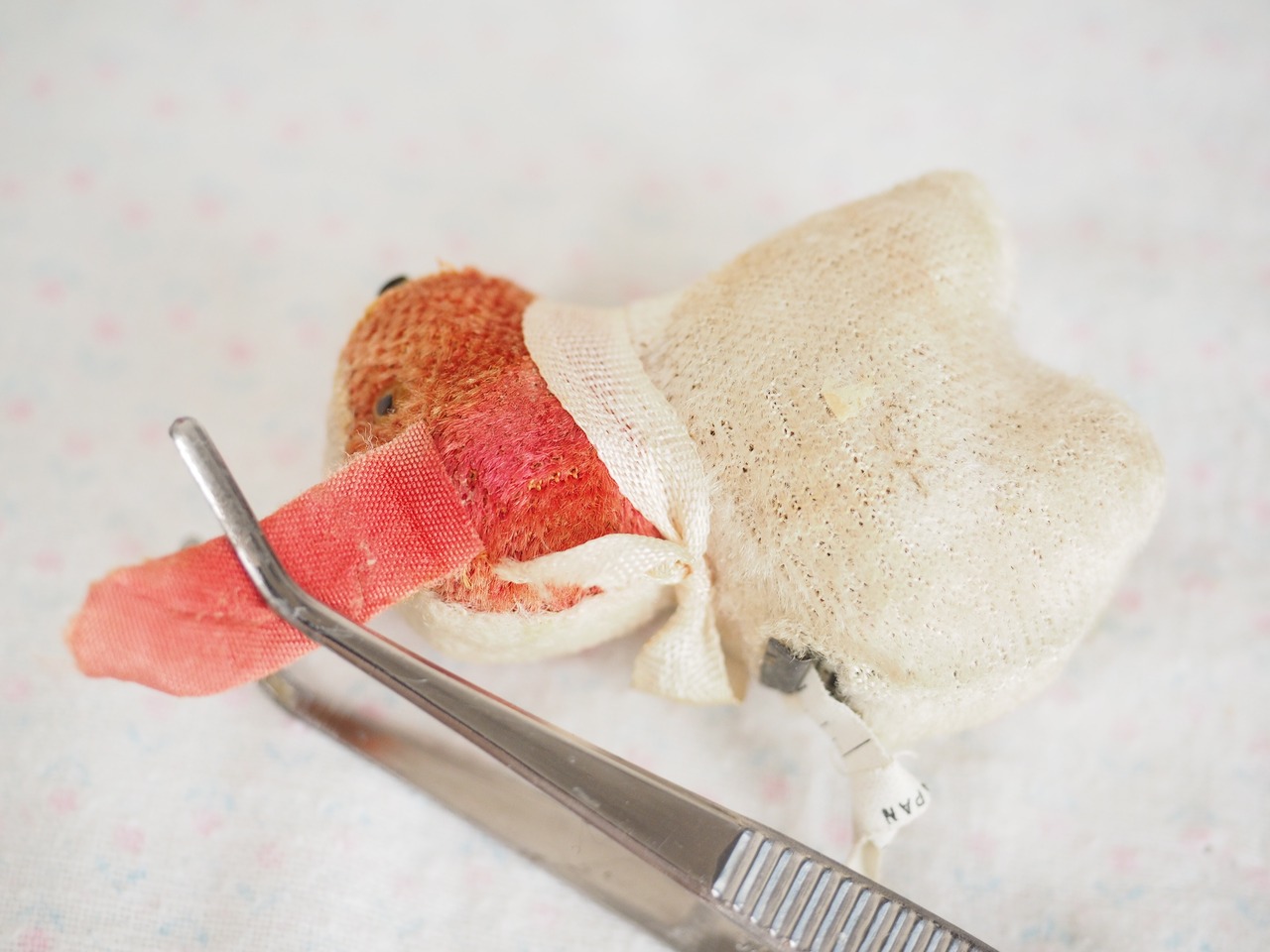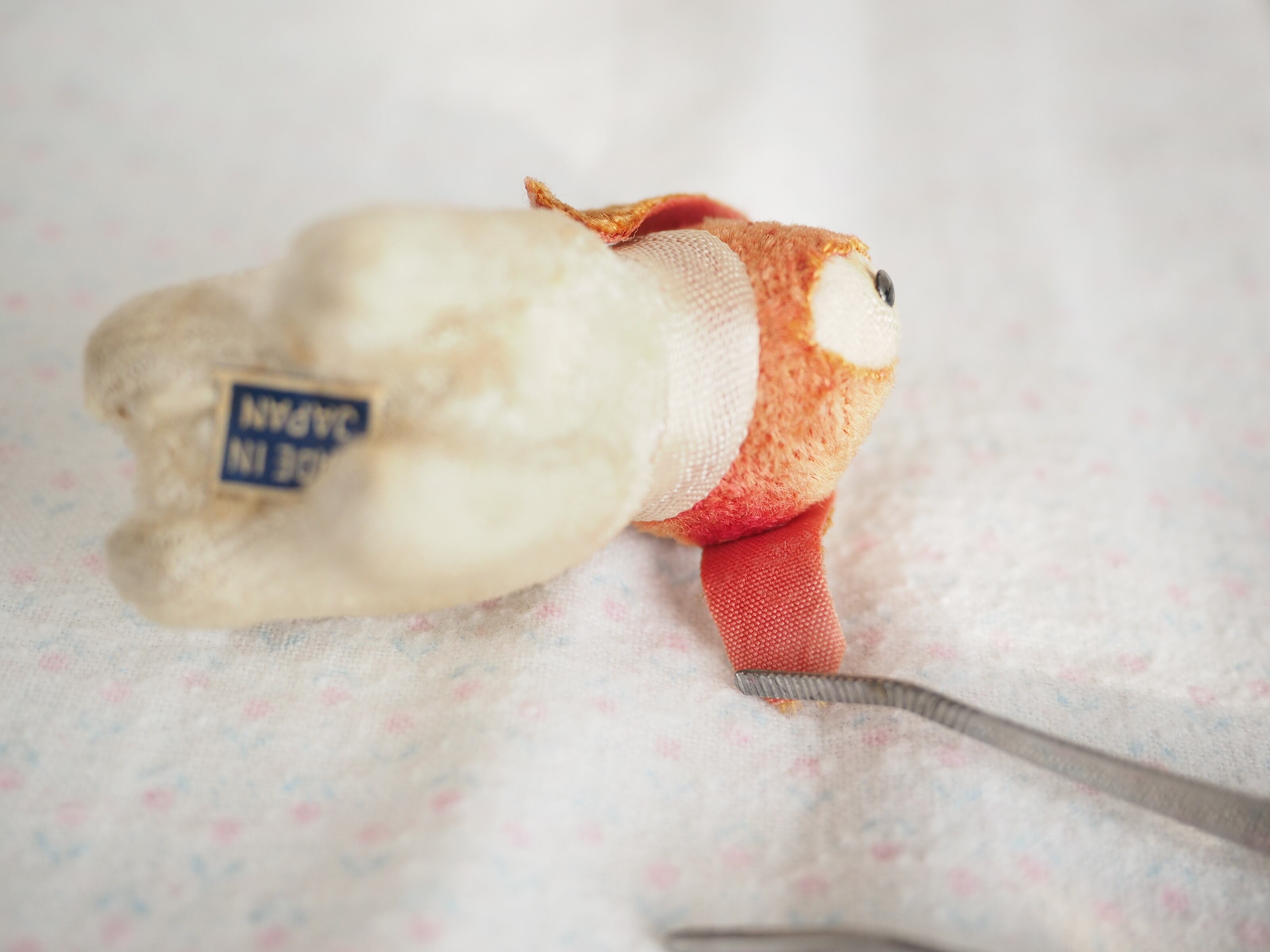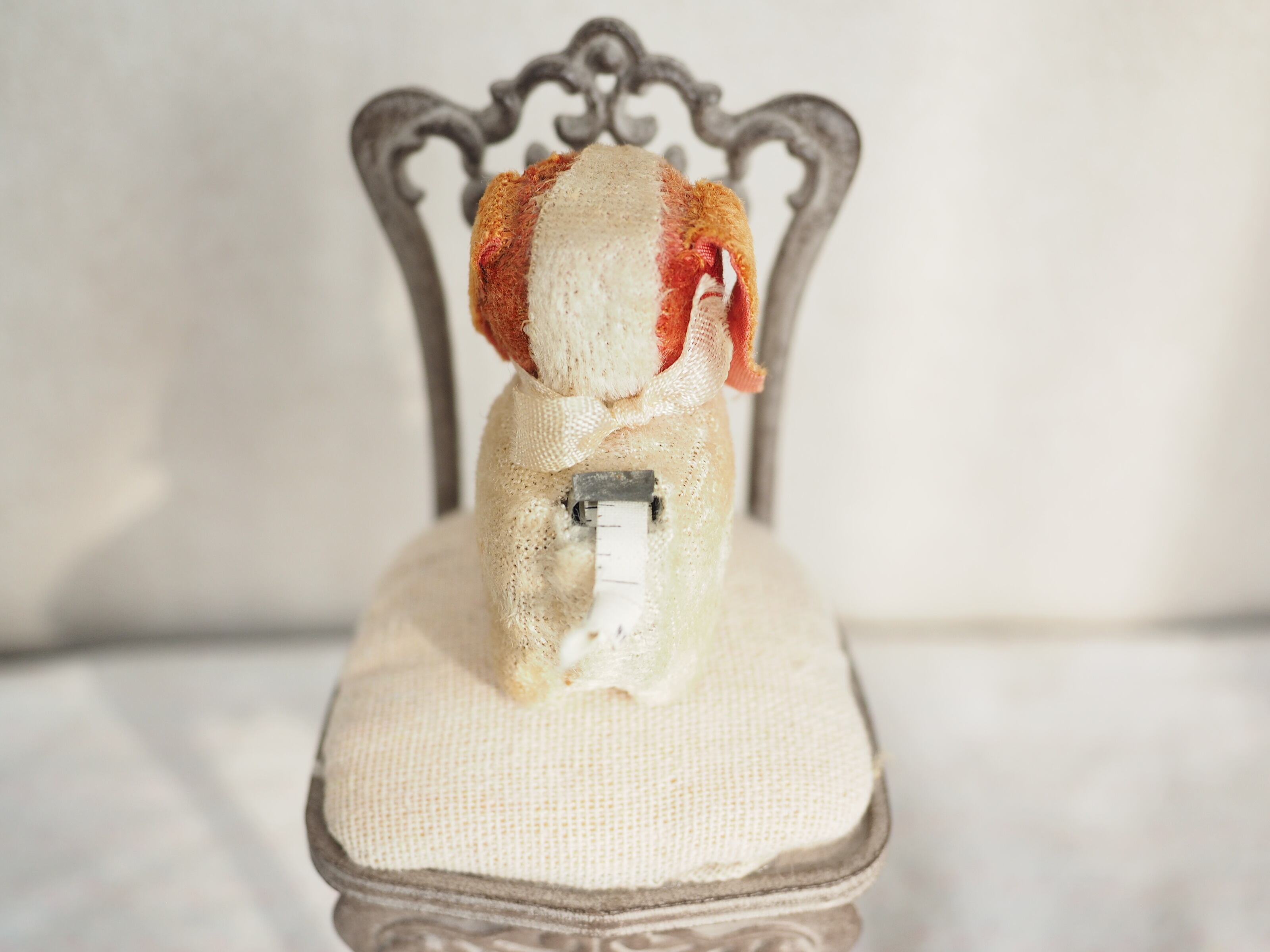 すくっと立ち姿が愛らしい、古びた小さなぬいぐるみ。しっぽの上はメジャーになっています。