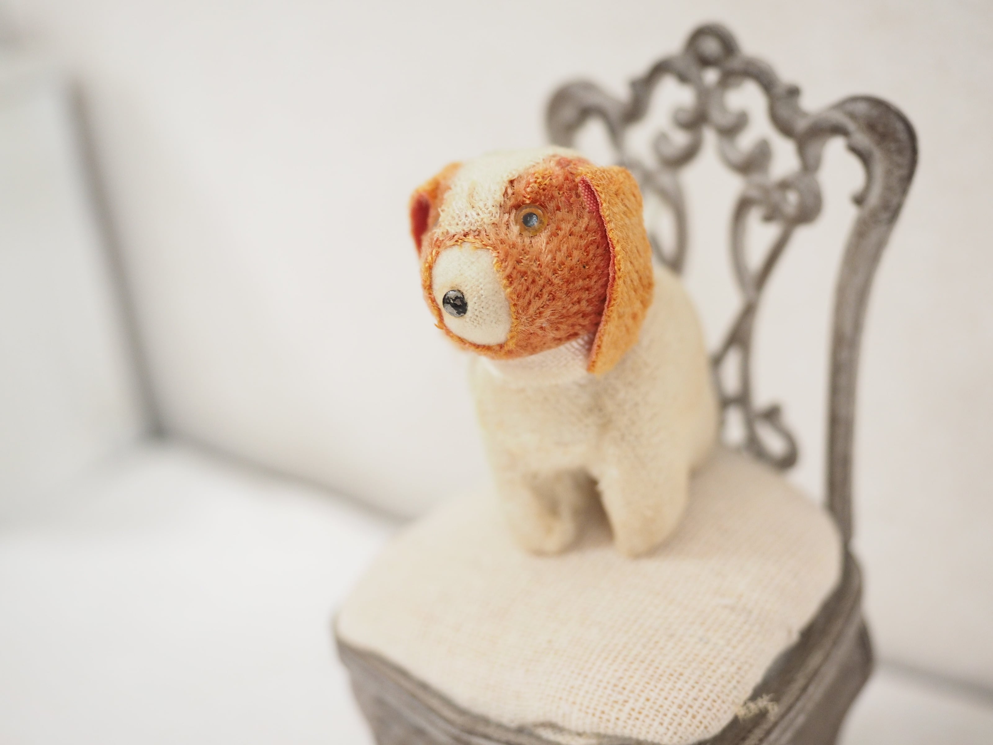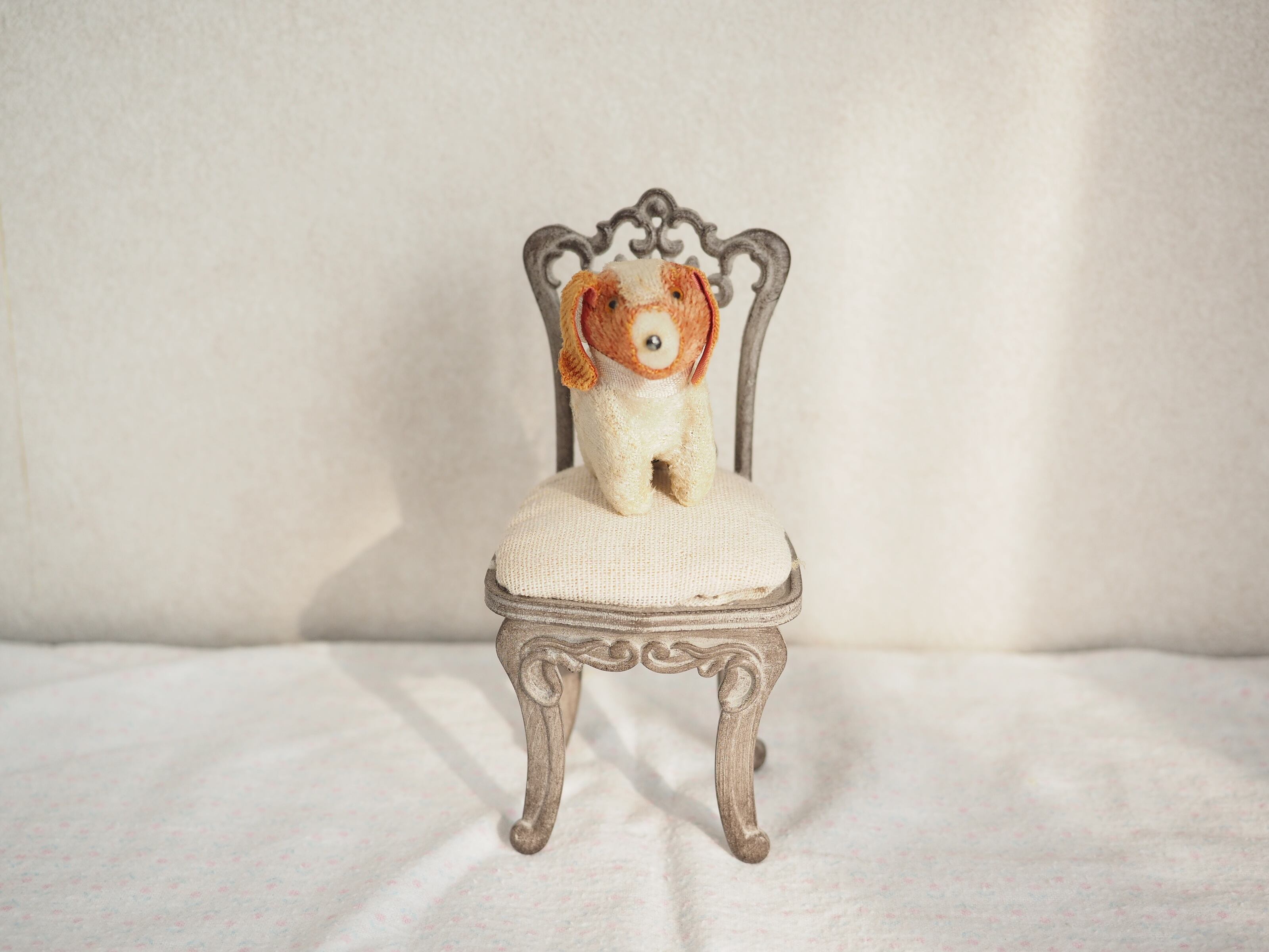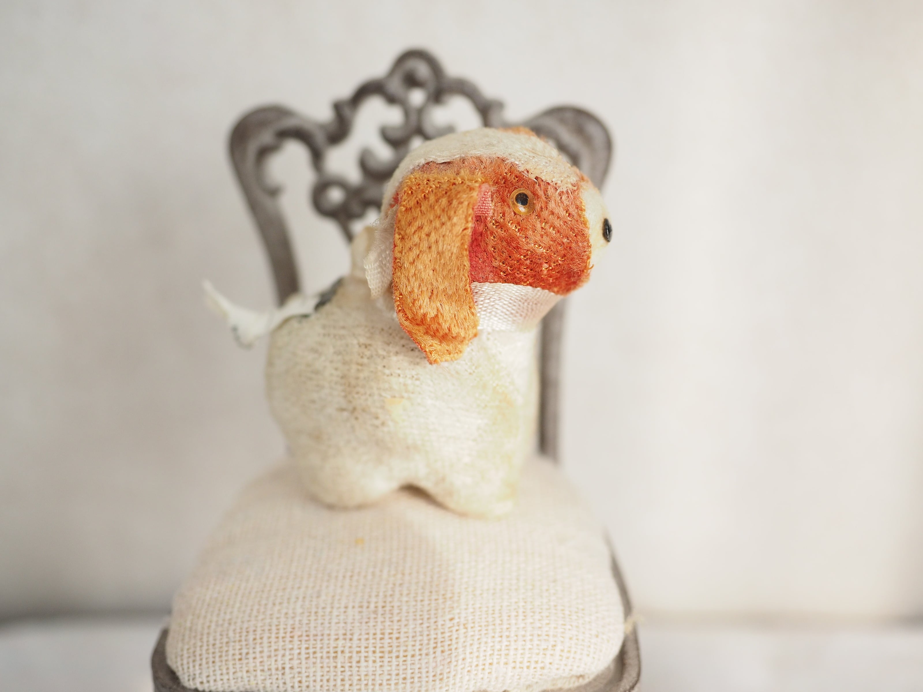 とても小さなサイズ感と細やかな作りが愛おしい、古いイヌのぬいぐるみです。