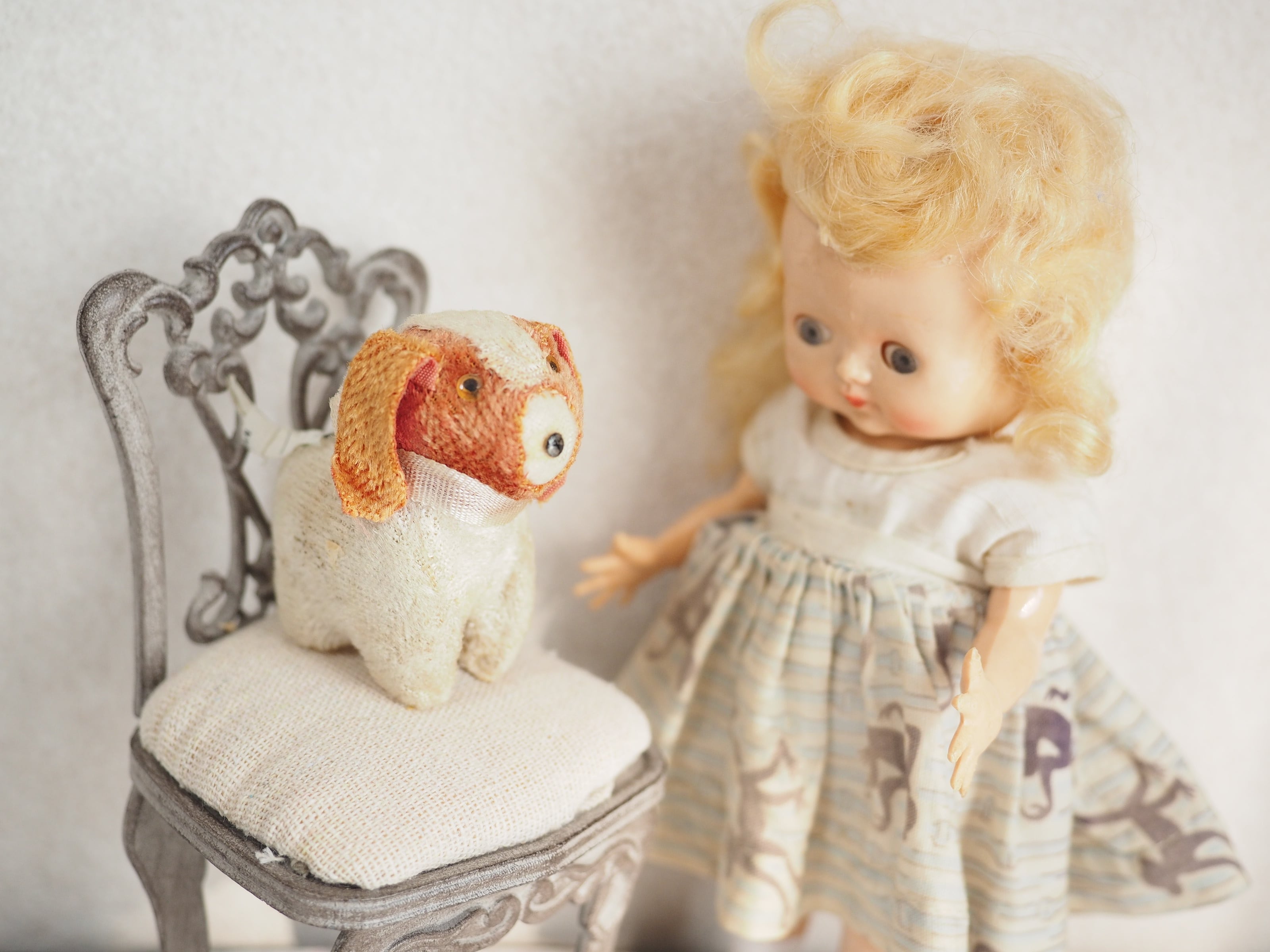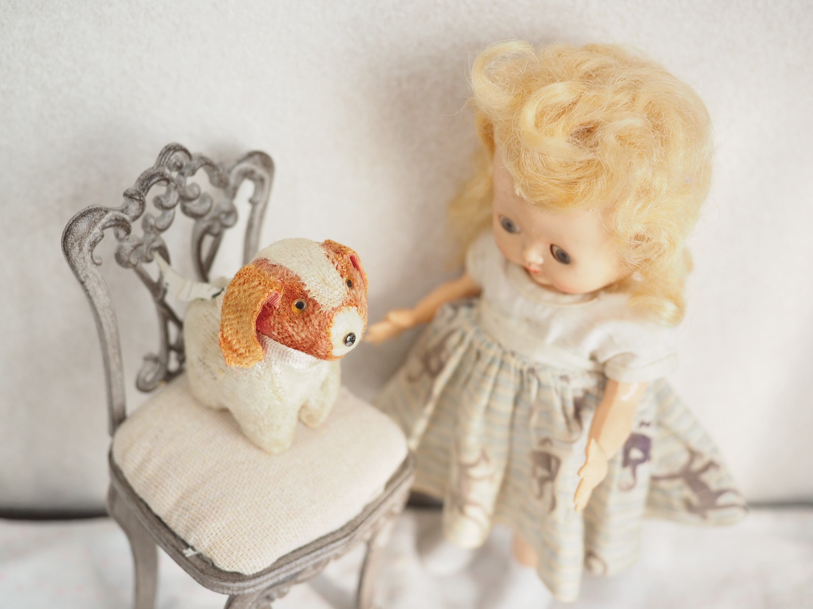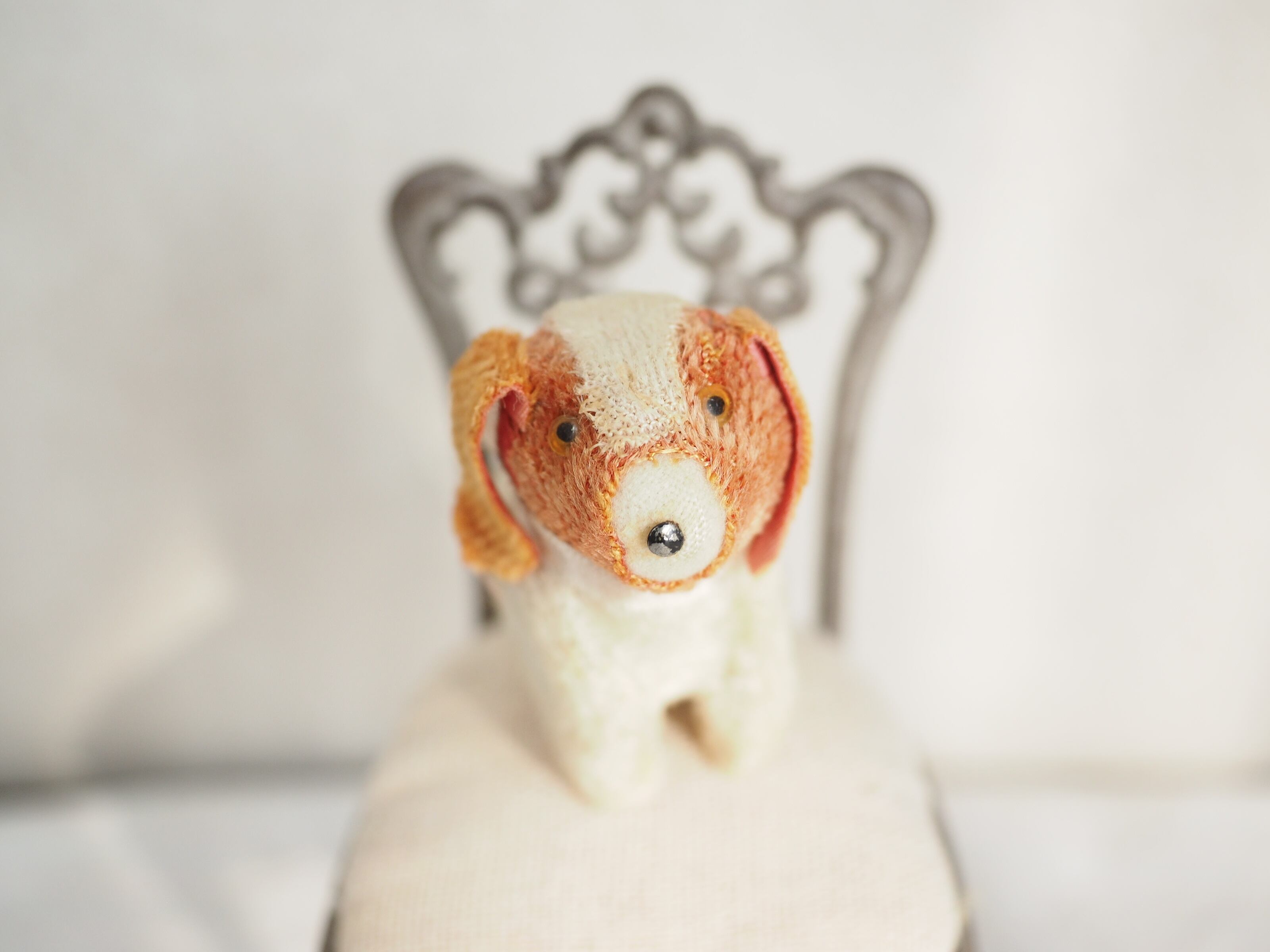 とても小さなサイズ感と細やかな作りが愛おしい、古いイヌのぬいぐるみです。