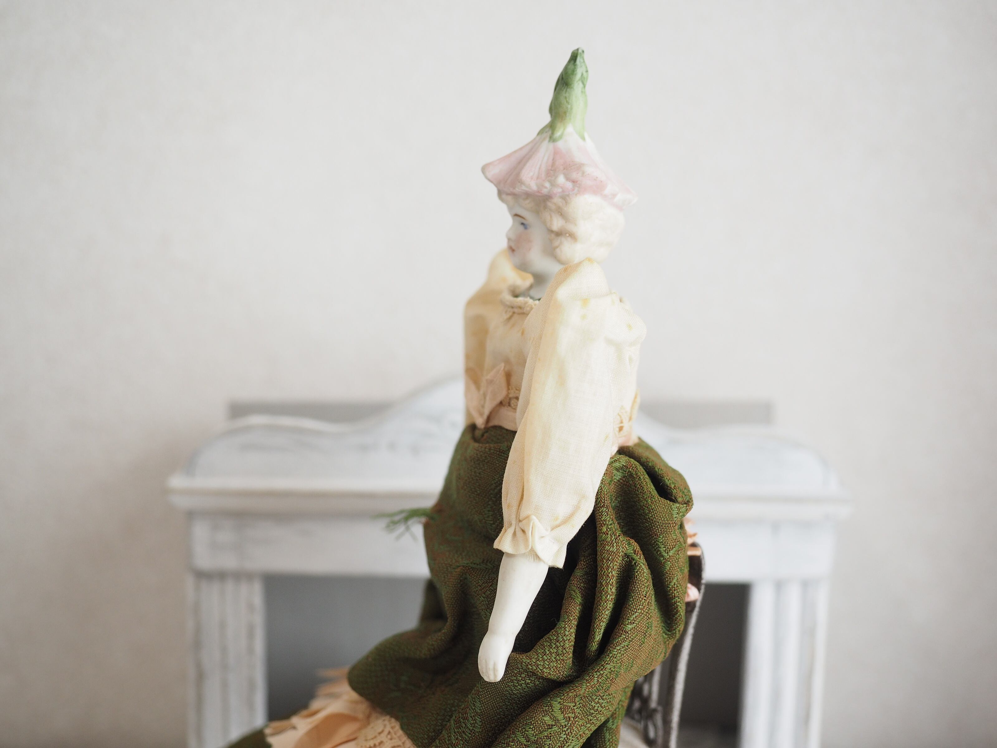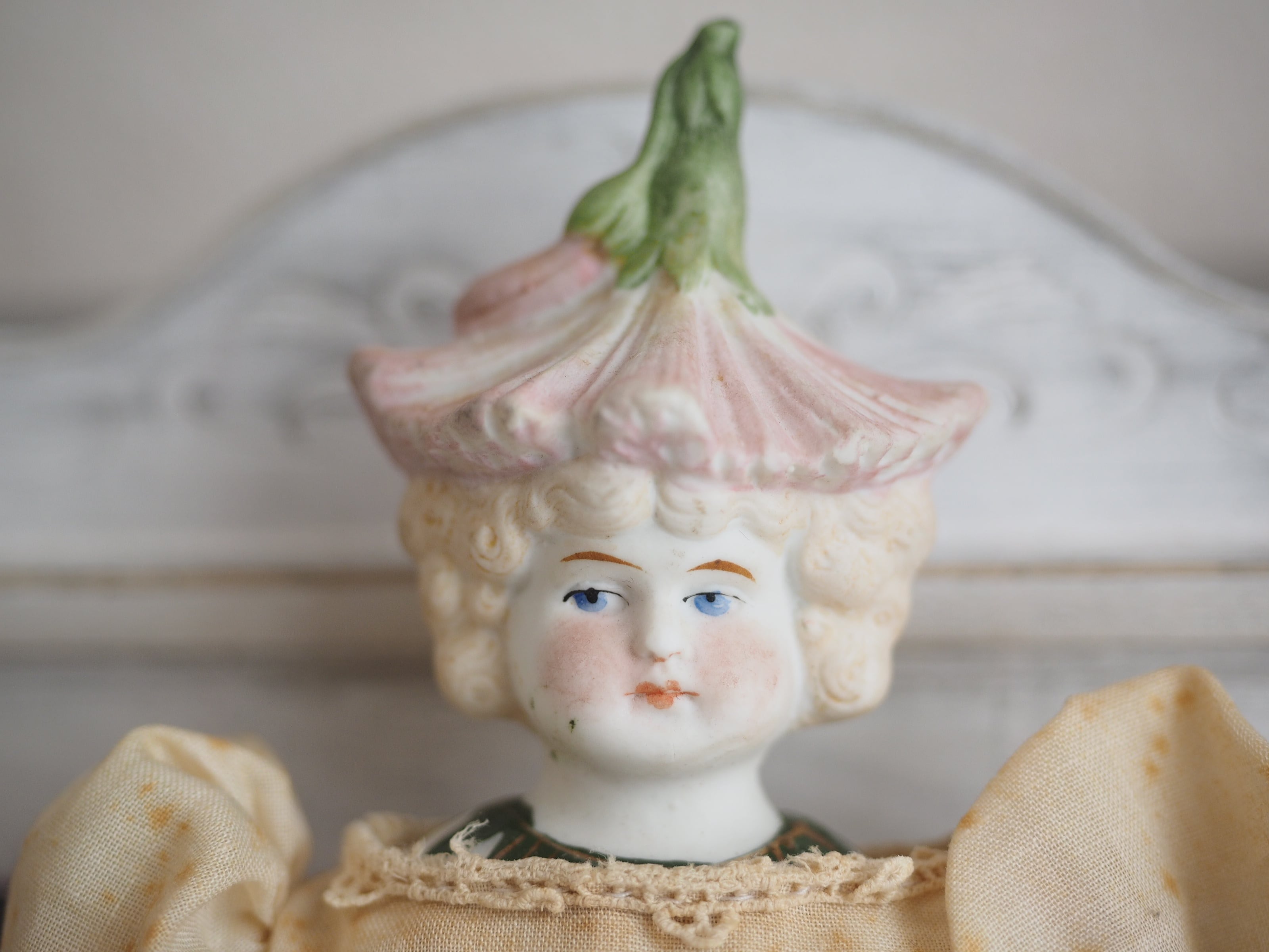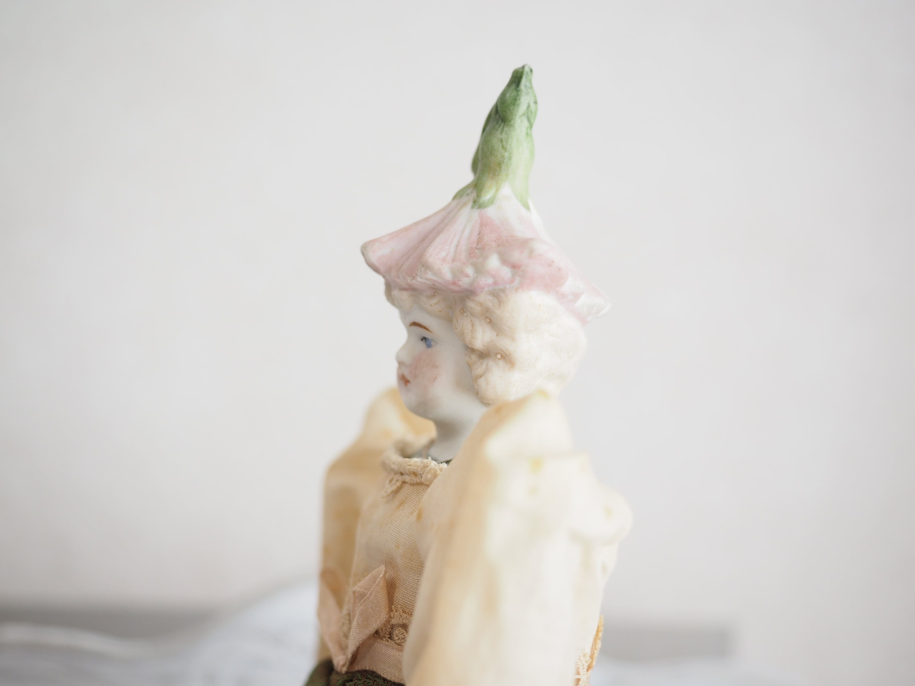 お顔はパリアンで、お花の淡い色合いと相まって妖精のような儚い美しさ。。(パリアン:施釉、着色されていない磁器から作られる)