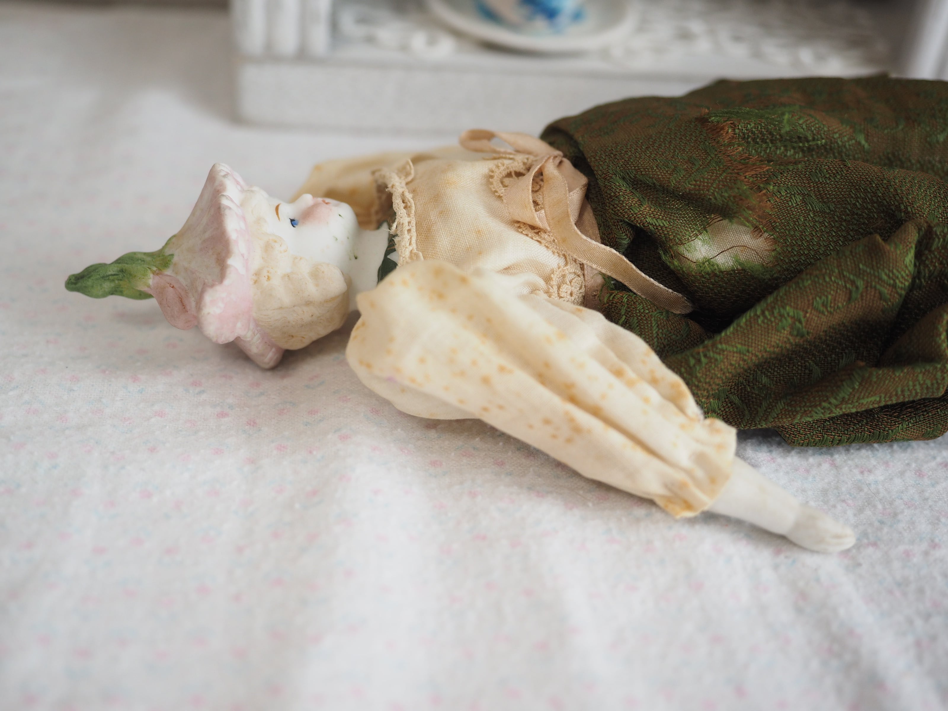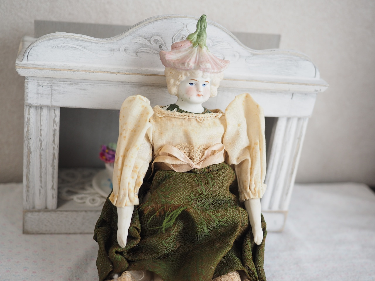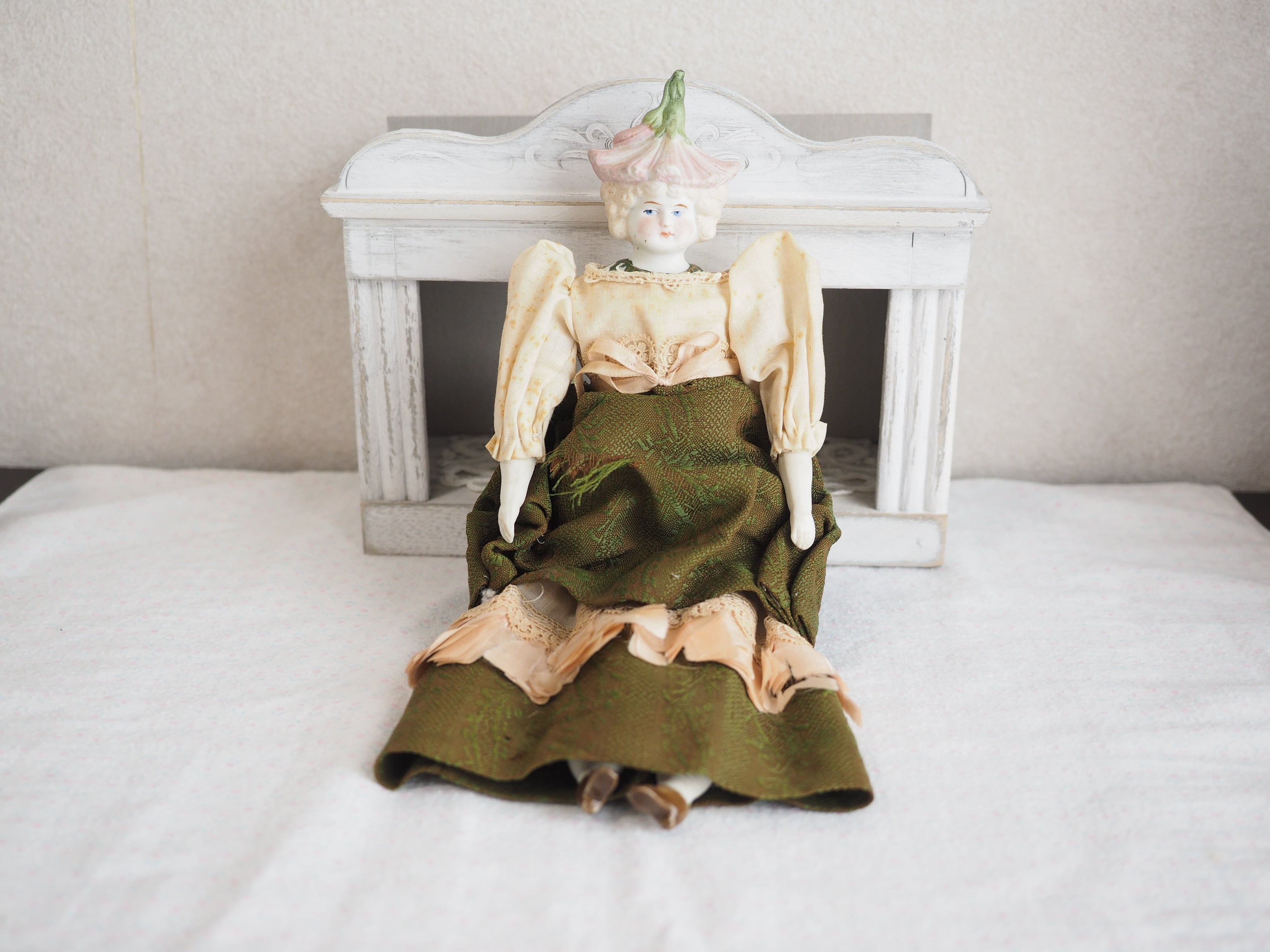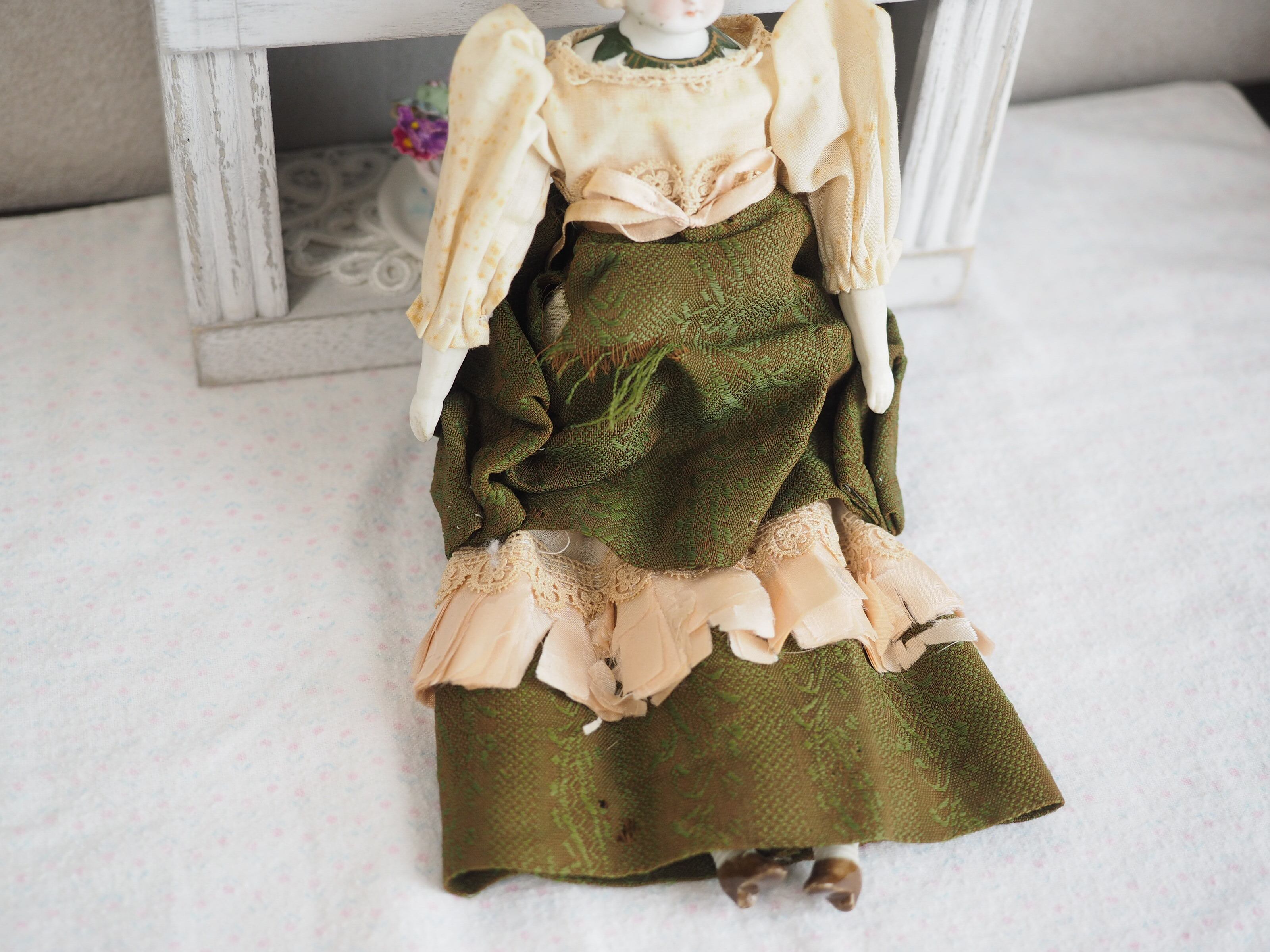 お顔はパリアンで、お花の淡い色合いと相まって妖精のような儚い美しさ。。(パリアン:施釉、着色されていない磁器から作られる)