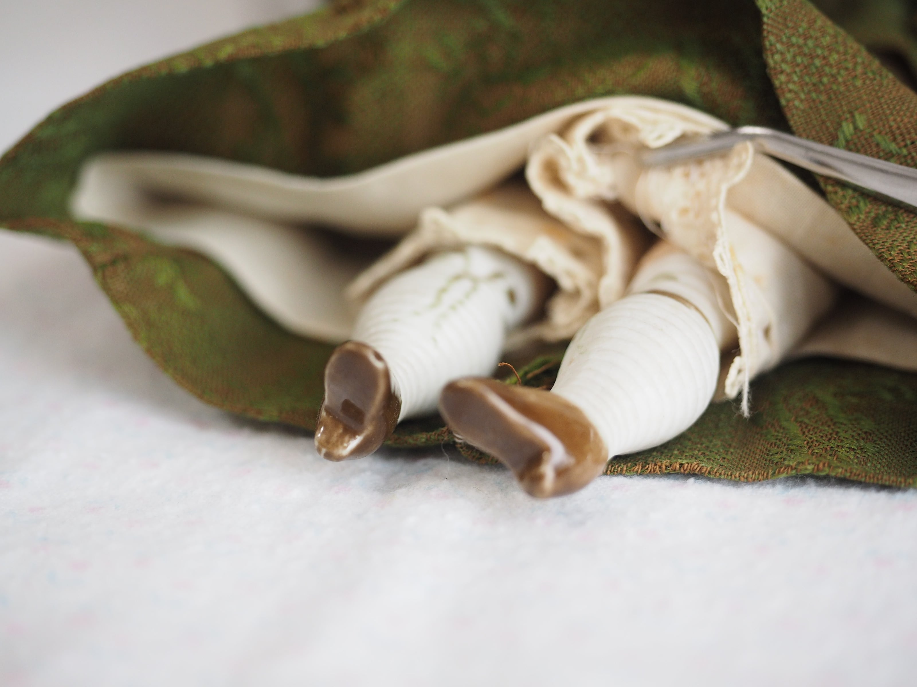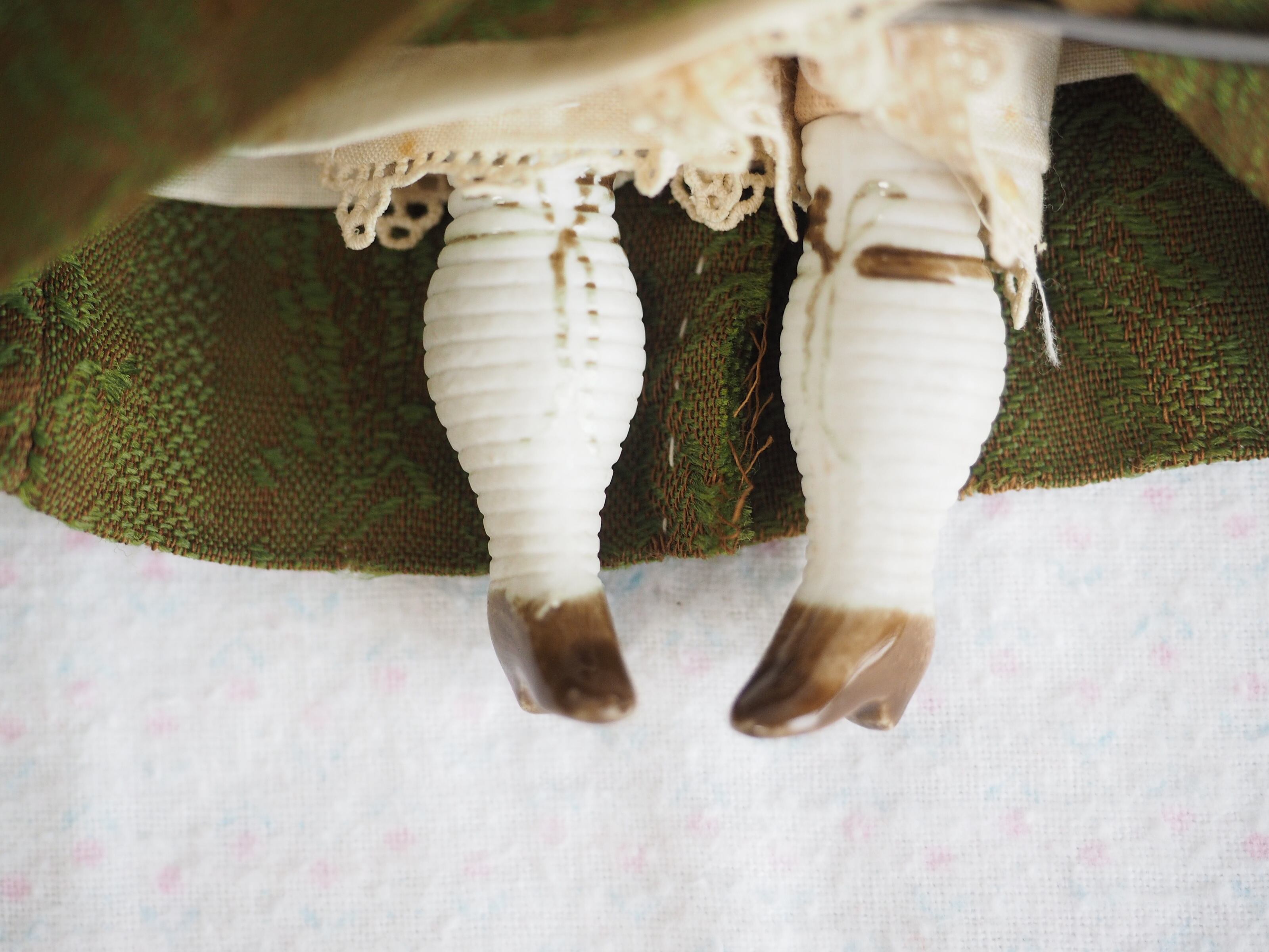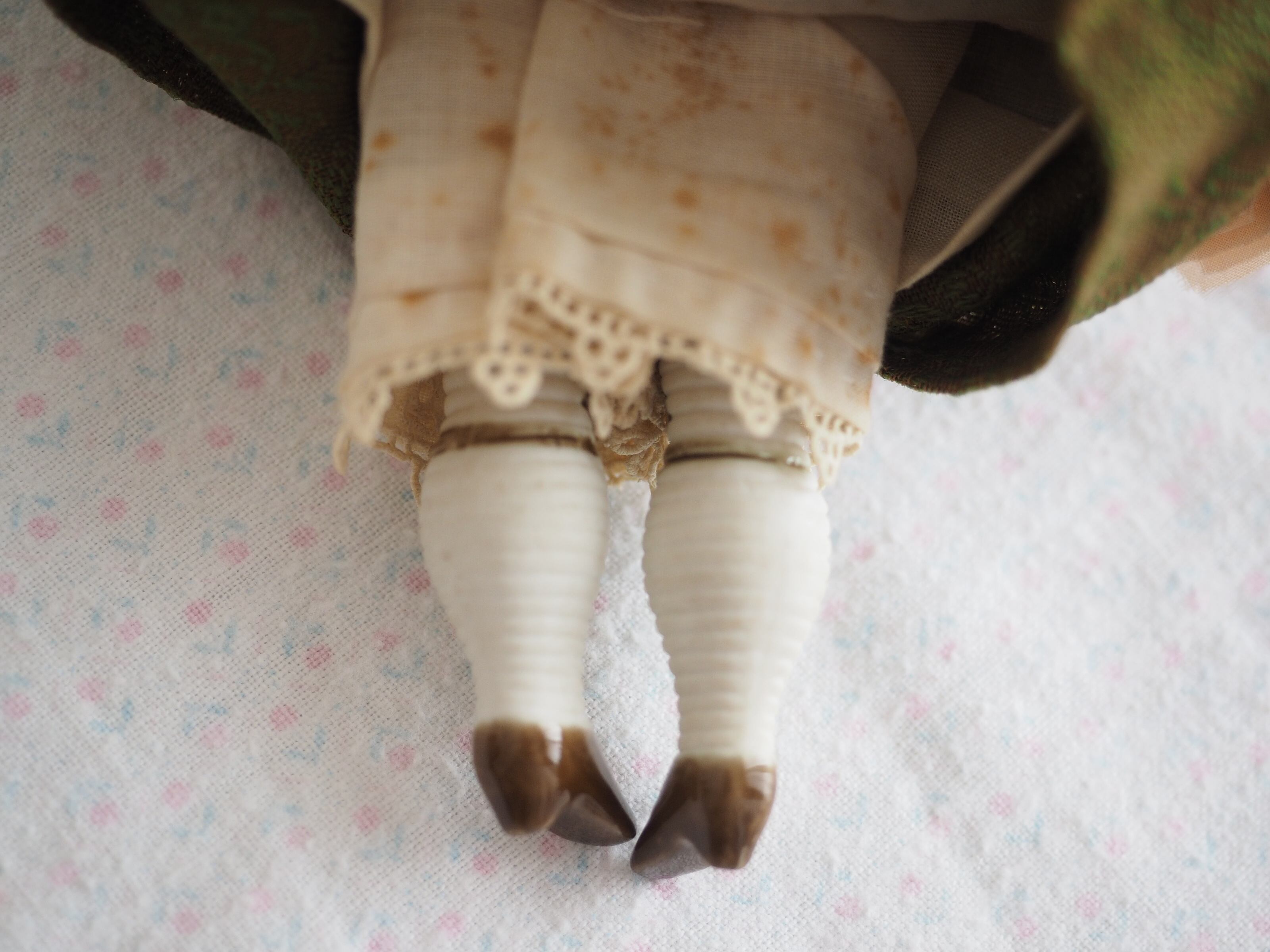 ブラウンのリボンと小さなシューズの足元が可憐です。