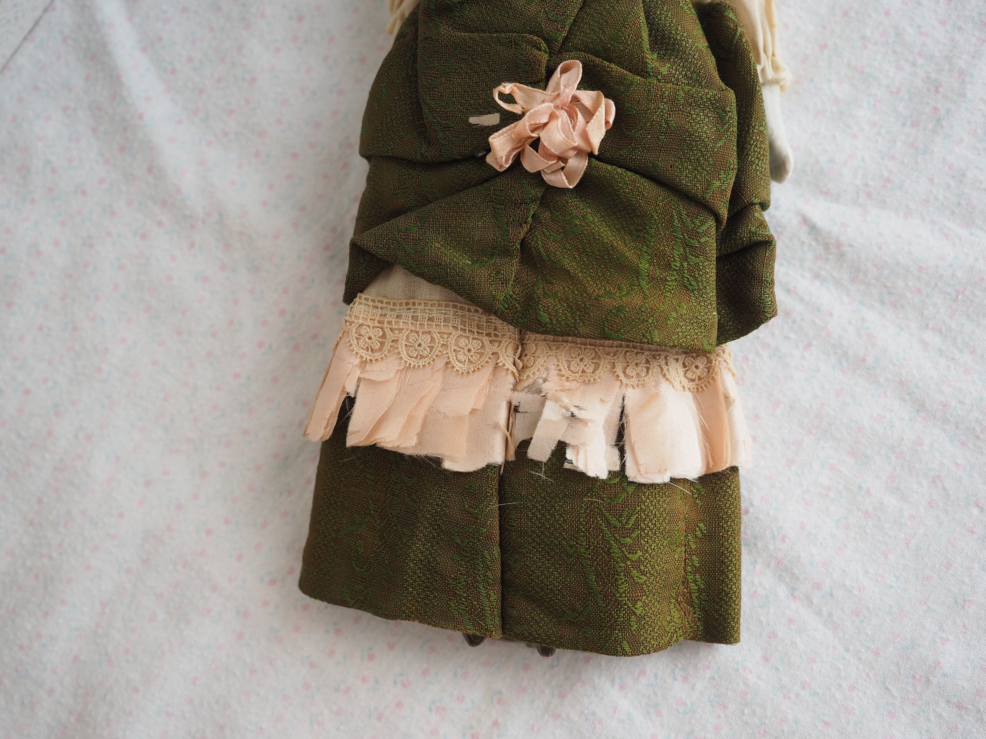 後ろはピン留めされていて、とても古いドレスは脱がせておりません。スカートのピンクの裾はシルク素材で崩れており、どんどん砕けてしまいます。動かさずとも画像よりも失われてしまいますことをお許しください。