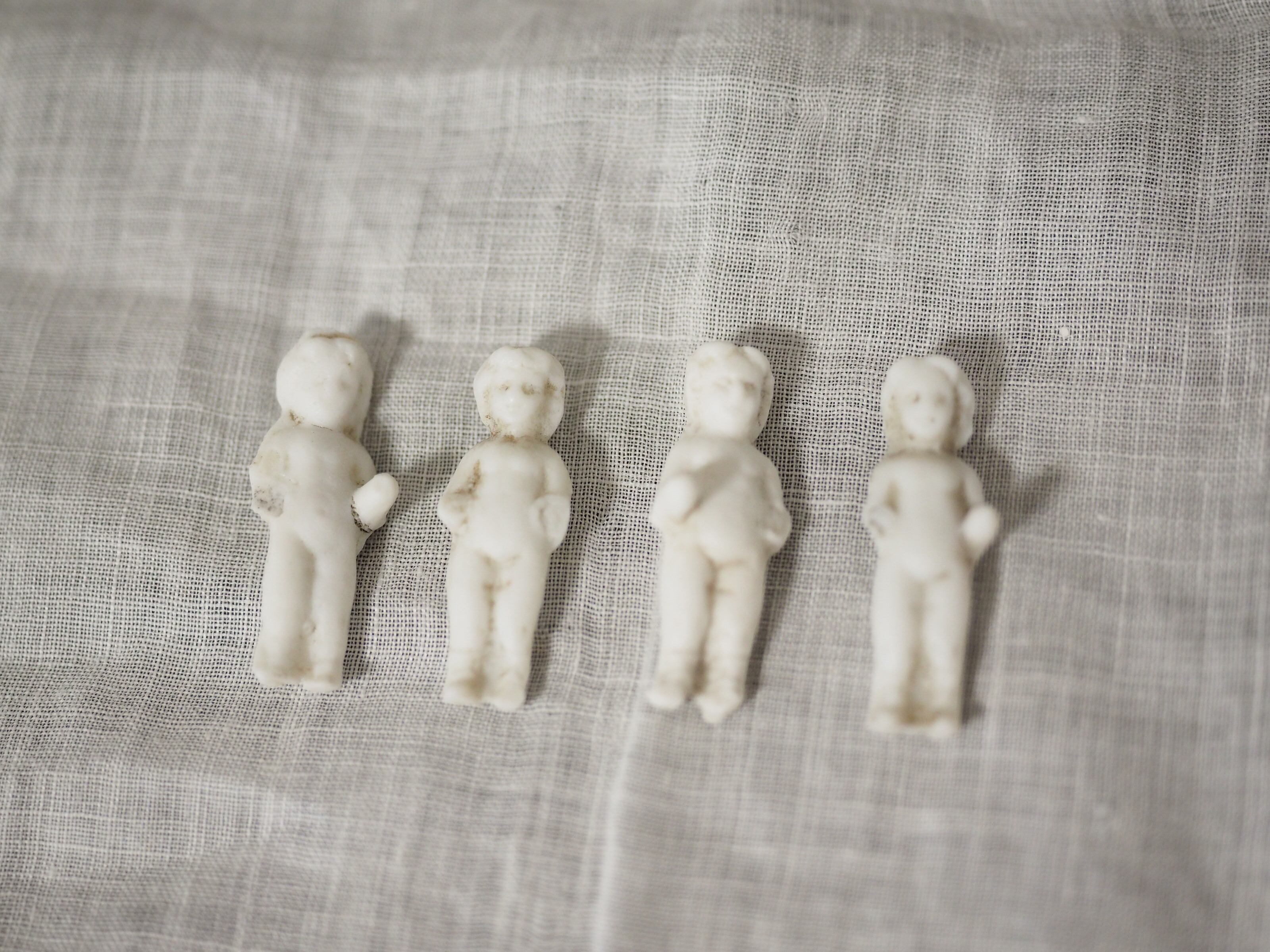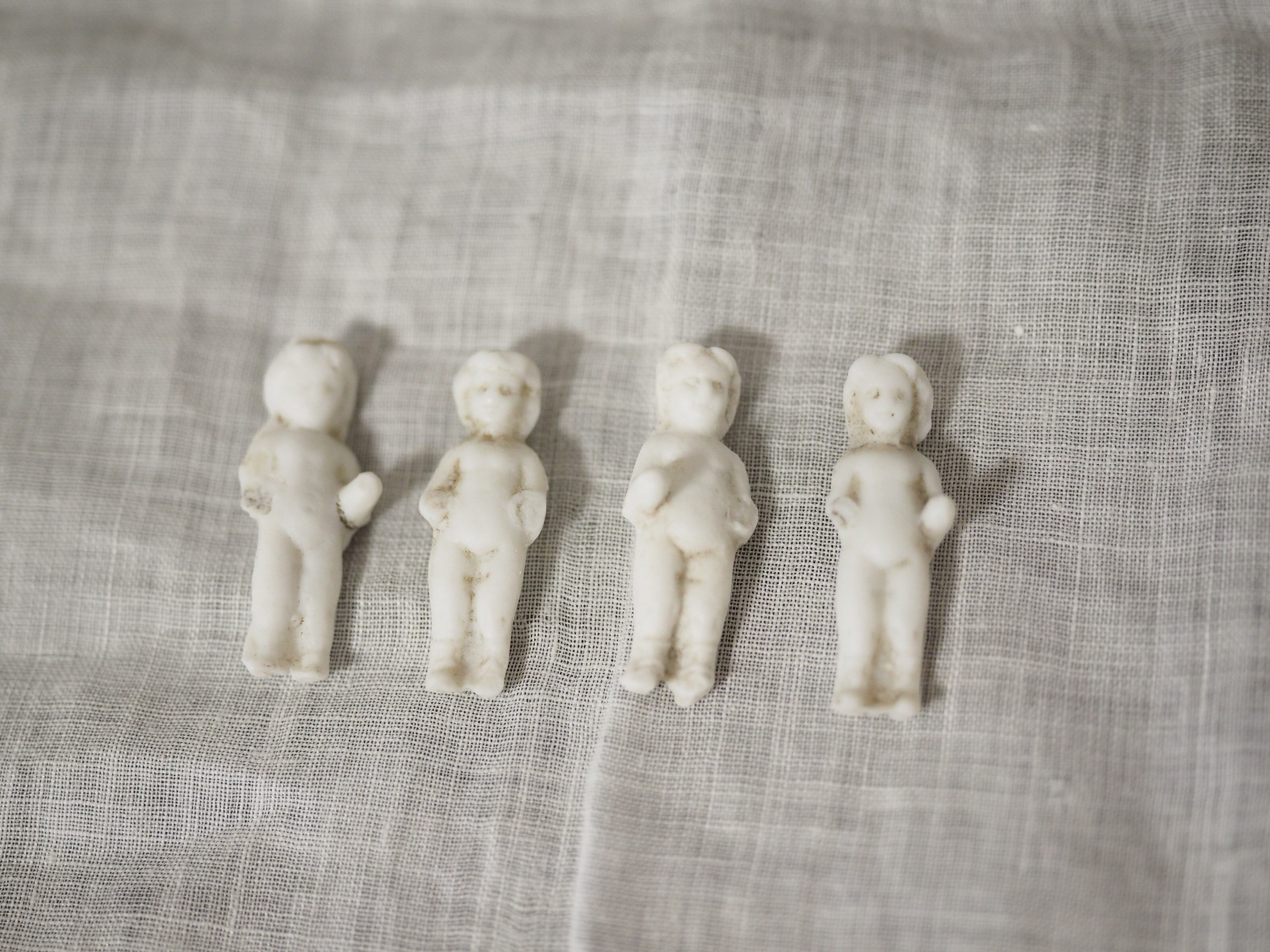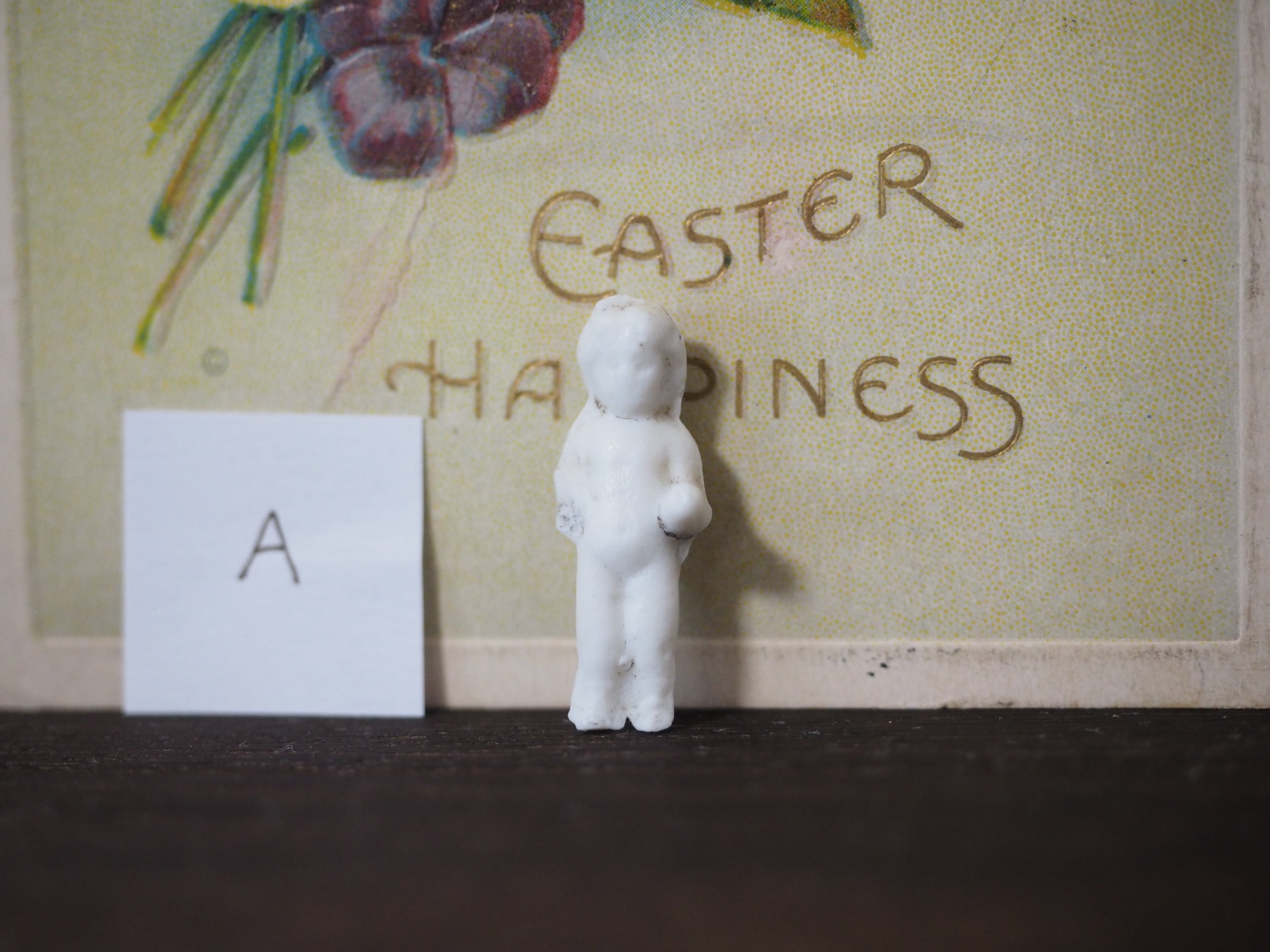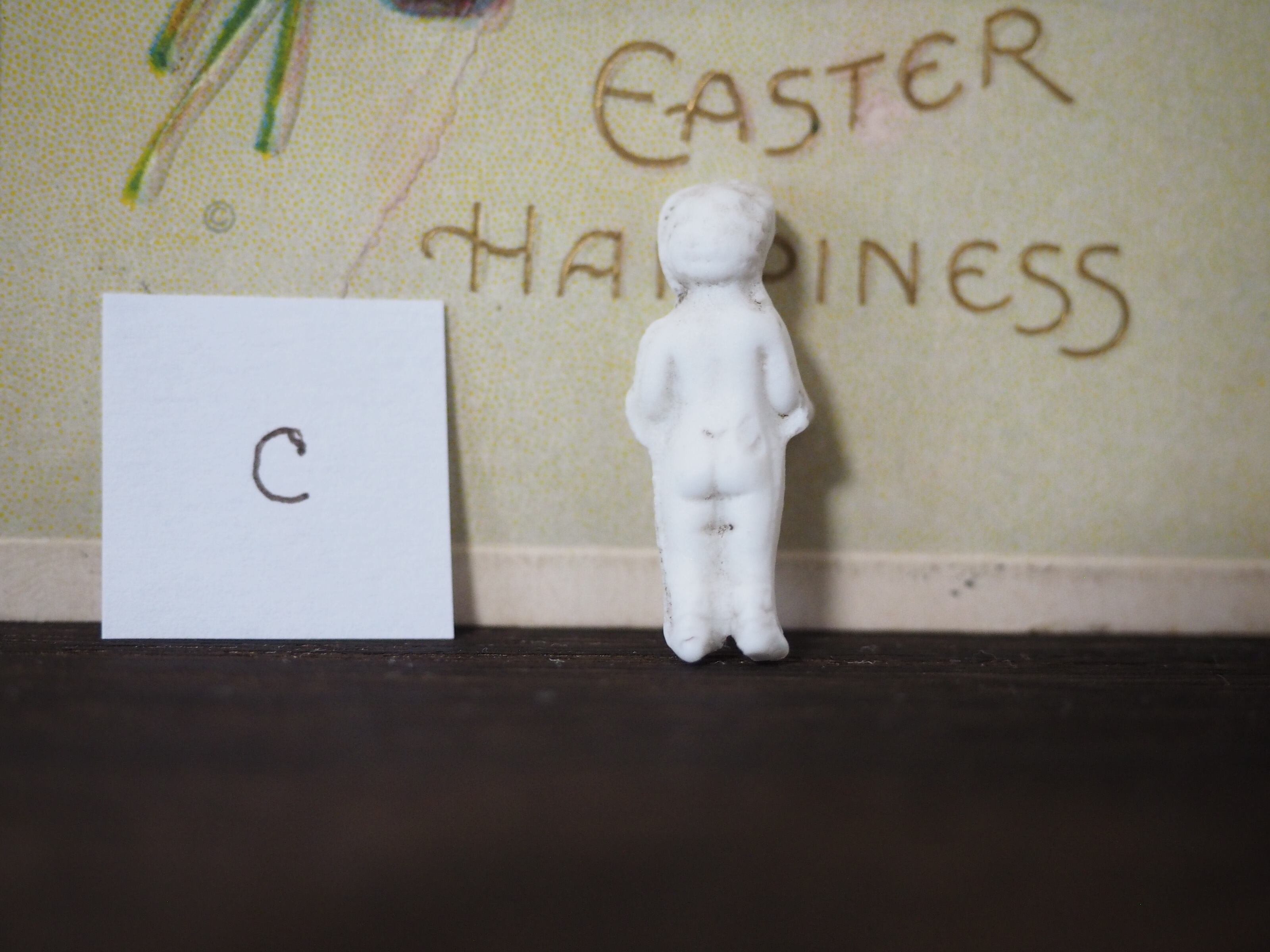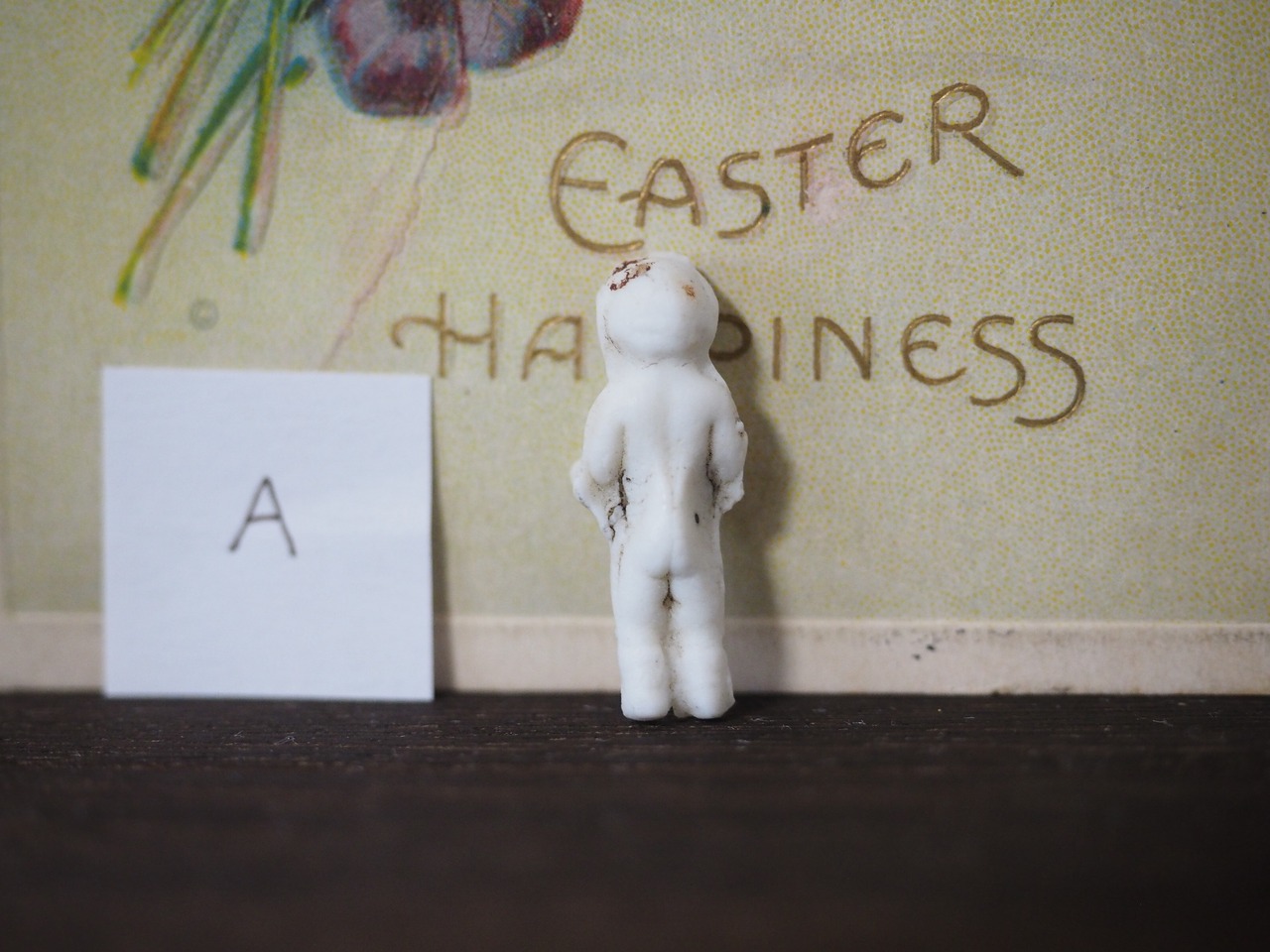 A:右手と足先欠損、黒く亀裂があり、頭頂部が茶色くゴツゴツしています。小さな丸突起がございます。お尻が挟んだように細くなっています。