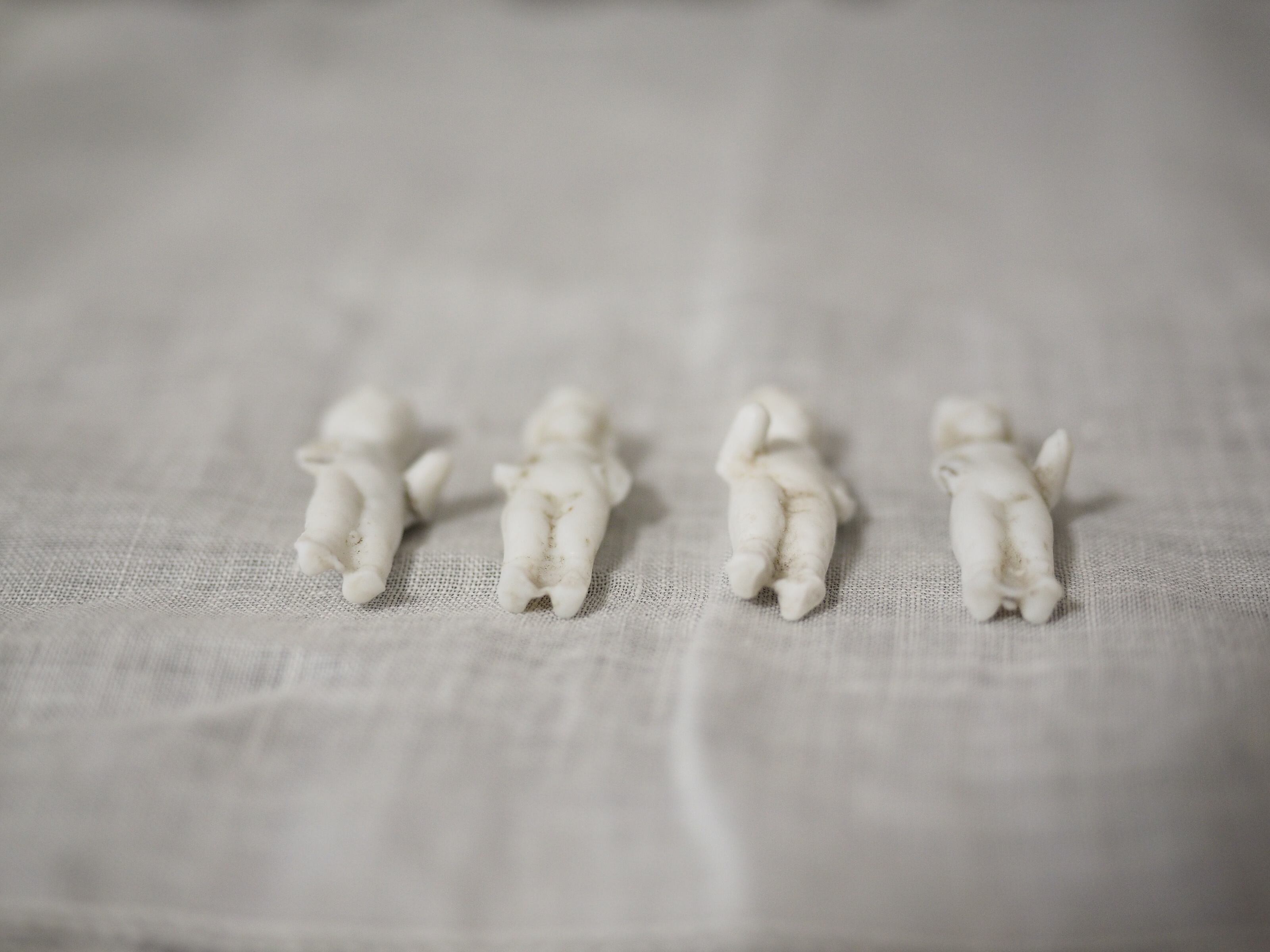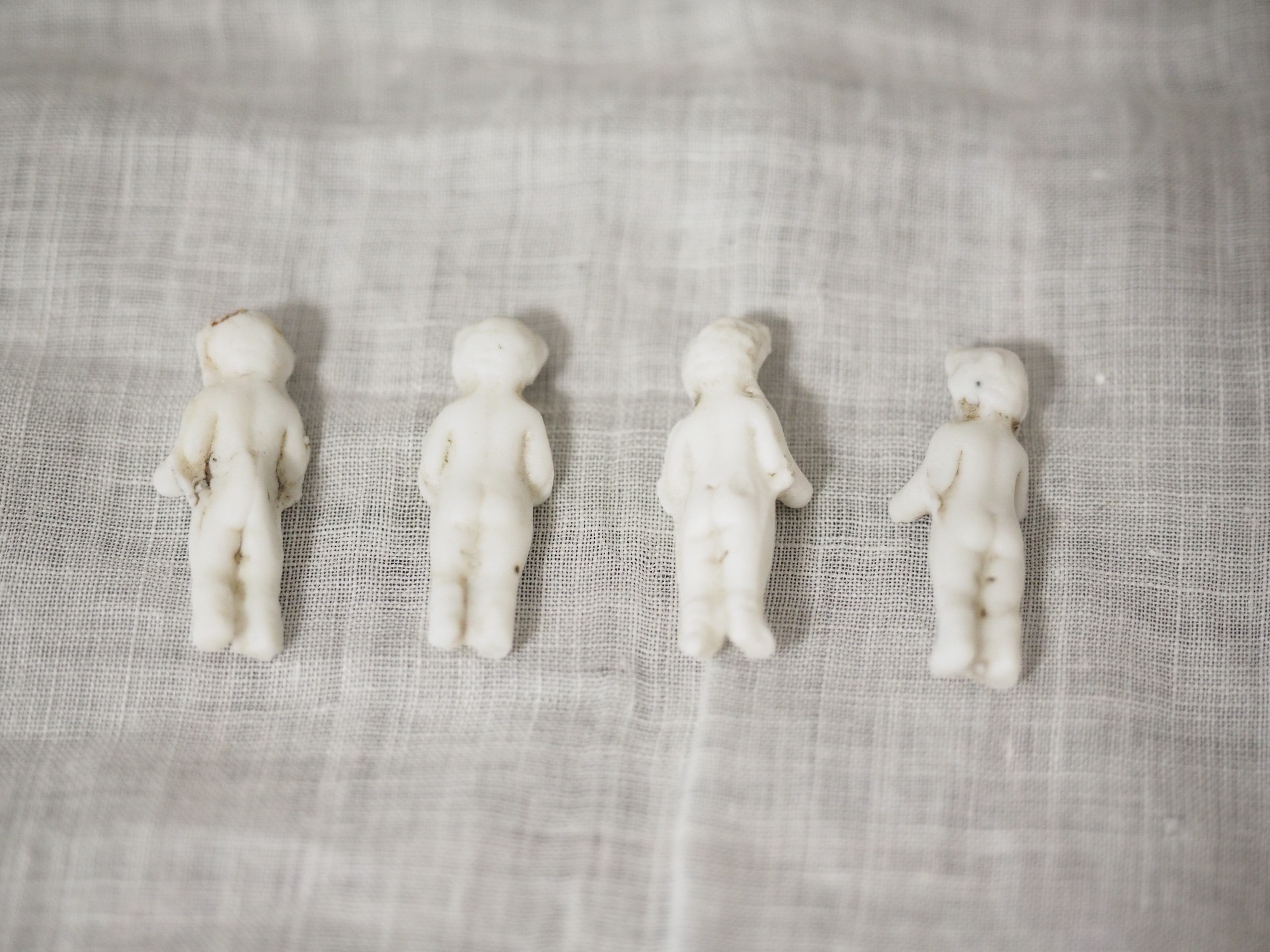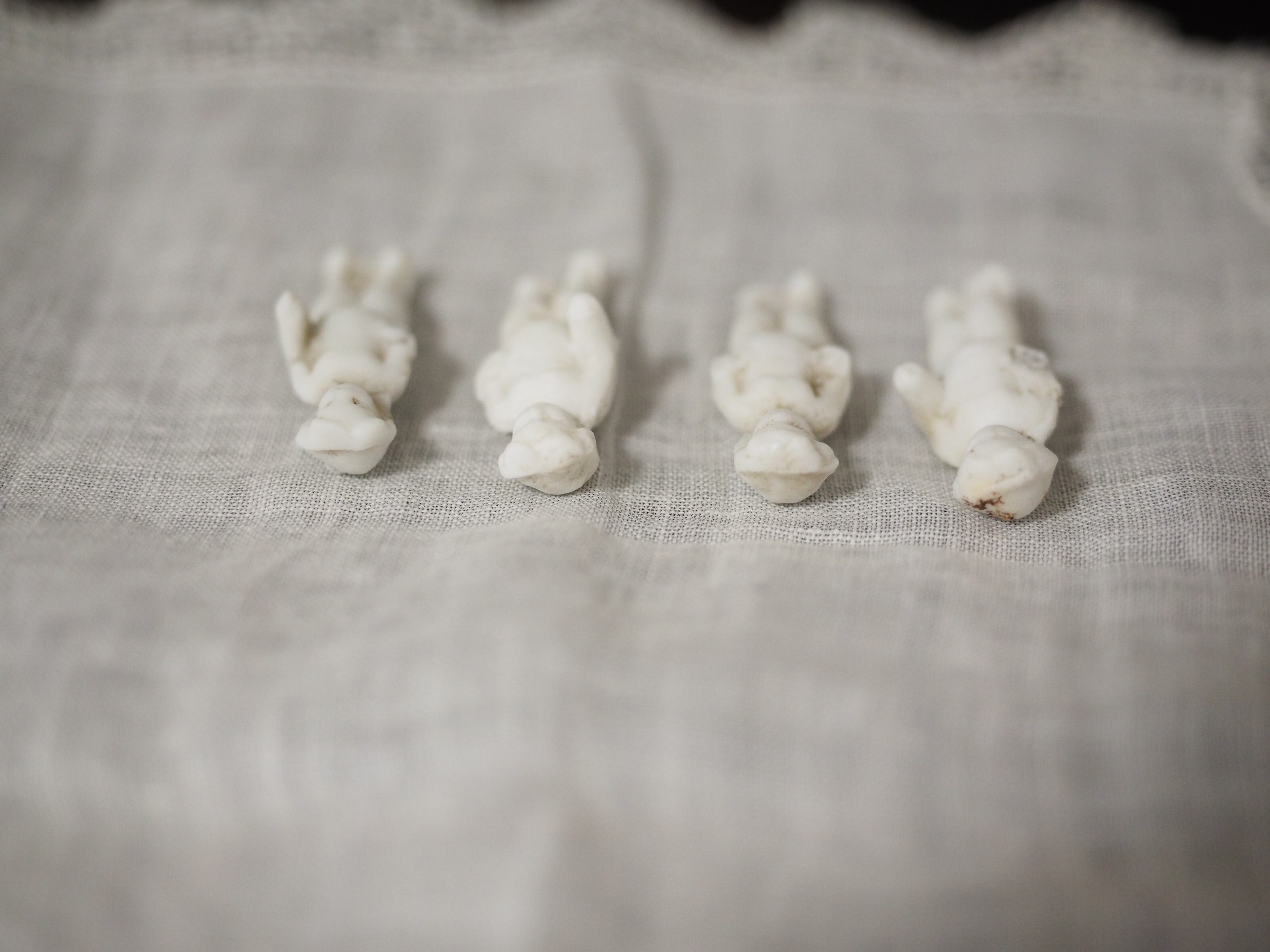 B:両手と左足先欠損、首下にへこみ、黒い点と線のような薄くキズがございます。