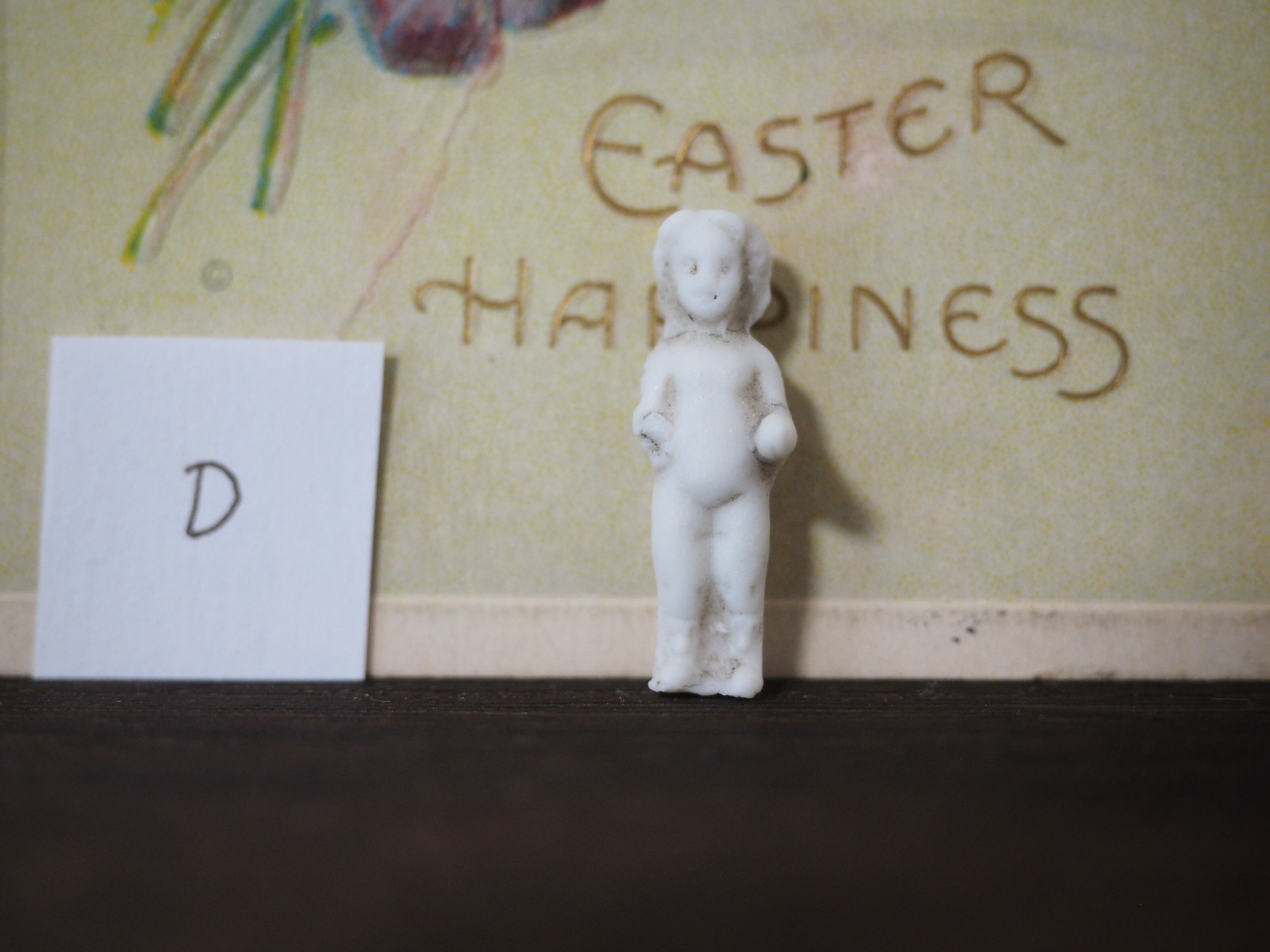D:右手欠損、黒く小さめの亀裂と黒い点あり、両脚の間が削れたようになっています。