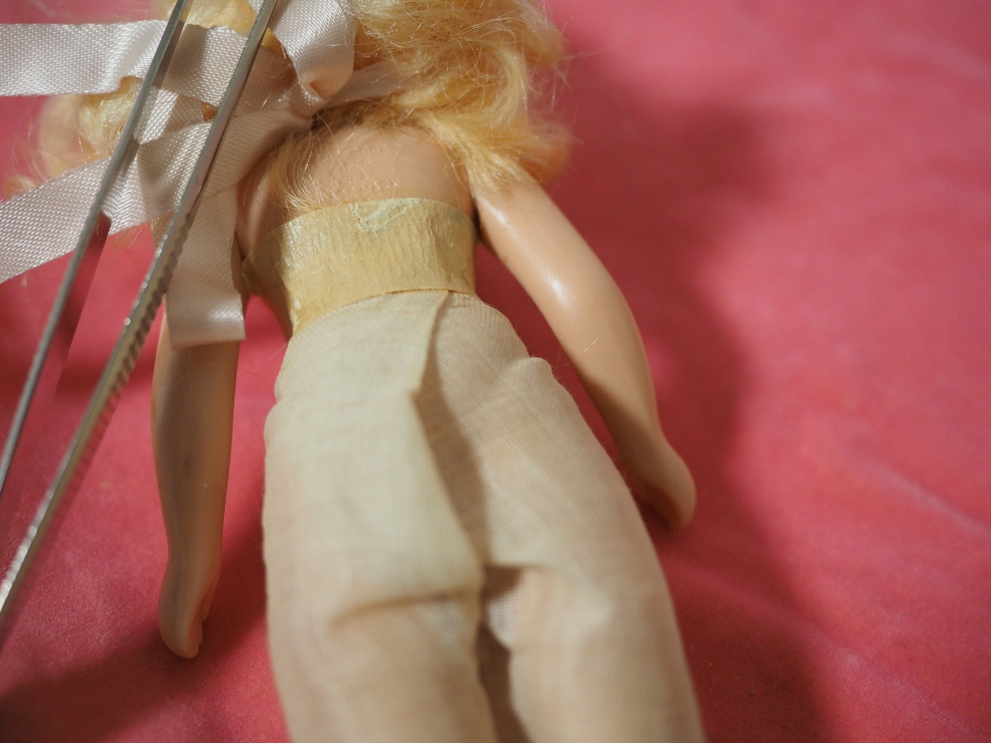 手足と首はジョイントで少し動く、1952年以降のタイプです。脚のジョイントは動きやすいですが、ドロワーズで突っ張り止まります。