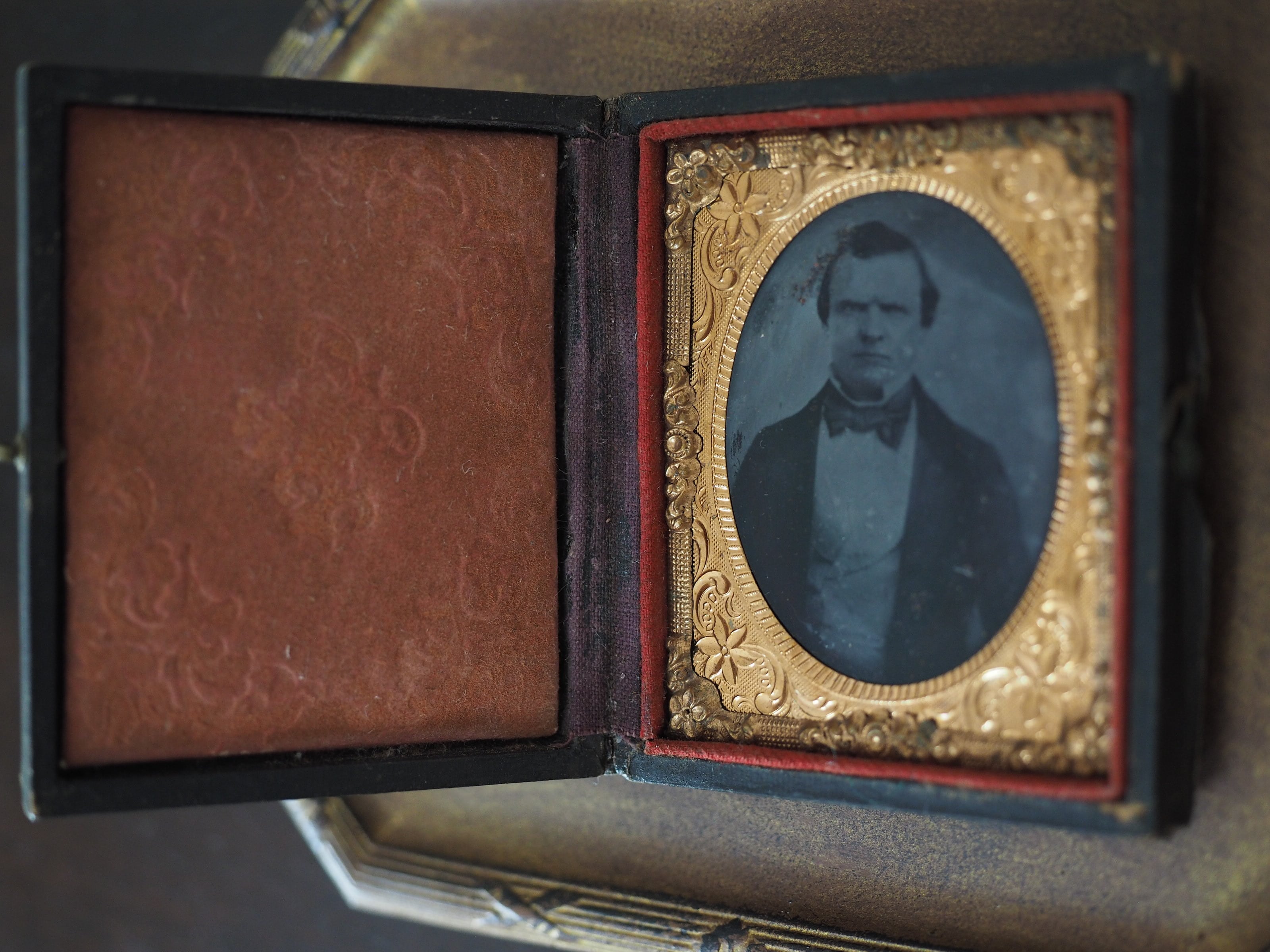 美しい模様型押しのケース入り、男性の肖像写真です。