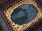 (アンブロタイプ は1854年に導入されました。ガラスの上に写真を焼き付け、通常は暗い色のニスや紙などで裏打ちされています。裏打ちが劣化し始めると、ガラスが透けて見えるようになり、ゴーストのような質感を与えます。)