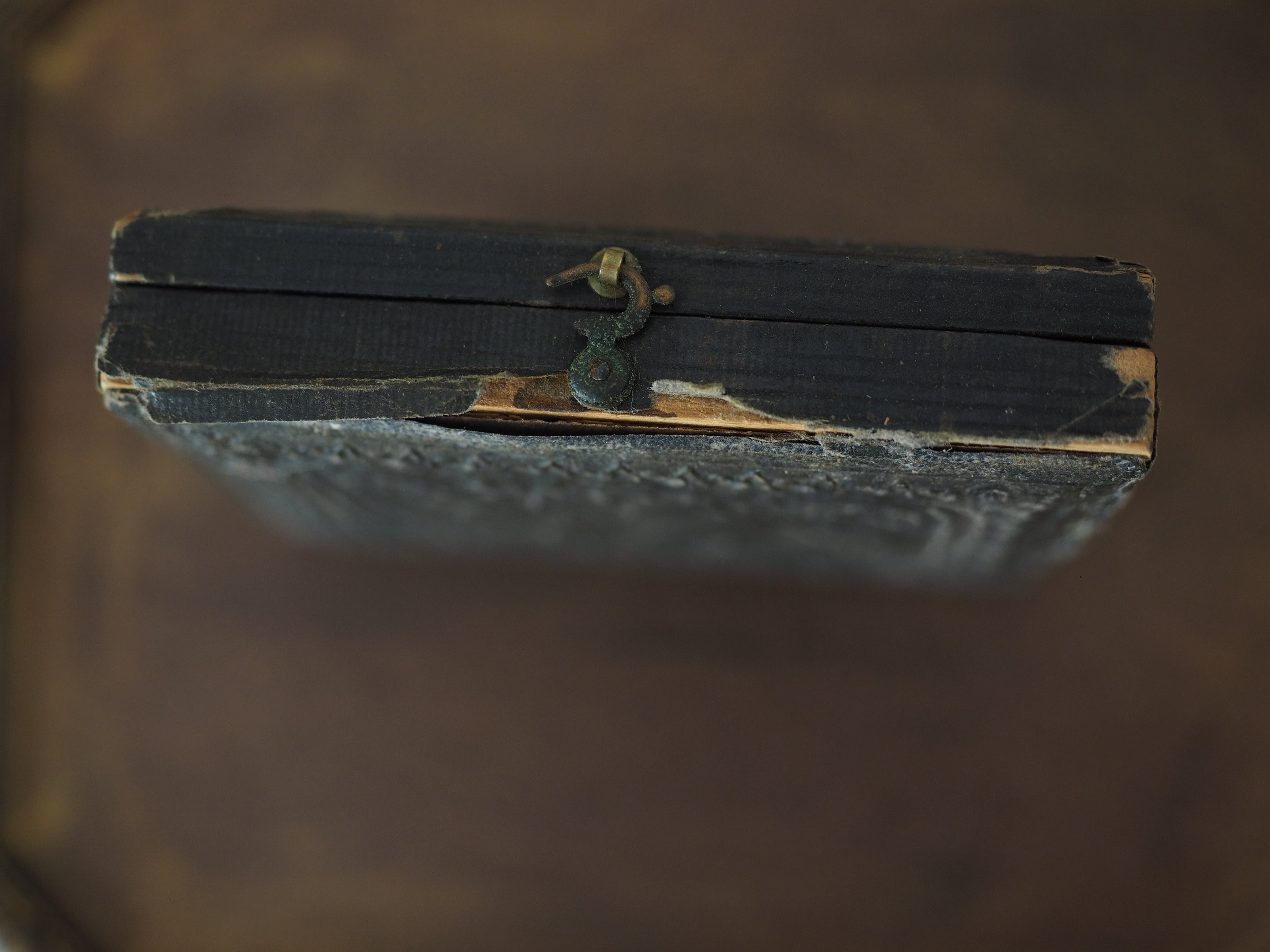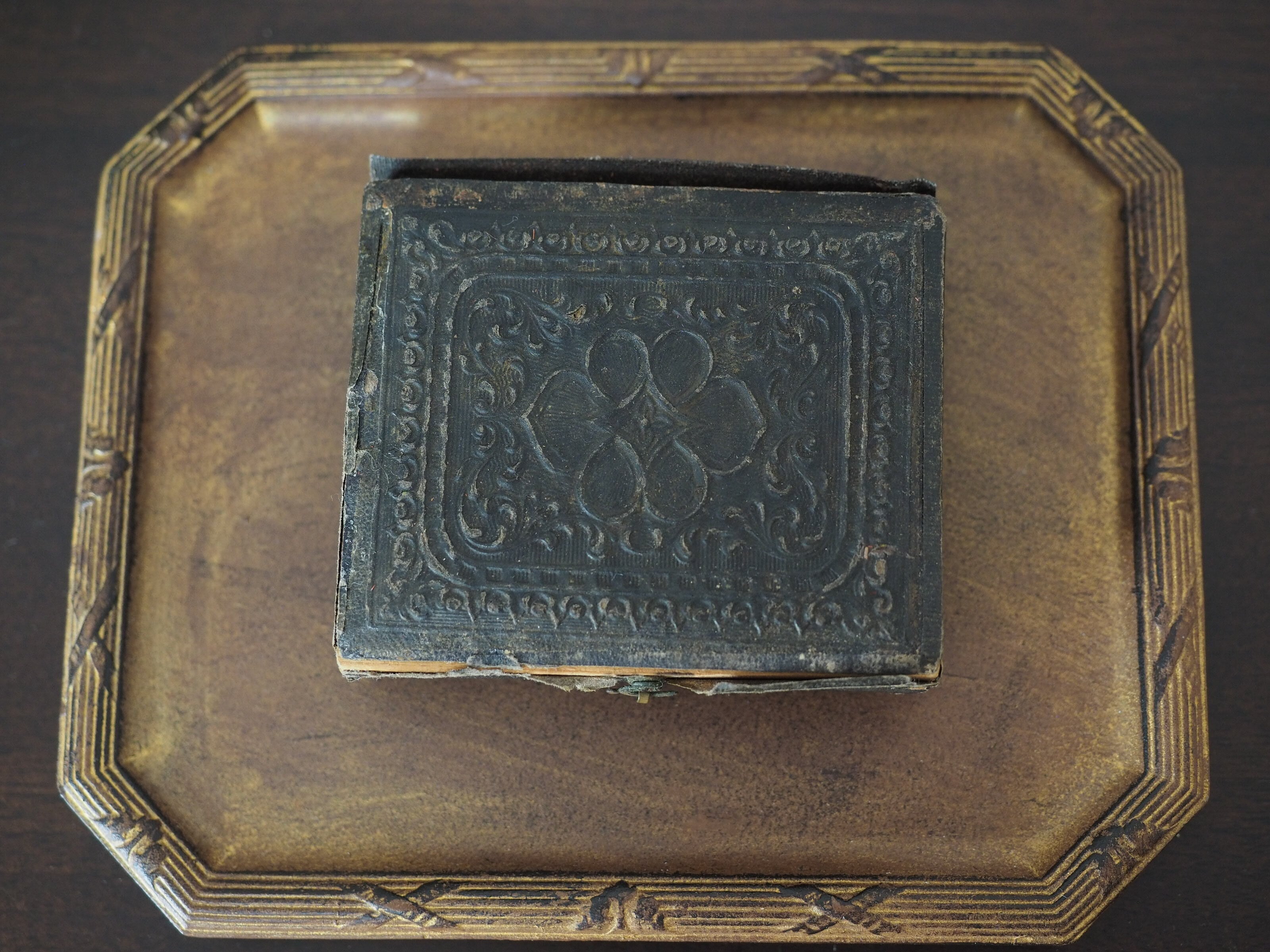 ケースは木製で、外側の美しいエンボス加工の表紙はレザーと思われますが、こちらも薄く乾燥して紙のような質感です。細い留め金はきちんと抜き差し出来ます。