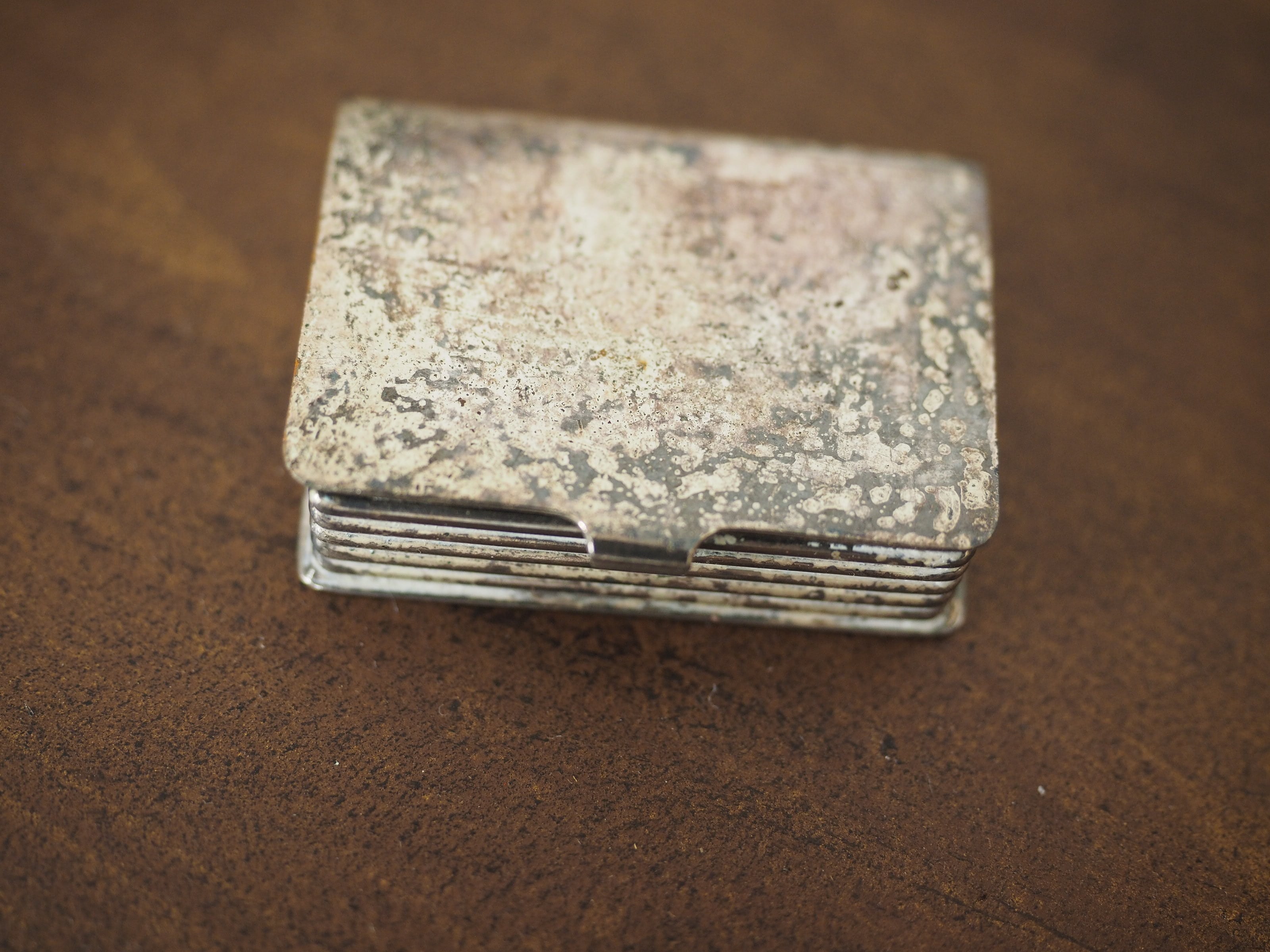 表面は黒くざらざらしていて、蓋内部の外側は色が変わっており銀がはがれているようです。