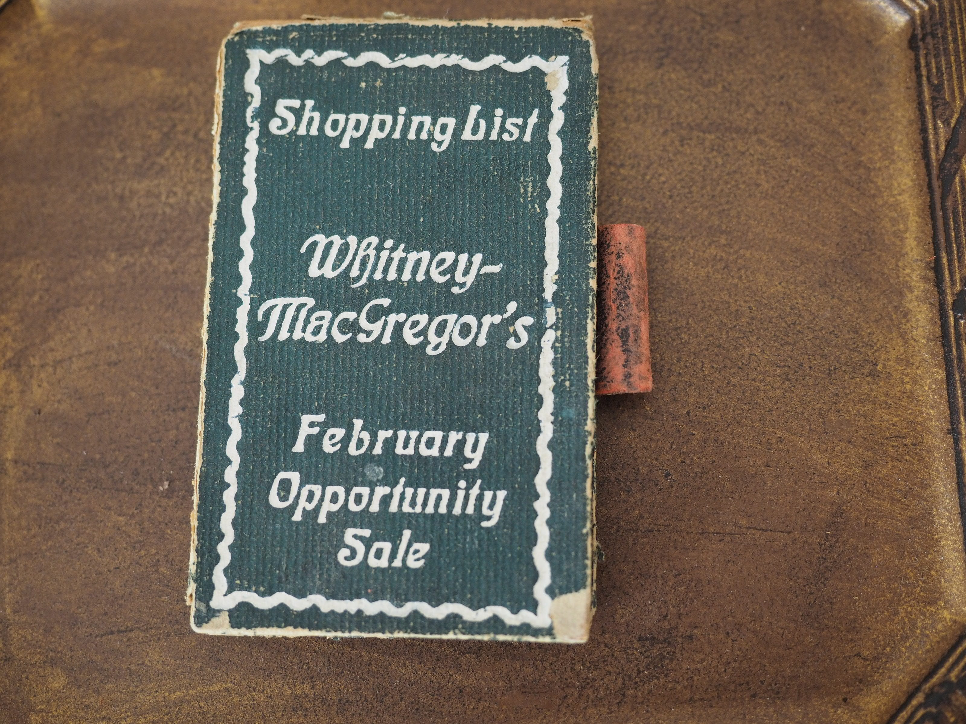 表紙はざらざらとした手触りの型押しで、Shopping List Whitney-Macgregor's February Opportunity Sale と刻印されています。