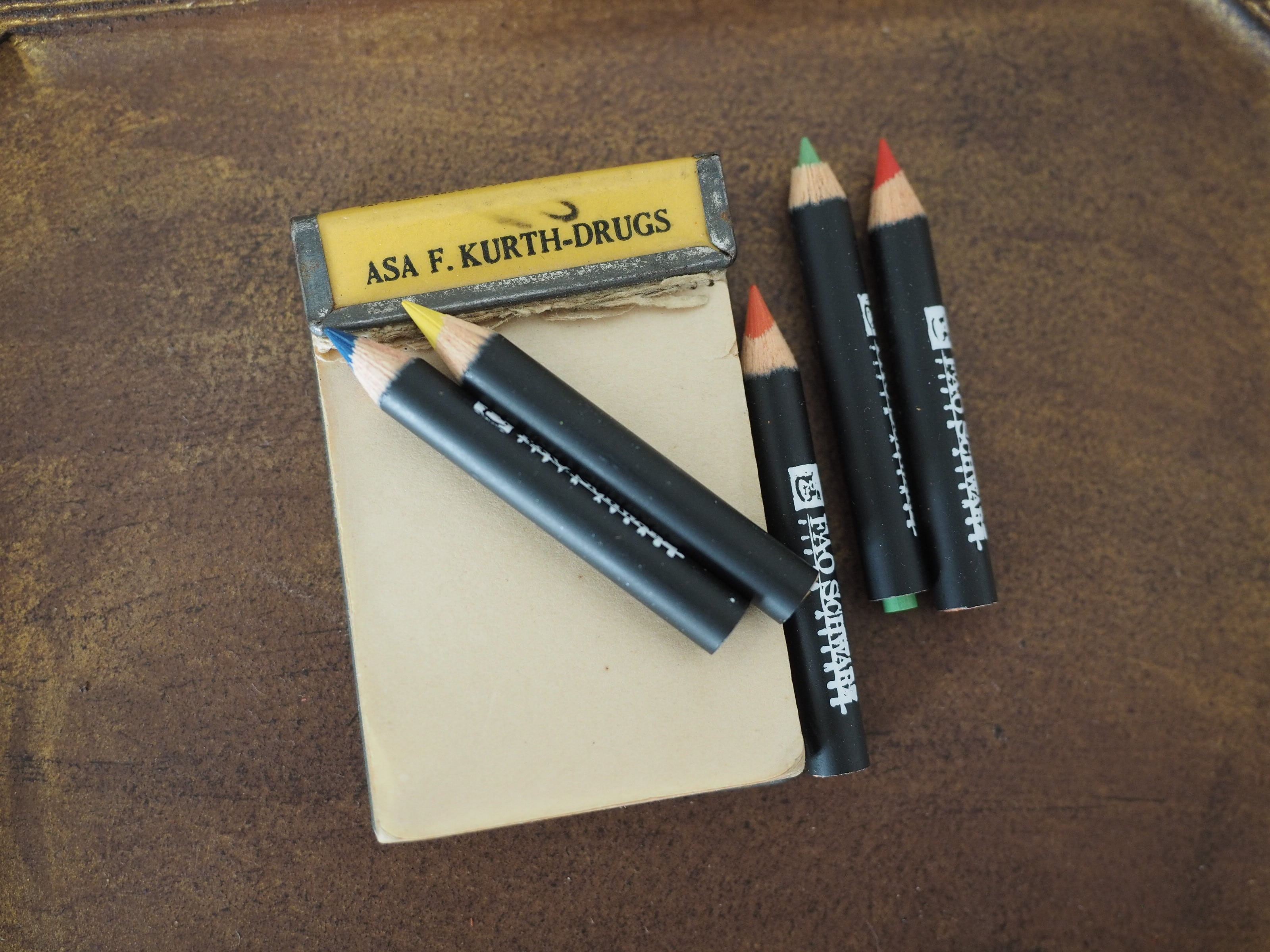 古いメモ帳と小さな色鉛筆5色のセットです。