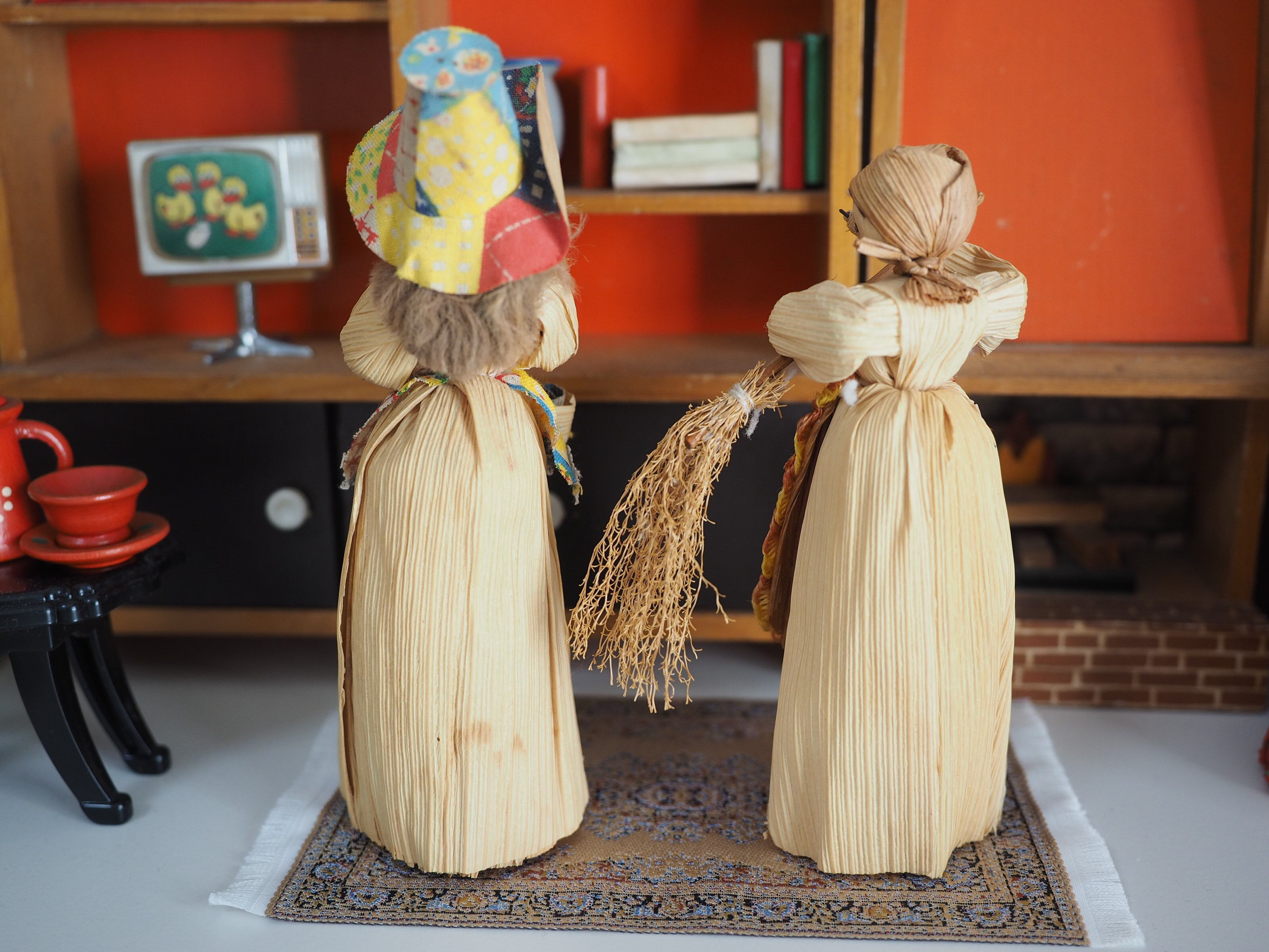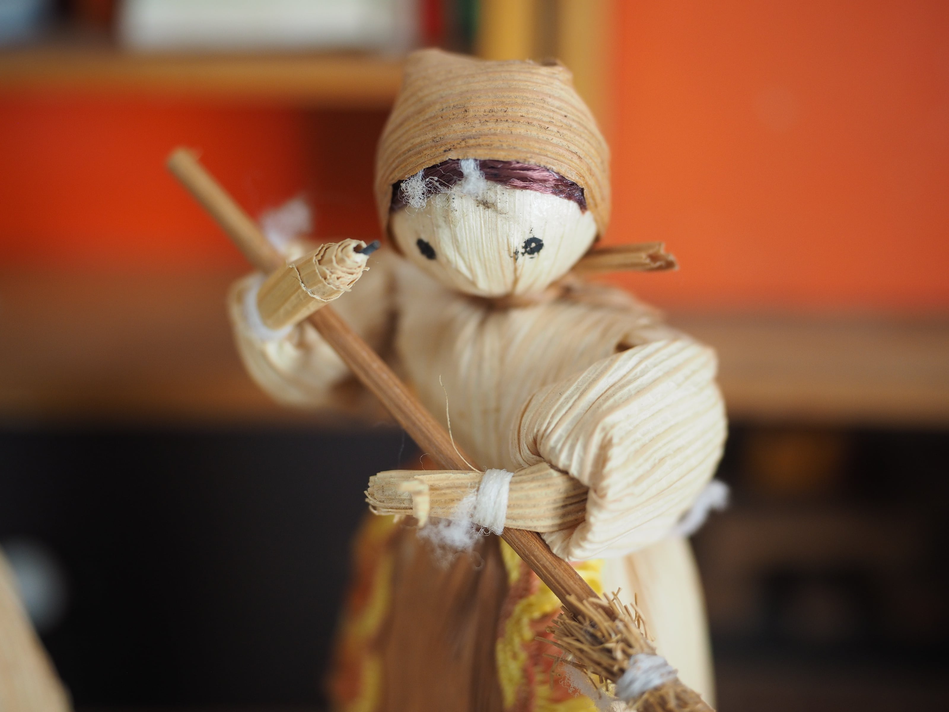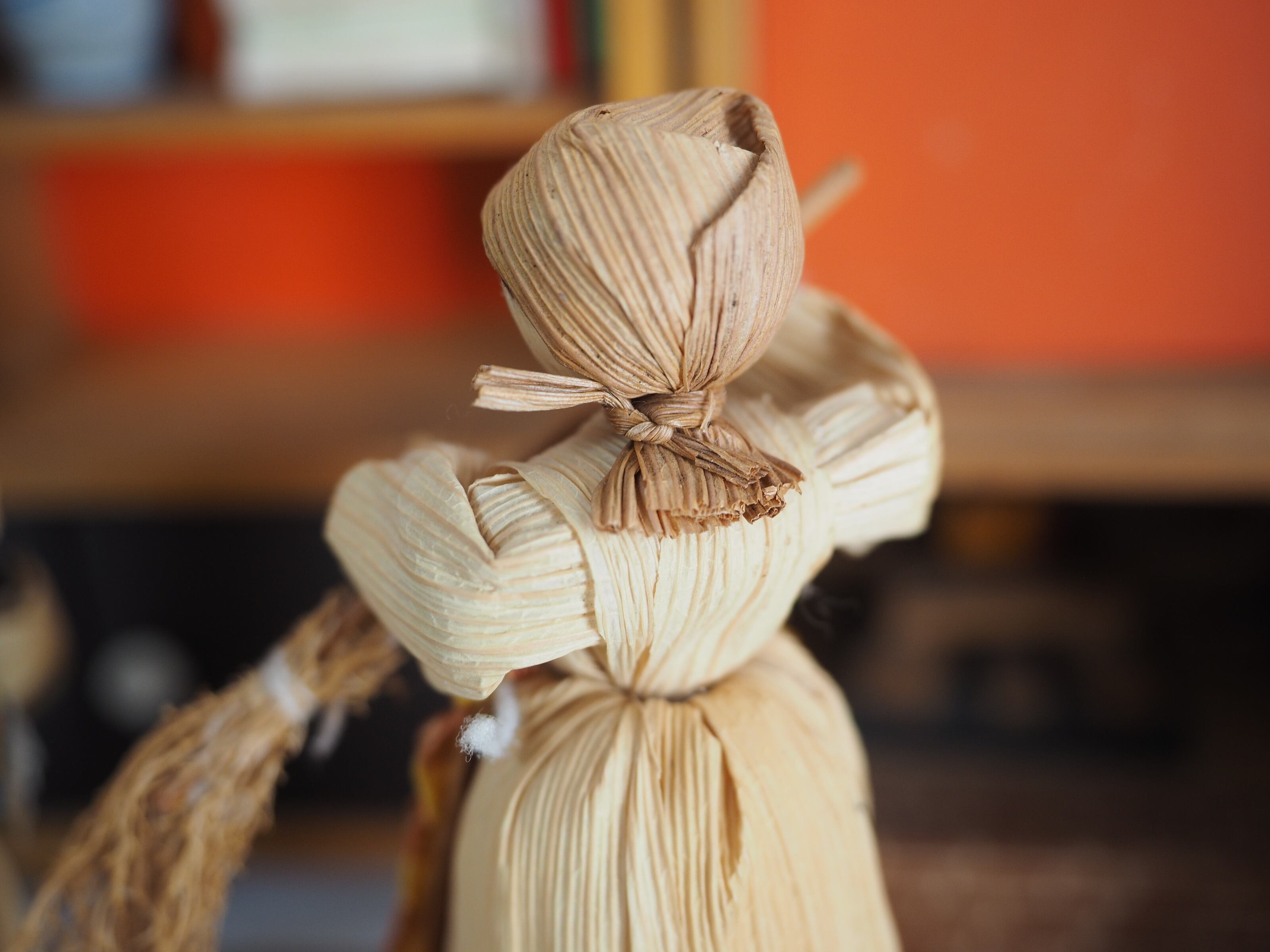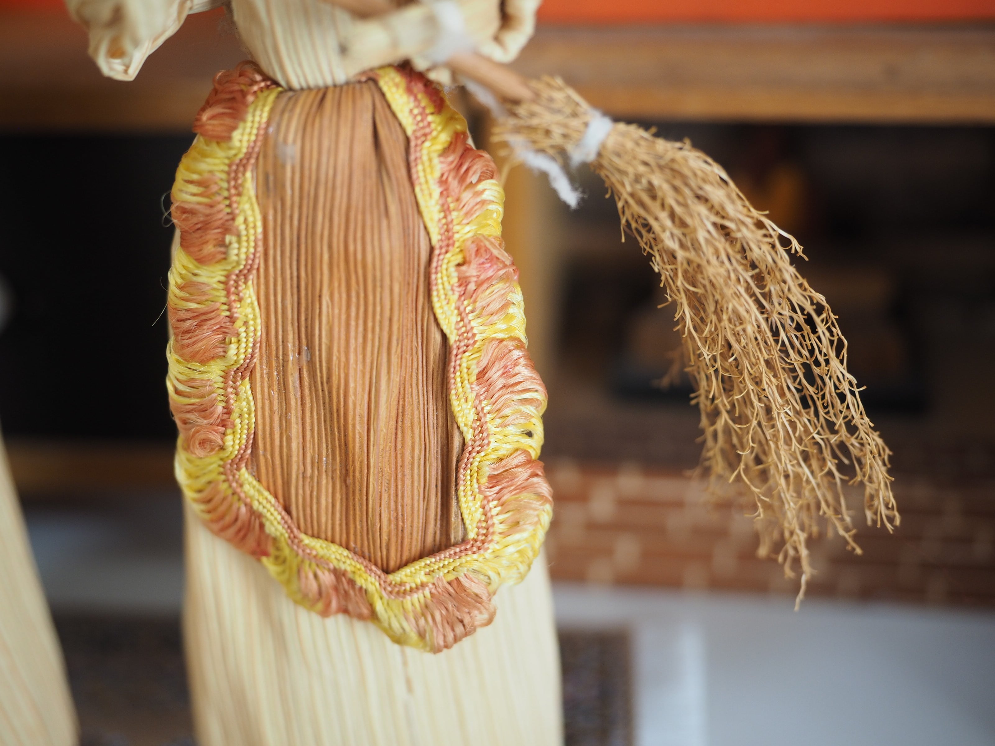 ほうきを持った女の子は、頭にスカーフを巻いたスタイルで、エプロンもとうもろこしの皮製です。ぐるりのリボンが素敵。