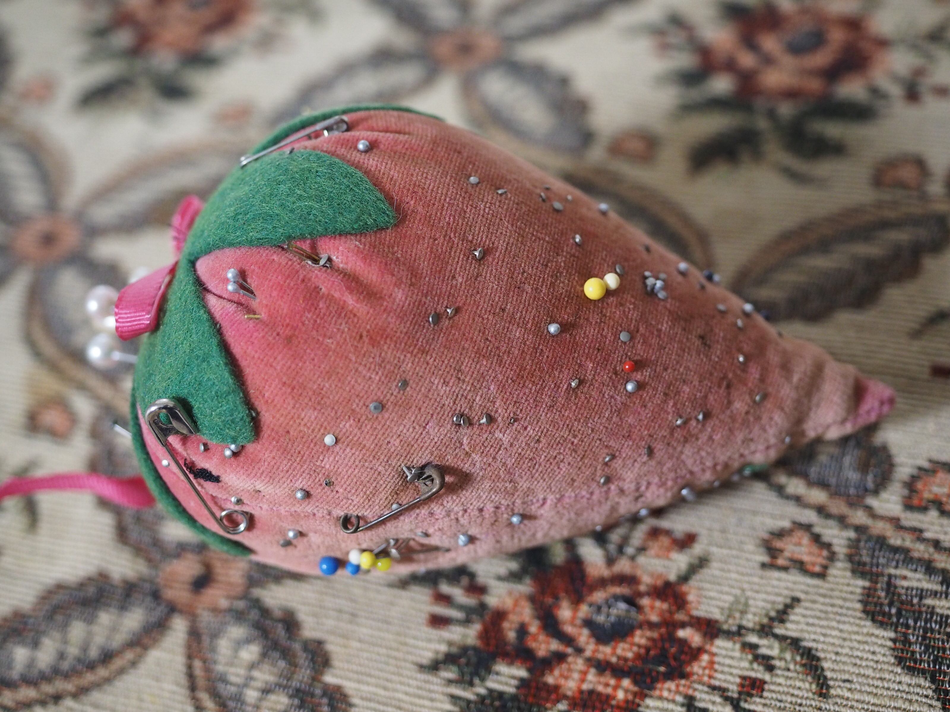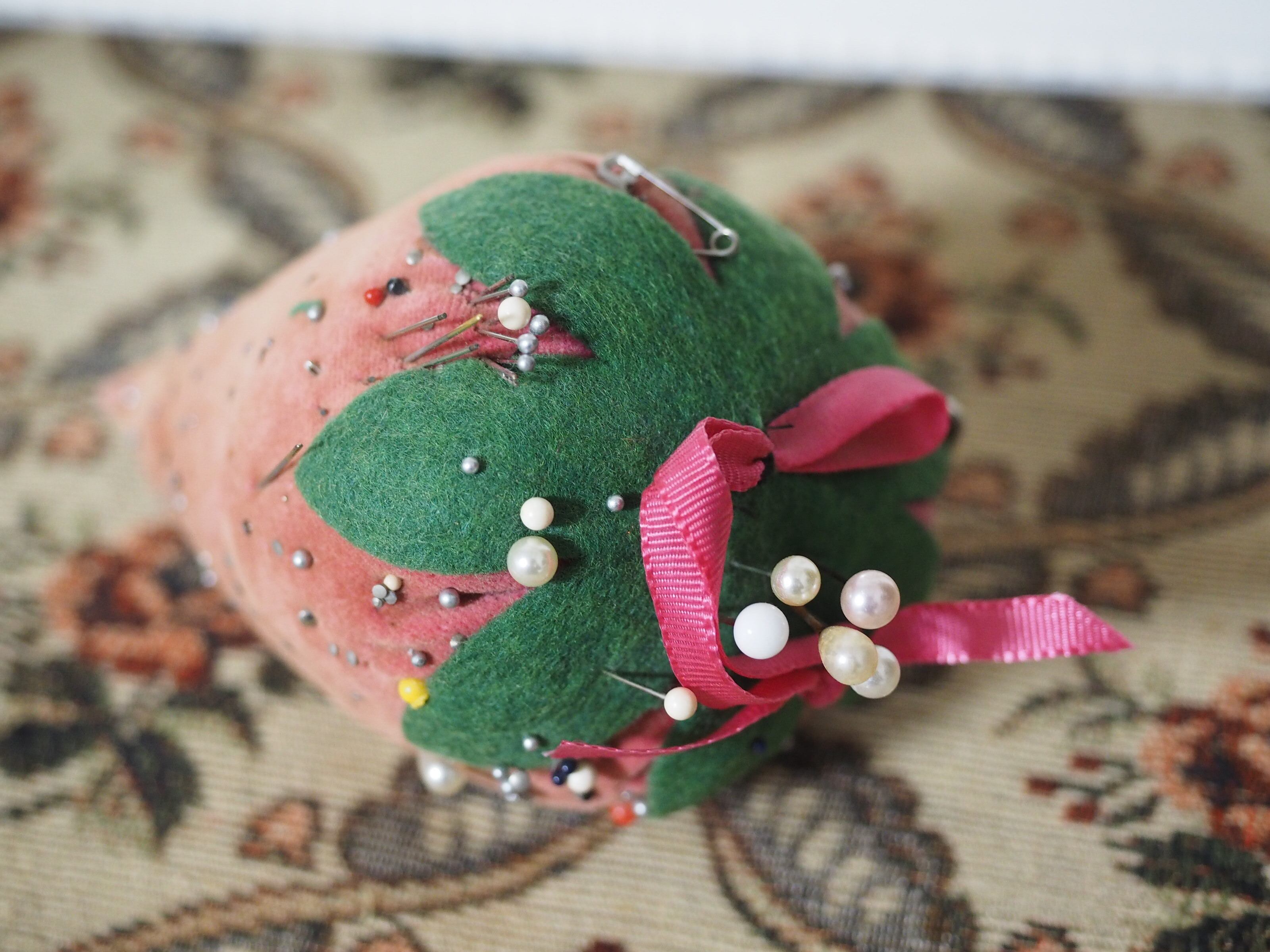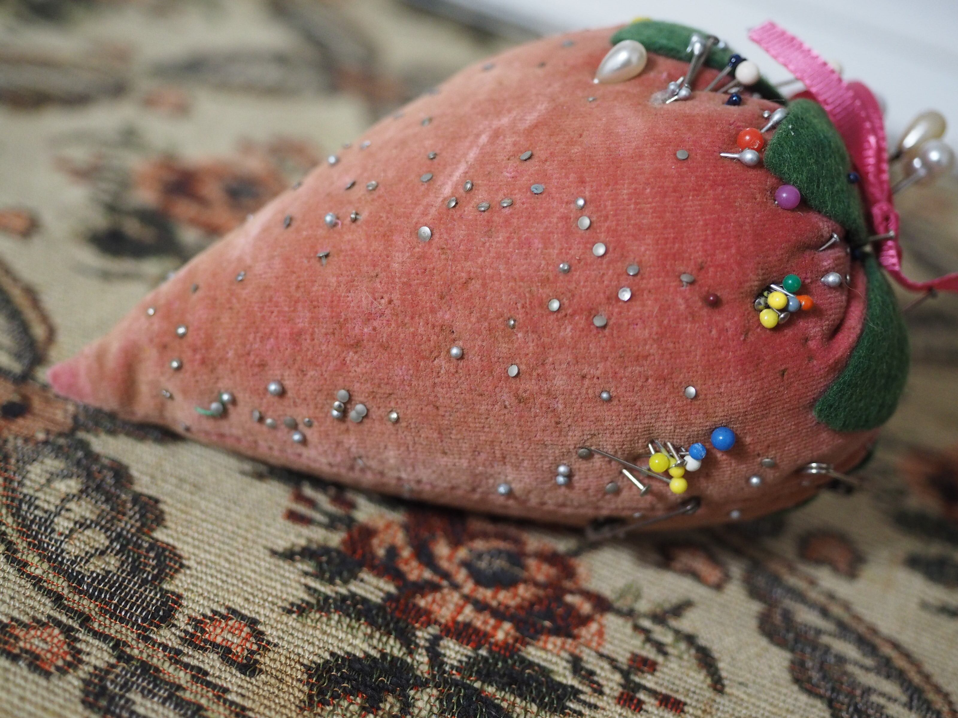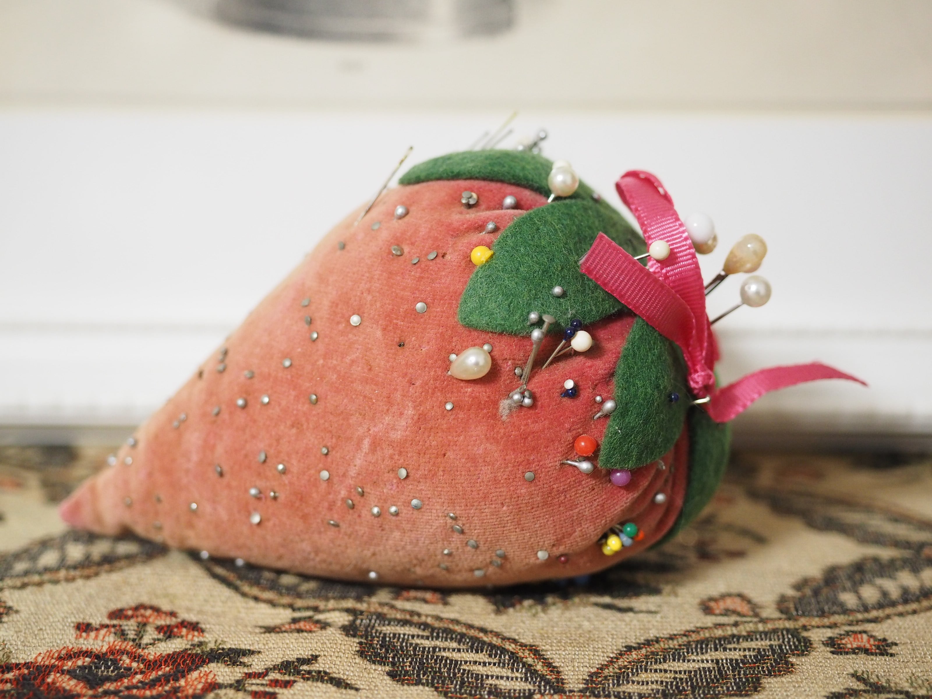 色褪せたベルベット、大きな立体イチゴのピンクッション