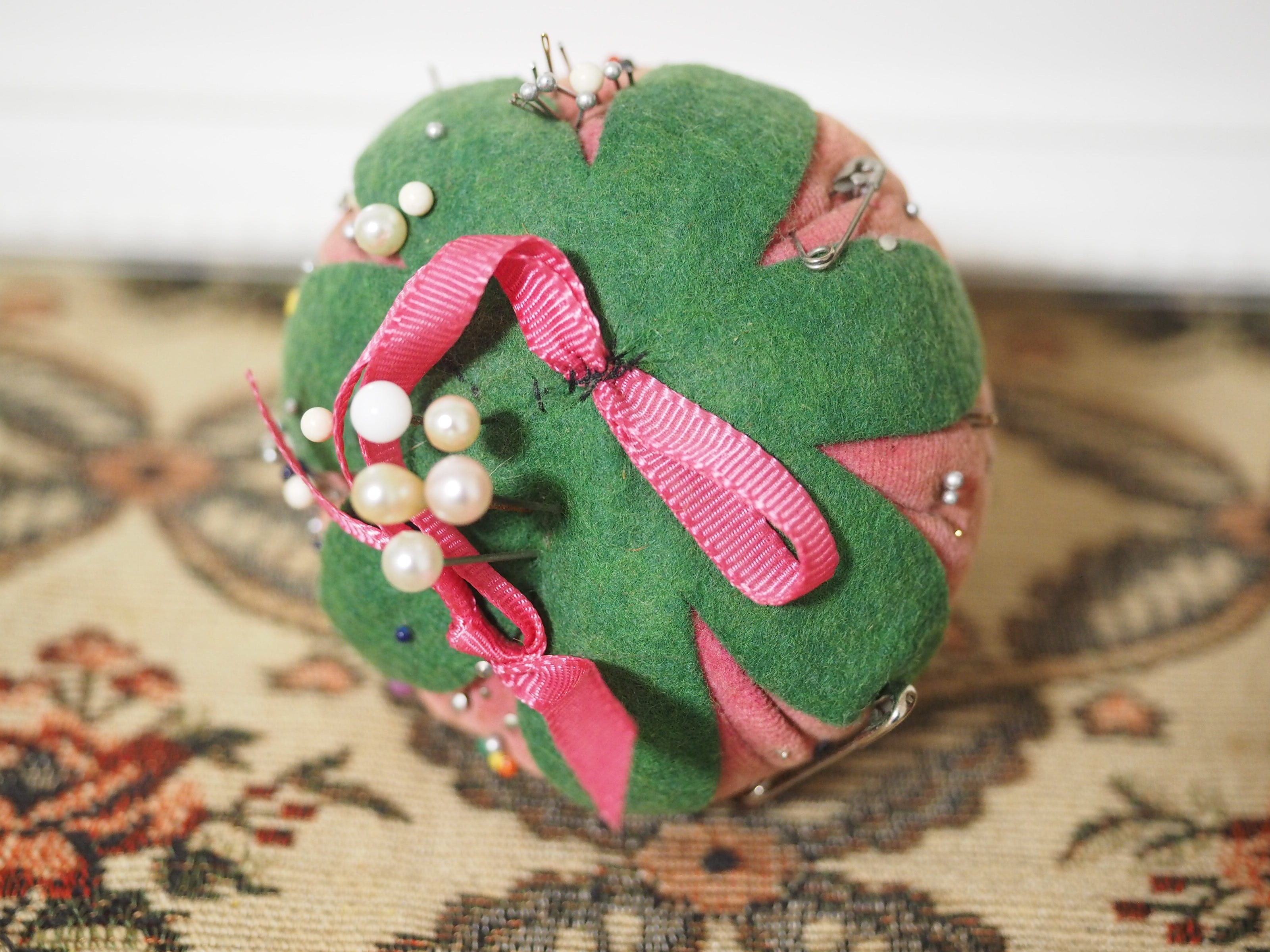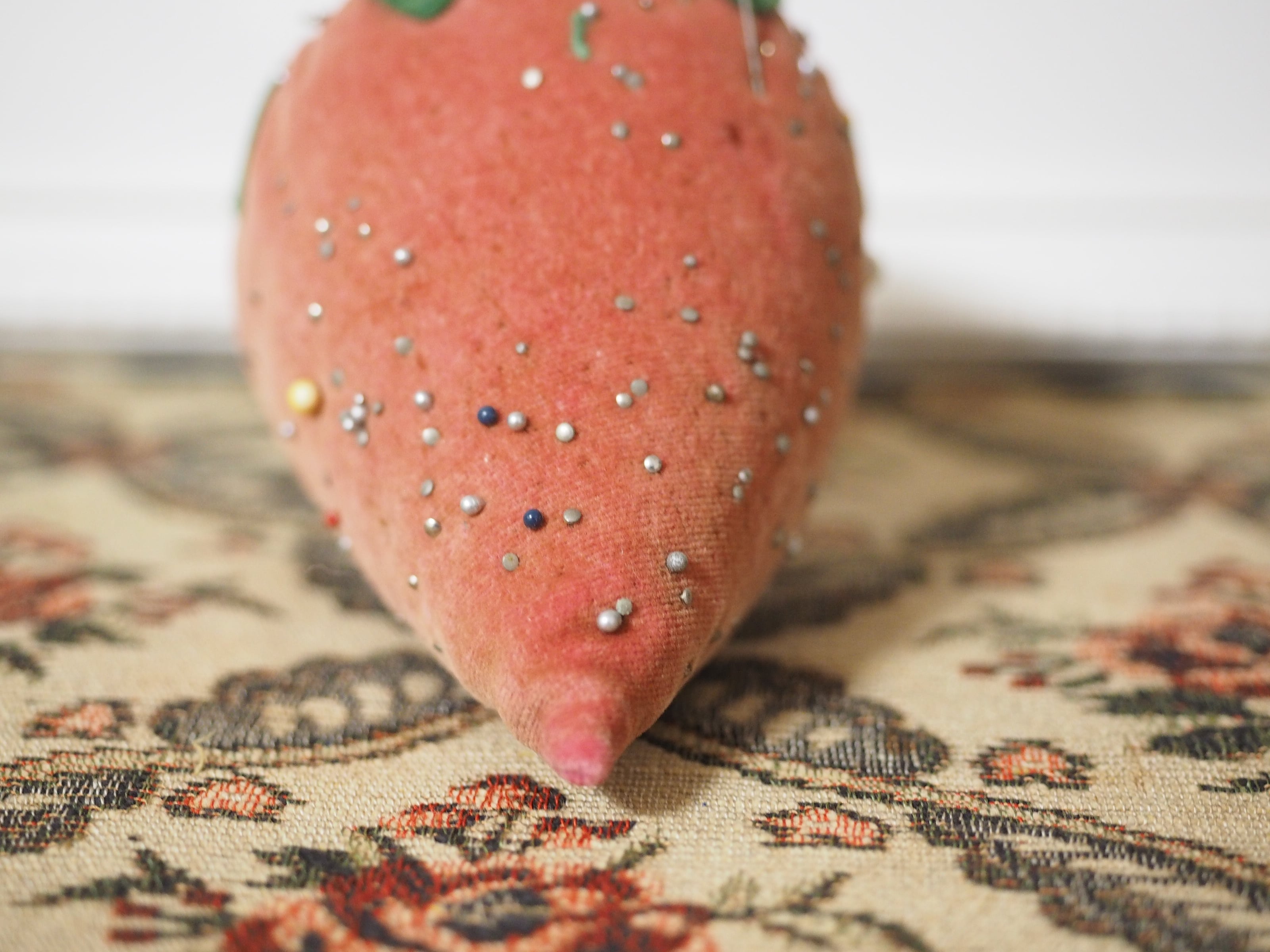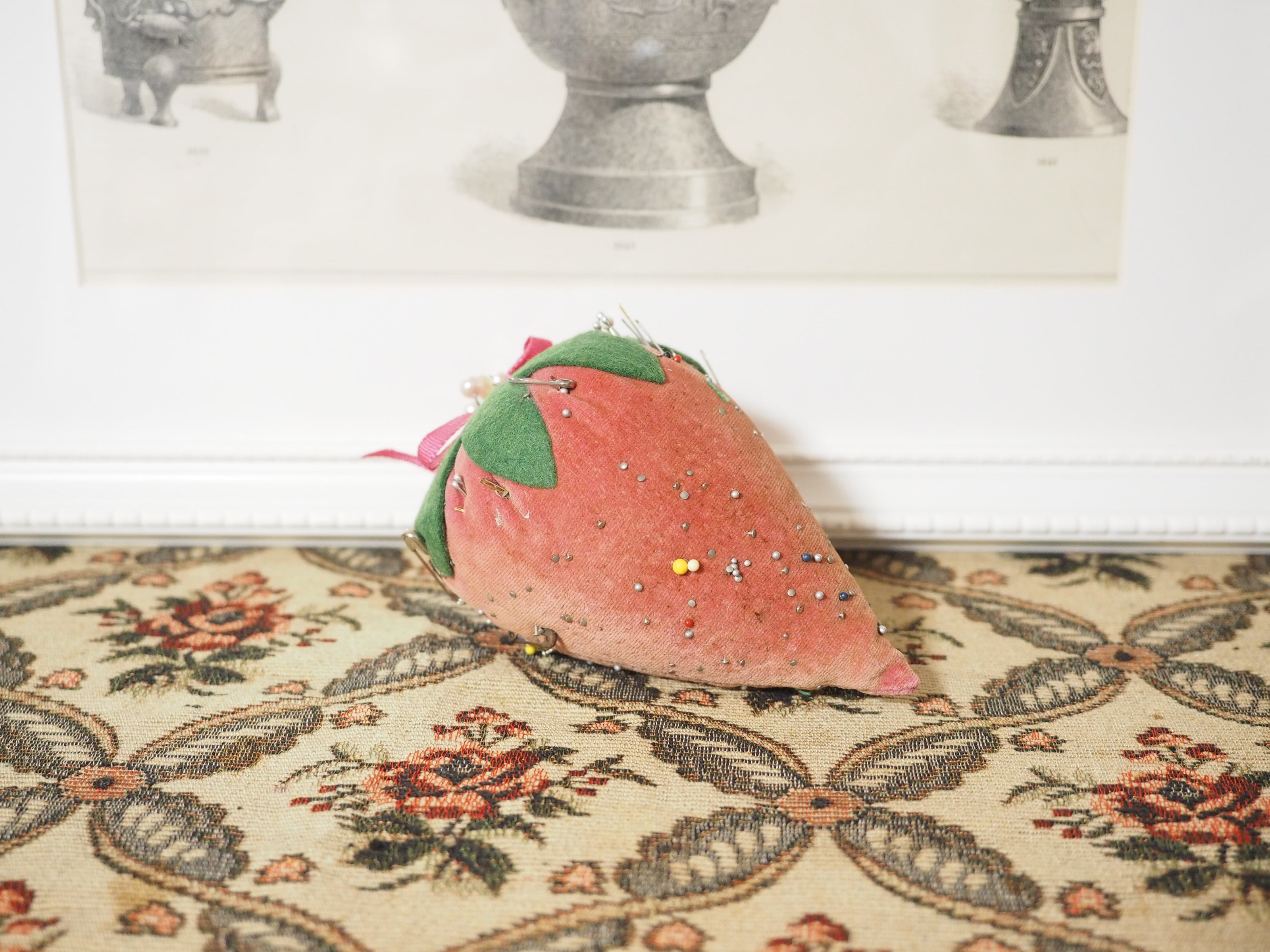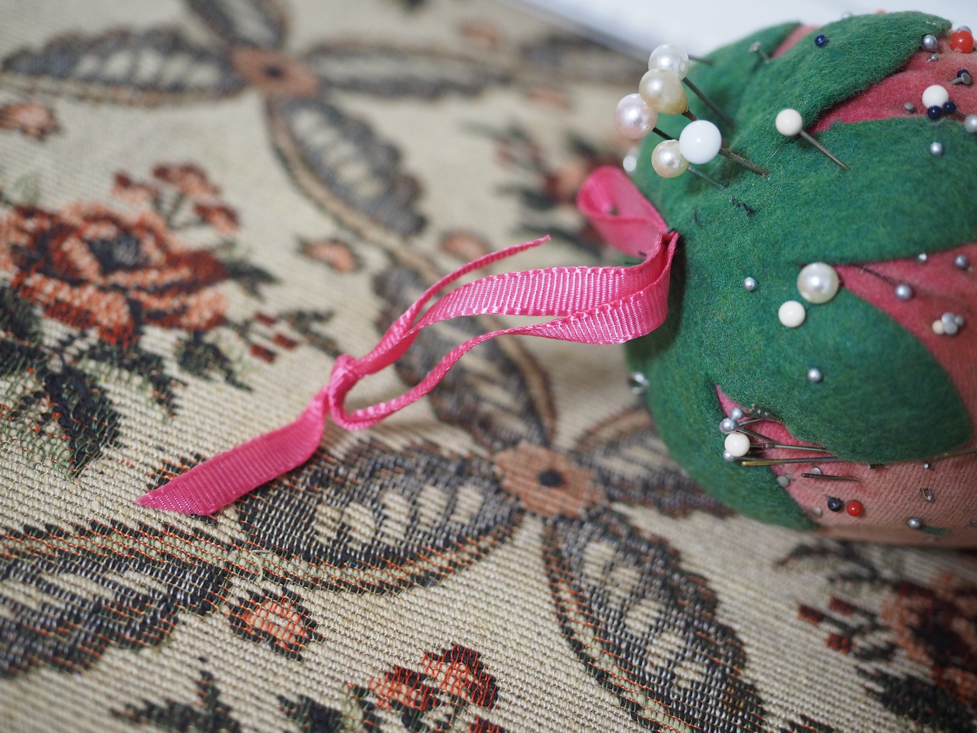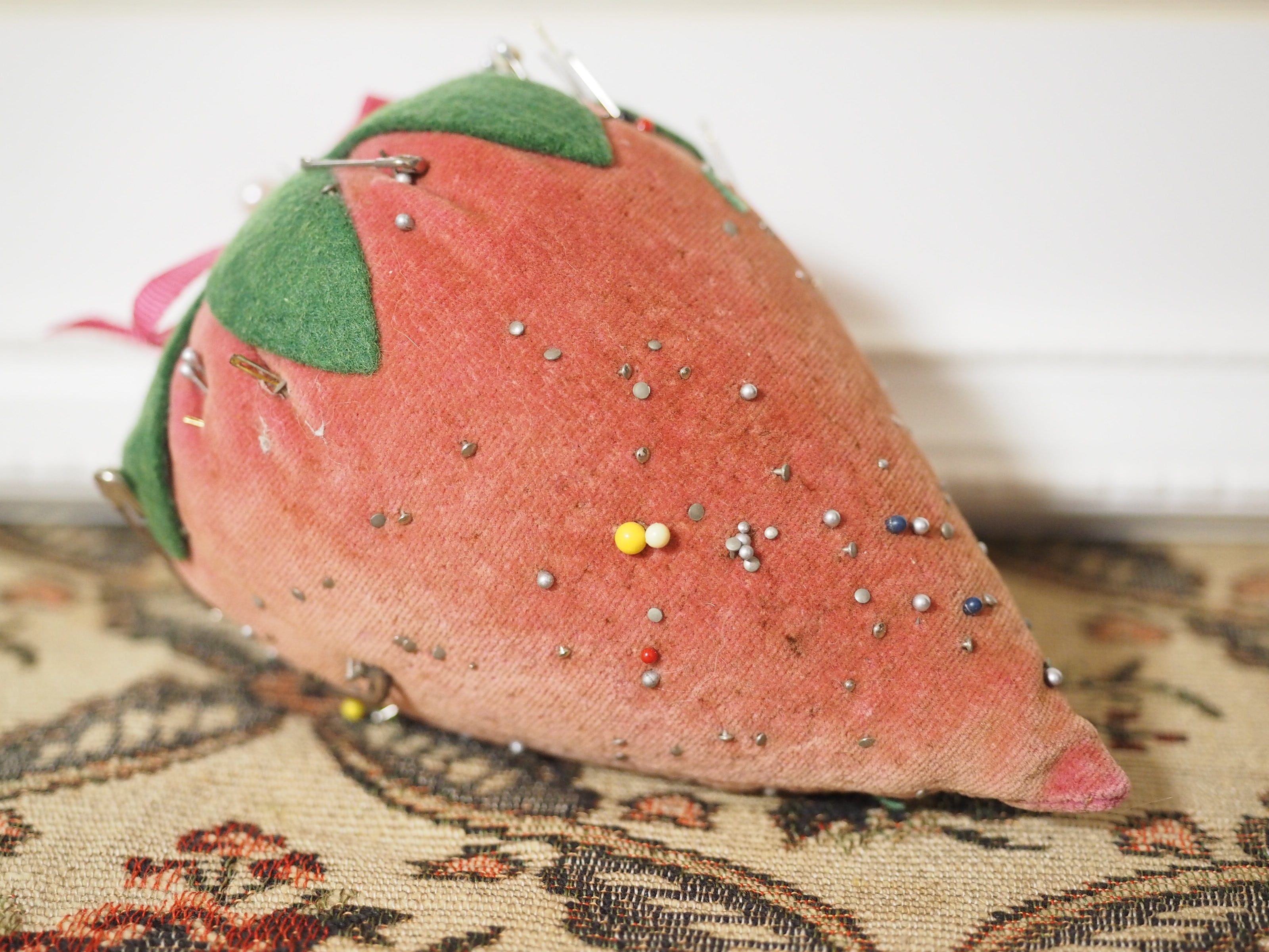 色褪せたベルベット、大きな立体イチゴのピンクッション