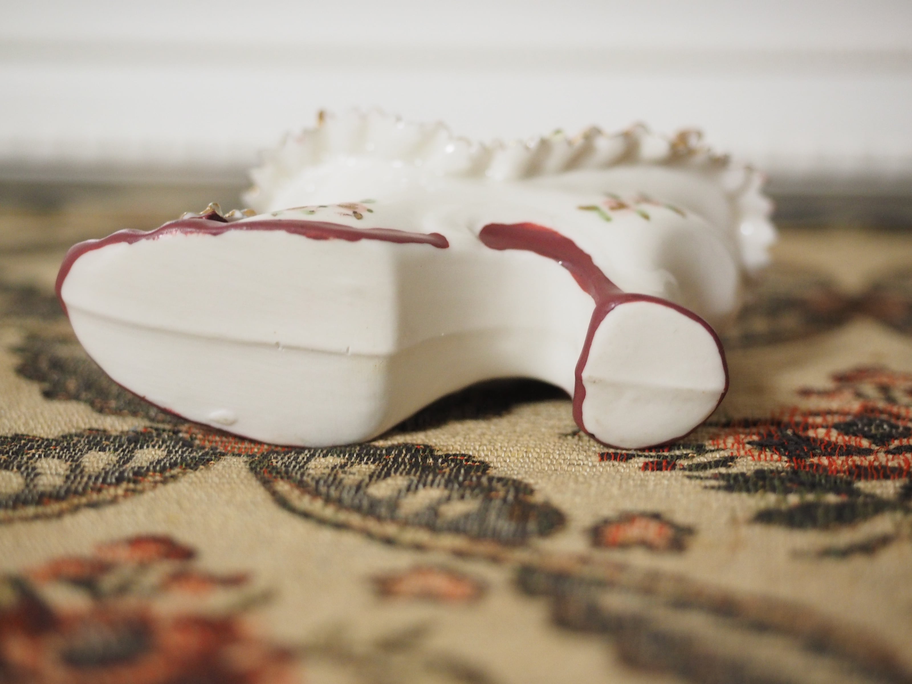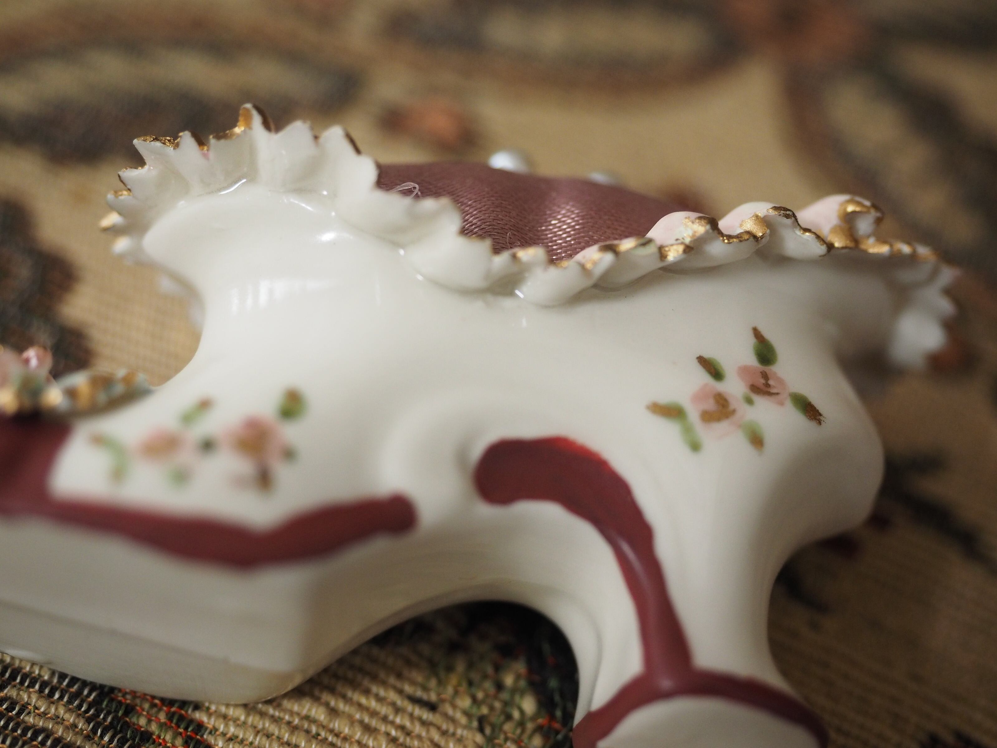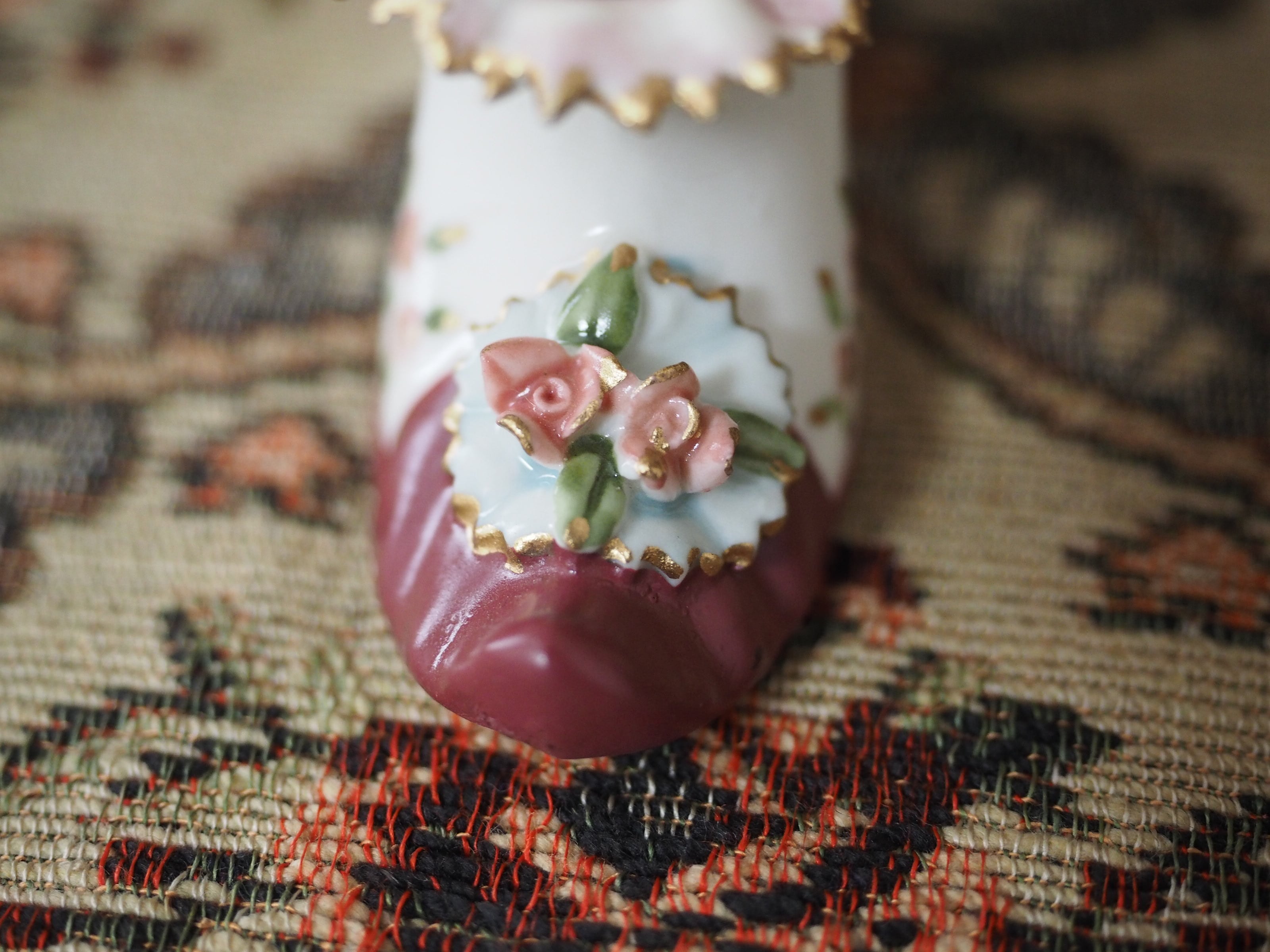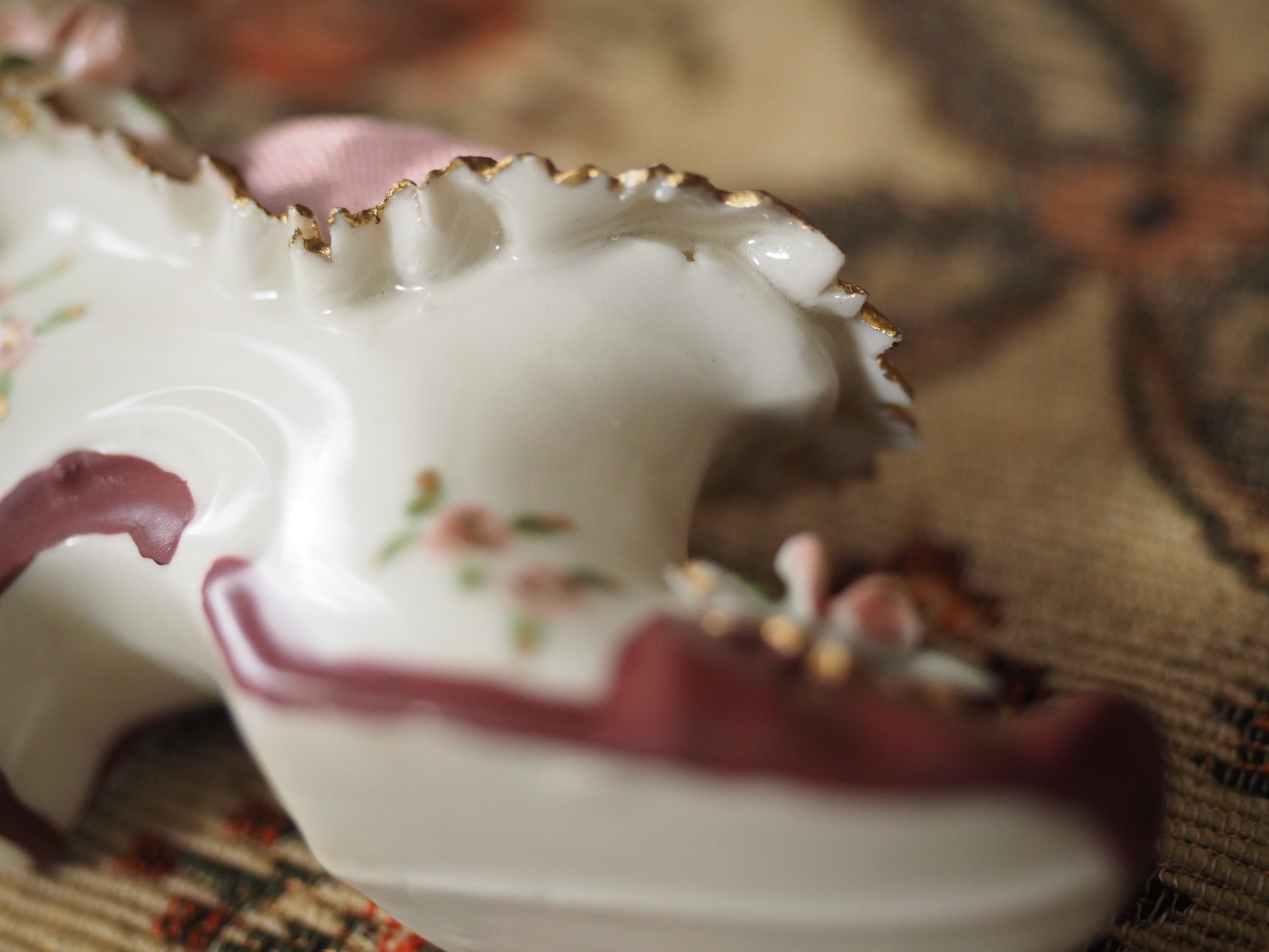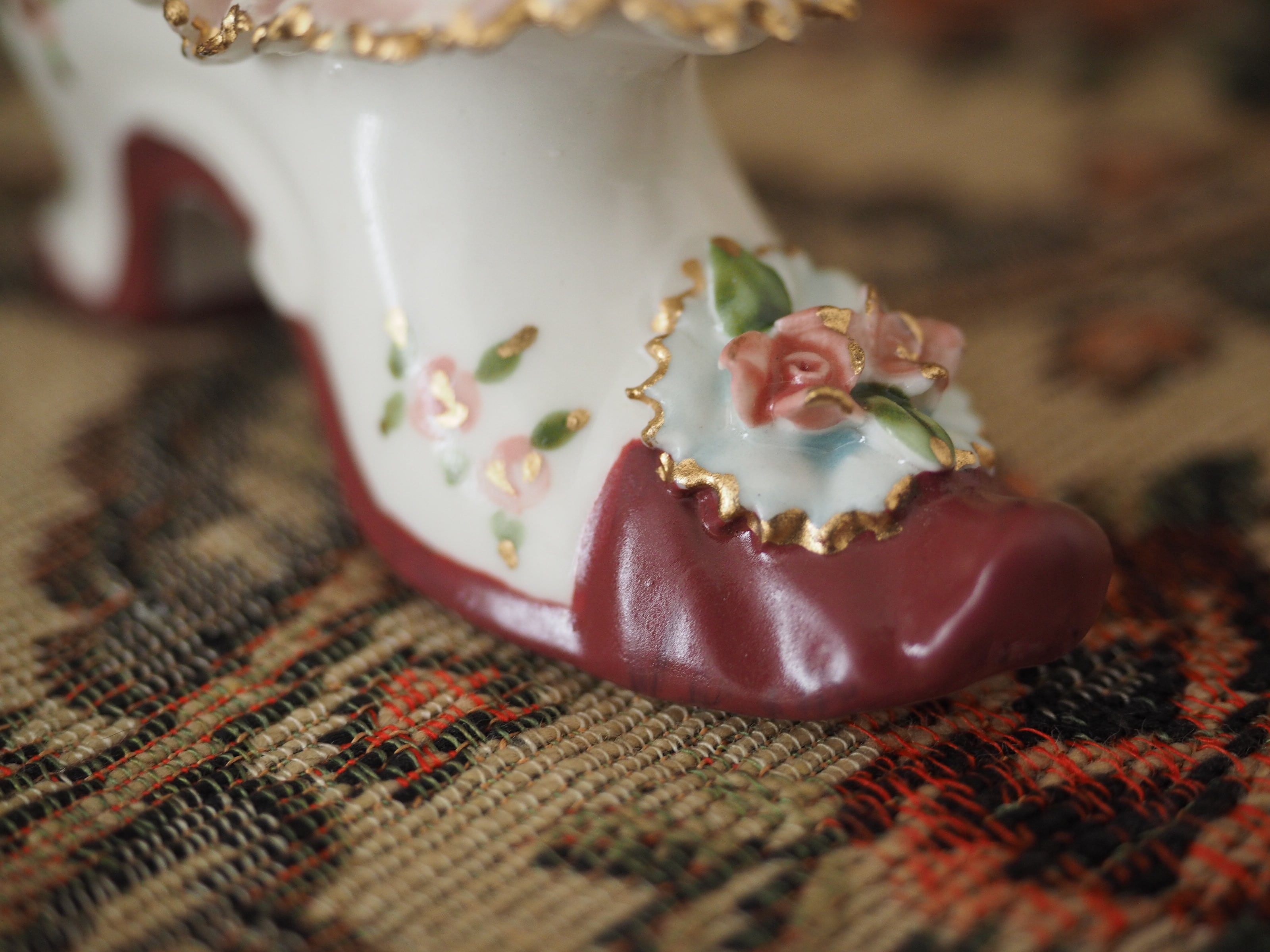 陶器製のフリルシューズに立体の薔薇モチーフ、美しい金彩に手描きの薔薇がペイントされています。