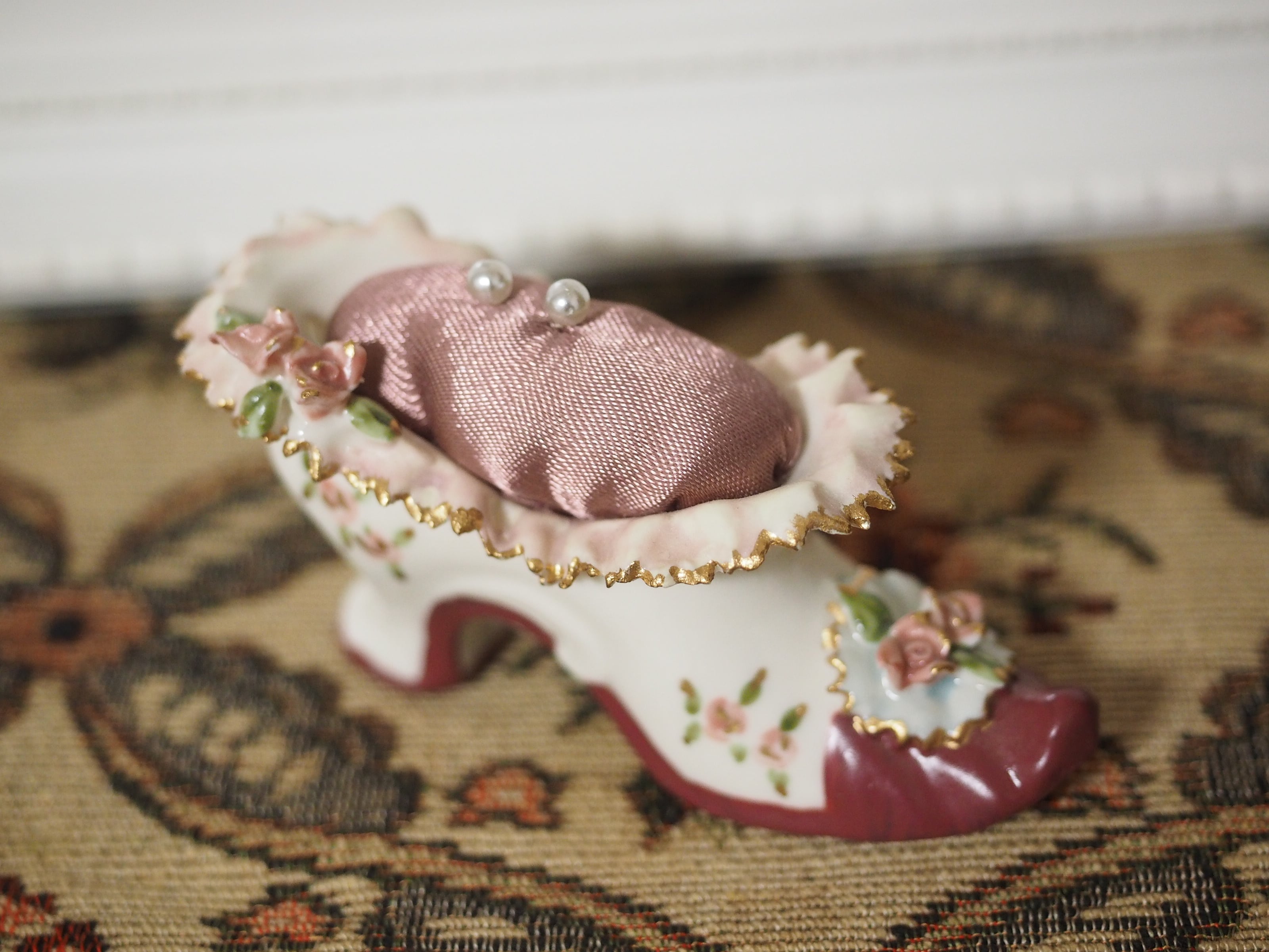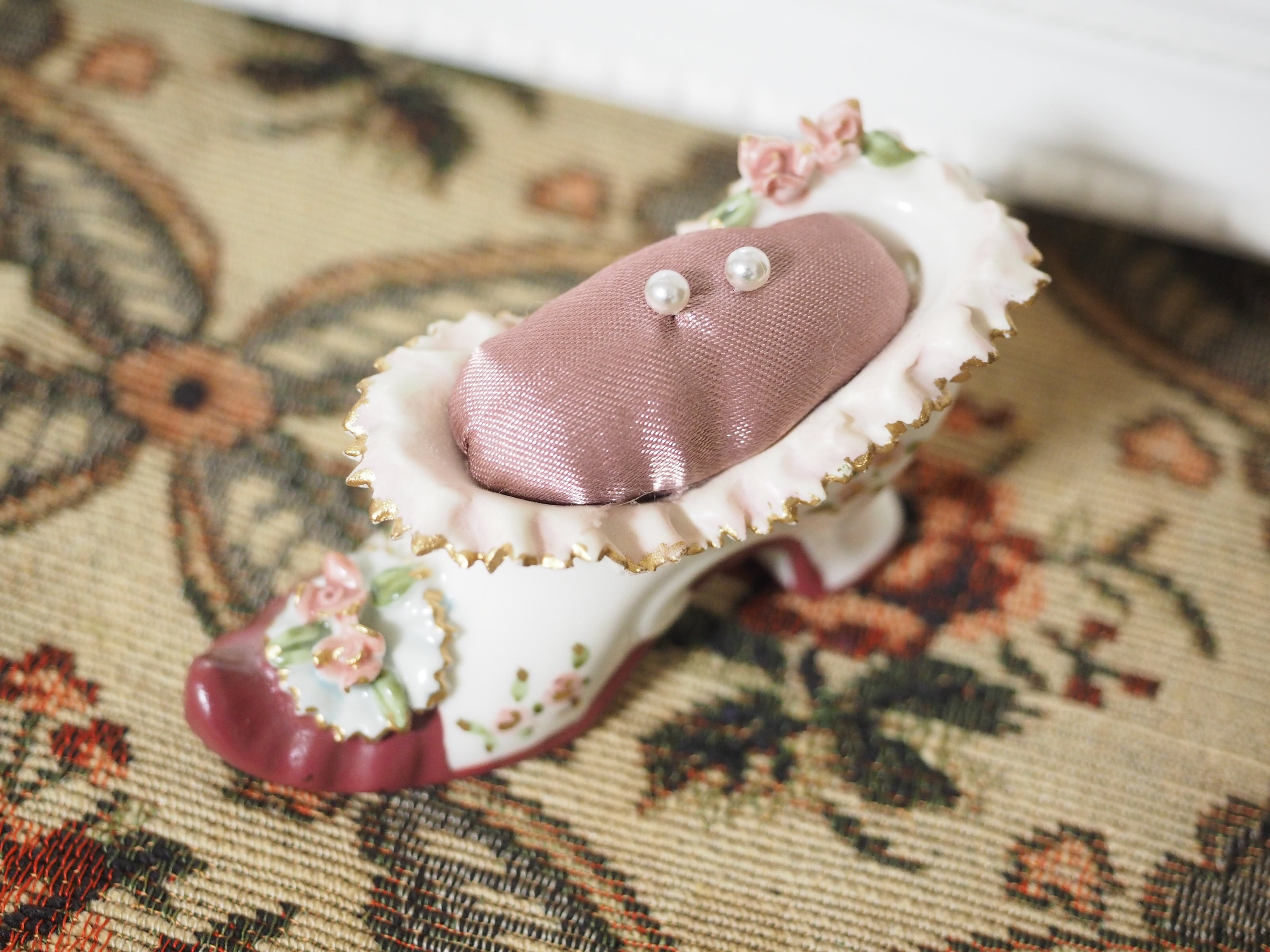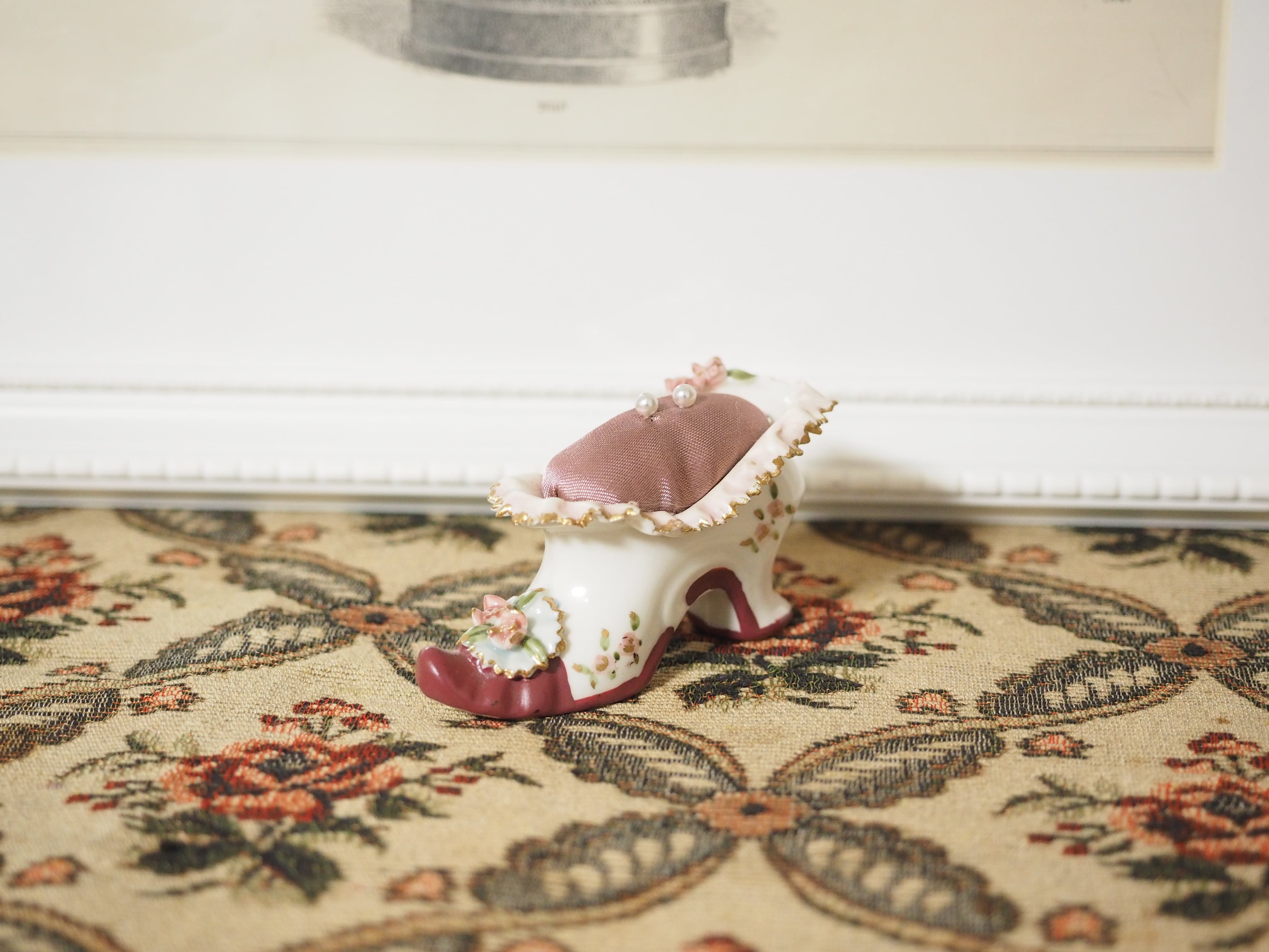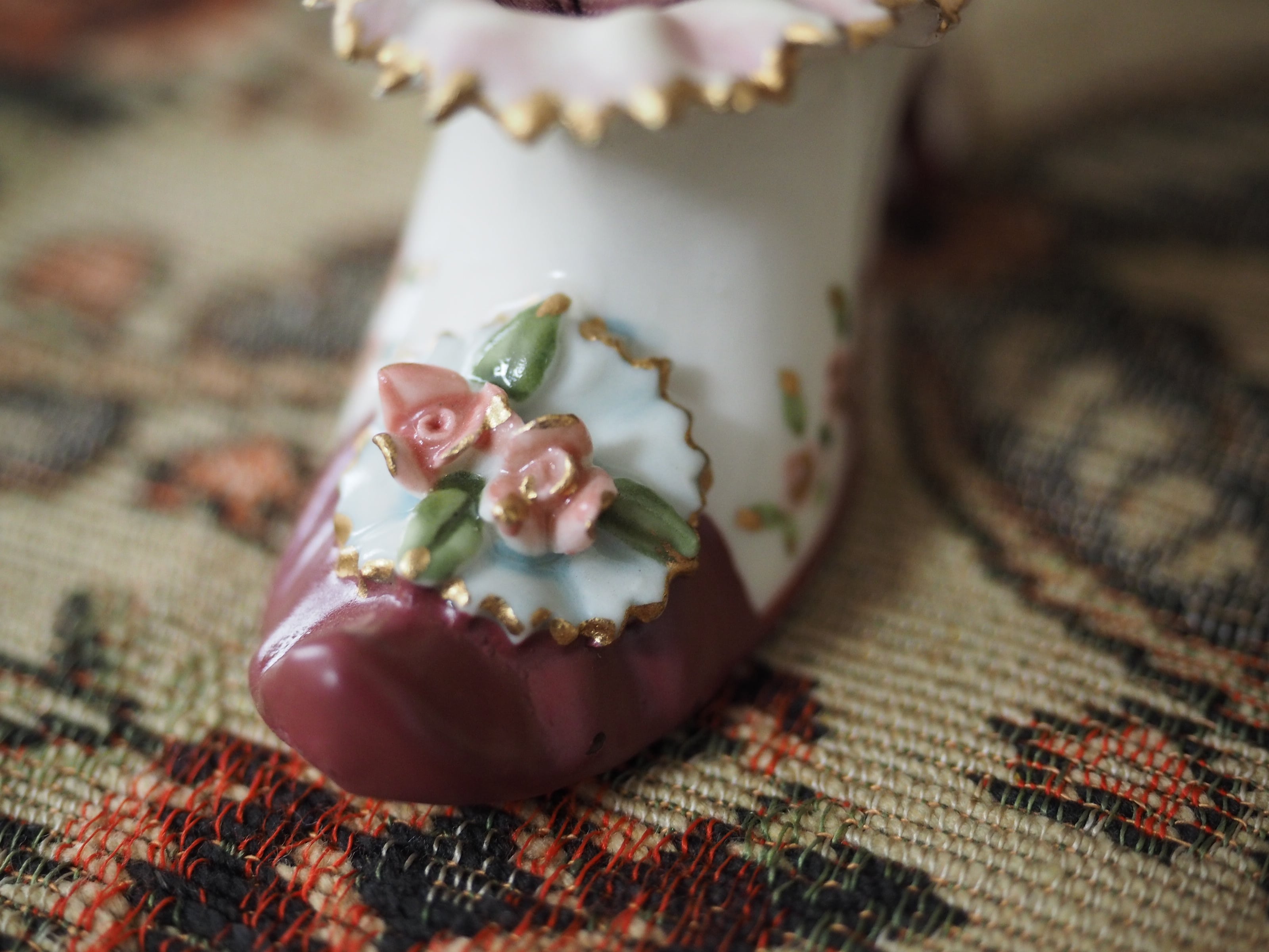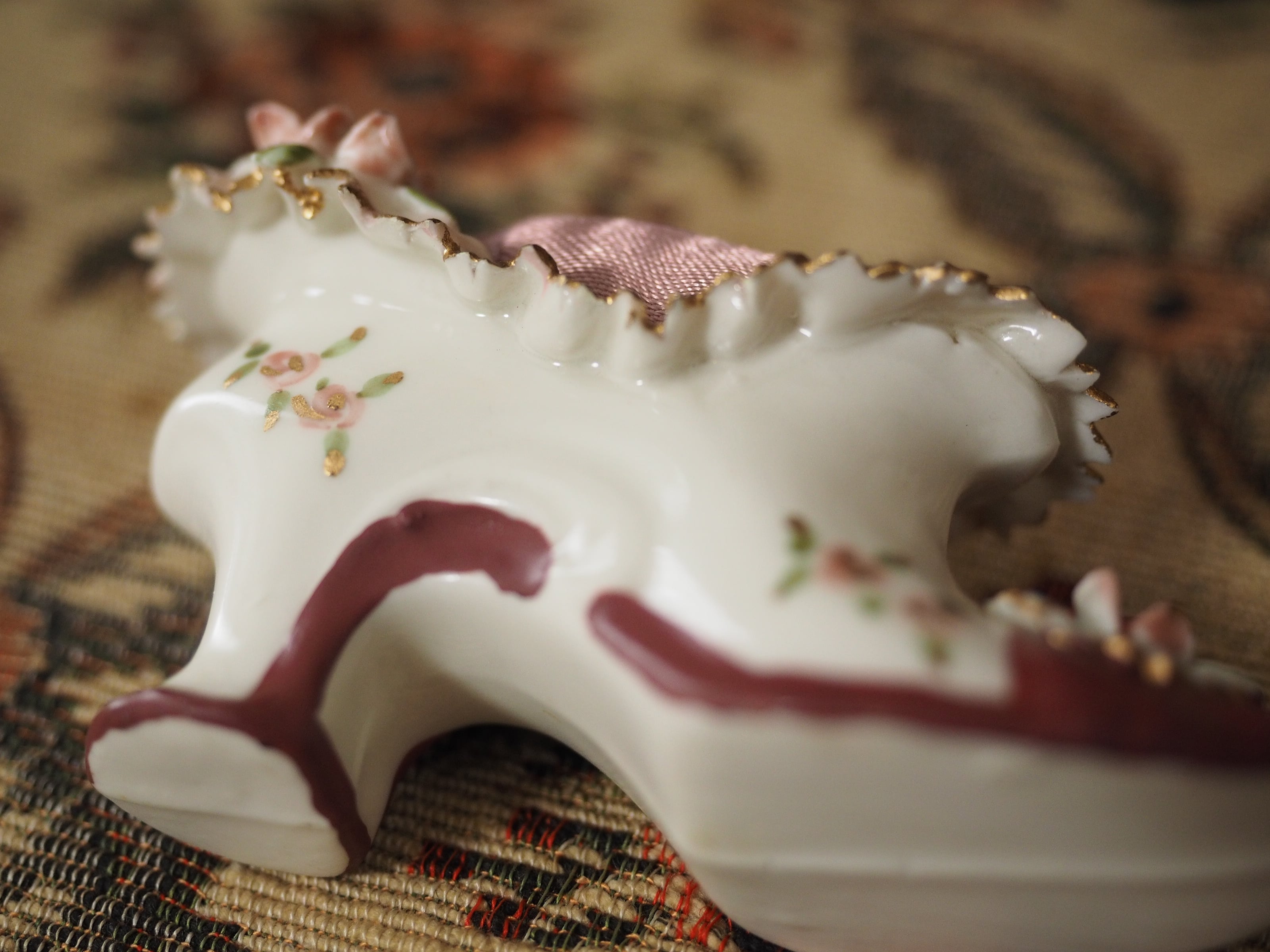 陶器製のフリルシューズに立体の薔薇モチーフ、美しい金彩に手描きの薔薇がペイントされています。
