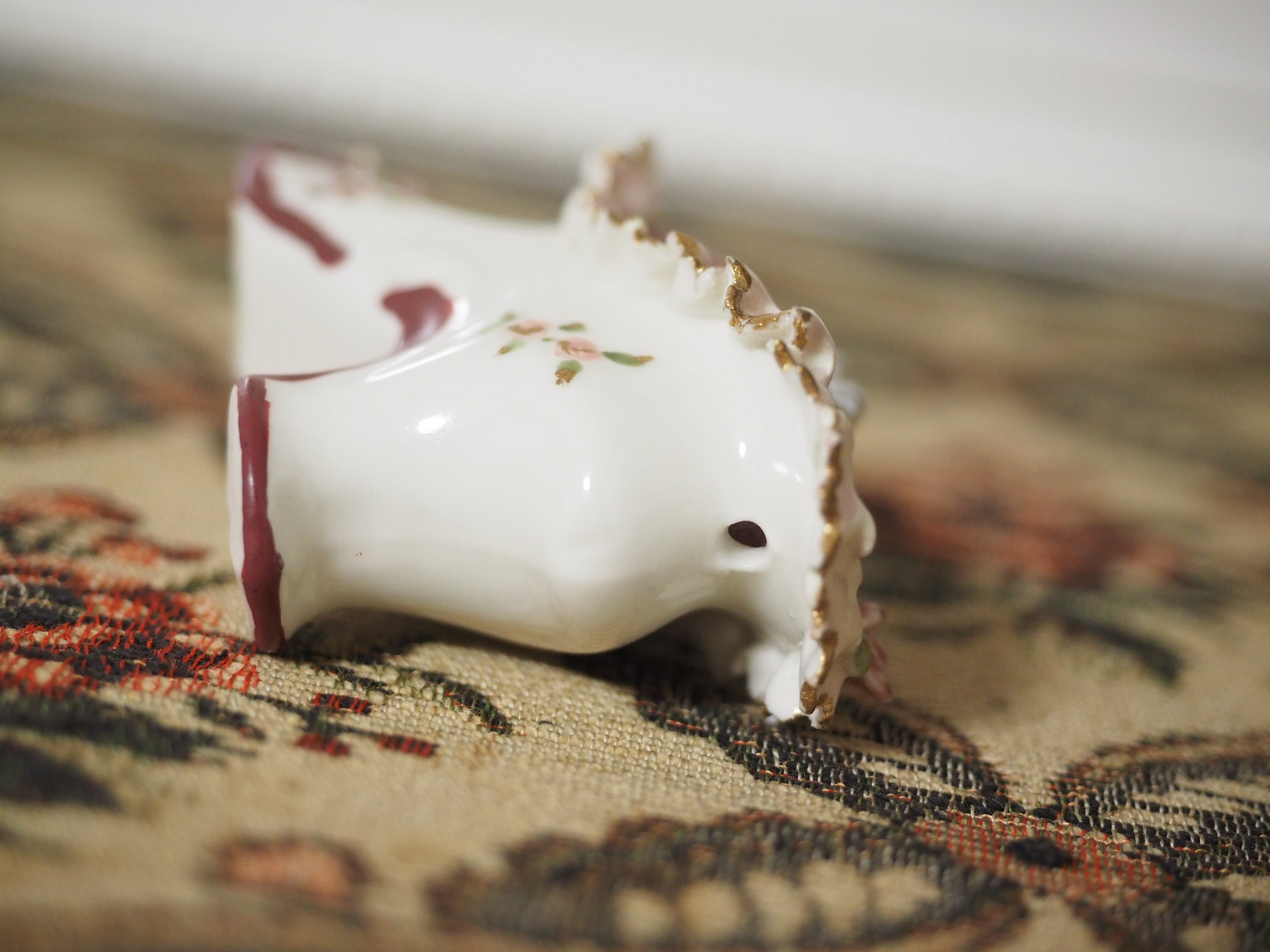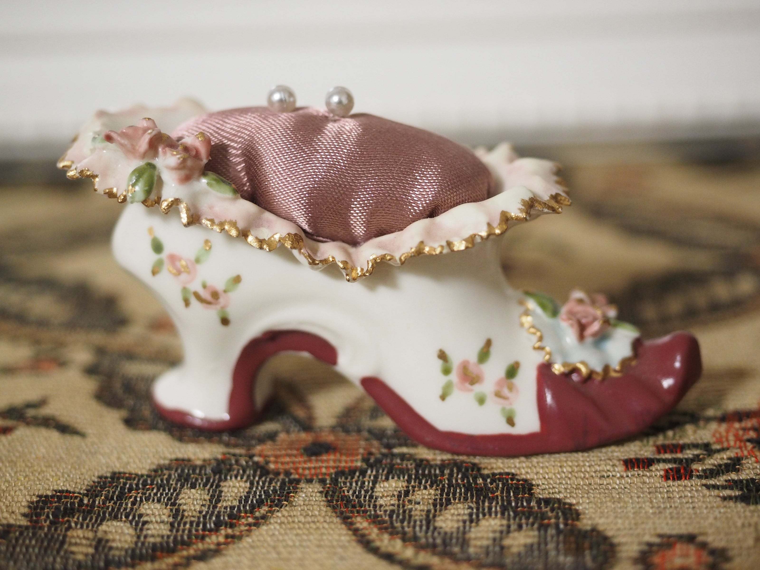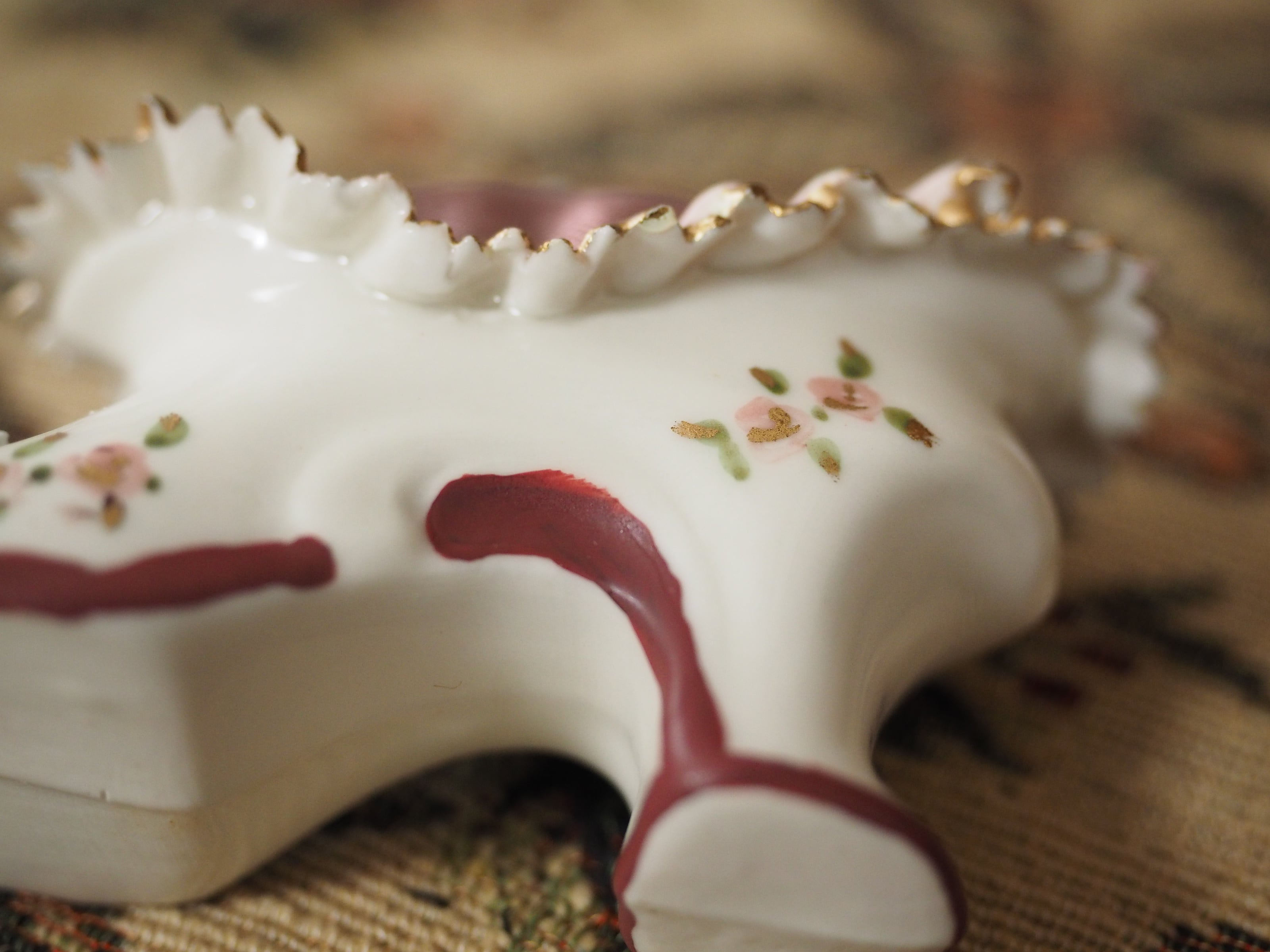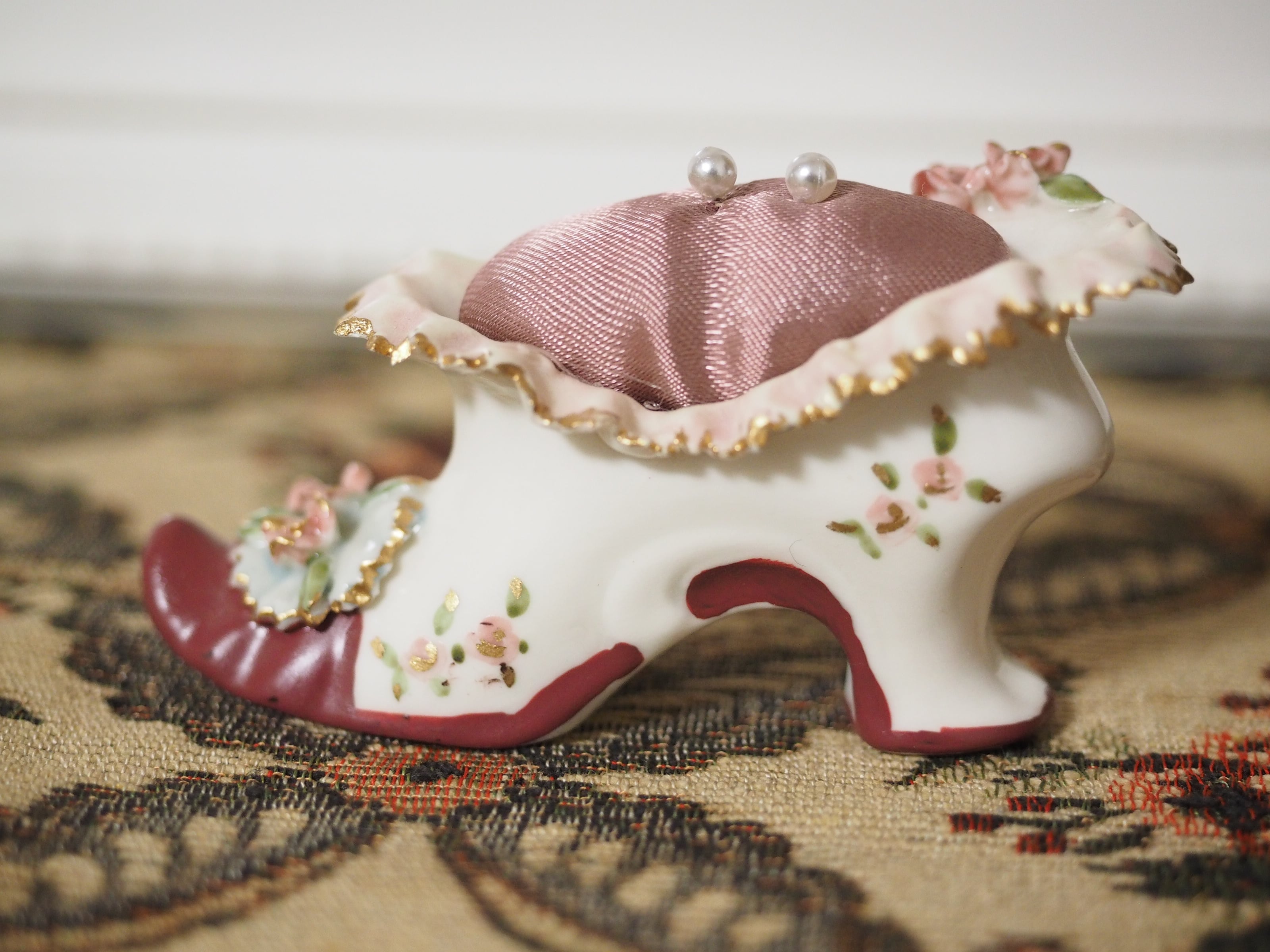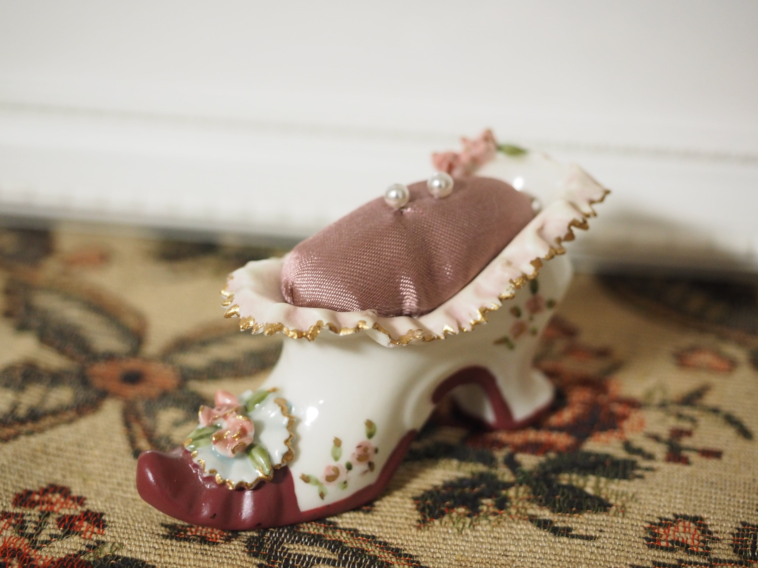 陶器製のフリルシューズに立体の薔薇モチーフ、美しい金彩に手描きの薔薇がペイントされています。