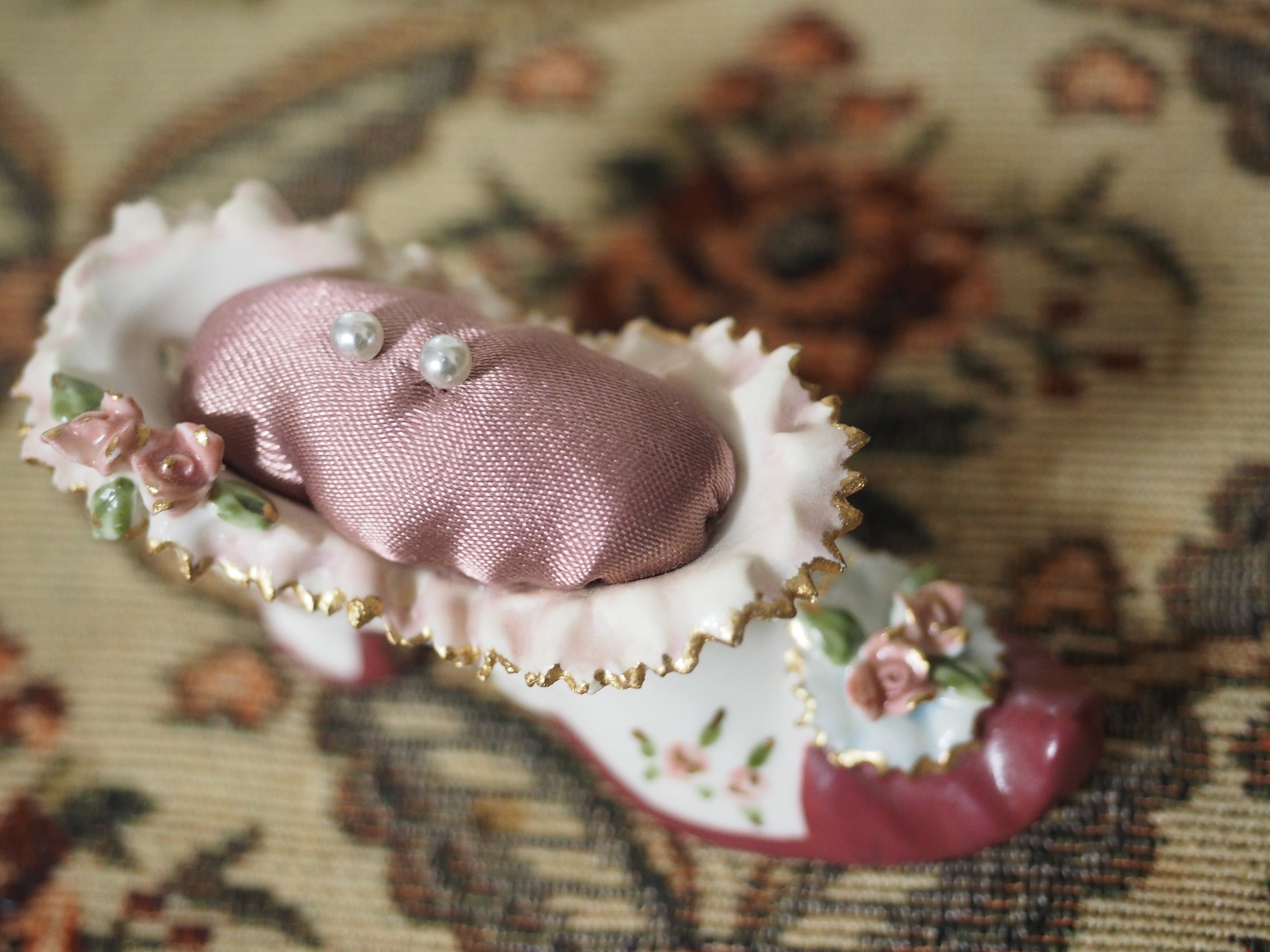 サテンのクッションにパールの待ち針2つ付きで、取り外し出来ます。クッションの中身は綿素材のようでふっくらボリュームがあります。