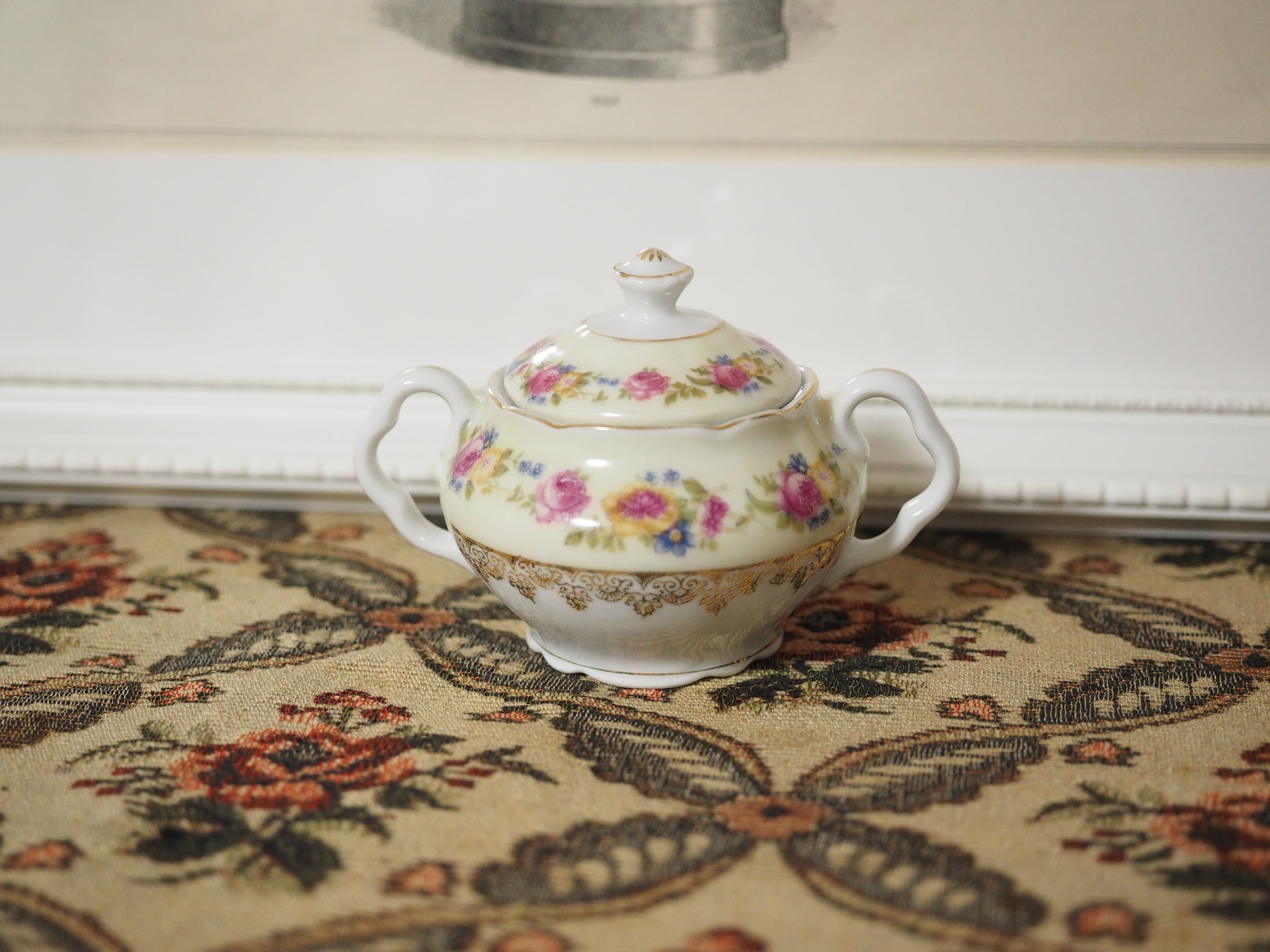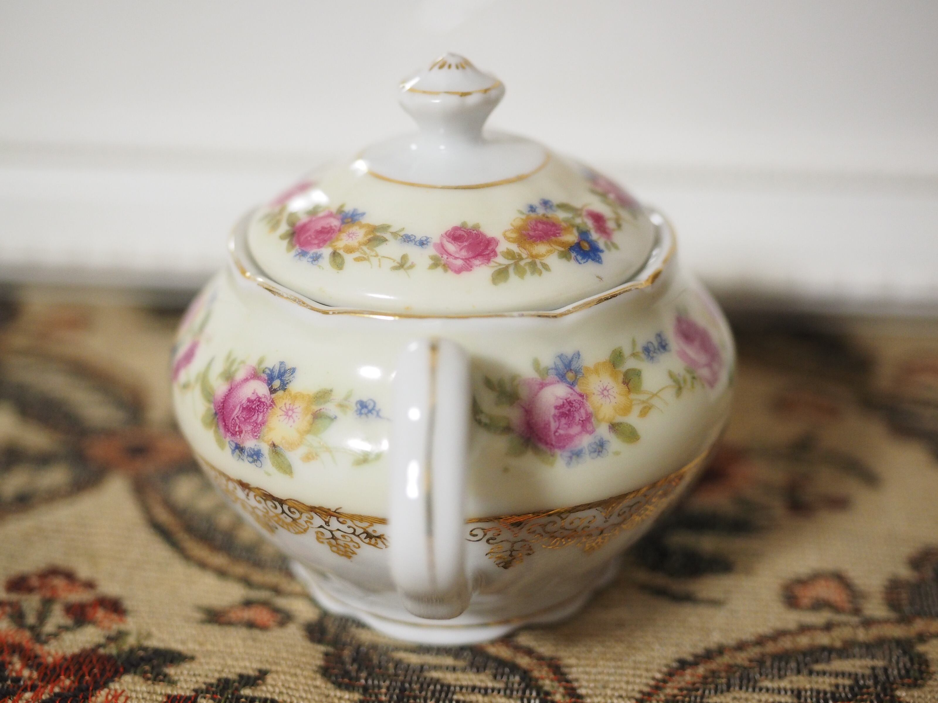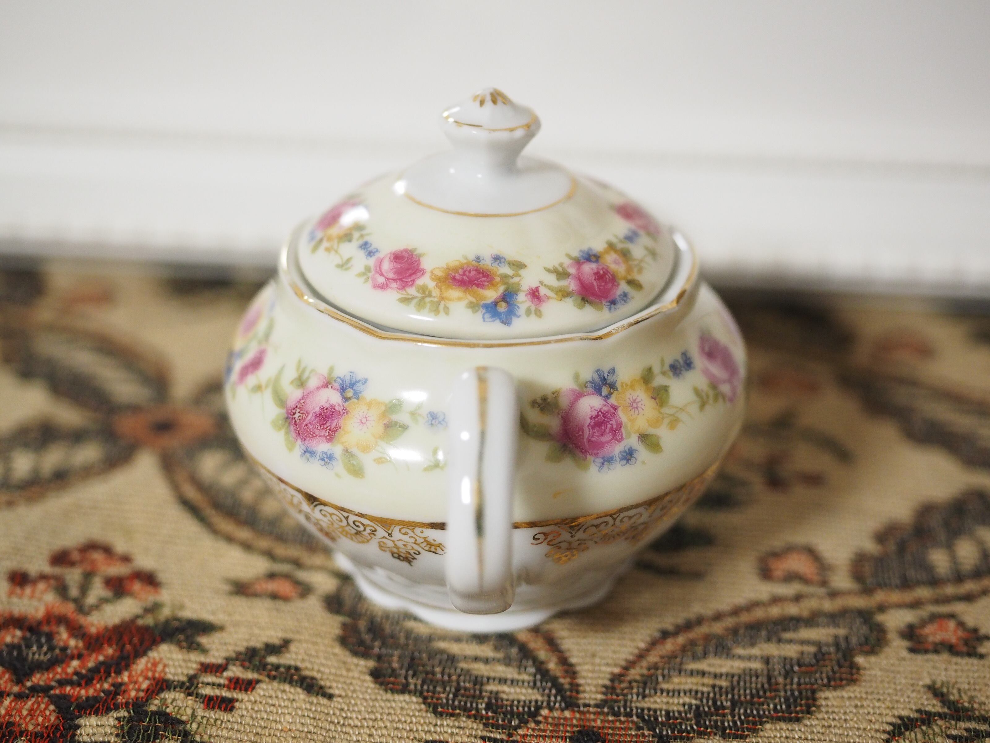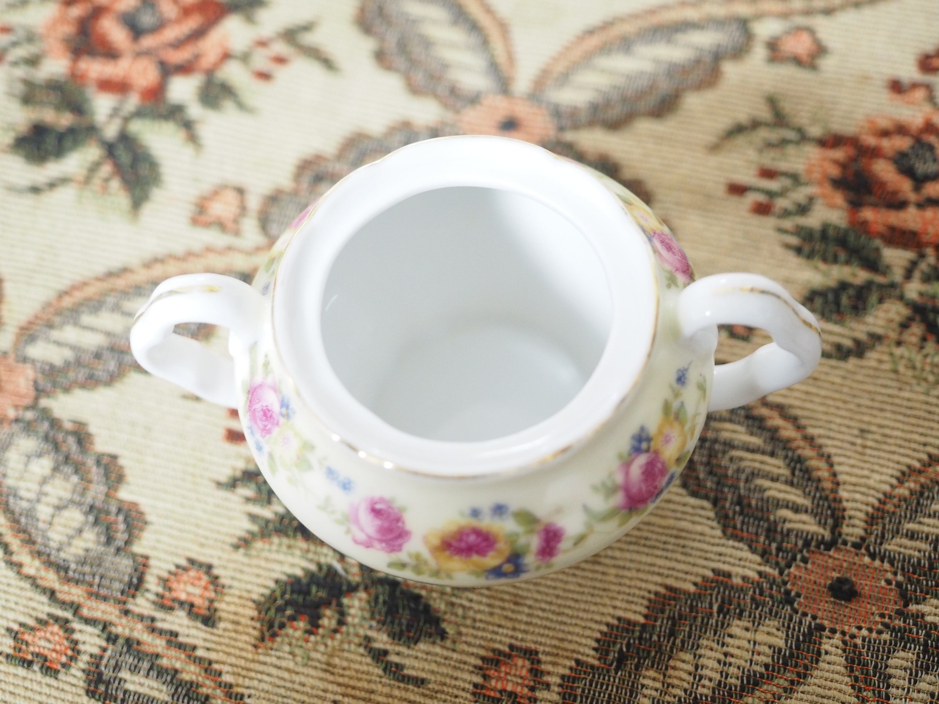 なみなみとしたデザインと花柄がかわらしいシュガーポット