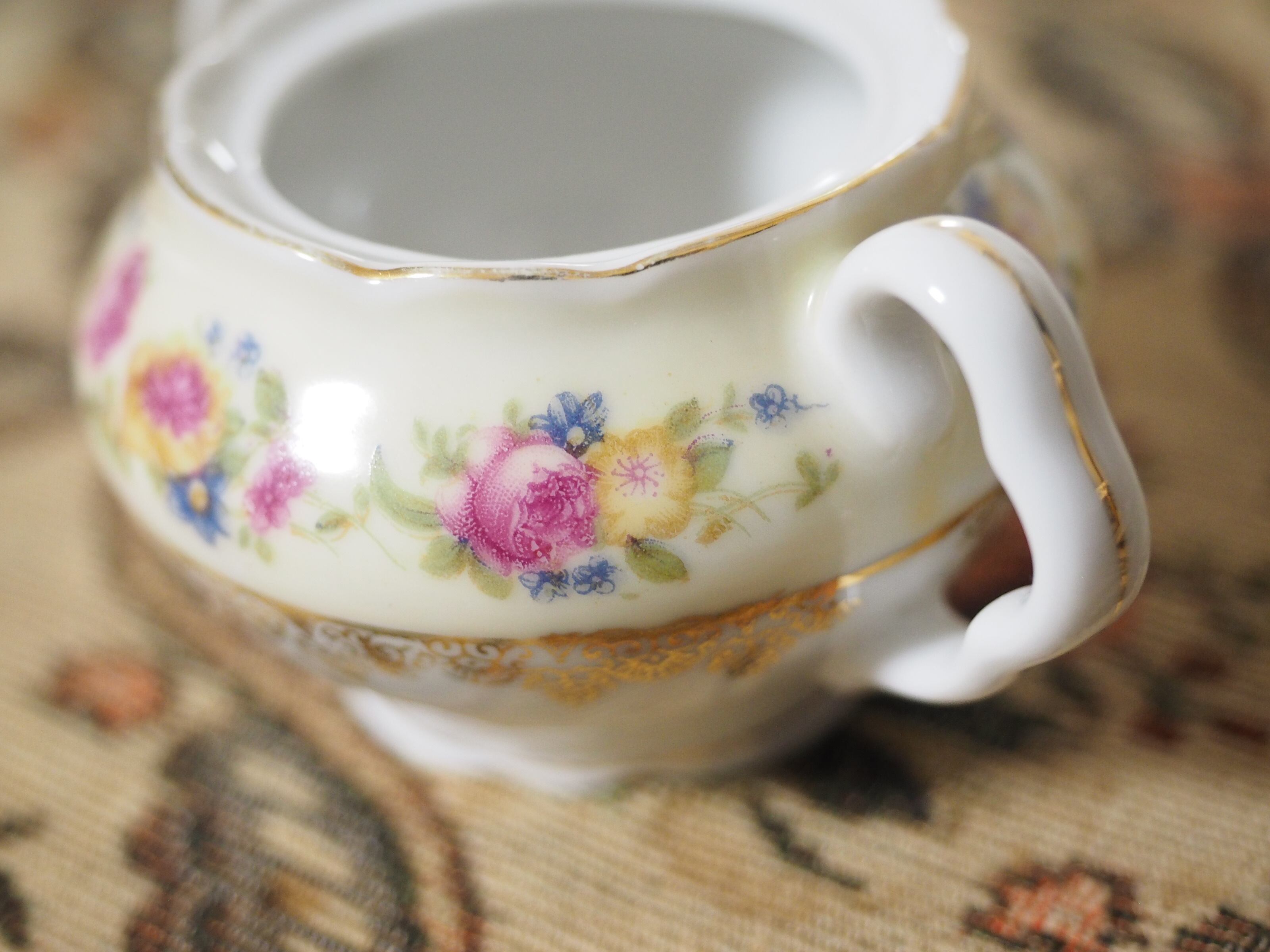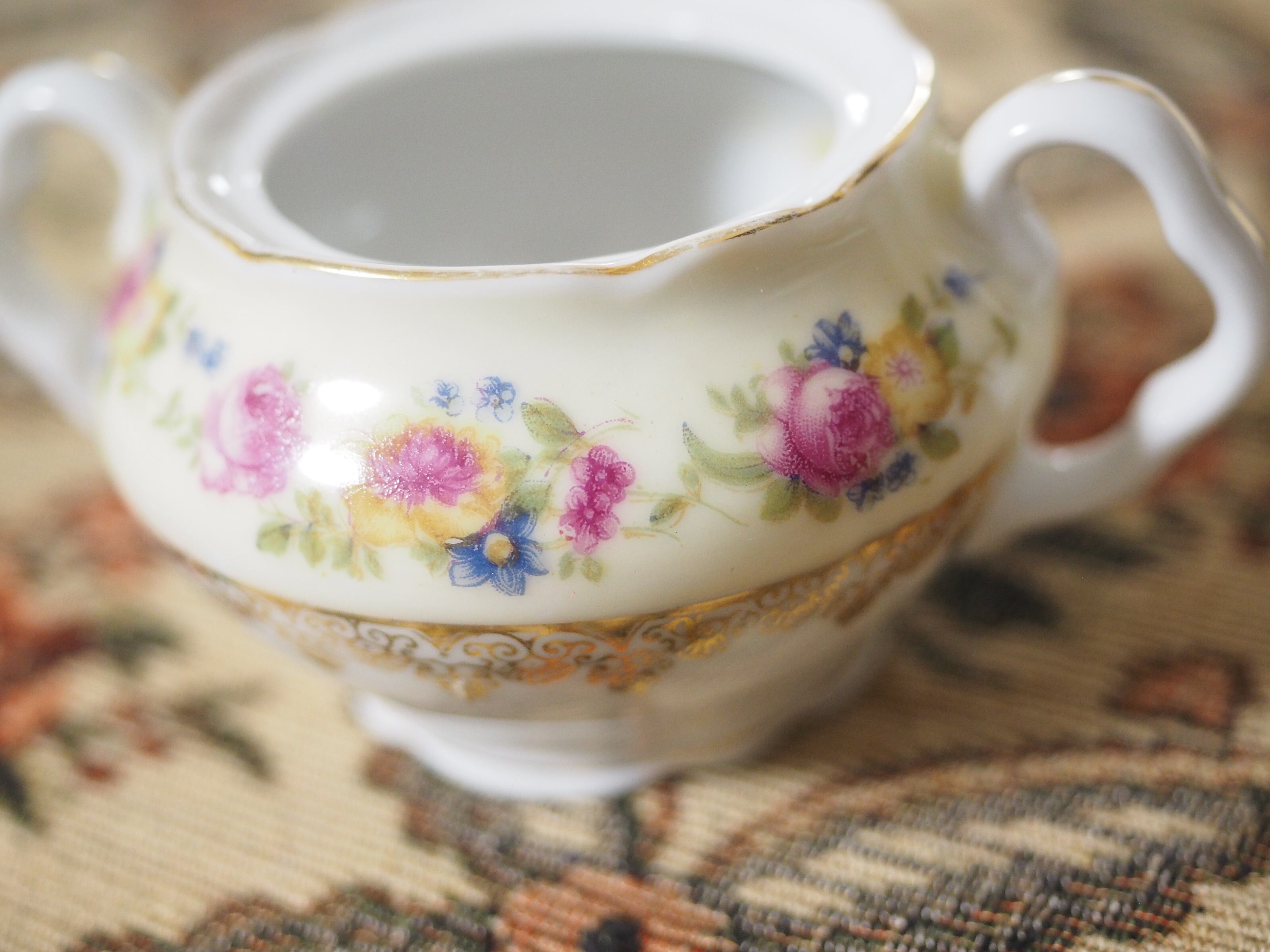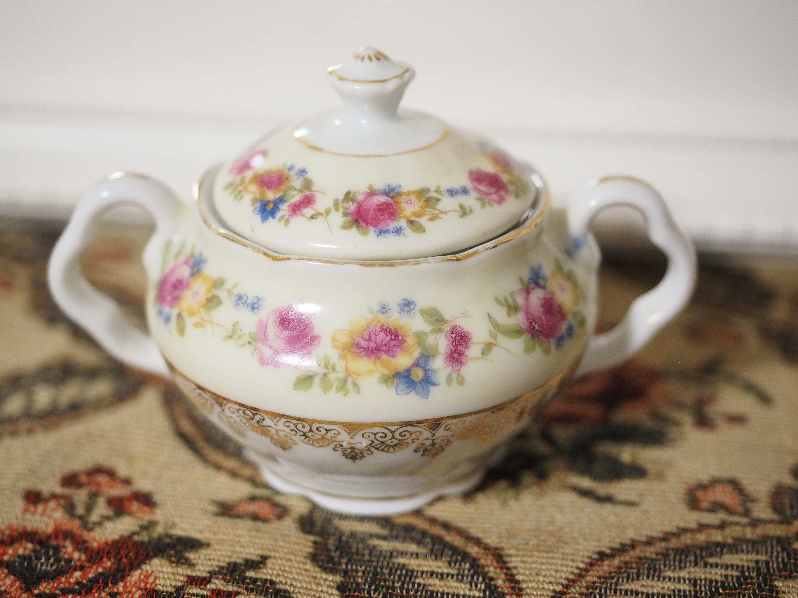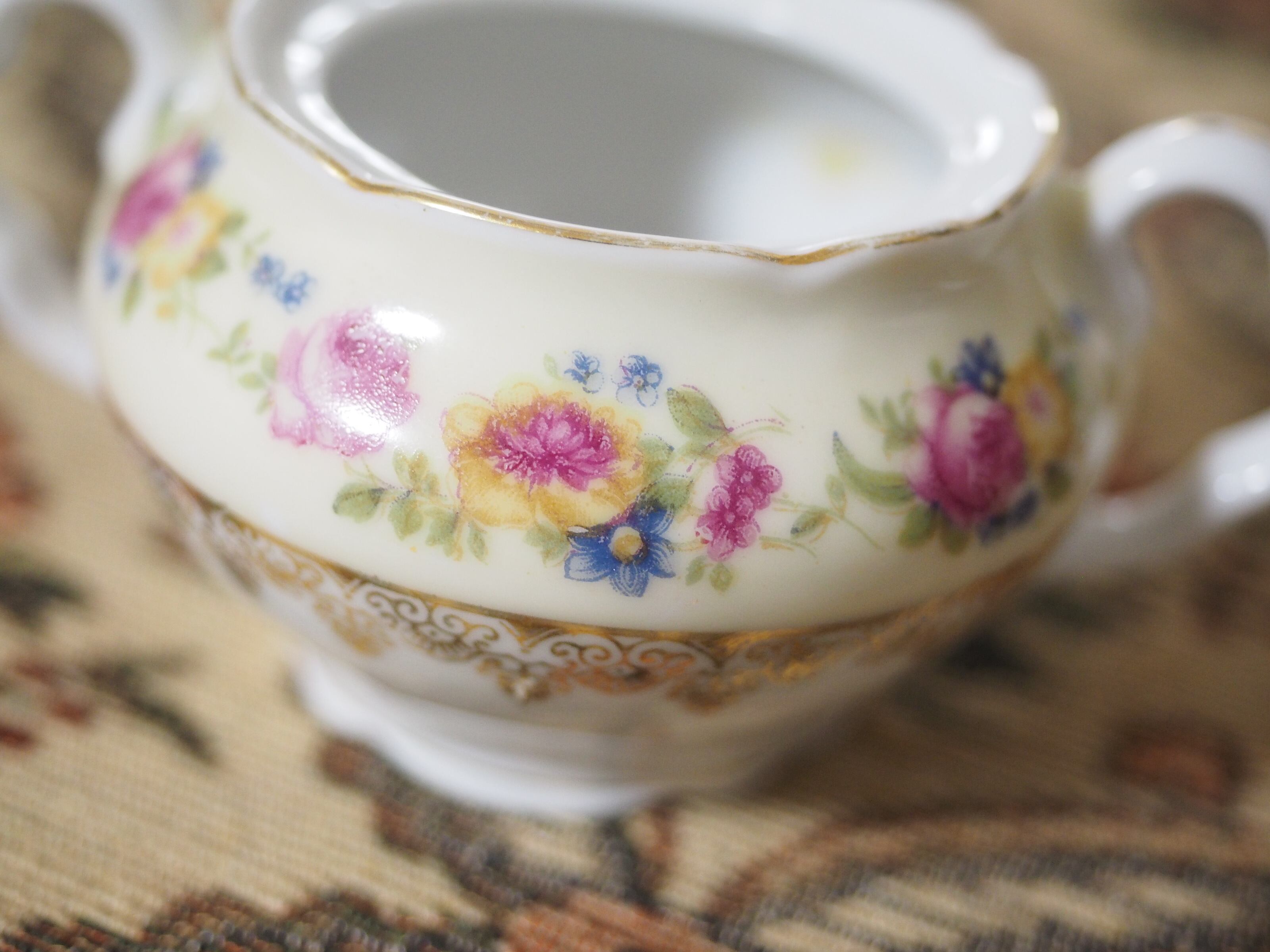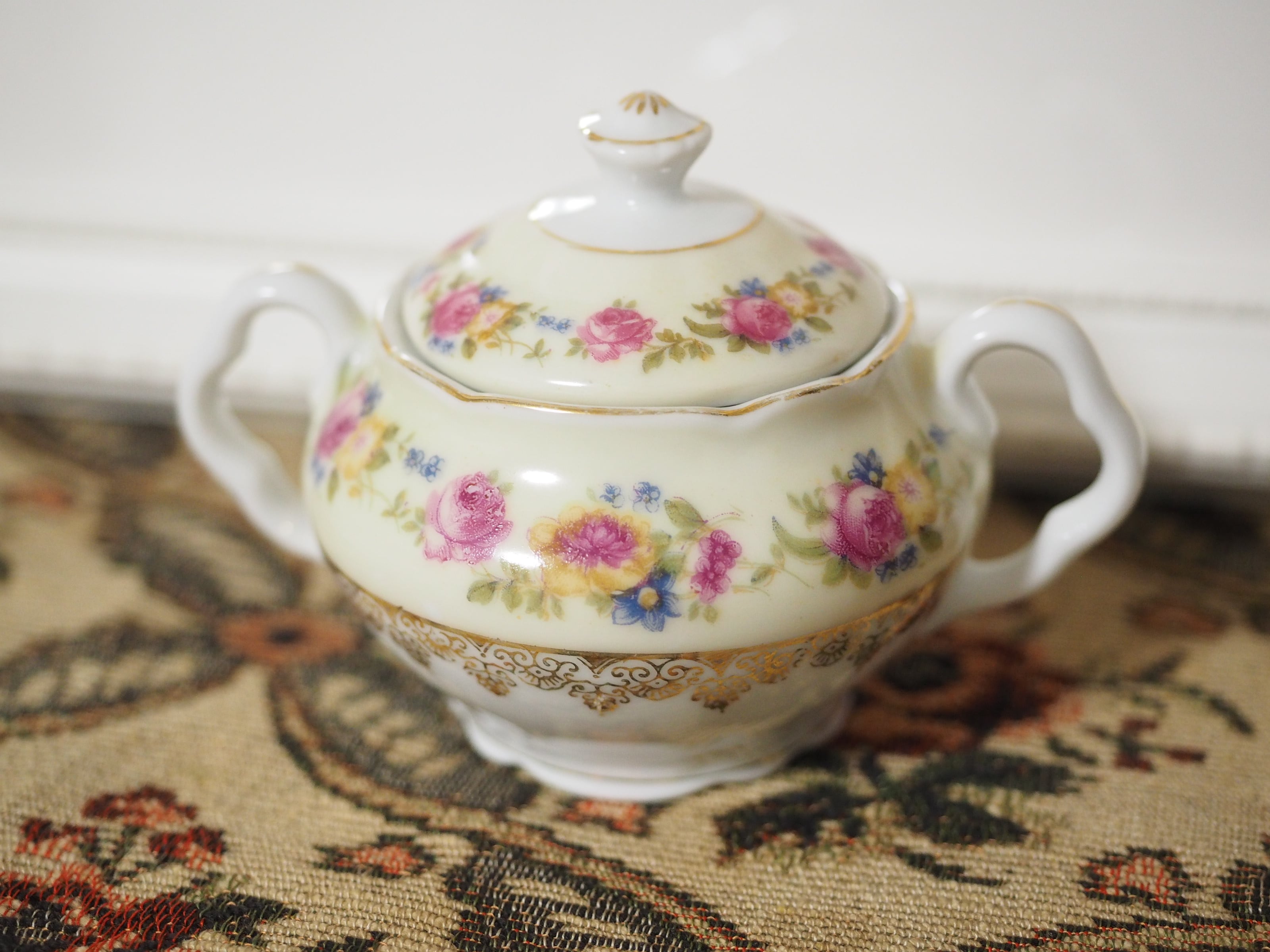 なみなみとしたデザインと花柄がかわらしいシュガーポット