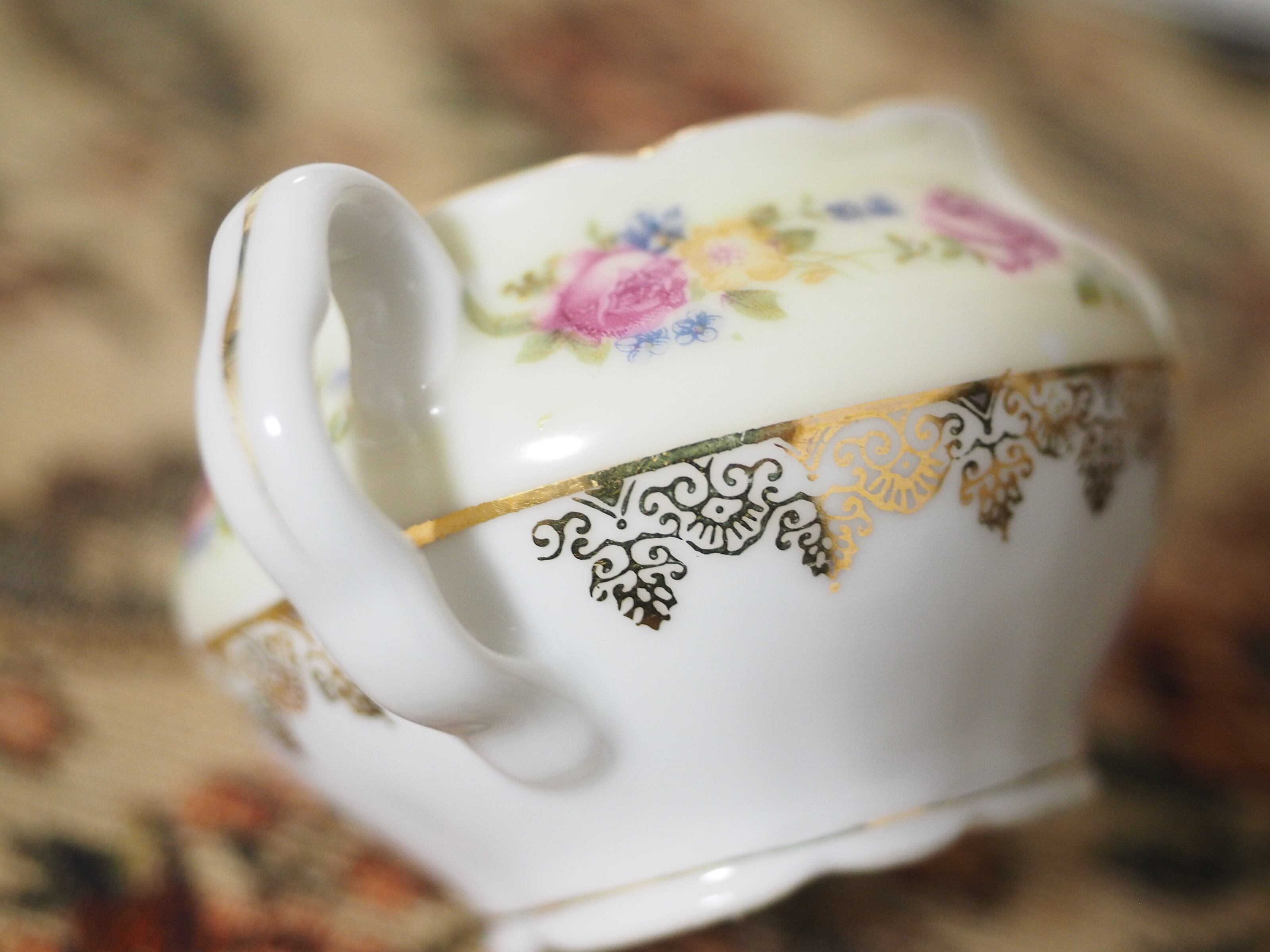 持ち手と縁、底も波打ったデザインで、花柄と金彩が華やかでかわいらしいです。