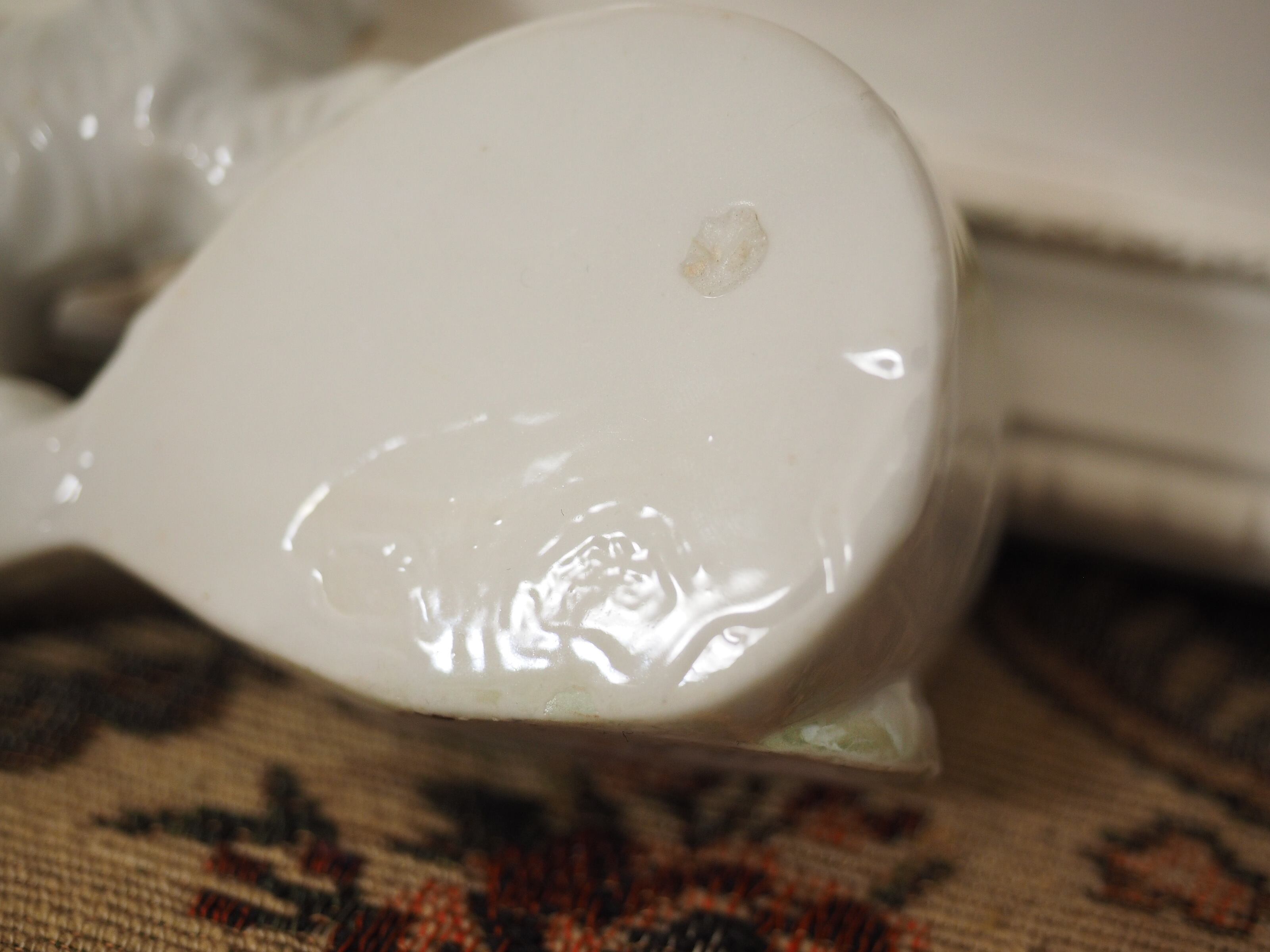 本体は釉薬のツヤがありますが、表側下部に半円状、裏側にも丸く釉薬がはがれてざらついた部分あり。
