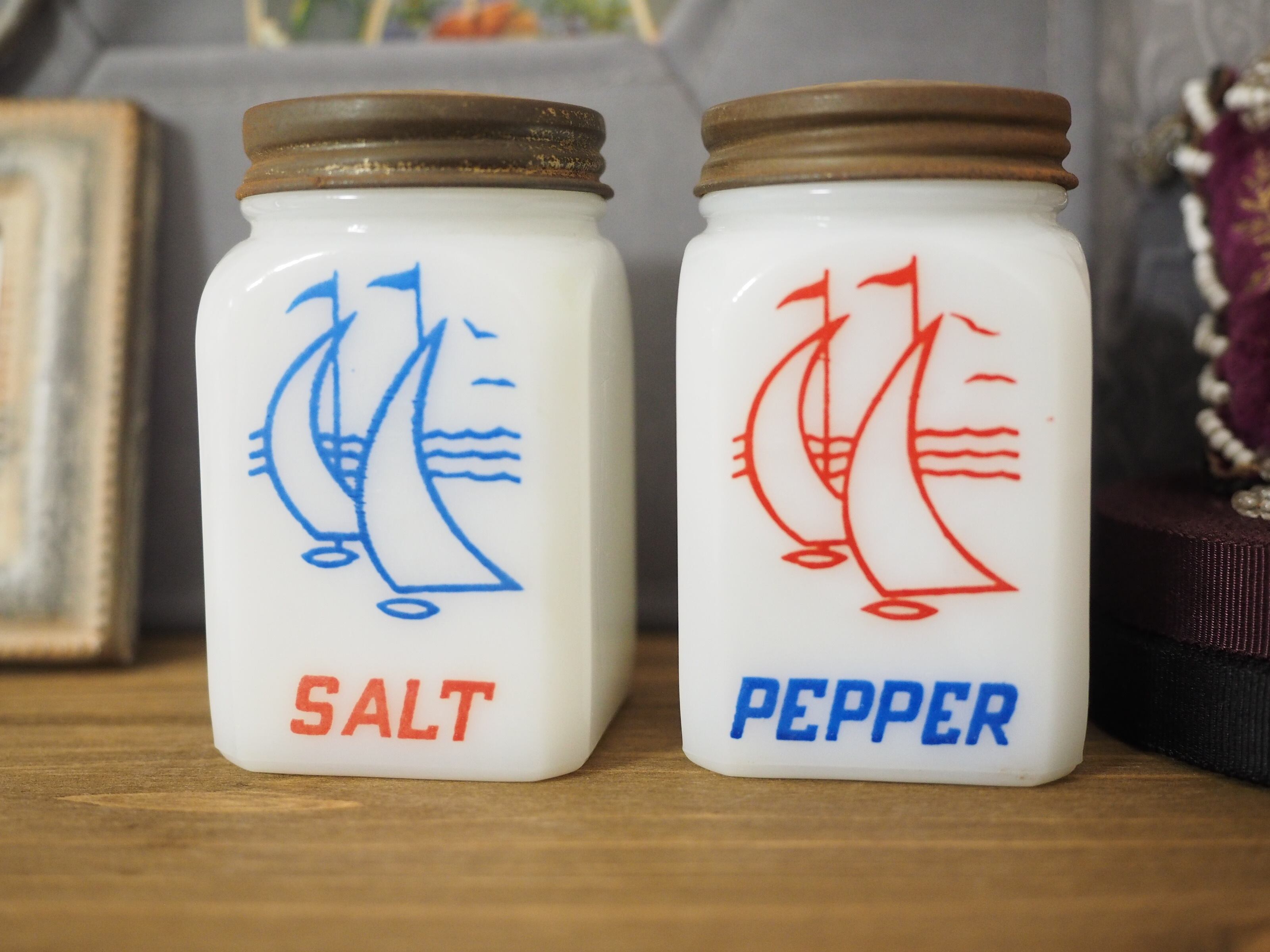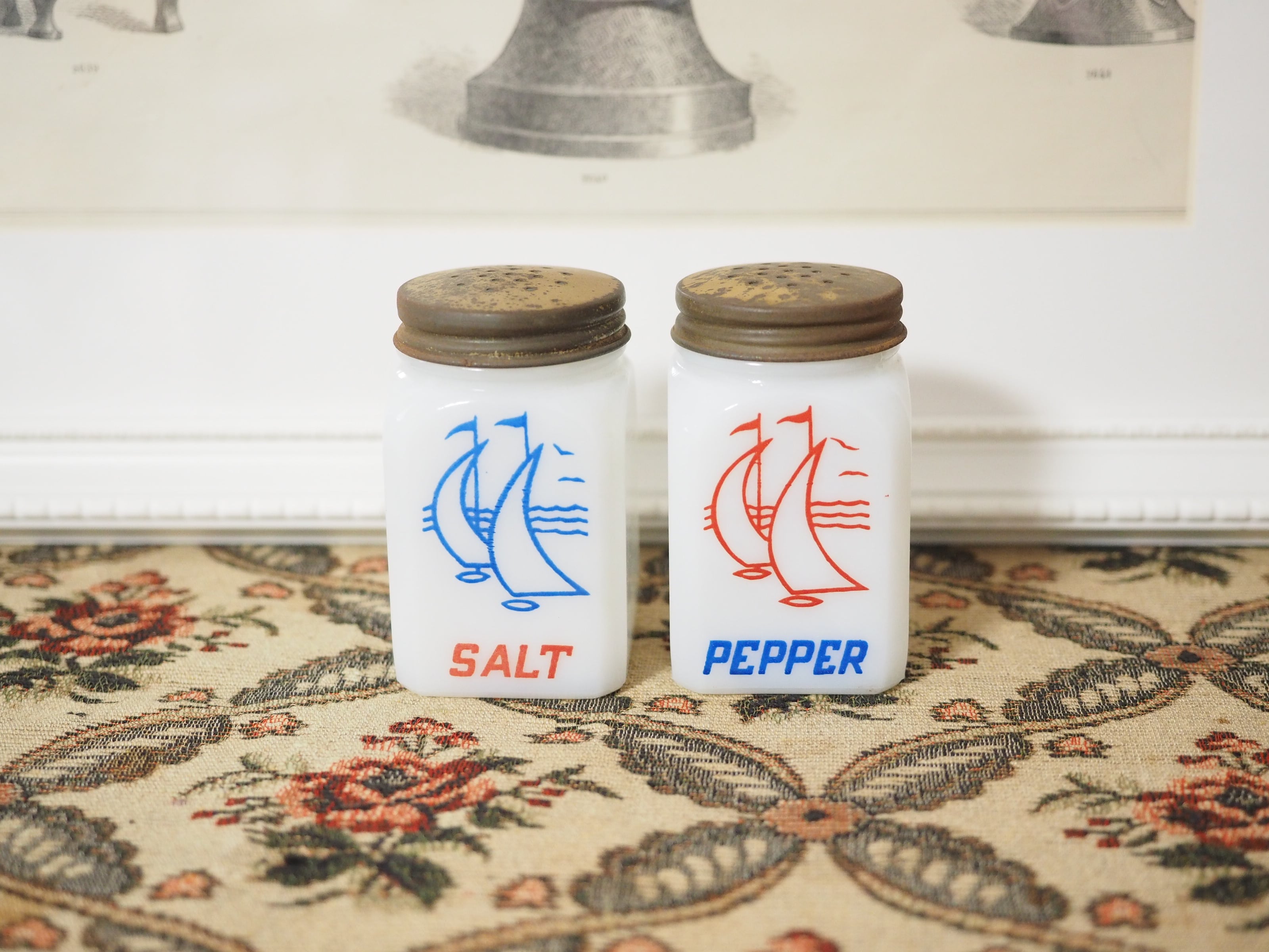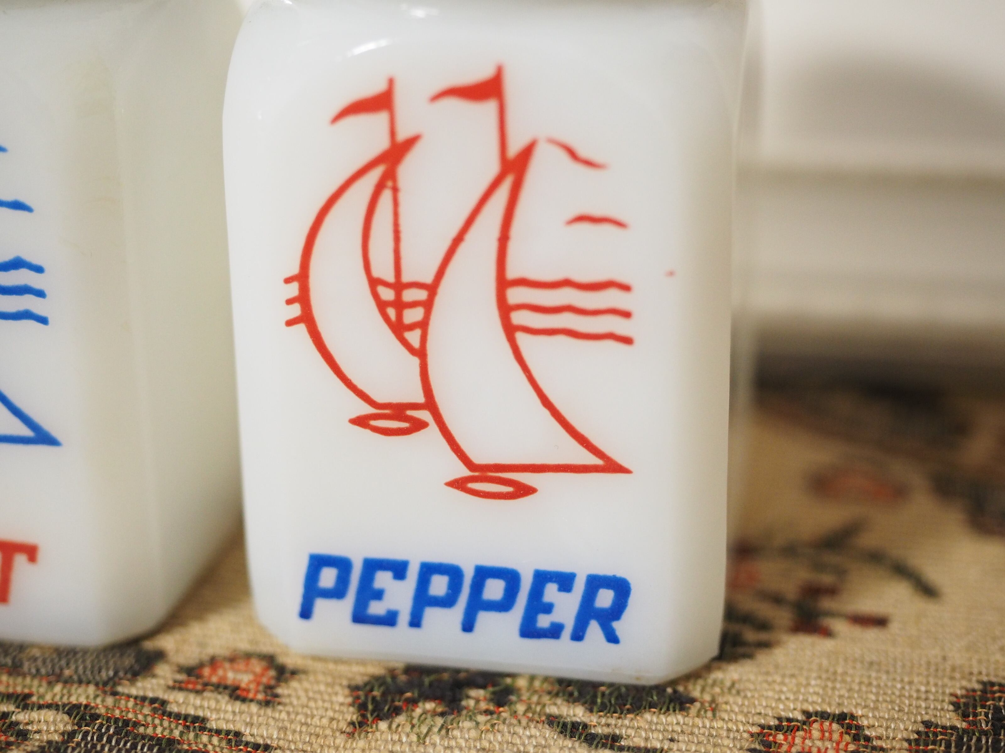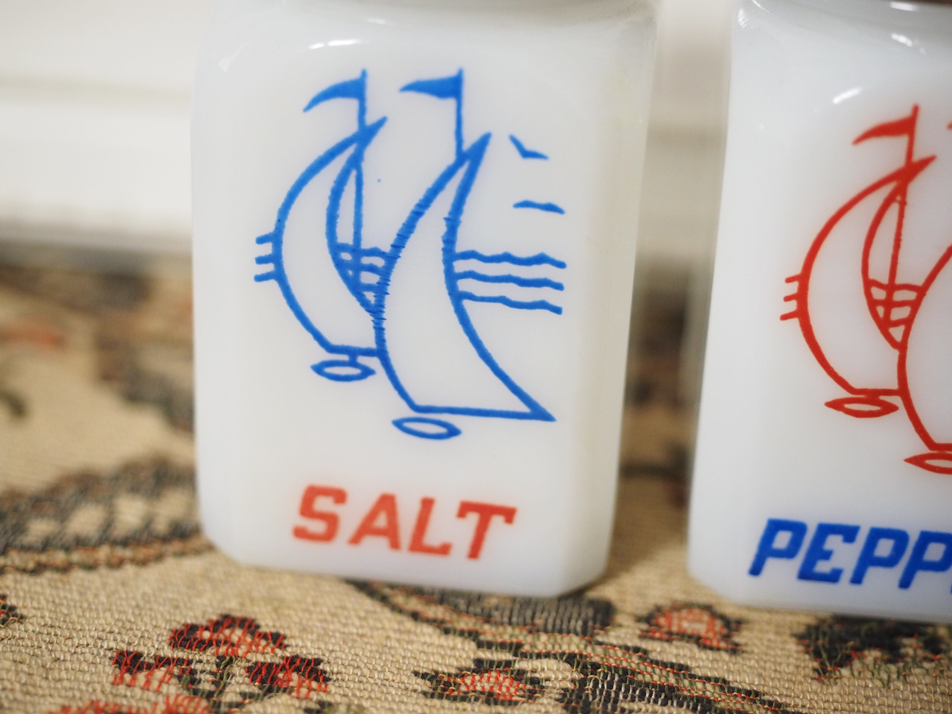 ミルクガラス(乳濁材を加えて作られたガラス)のホワイトに朱色がかったレッドとブルー、爽やかなカラーとイラスト、ソルトとペッパーのフォントもビンテージ感があっておしゃれなセットです。