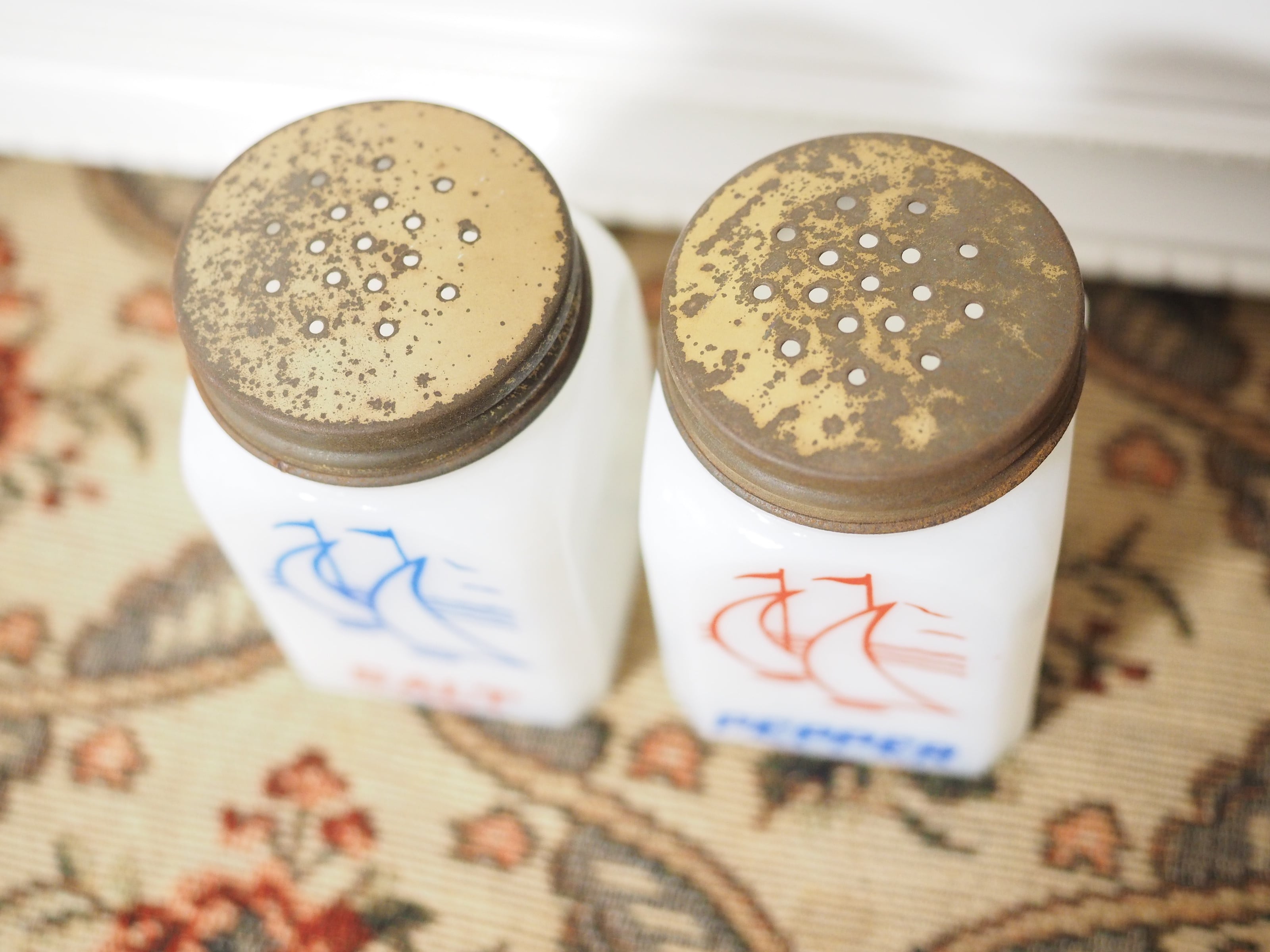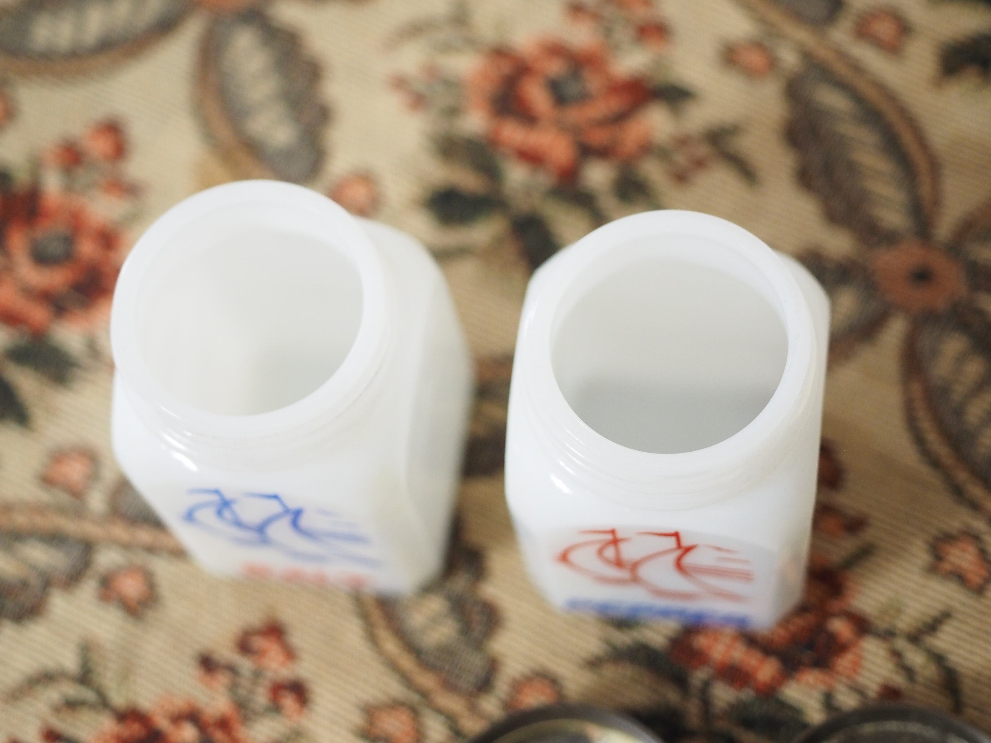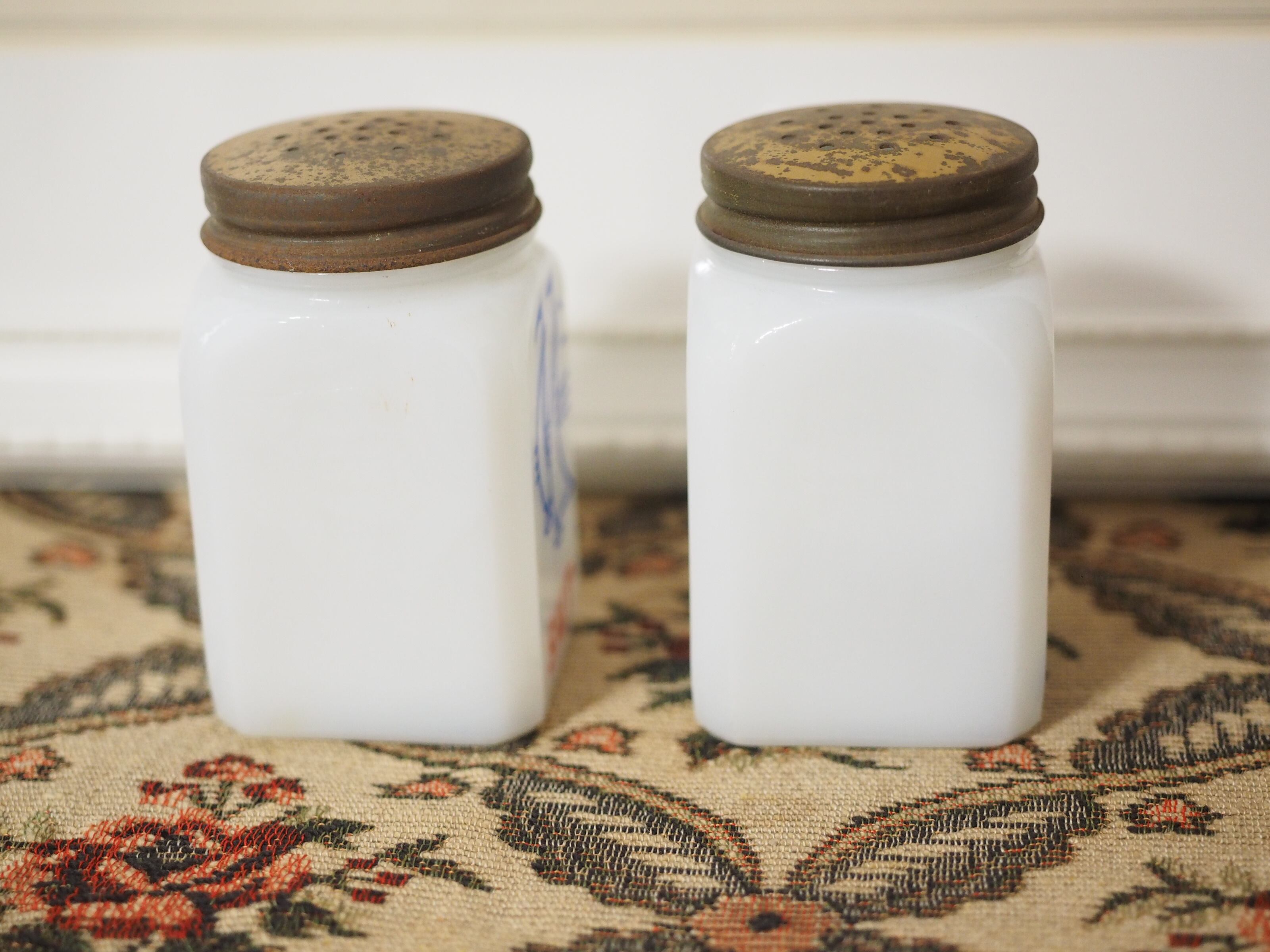 ミルクガラス(乳濁材を加えて作られたガラス)のホワイトに朱色がかったレッドとブルー、爽やかなカラーとイラスト、ソルトとペッパーのフォントもビンテージ感があっておしゃれなセットです。