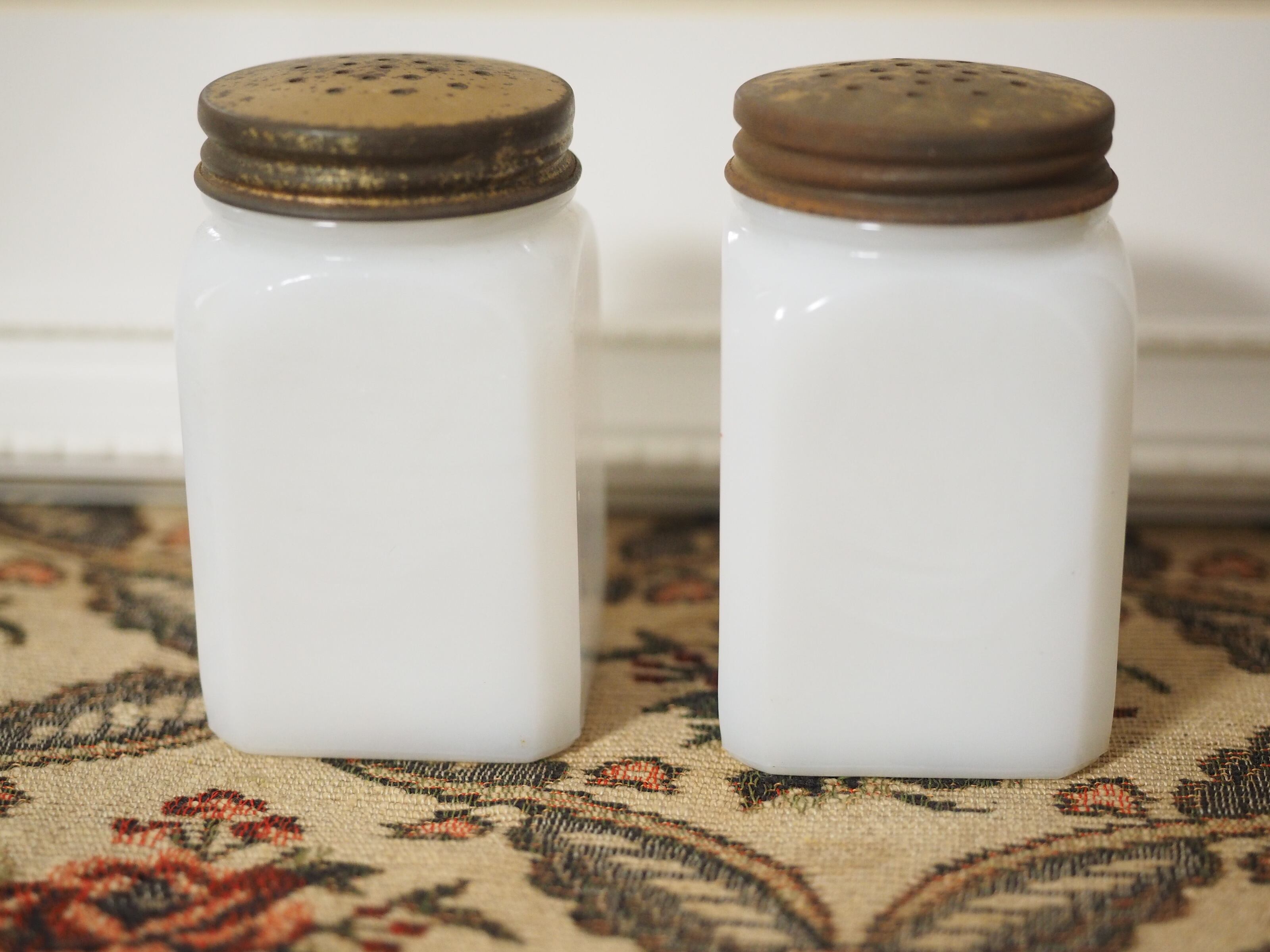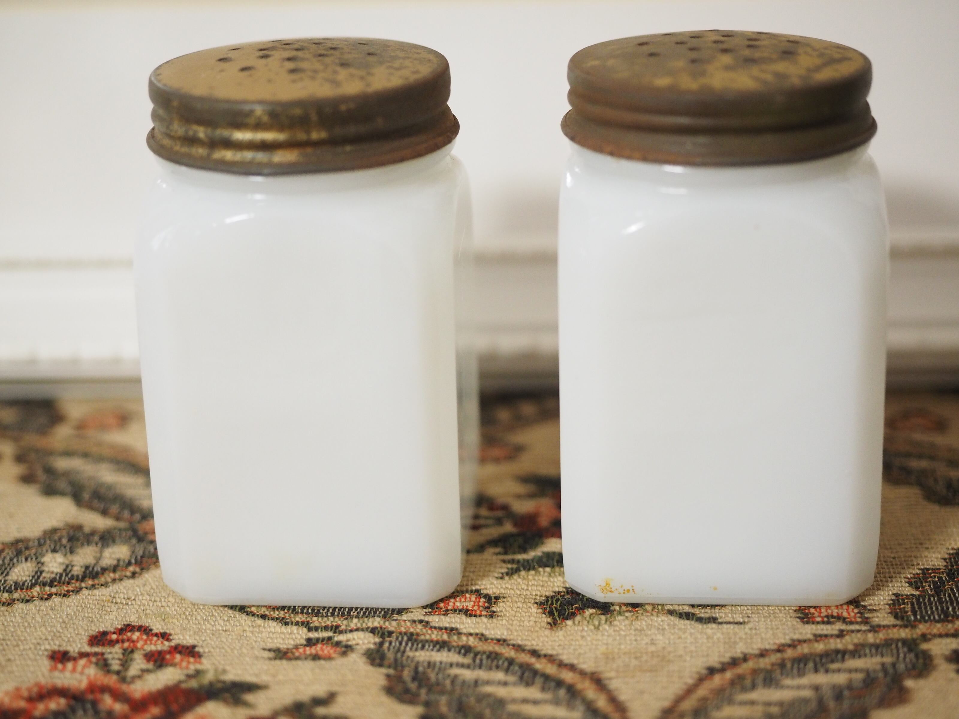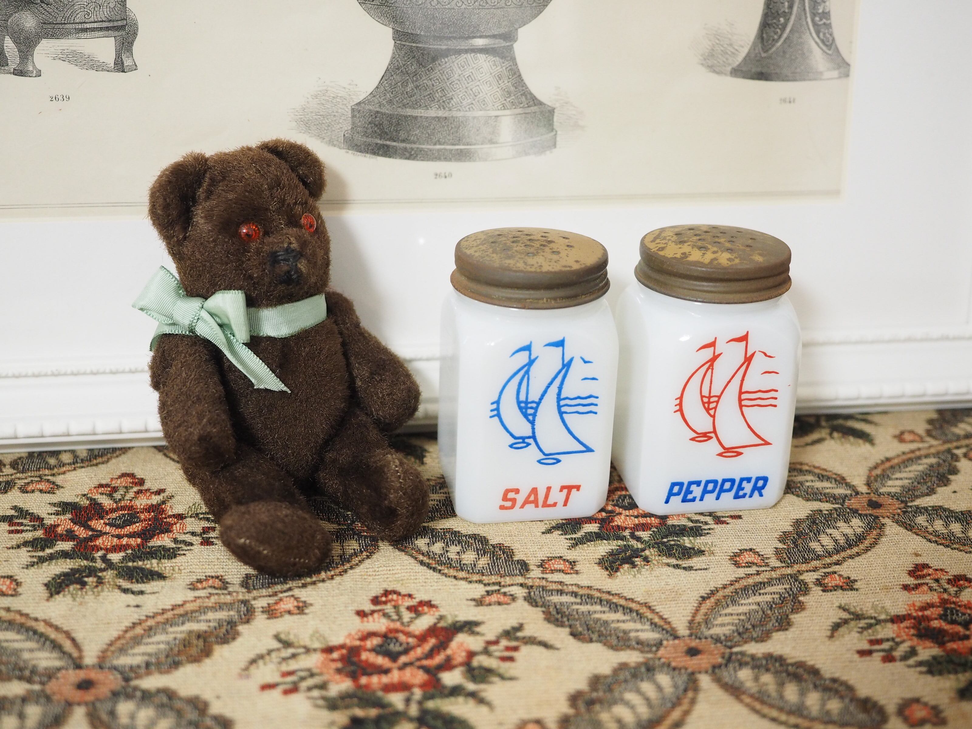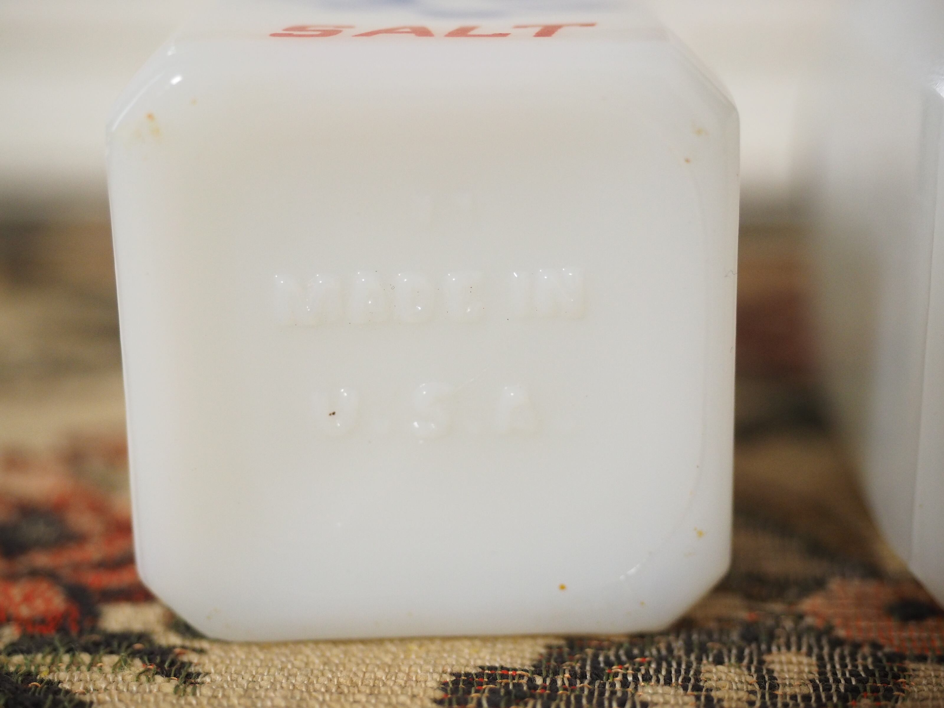 ミルクガラス(乳濁材を加えて作られたガラス)のホワイトに朱色がかったレッドとブルー、爽やかなカラーとイラスト、ソルトとペッパーのフォントもビンテージ感があっておしゃれなセットです。