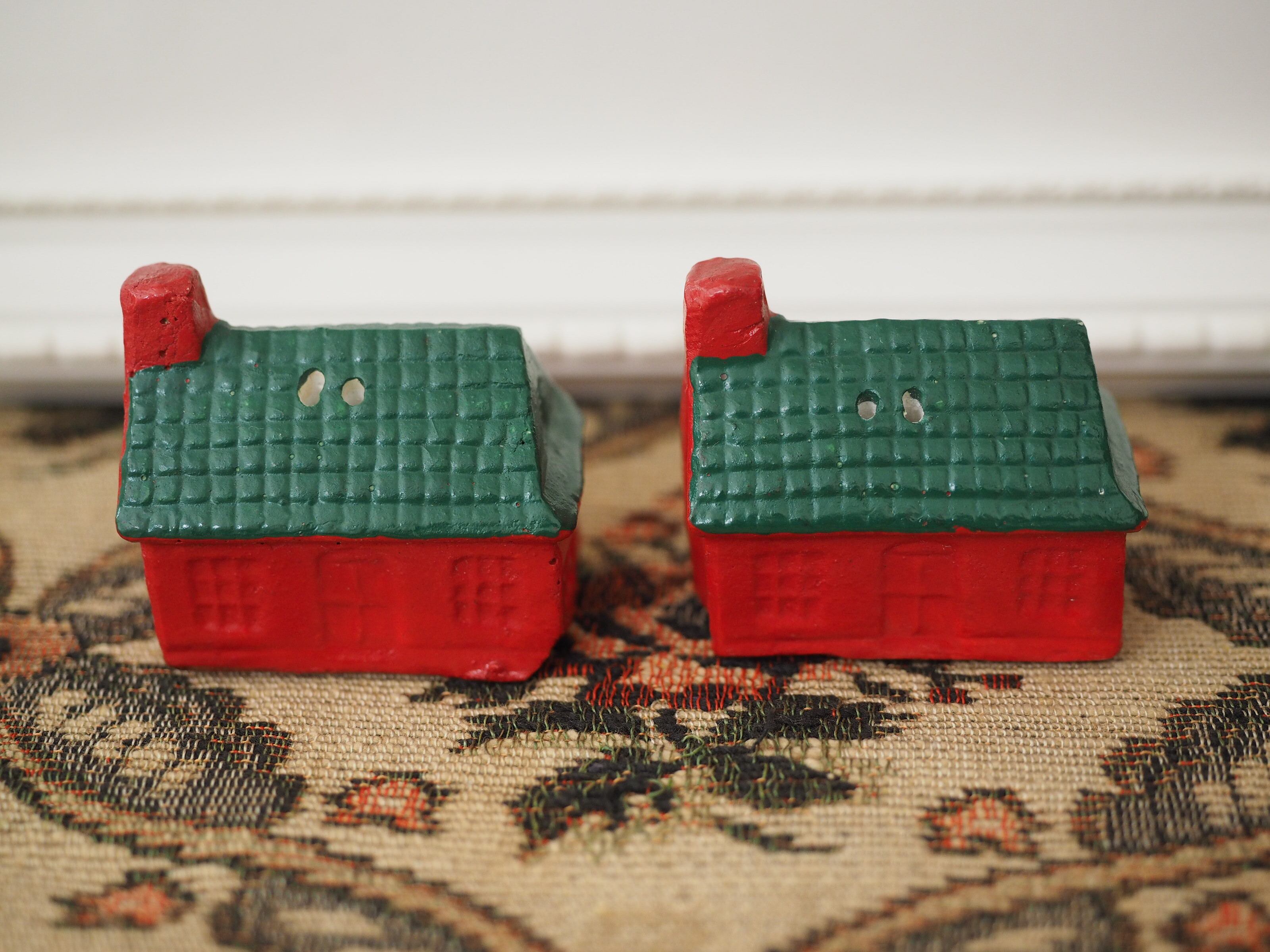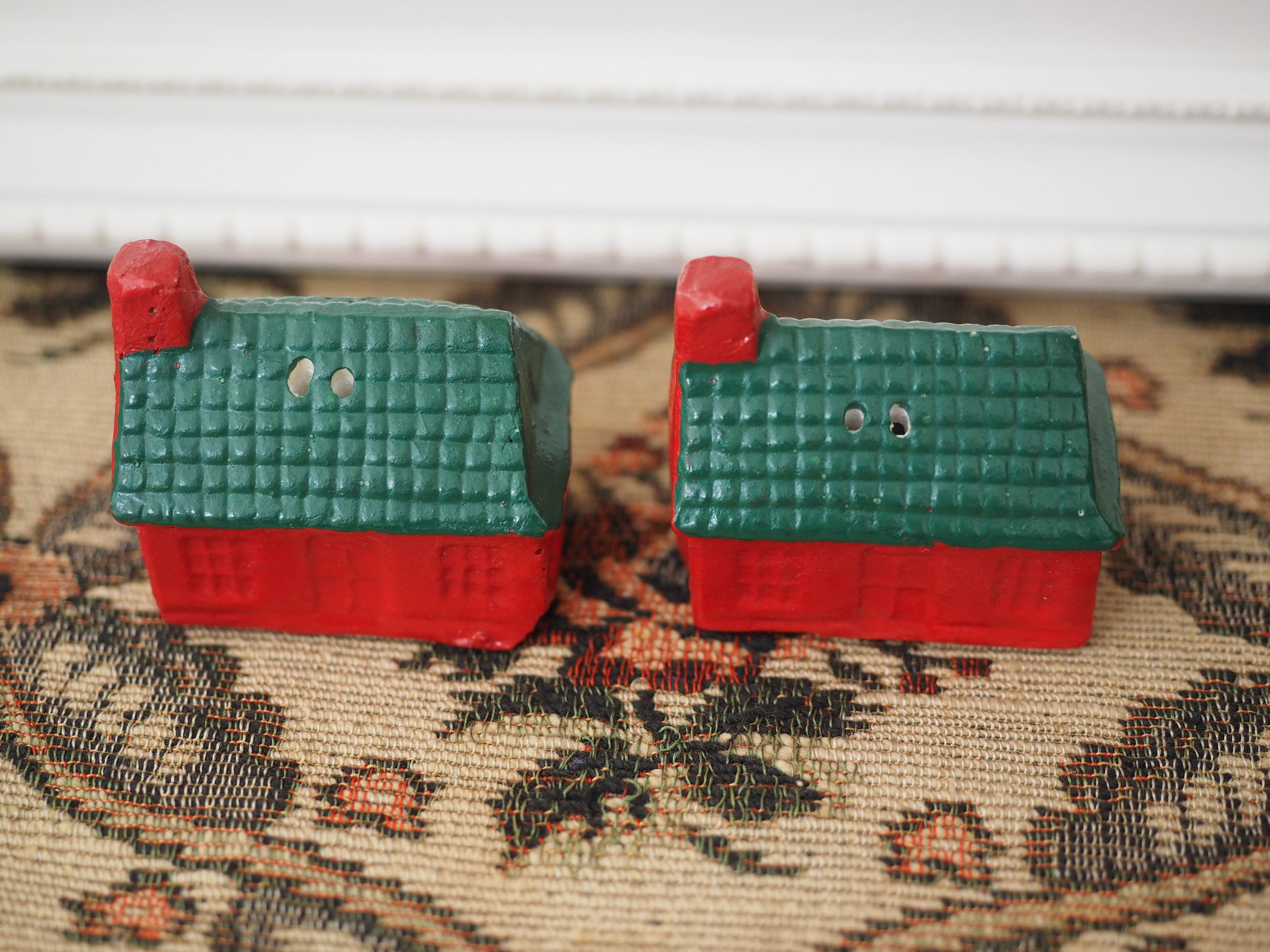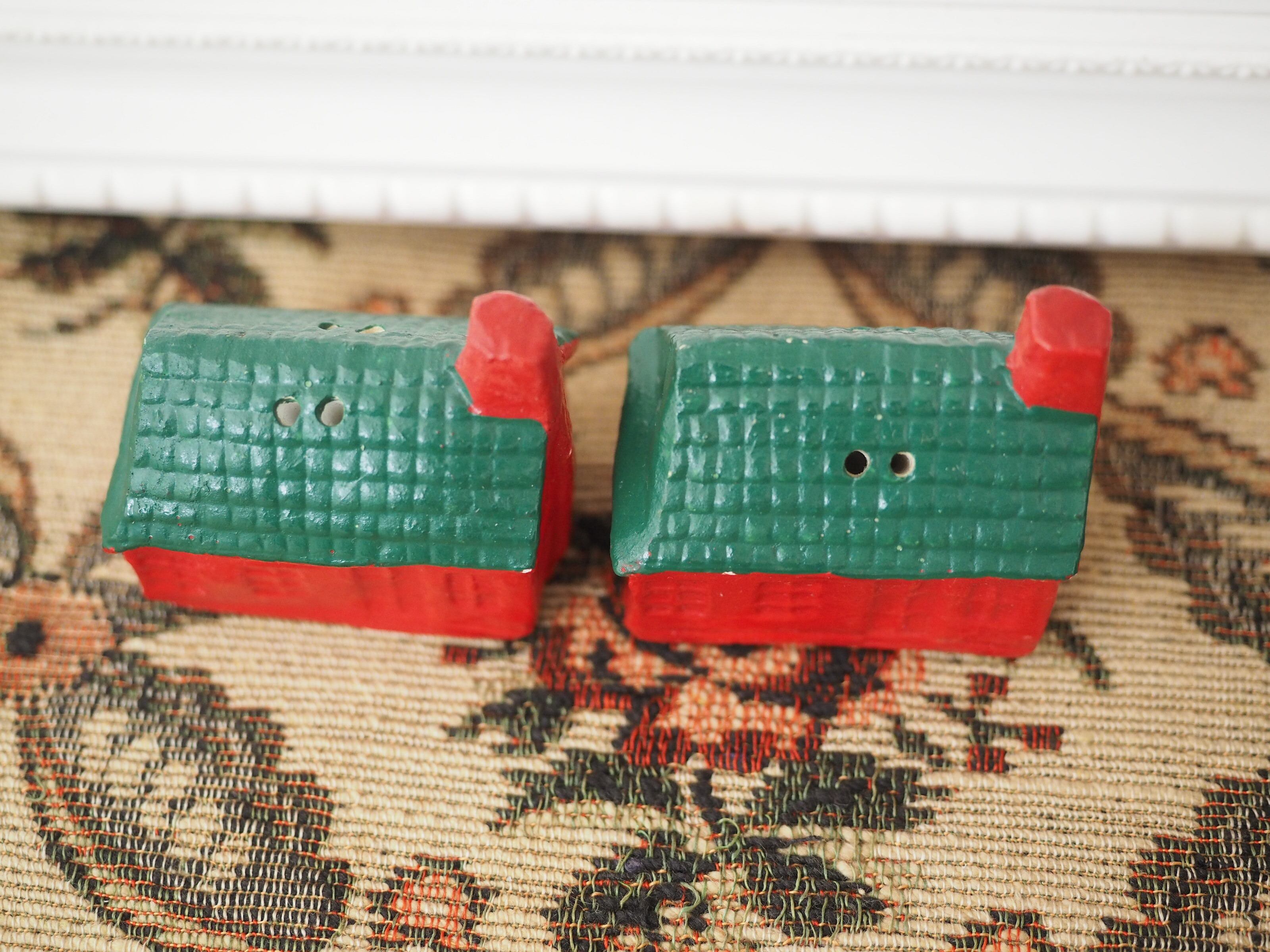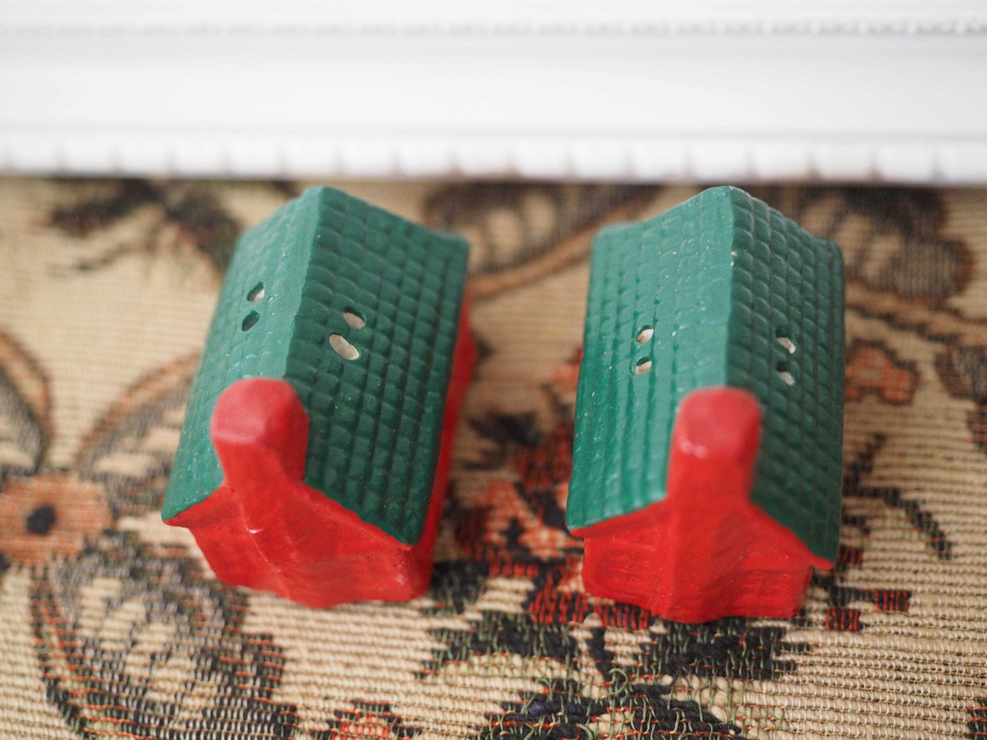 なんともかわいらしい形に、ぽってりと塗られた赤と緑の屋根が素敵なおうちのソルト&ペッパーです。