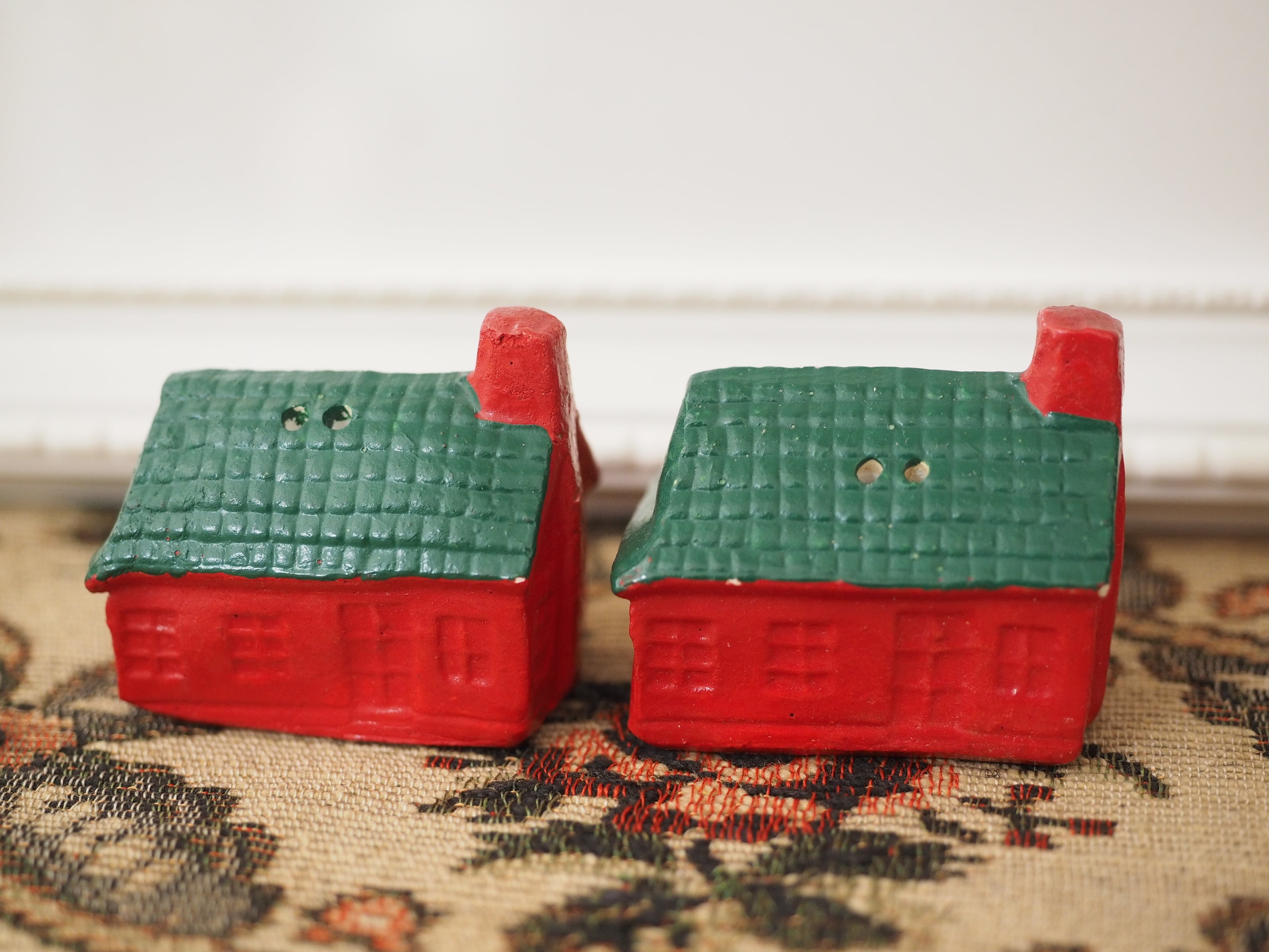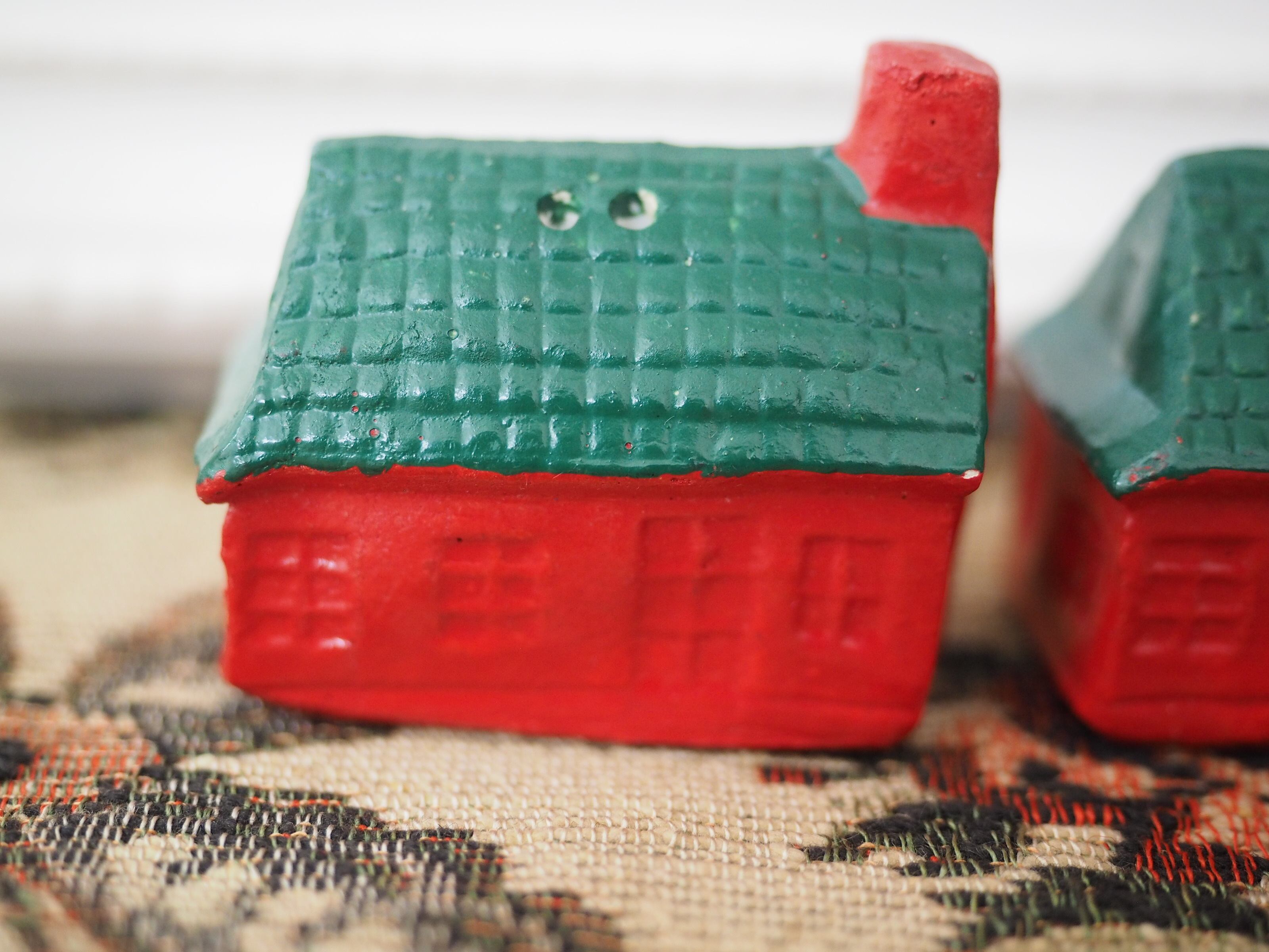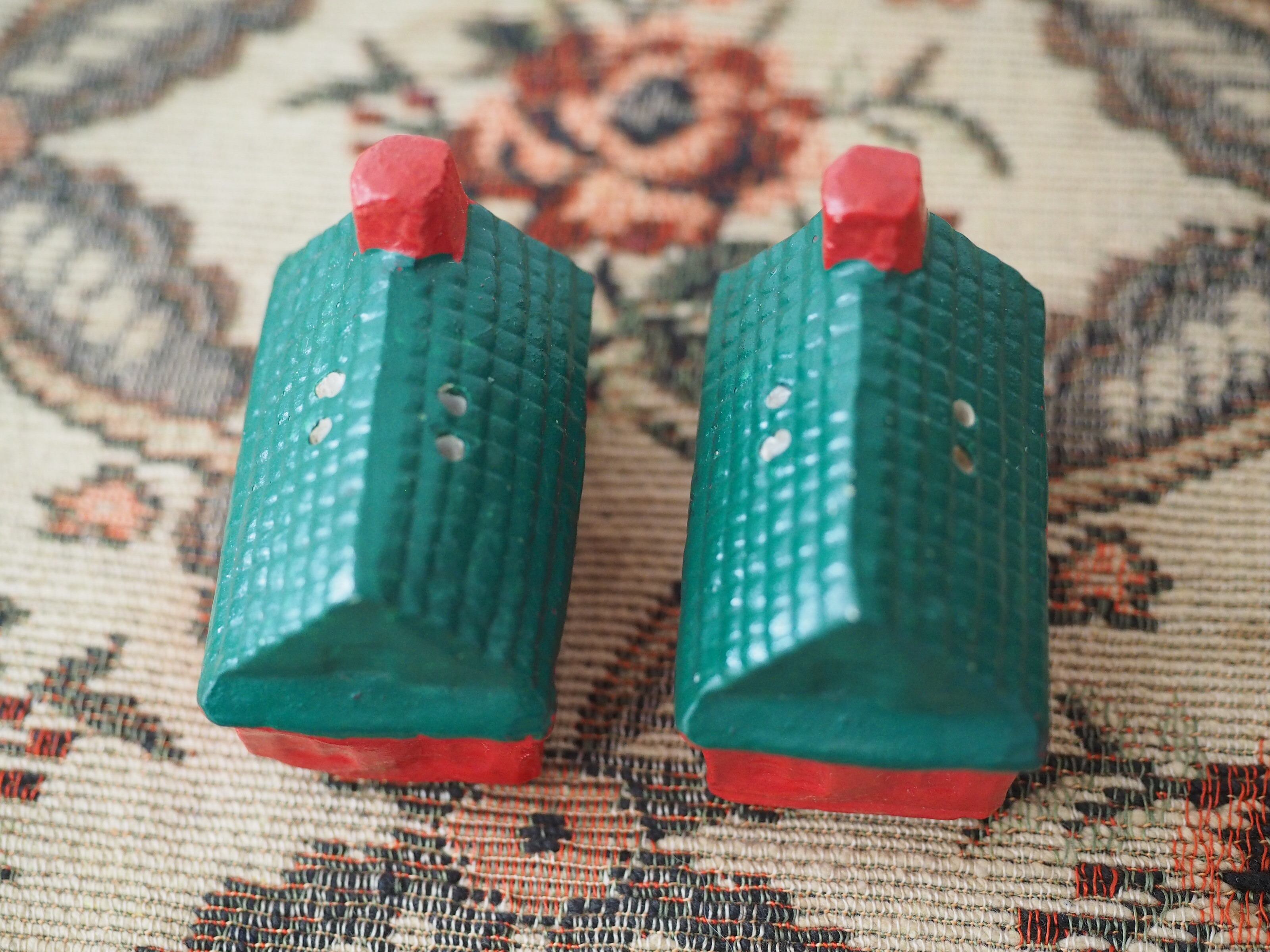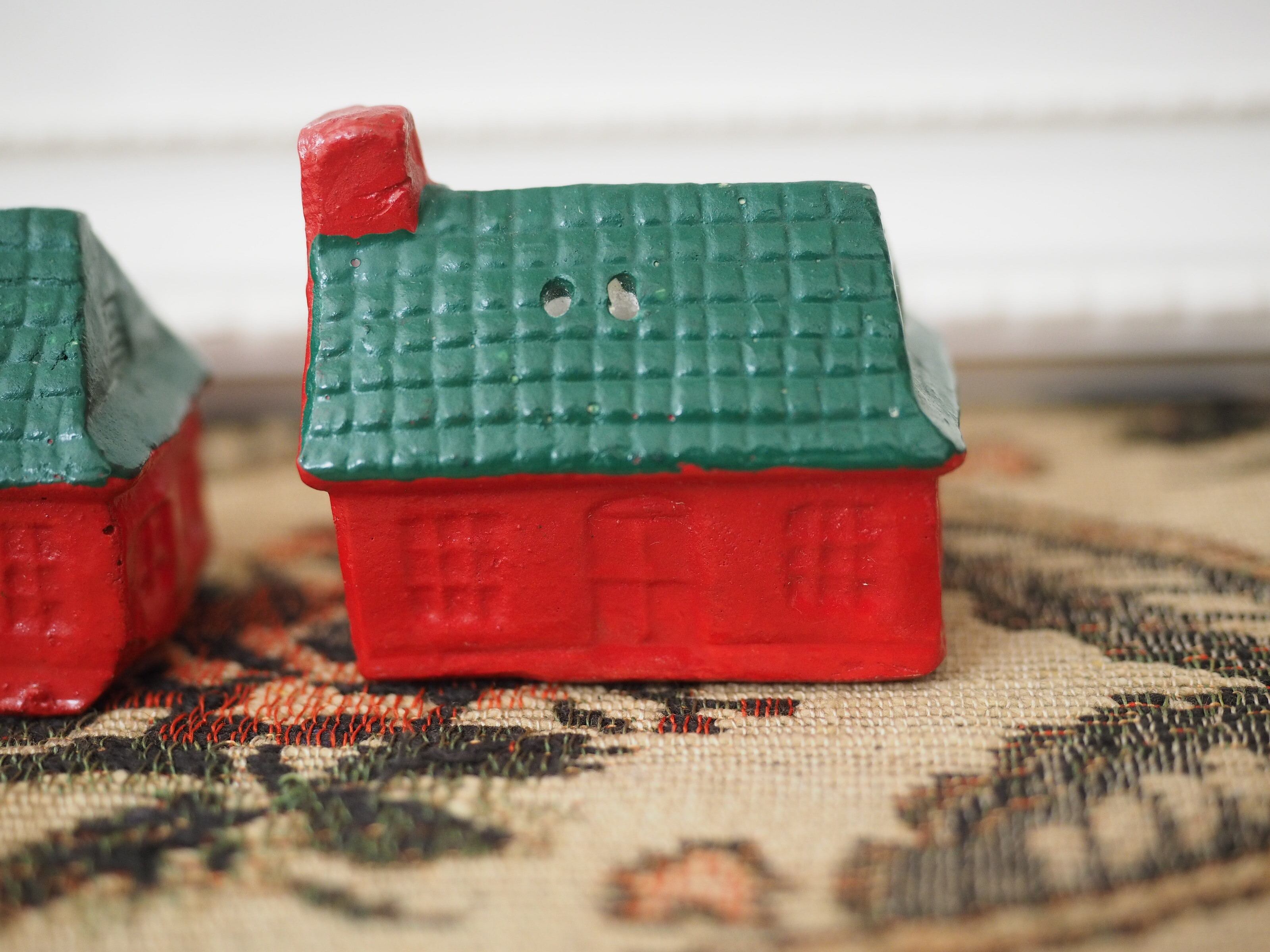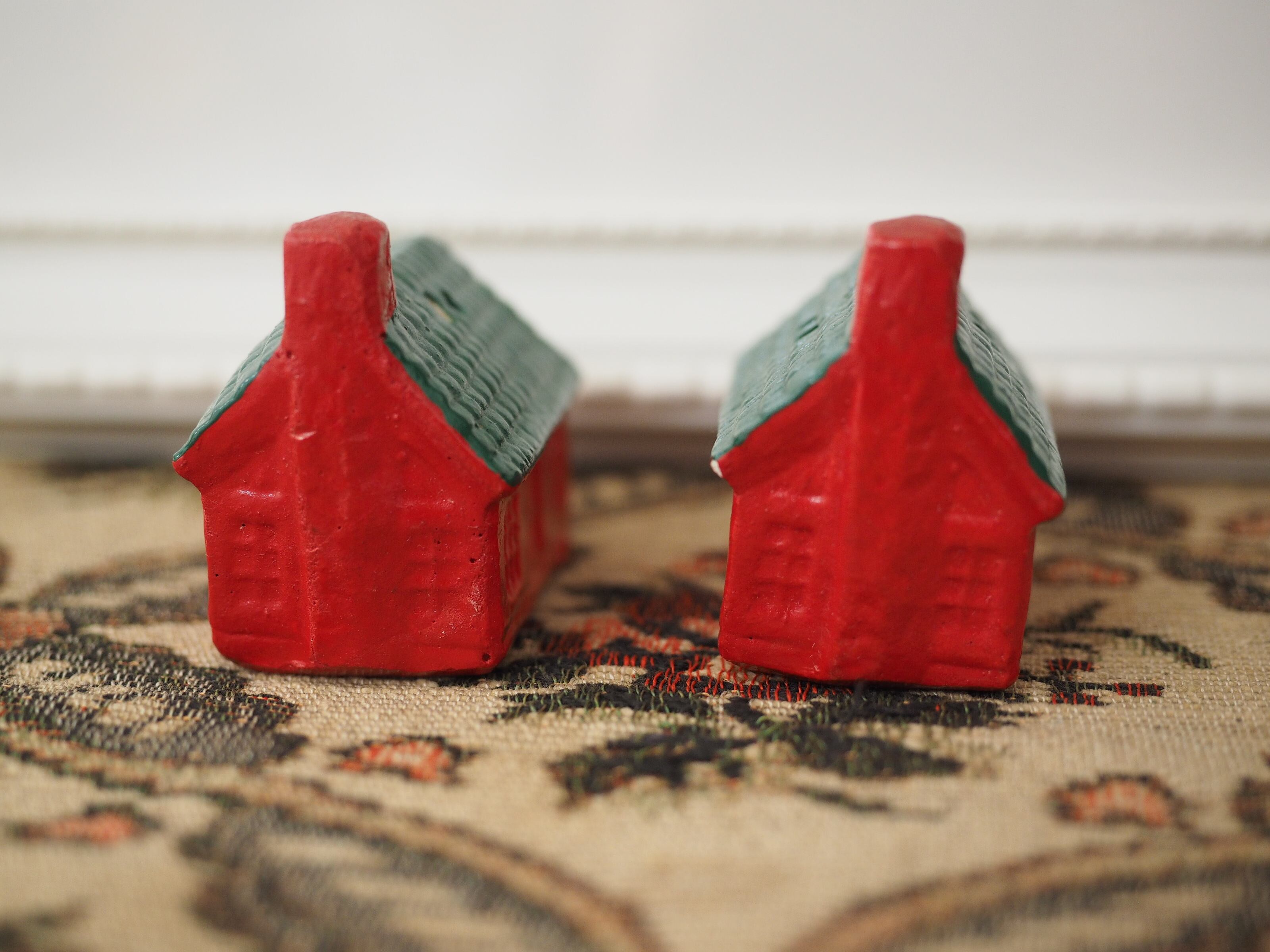 なんともかわいらしい形に、ぽってりと塗られた赤と緑の屋根が素敵なおうちのソルト&ペッパーです。