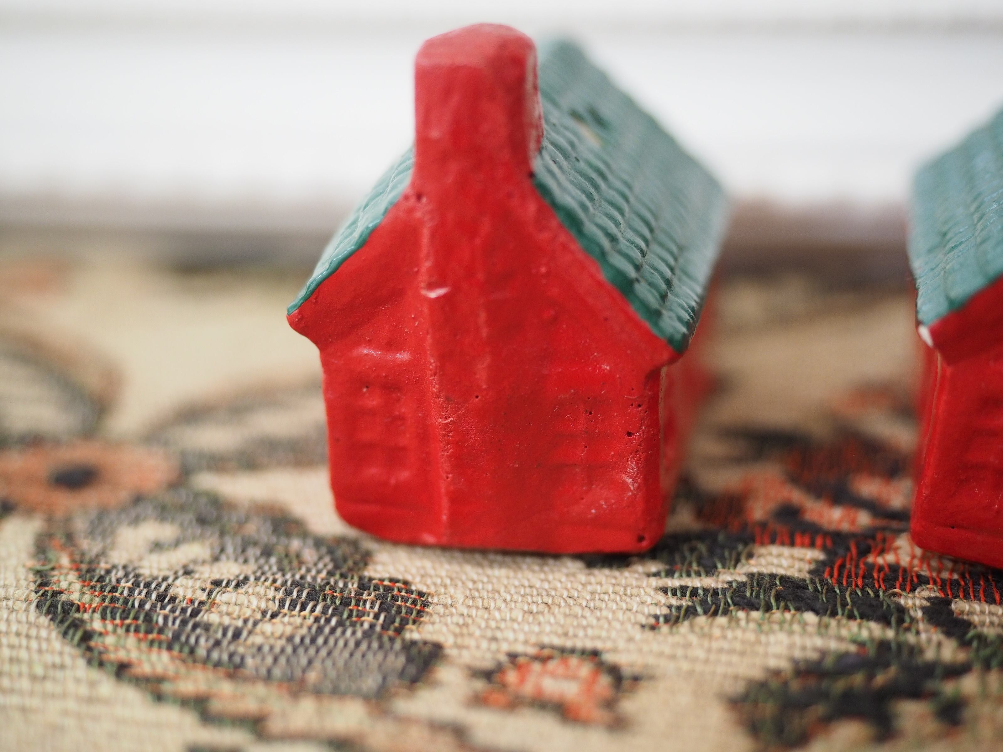 屋根の角に欠けがあり、ペイントが剥げて白い地が出ている部分がございます。表面に素材上の小さな穴あり。