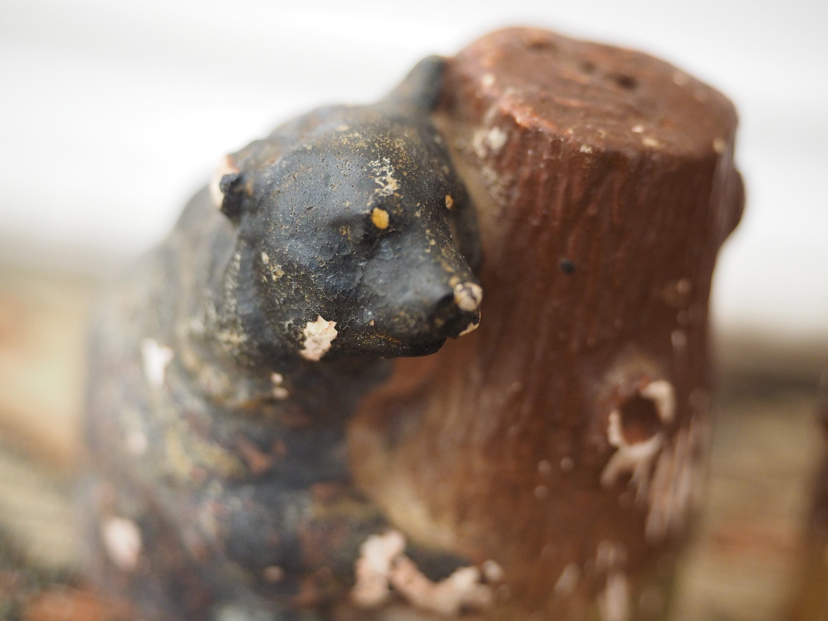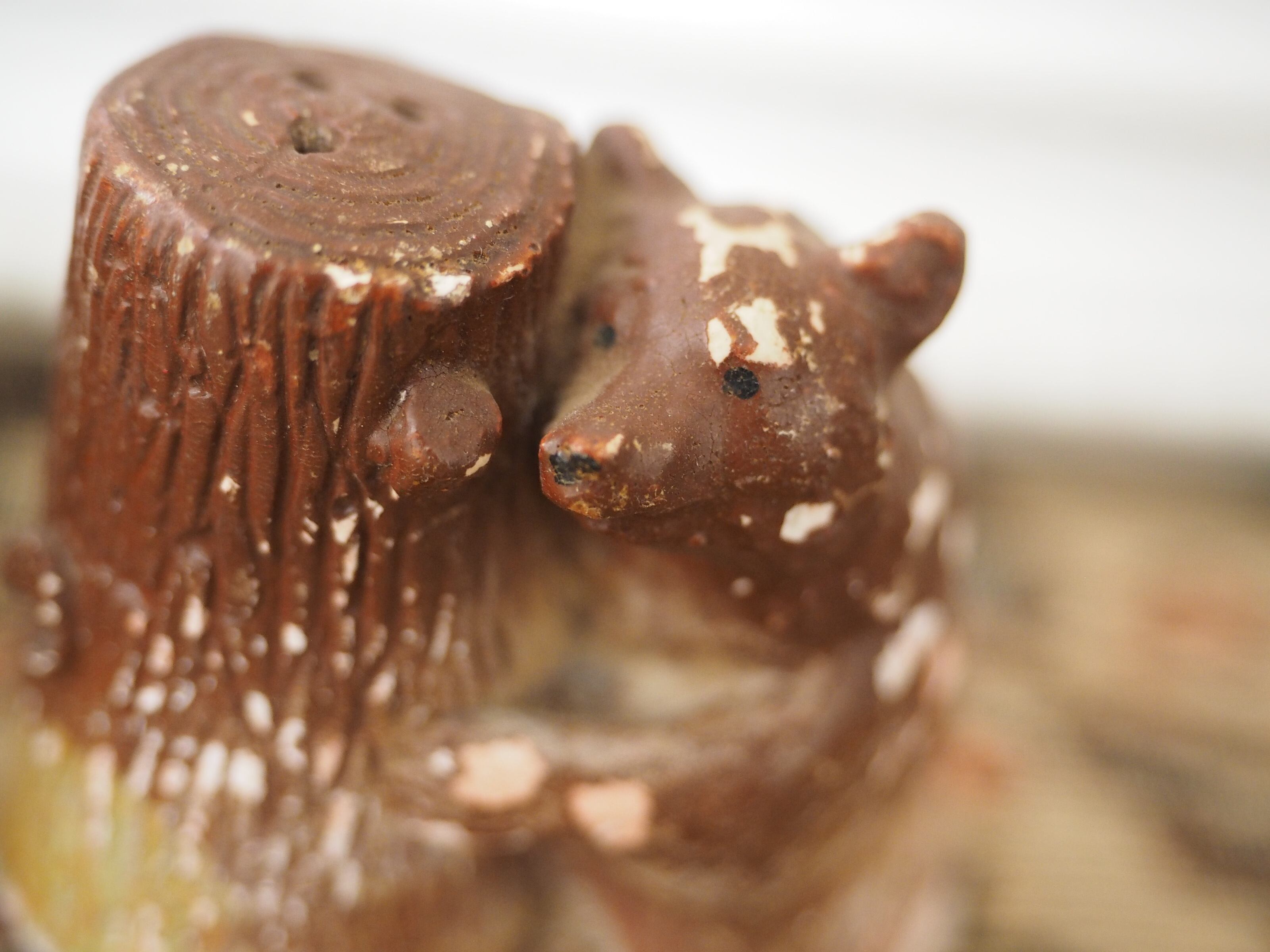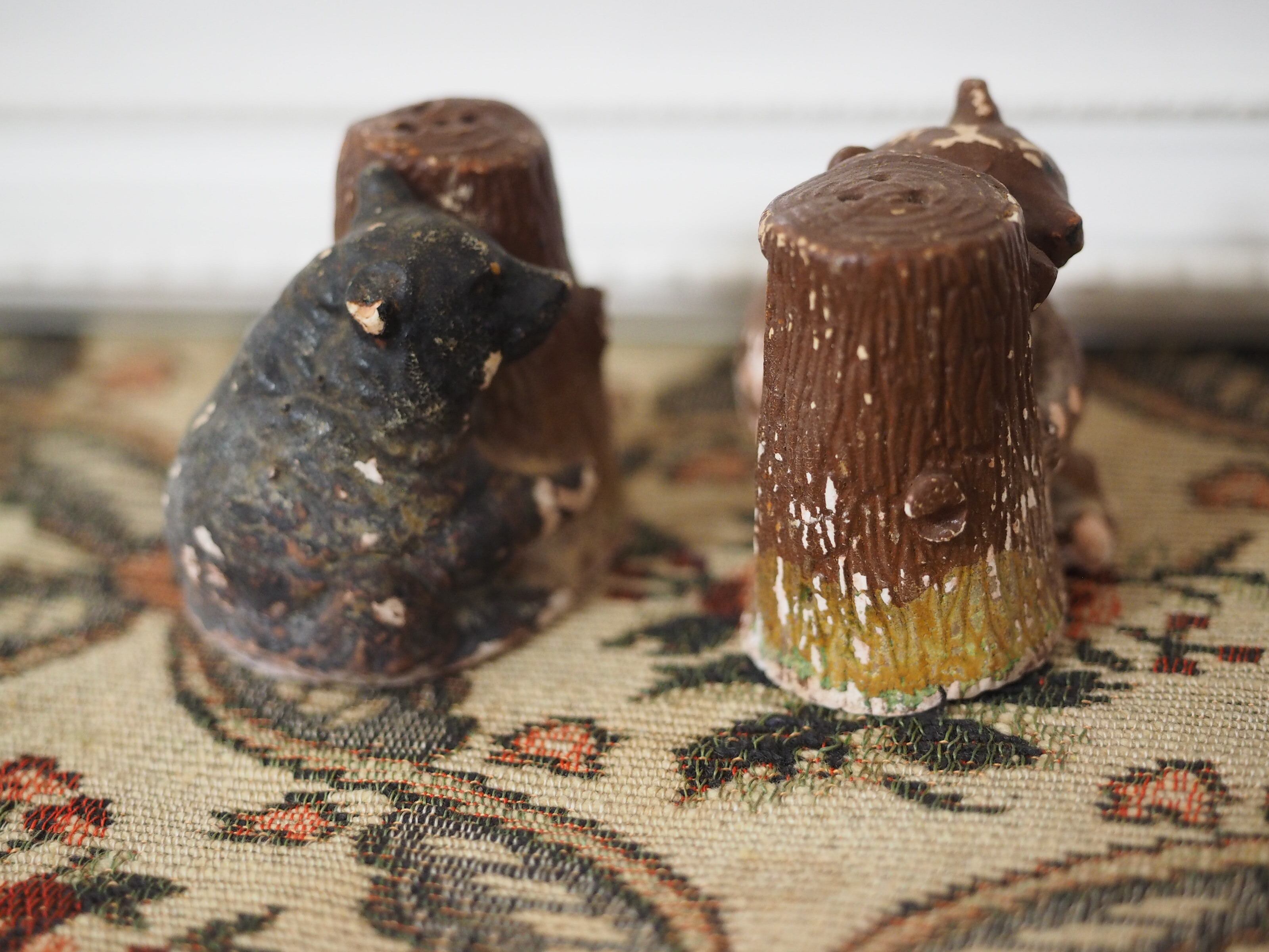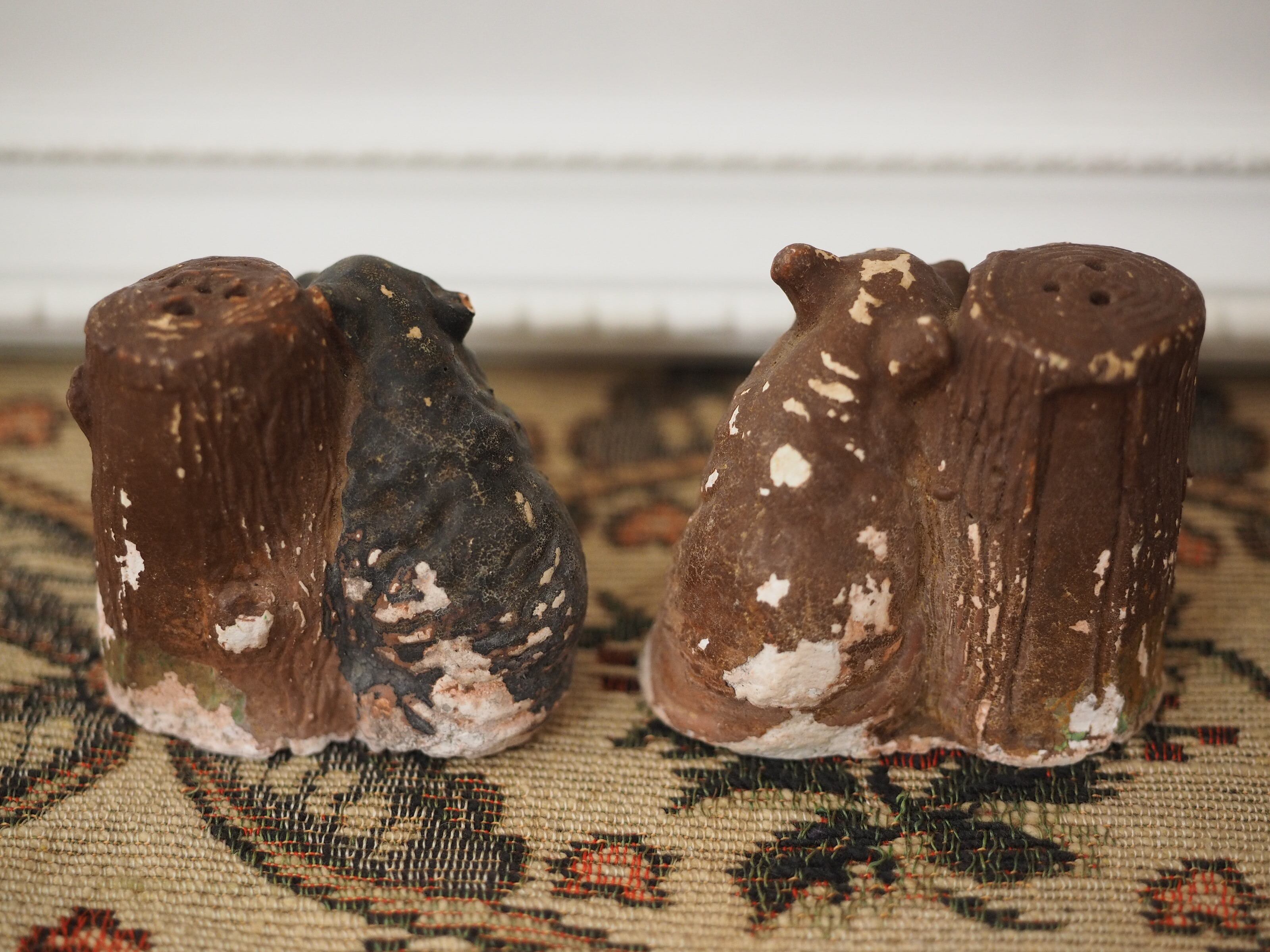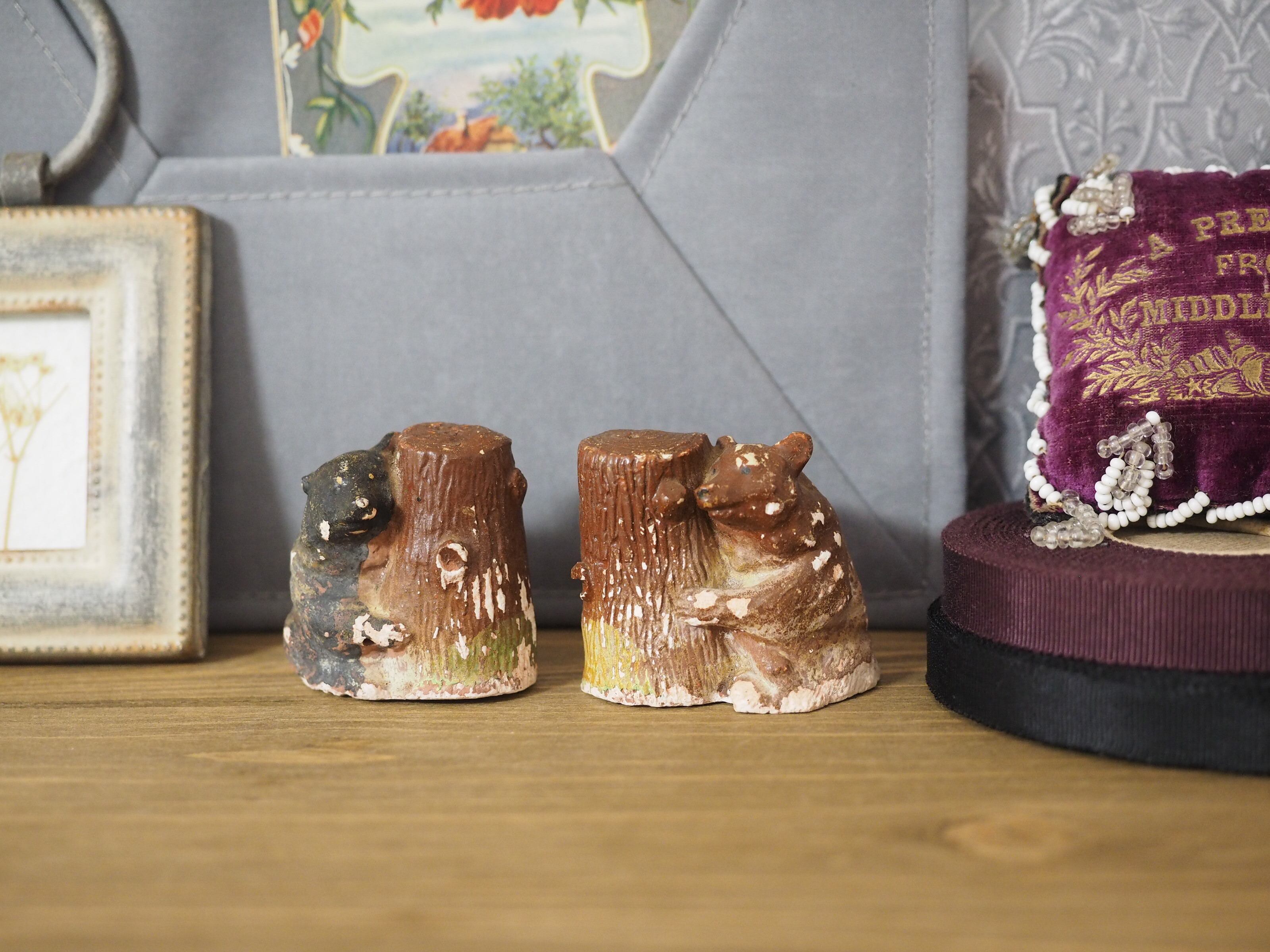切り株に抱きつく様子のくまさんペア、ビンテージソルト&ペッパー