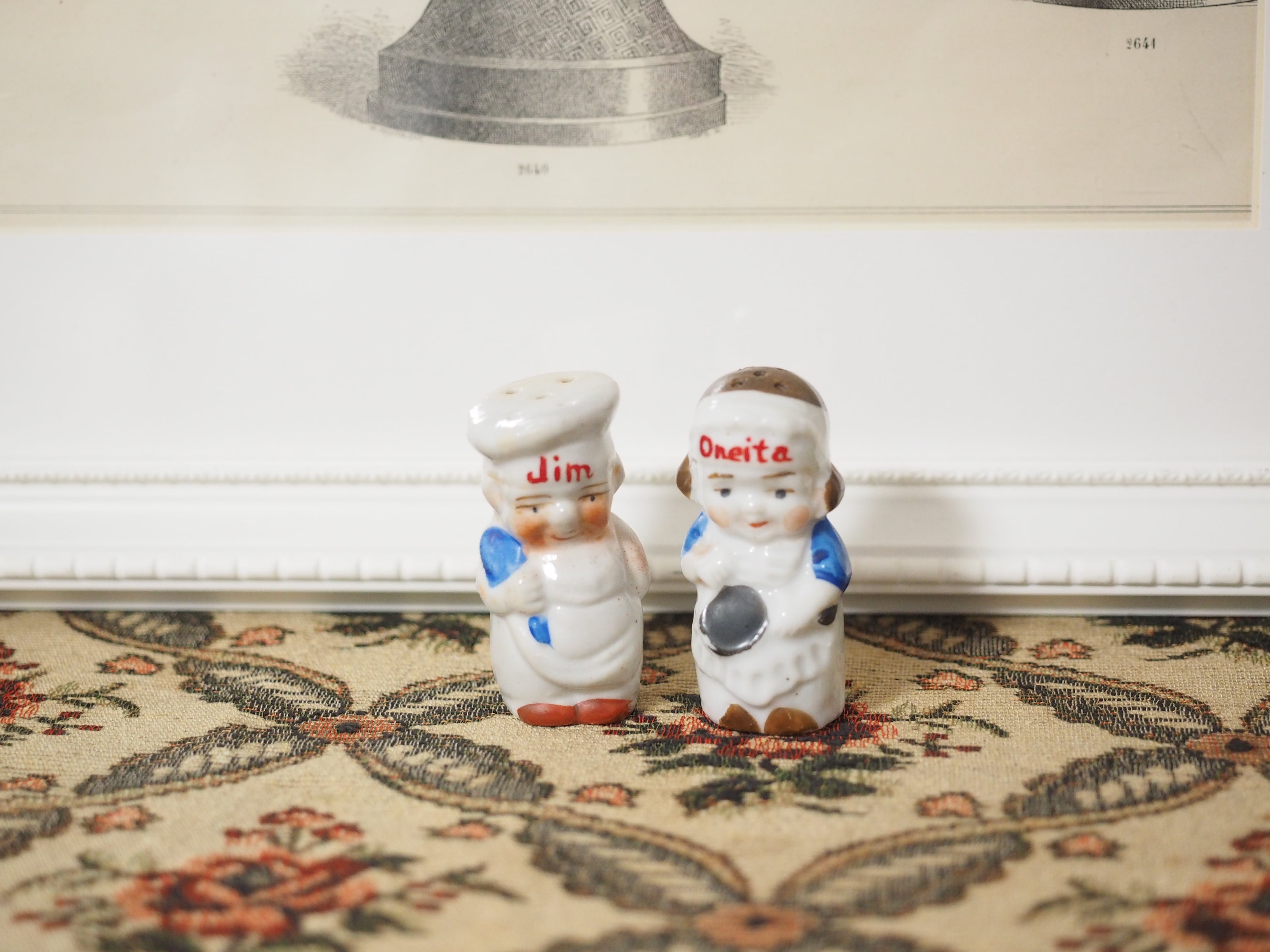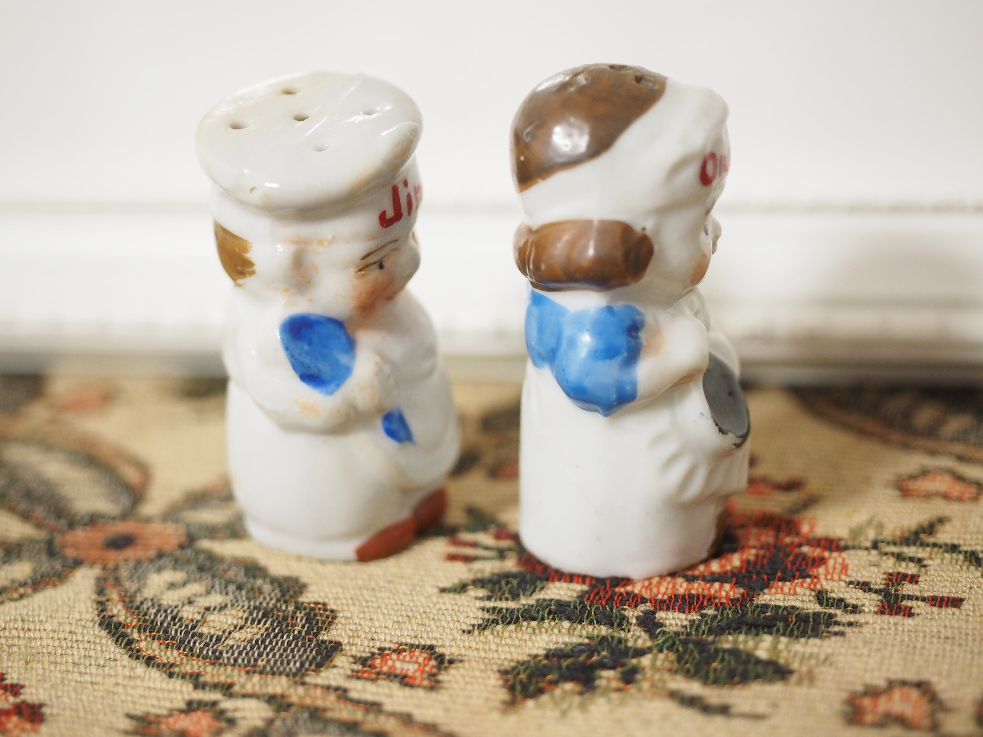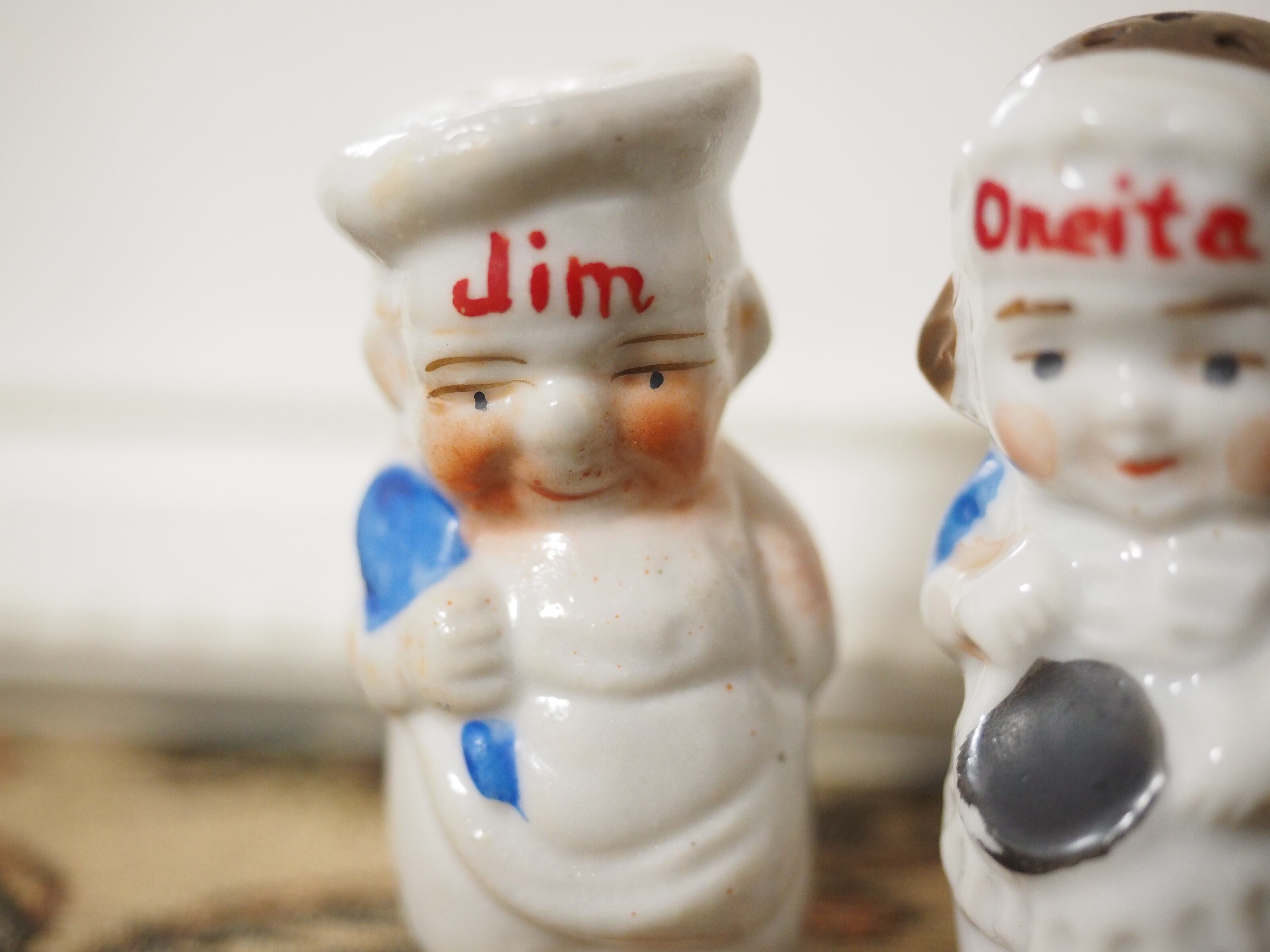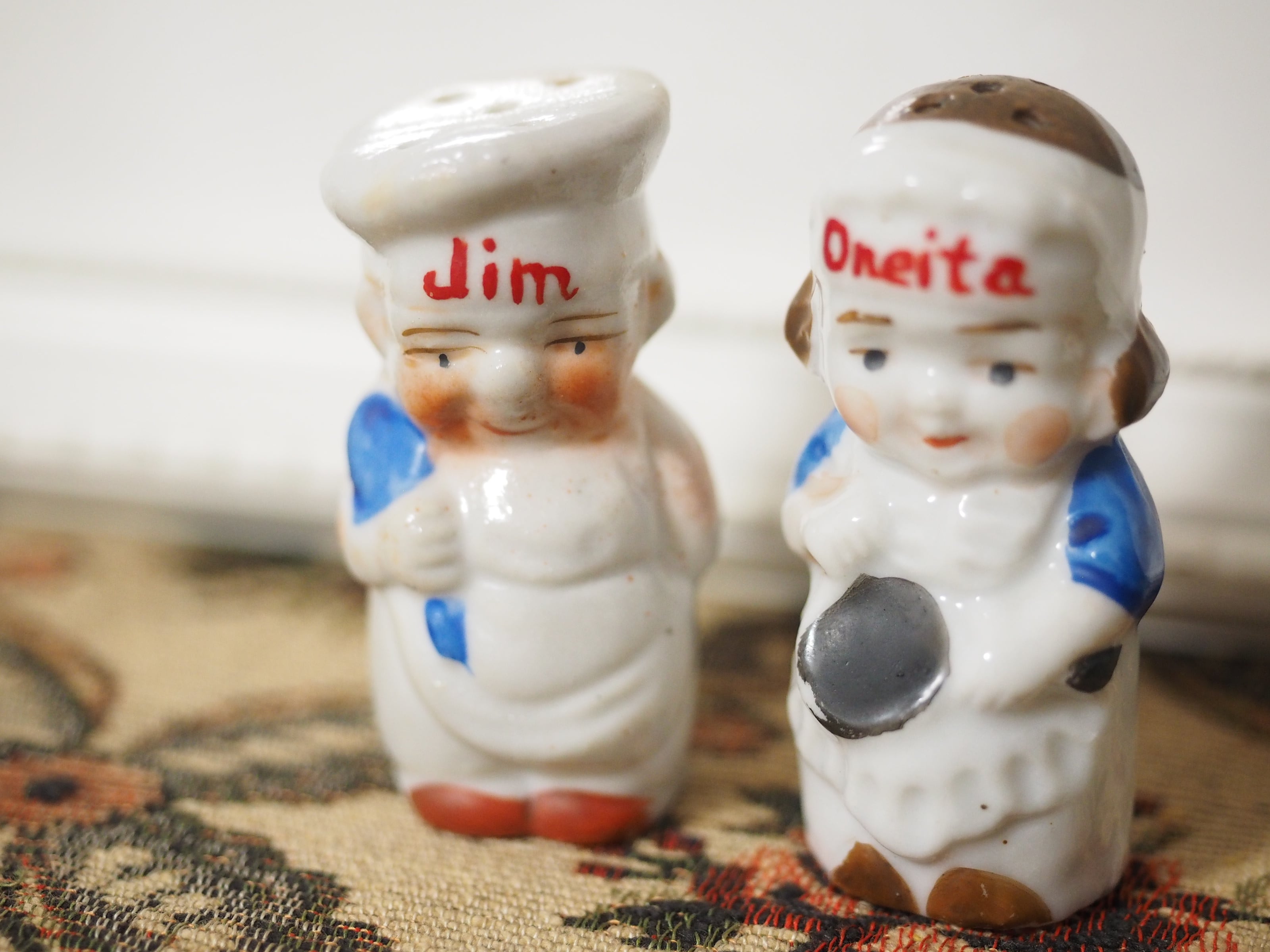 エプロン姿のJimとOneita、かわいらしいソルト&ペッパー