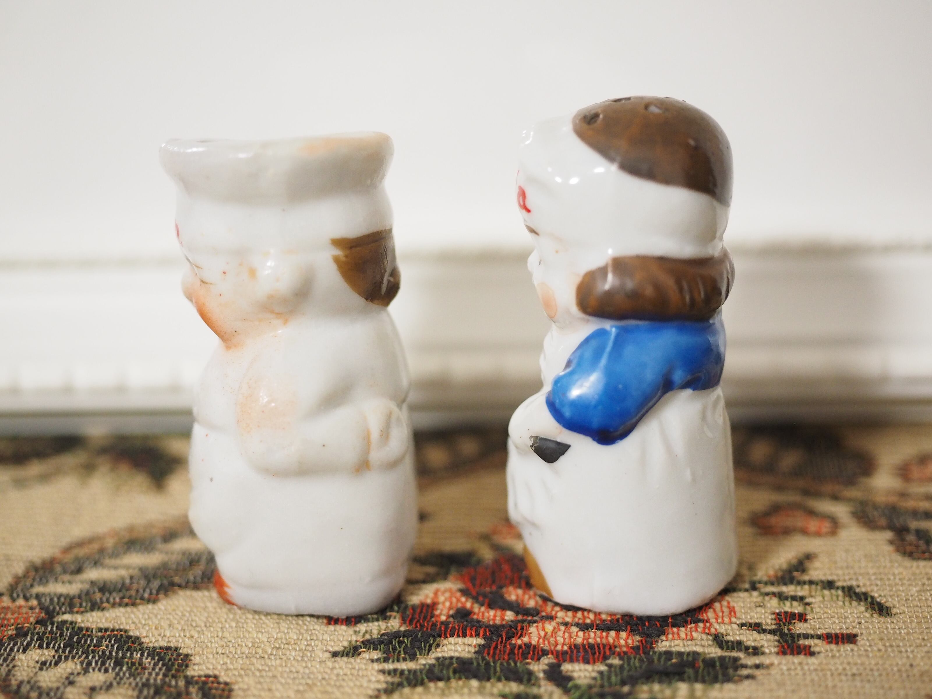 白いエプロンと帽子、赤い文字がキュートなペアの陶器製ソルト&ペッパーです。