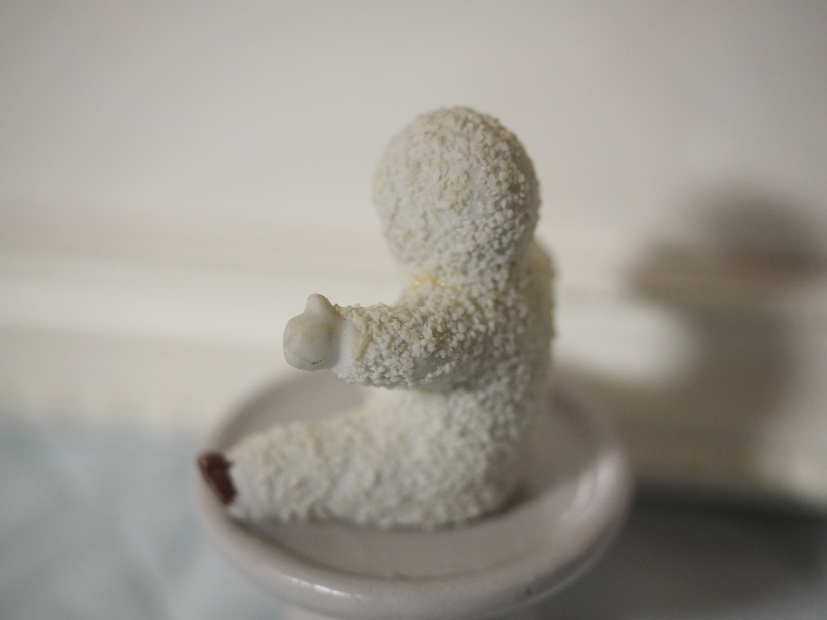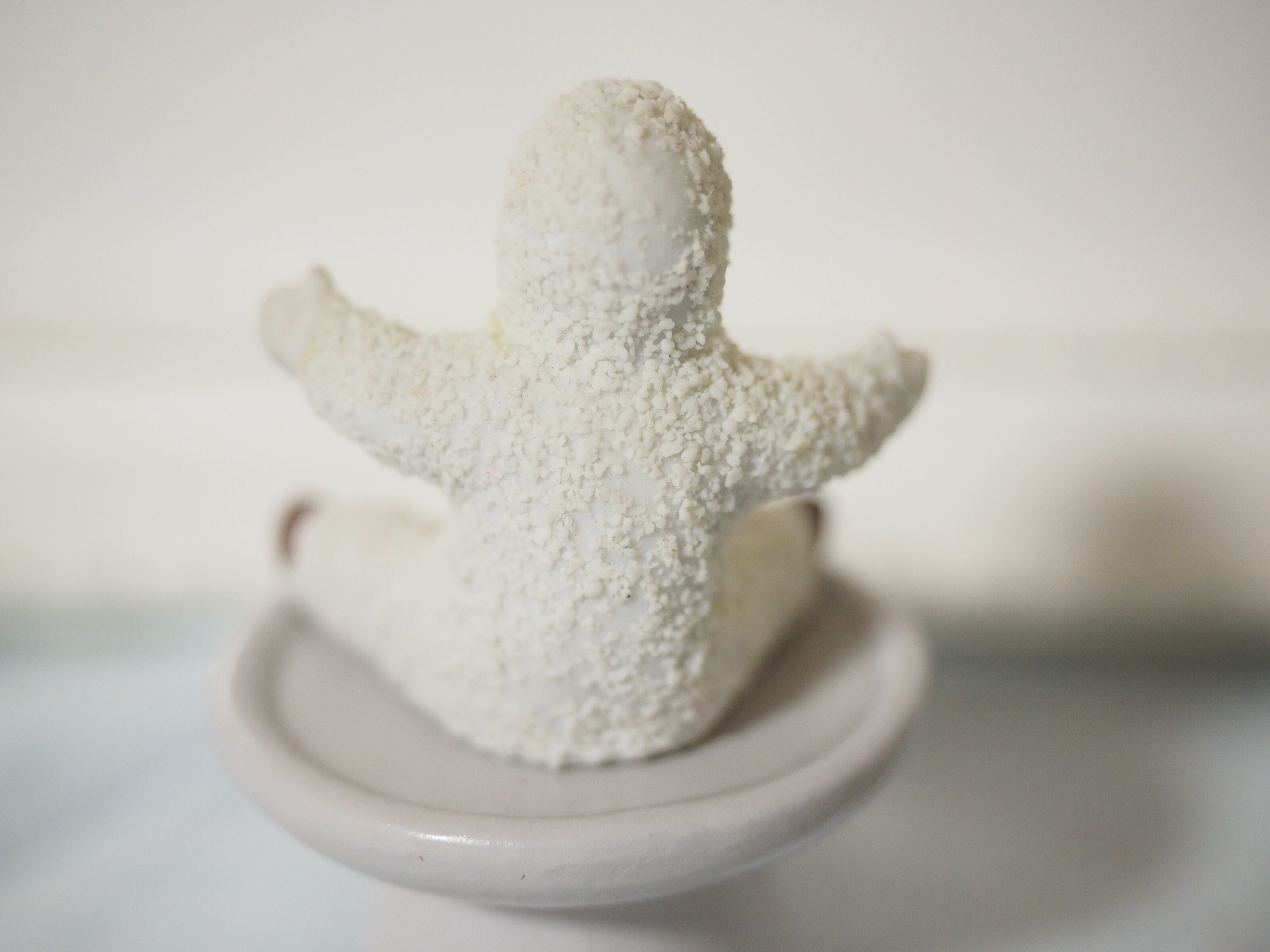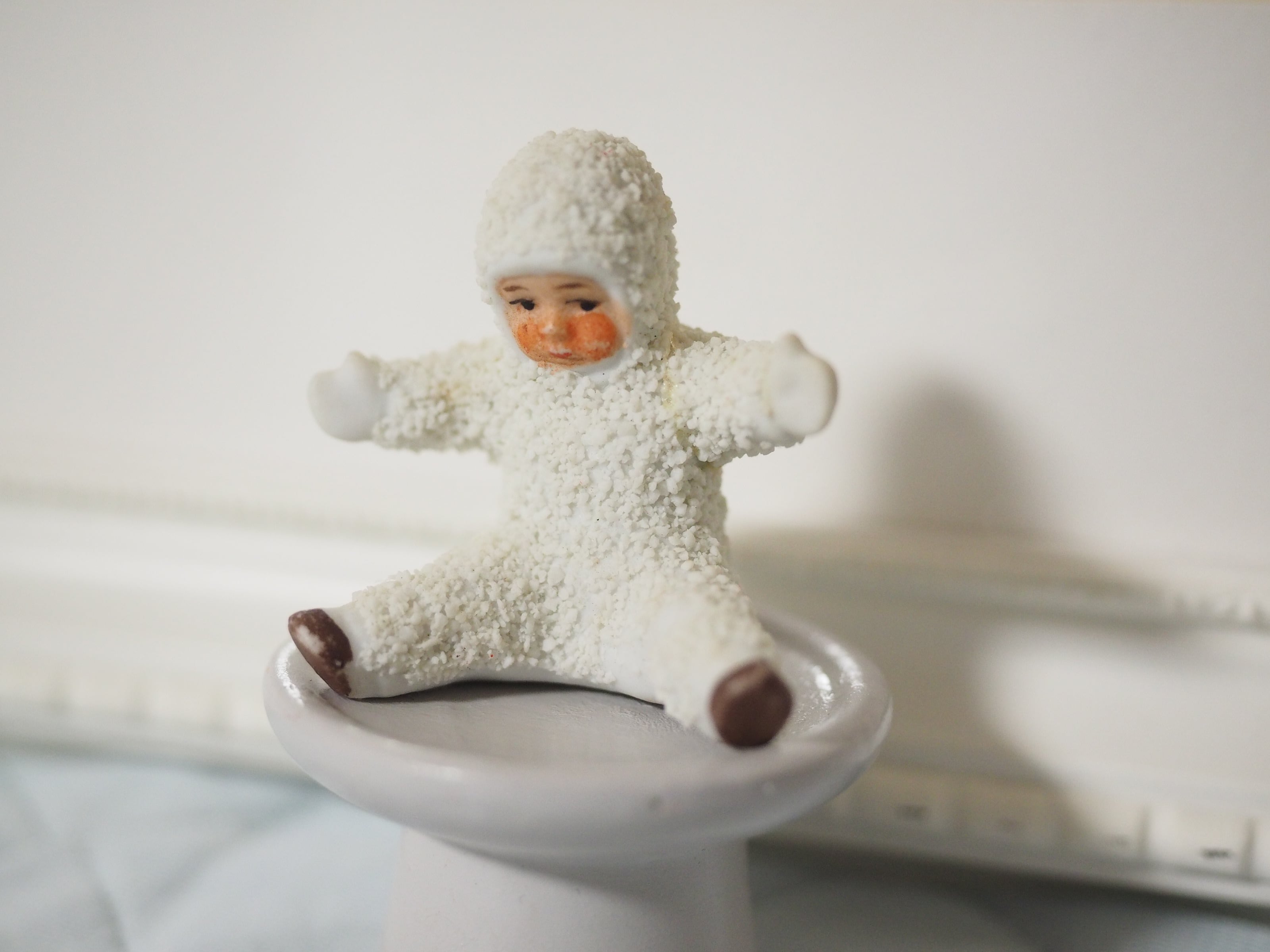 砂糖菓子のような細かなつぶつぶの感触、雪の中で座っているような姿のスノーベビーです。