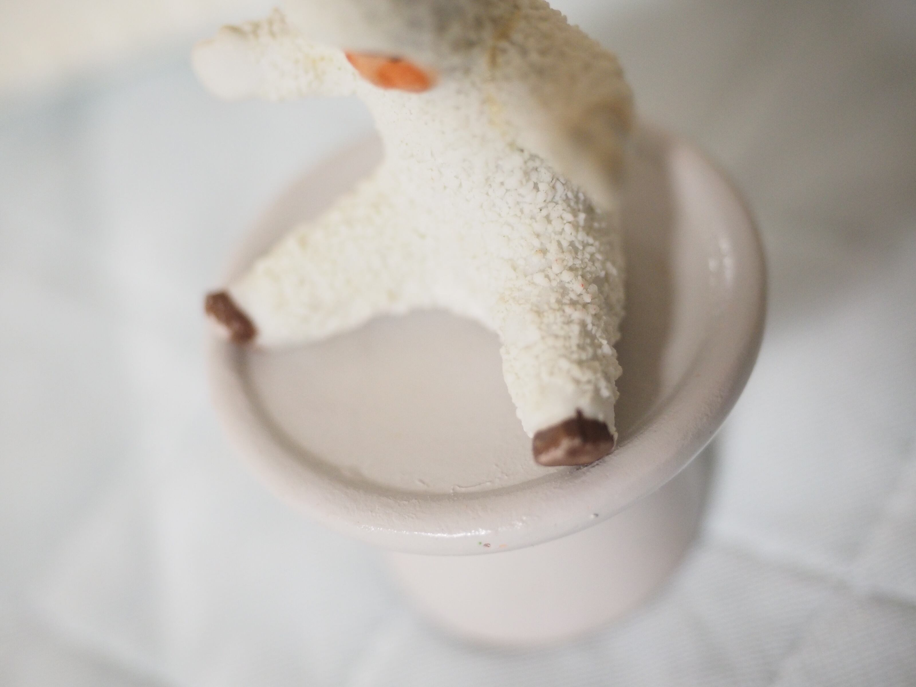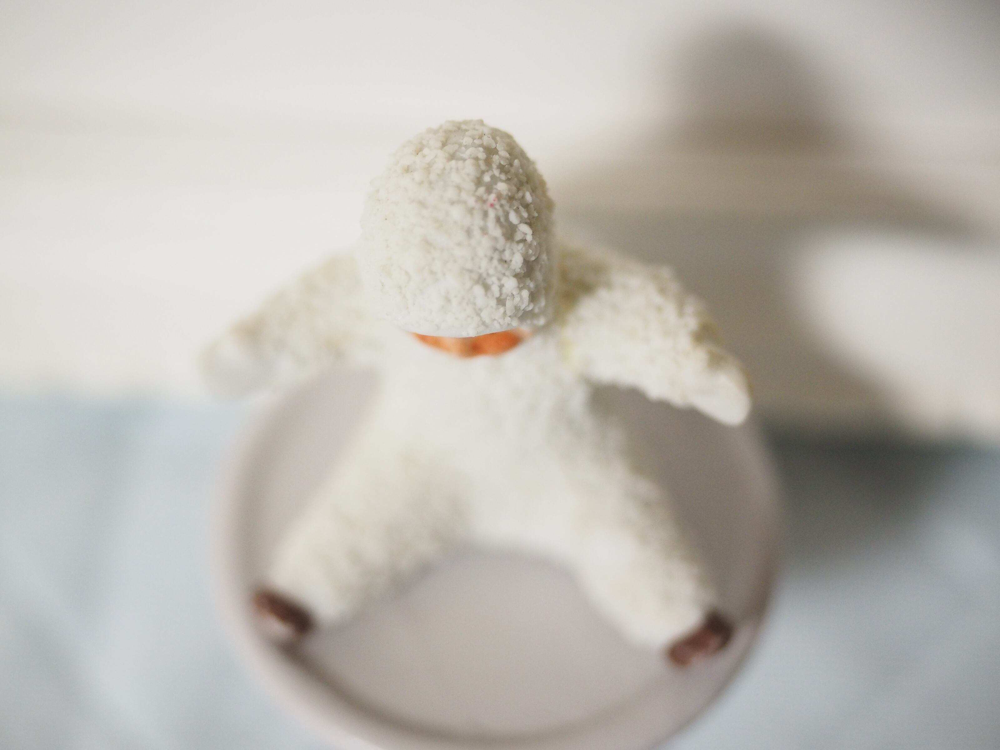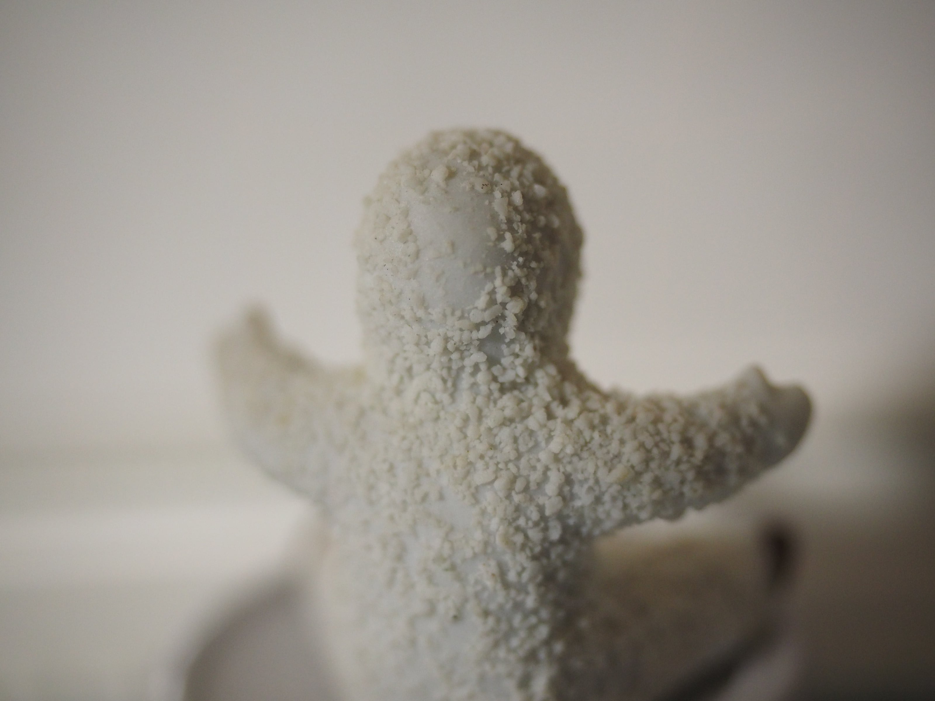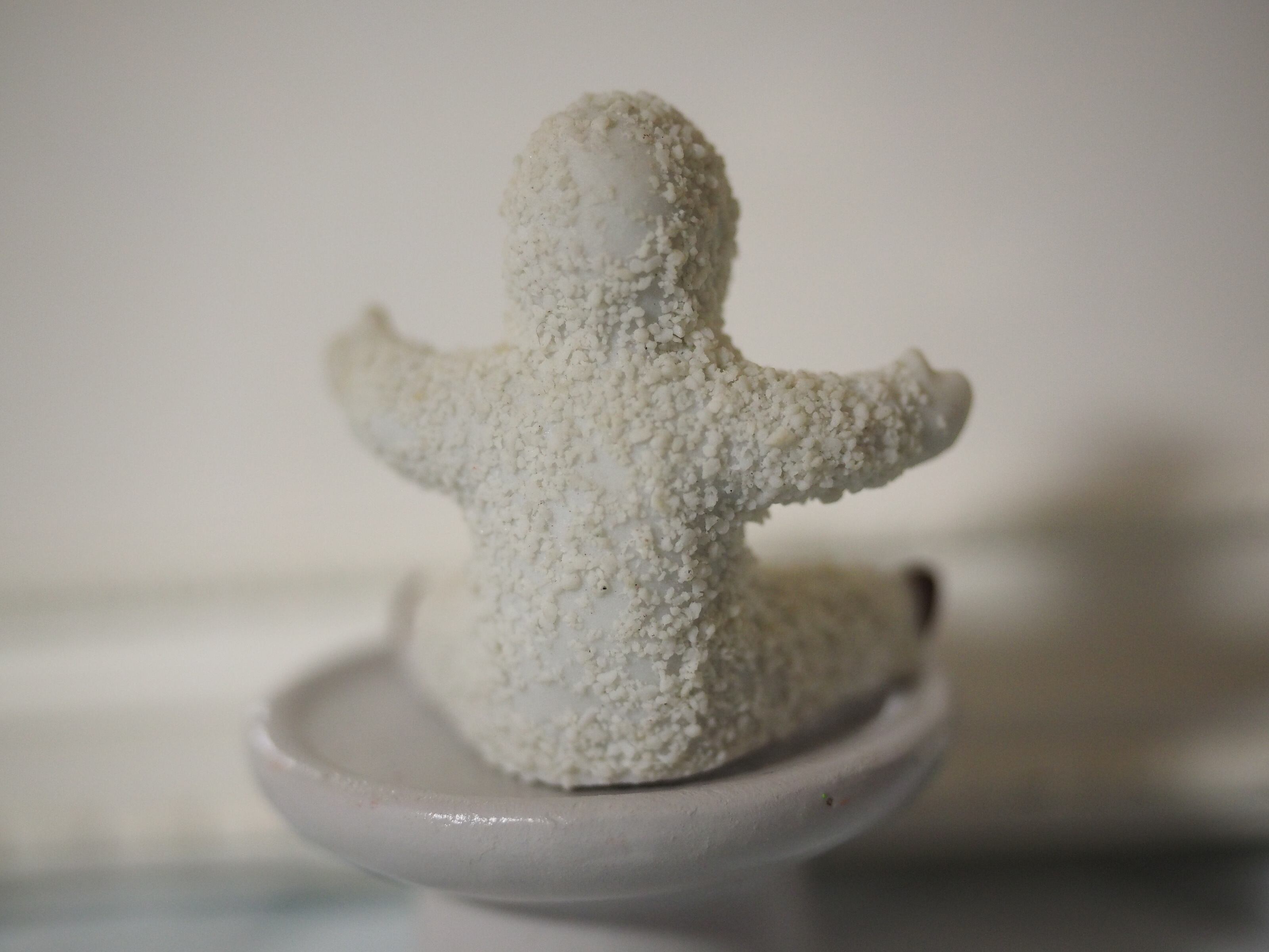 砂糖菓子のような細かなつぶつぶの感触、雪の中で座っているような姿のスノーベビーです。