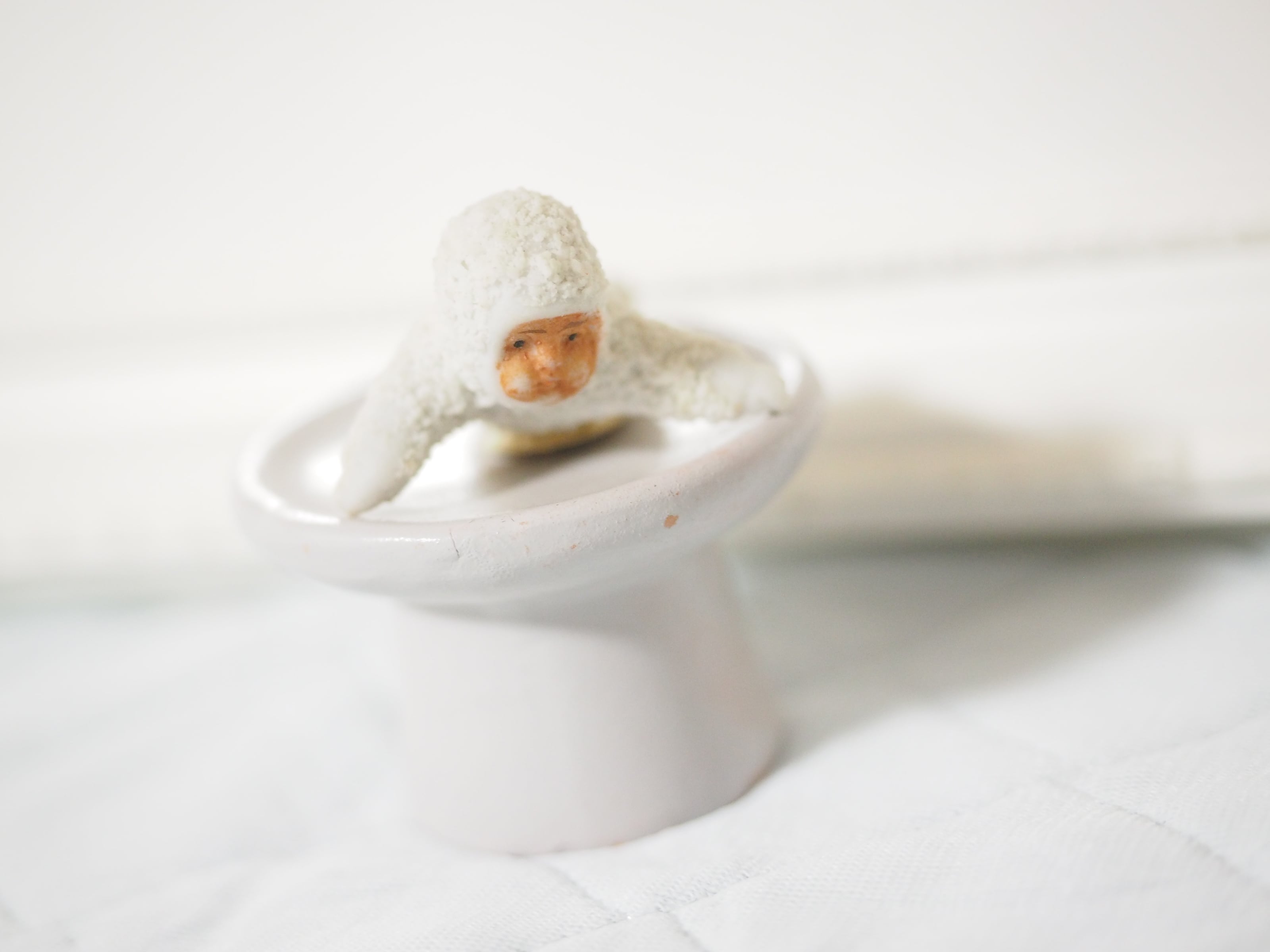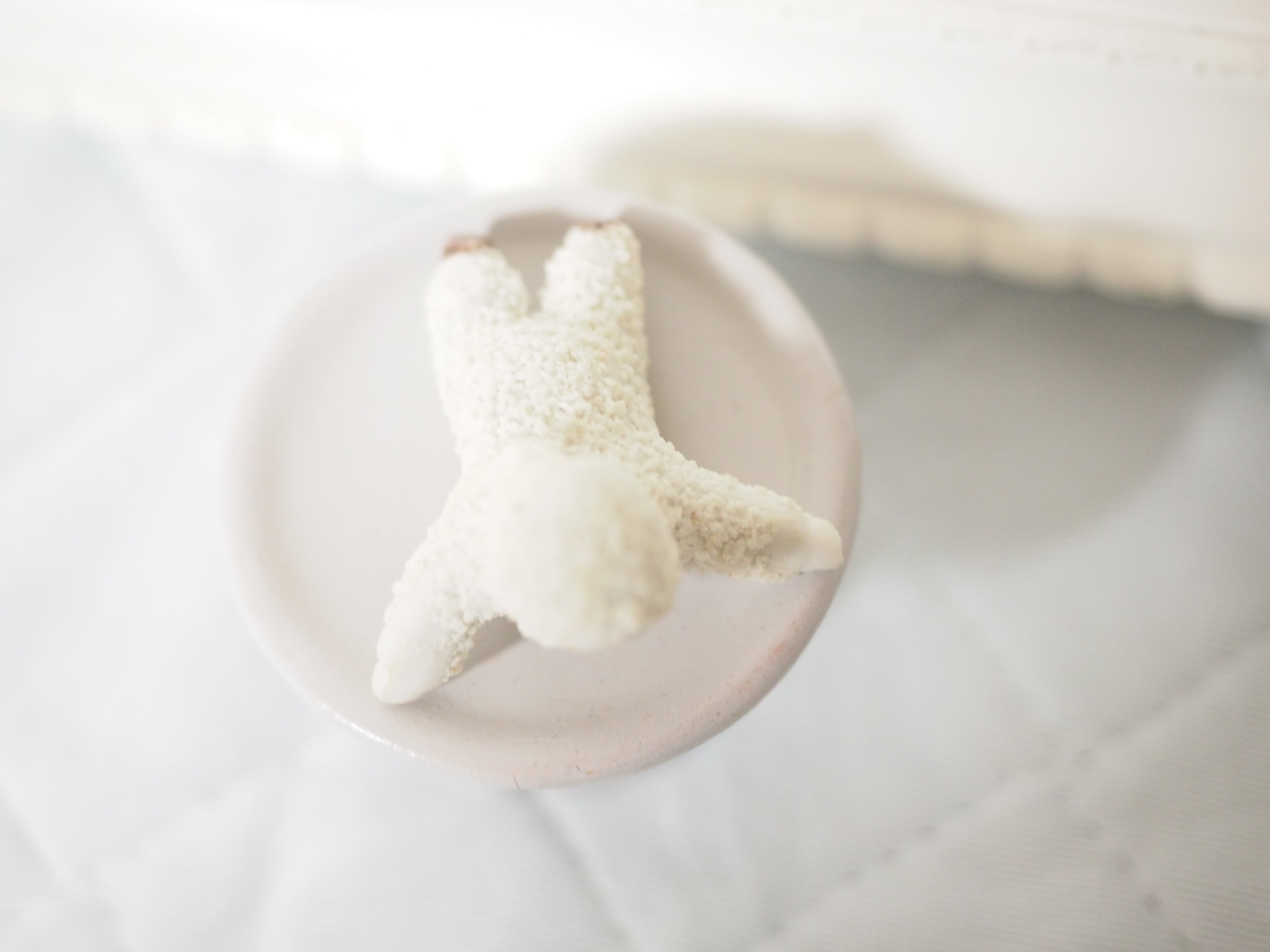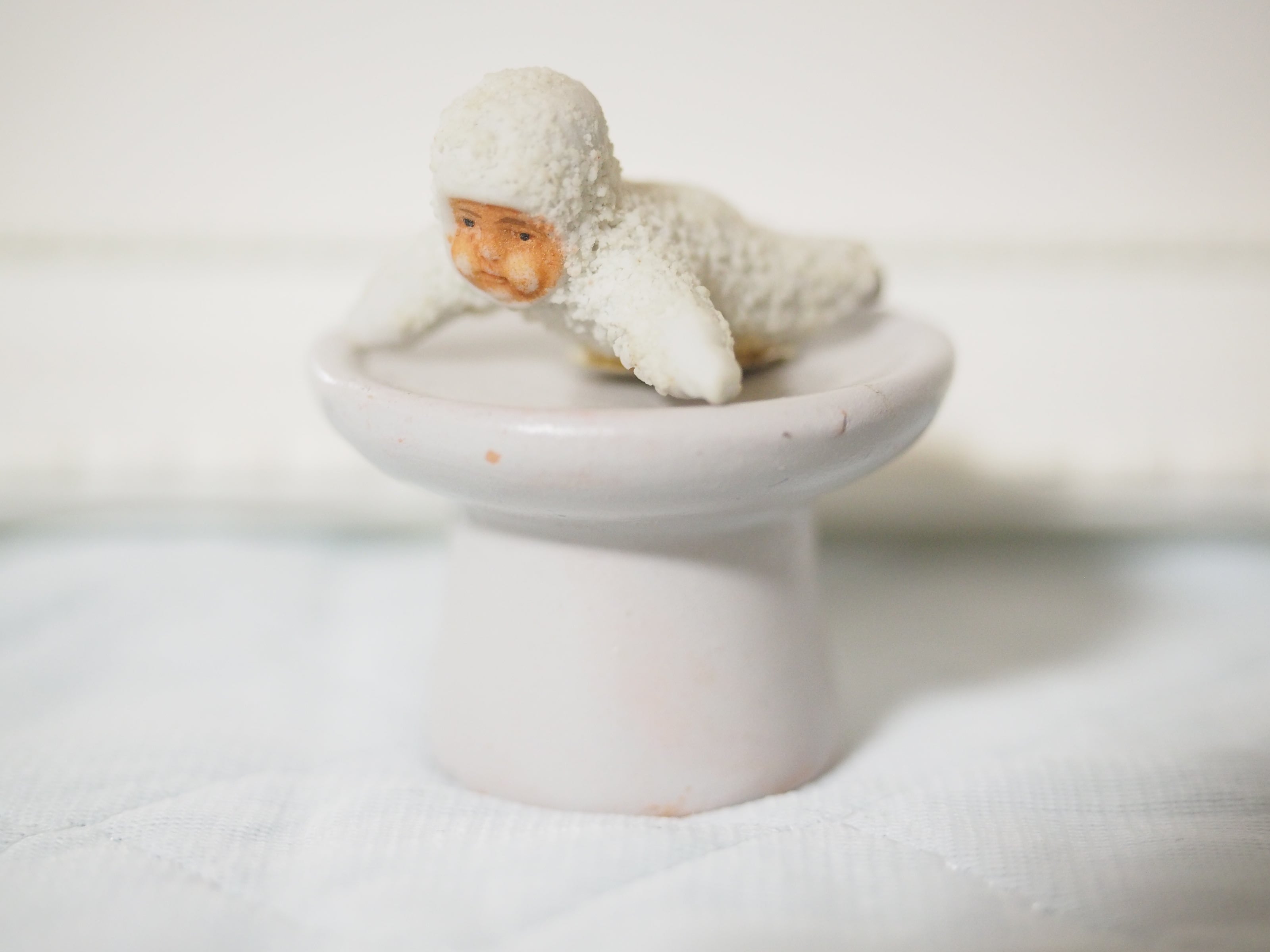 砂糖菓子のような細かなつぶつぶの感触、雪の中でズザァと転んだのか、すべり込んで遊んでいるのか、腹ばい姿のスノーベビーです。