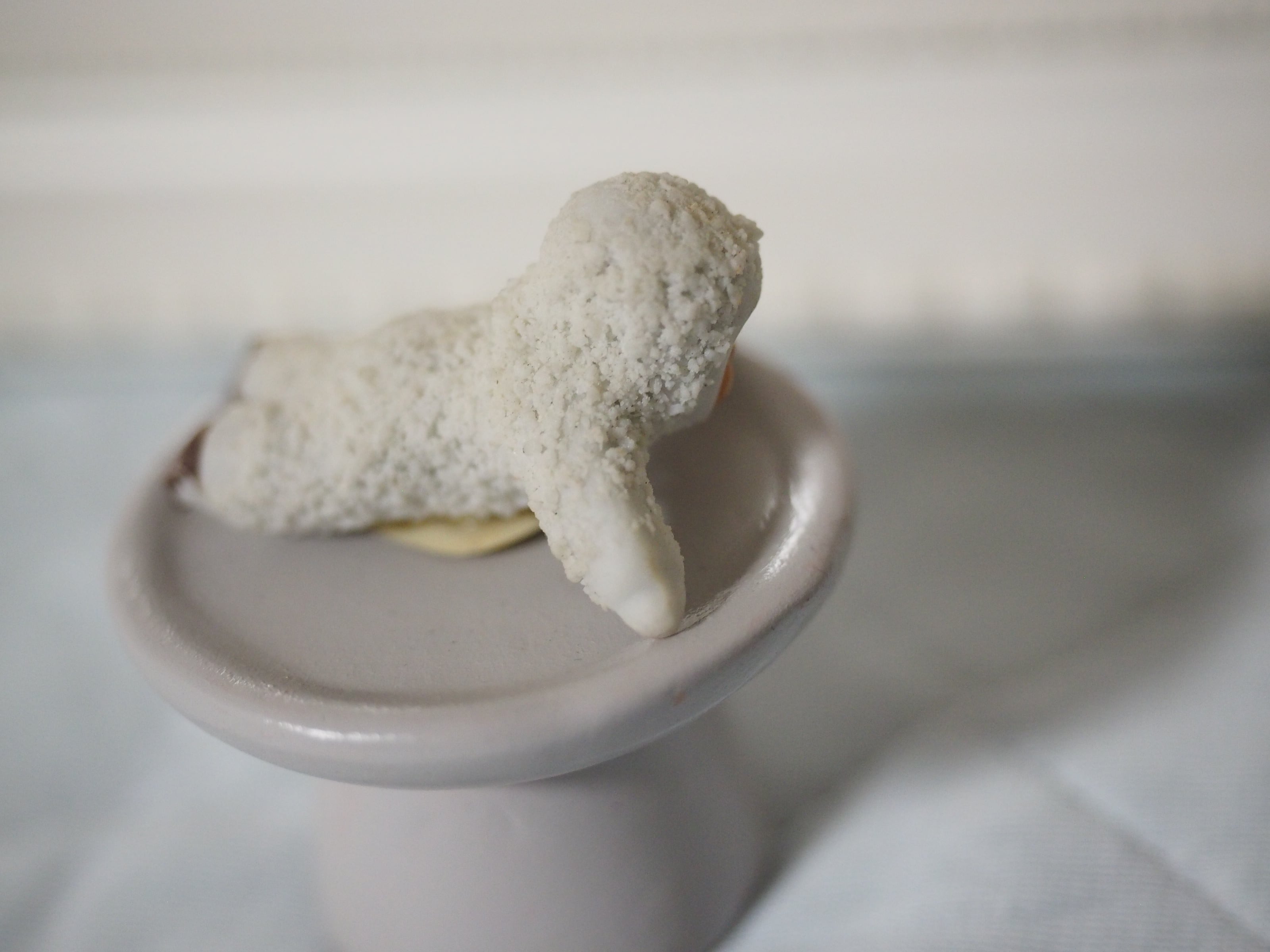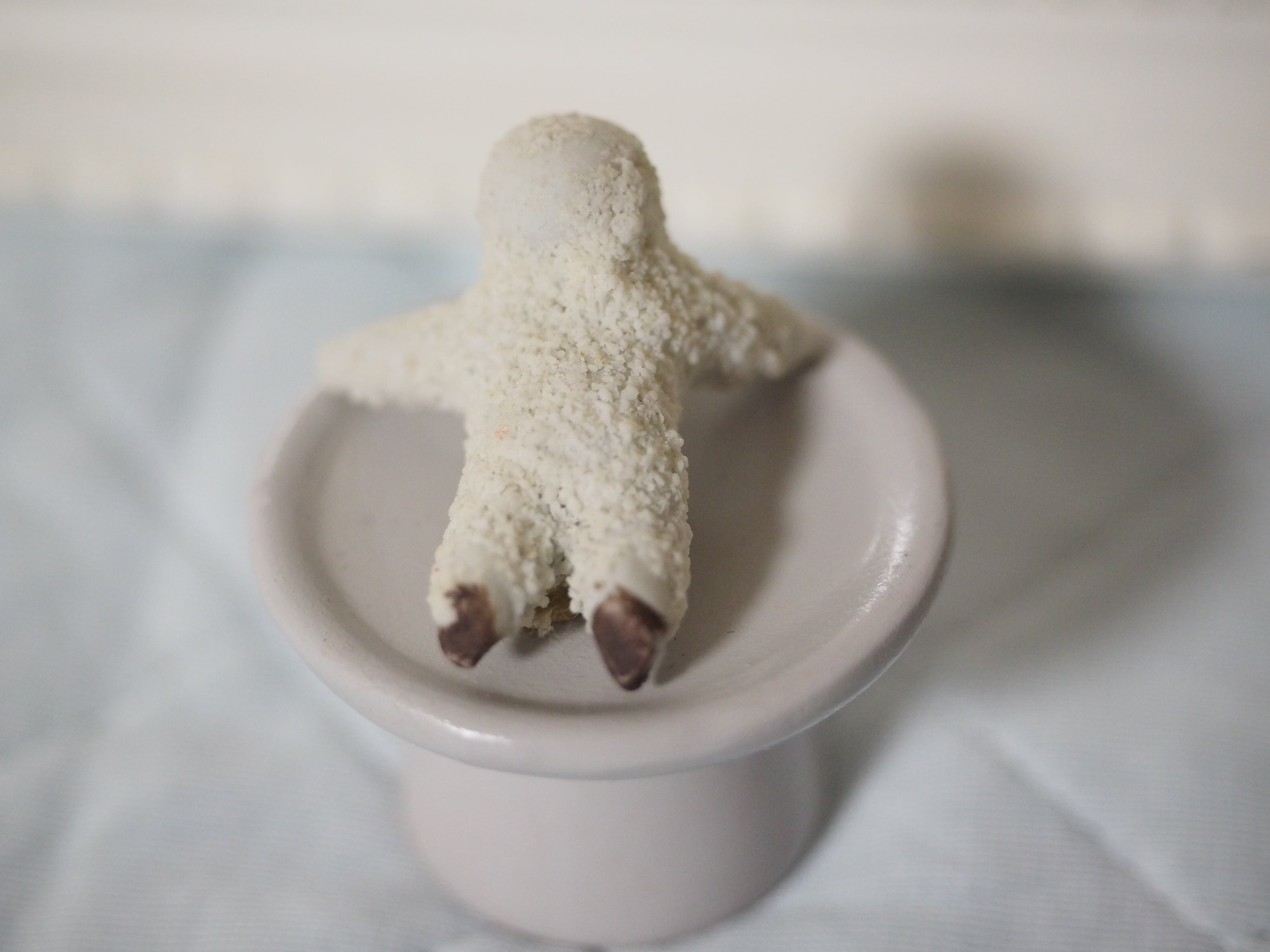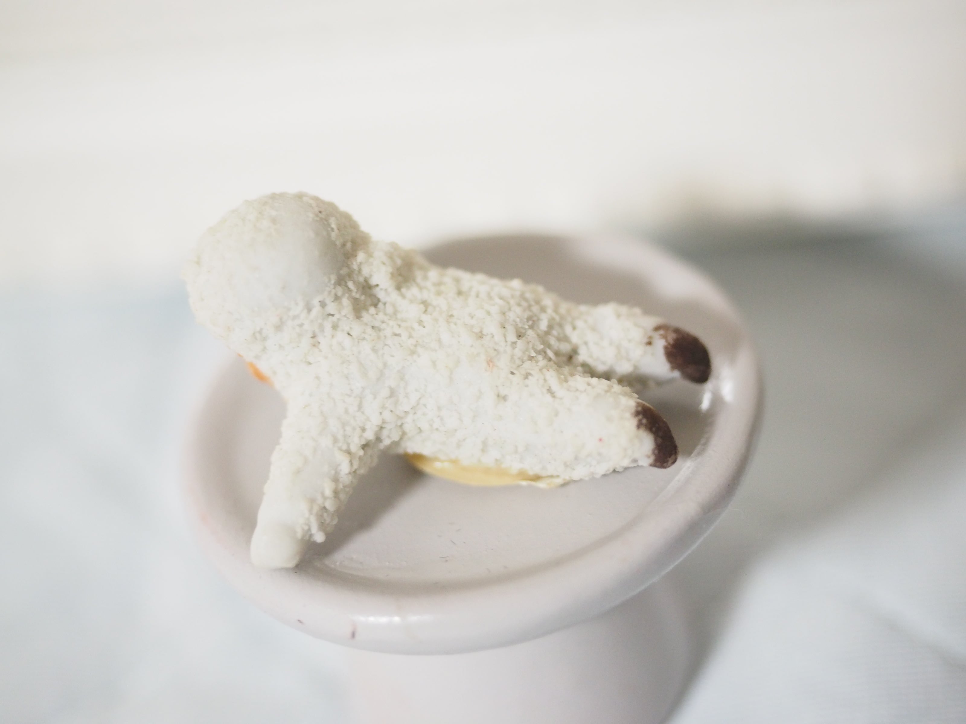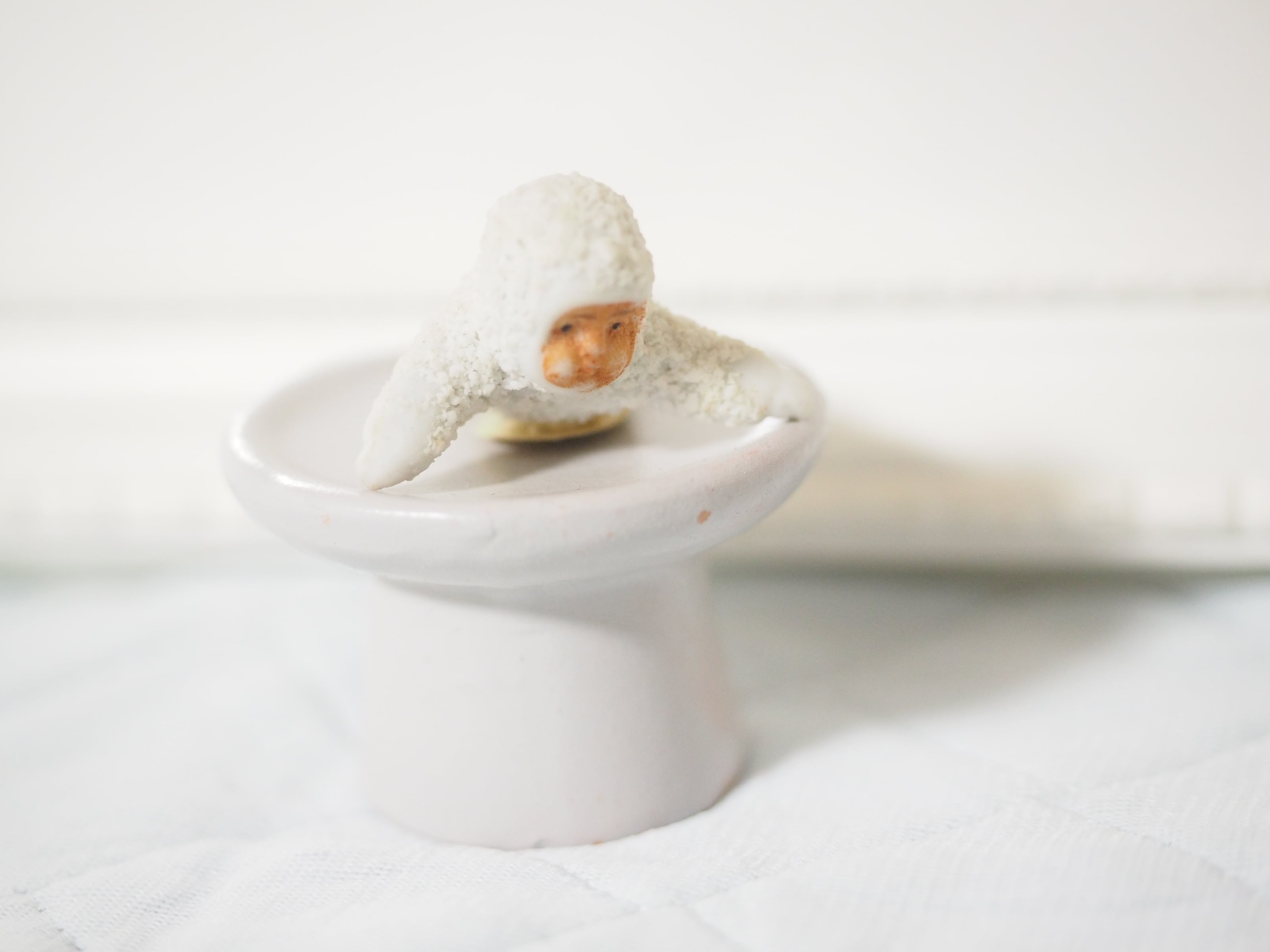 お顔は幅8㎜ほどの小ささで、小さな目とリップ、きれいな眉がペイントされています。瞳は薄藍色です。なんと、とっても小さな鼻の穴もございますので、ぜひご覧いただきたいです!